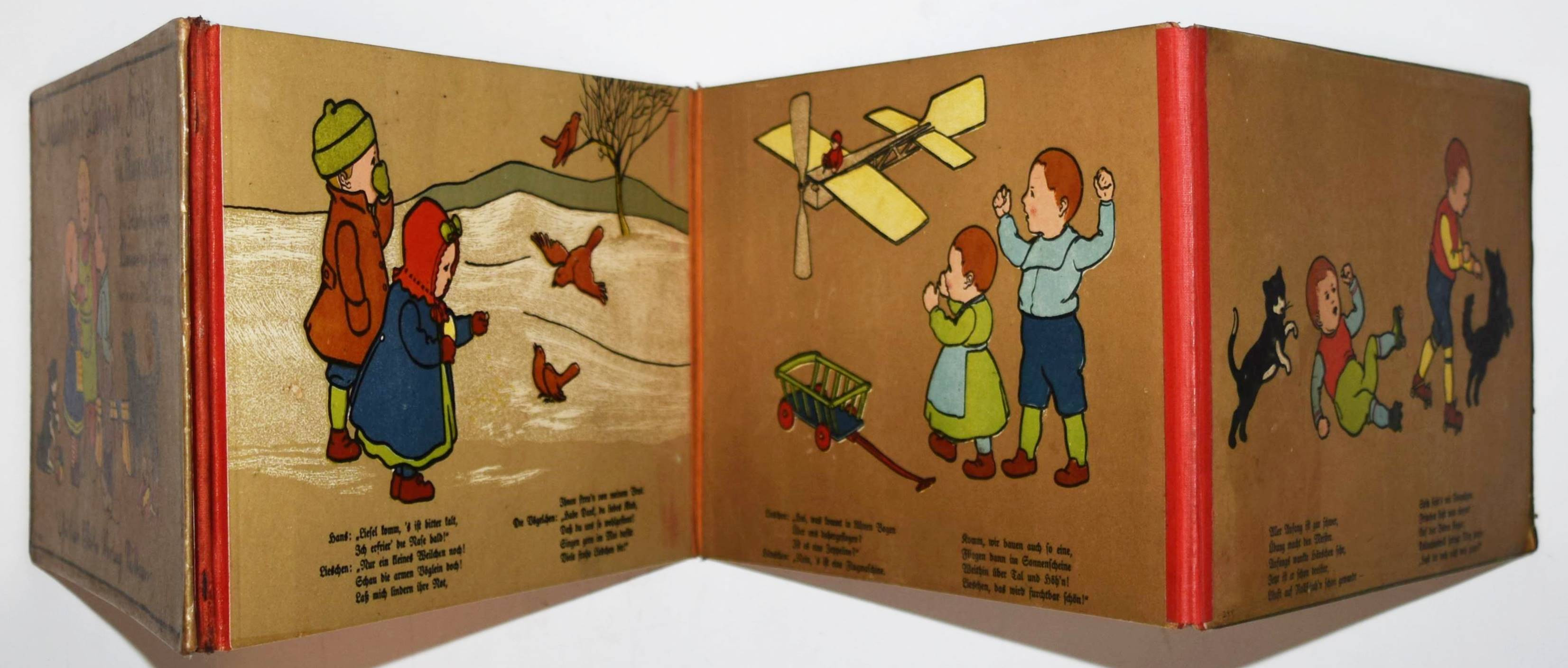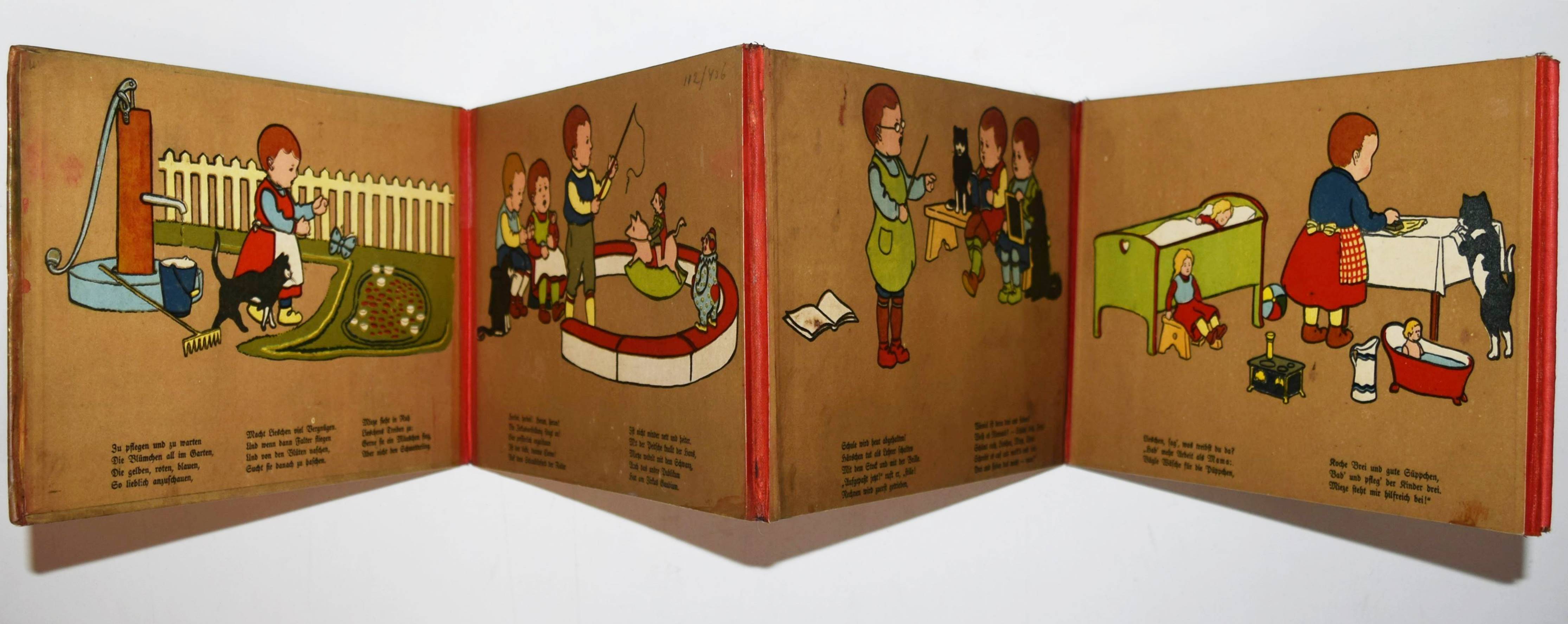 Widmann, Willy. Hänschen, Lieschen, Fritz, die Mieze und der Spitz (Deckeltitel). Ein Bilderbuch für unsere Kleinen. Stuttgart, Gustav Weise o. J. (1911). Quer-8°. Leporello, 14 (statt 16) farblithogr. Tafeln (inkl. Titel) von Josef Böhm auf Karton. Farbig illustr. Orig.-Halbleinenband. (Verlags-Nr. 948). Klotz 8225/3. Ries 441, 3. – Erste Ausgabe. – Seltenes Kleinkinder-Bilderbuch mit zeittypischen Illustrationen im Caspari-Stil auf graubraunem Hintergrund. Titel in deutscher Schreibschrift. – Der böhmische Dekorationsmaler, Illustrator und Kunstgewerbler J. Böhm (geb. 1877) lebte in Stuttgart, später in Wien und seit 1920 in der Tschechoslowakei. – Das innengelenk der letzten Tafel alt mit schwarzem Leinenstreifen restauriert, 2 Tafeln am Schluß fehlen, sonst gut erhalten.