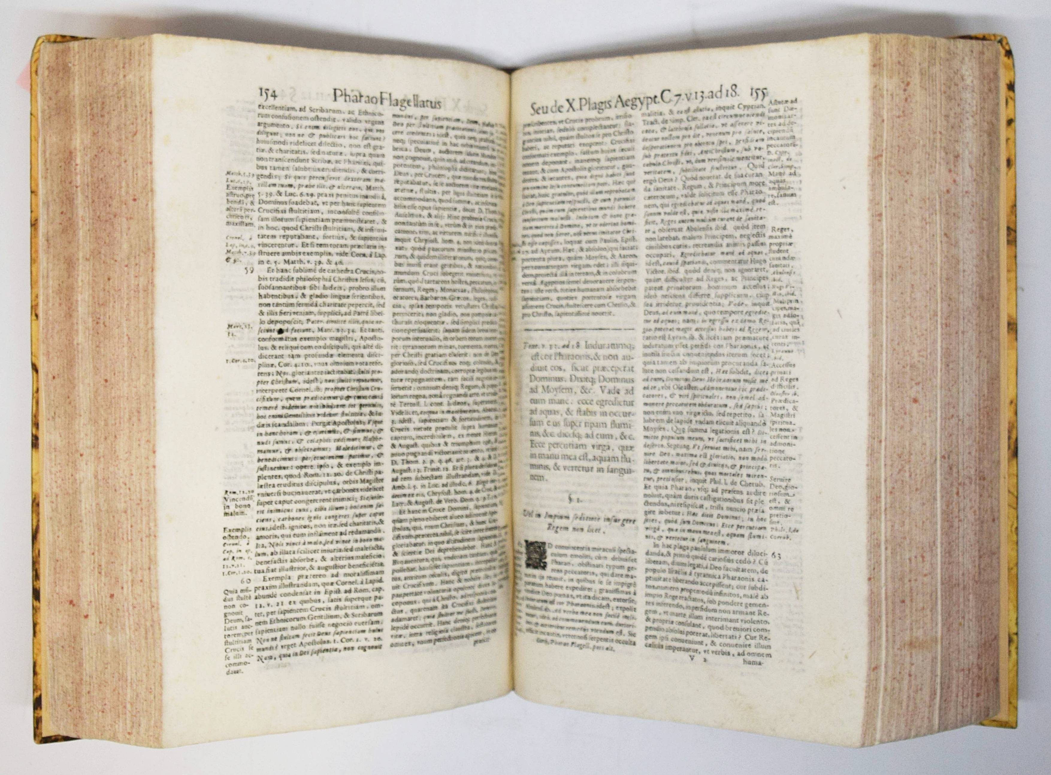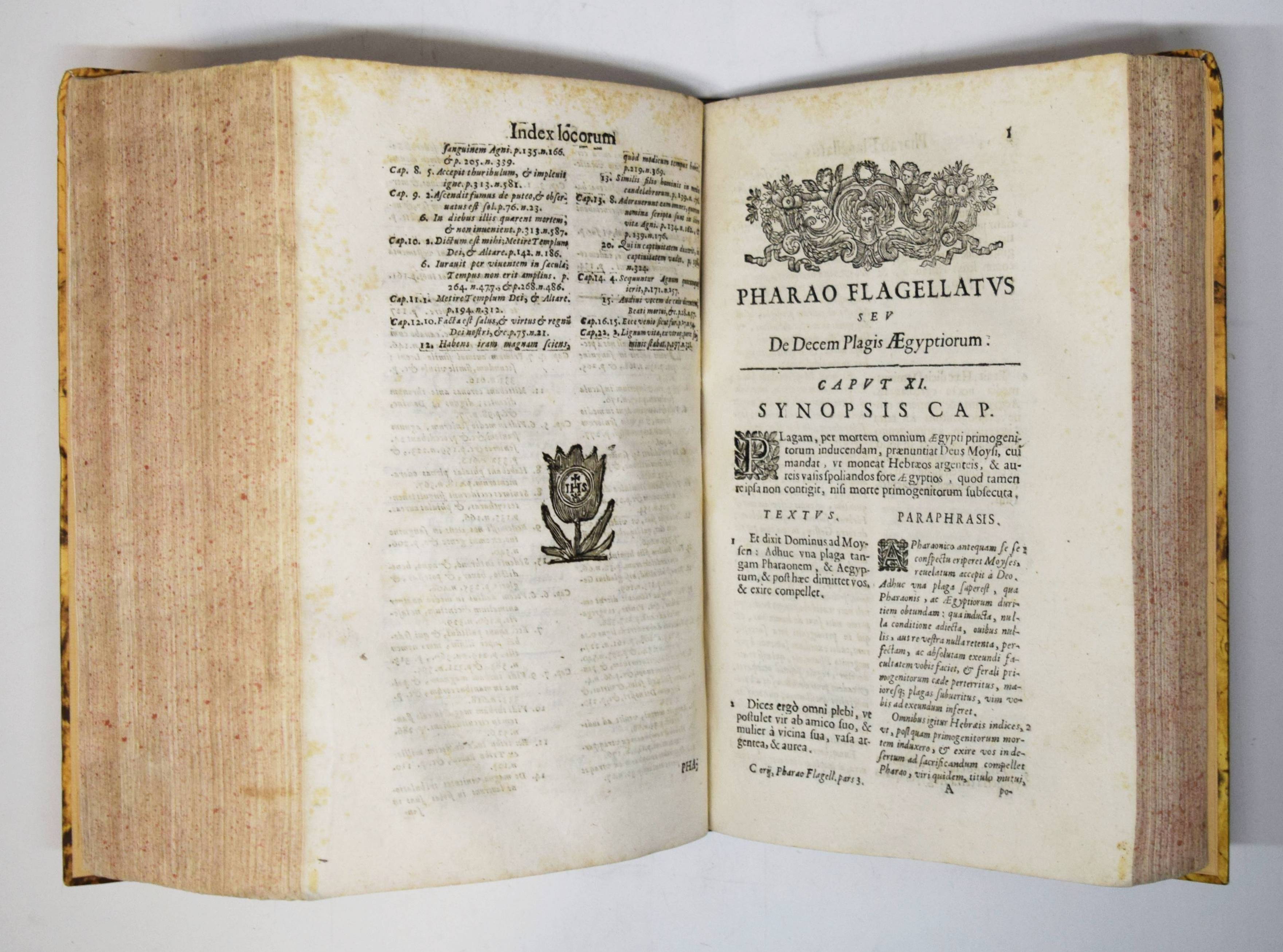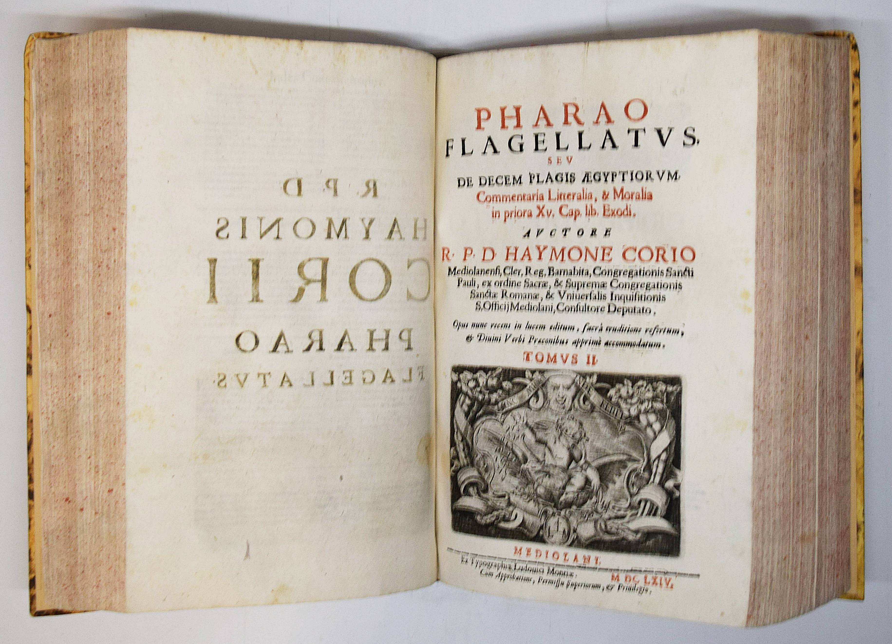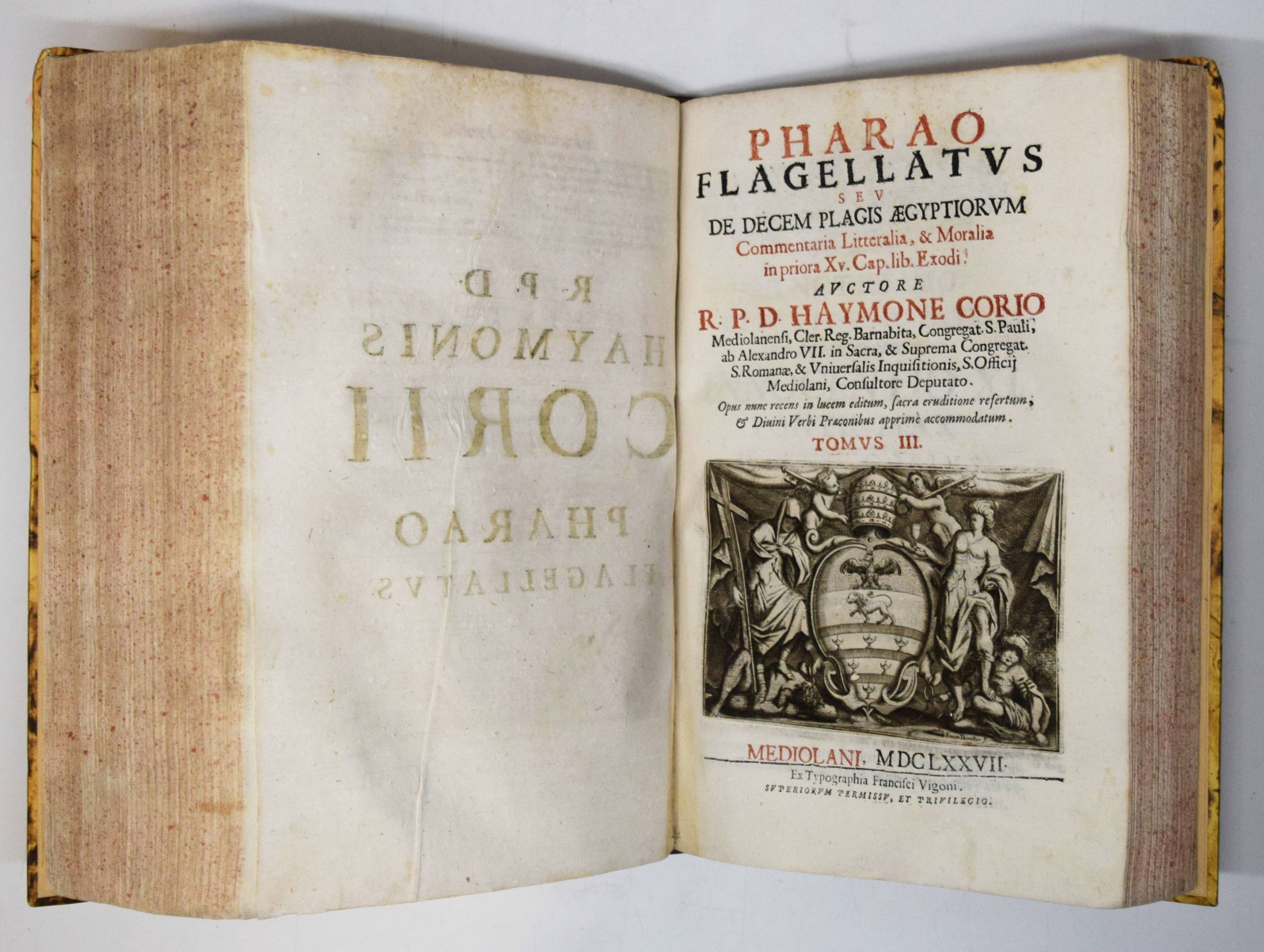 Corio, Aimone. Pharao flagellatus seu de decem plagis Aegyptiorum commentaria litteralia et moralia in priora XV. cap. lib. exodi. 3 Teile in 1 Band. Mediolani (Mailand), Ludovico Monza 1660-1677. Folio (35 x 23 cm.). [29] Bl., 407 S., [36] Bl.; [22] Bl., 400 S., [40] Bl.; [23] Bl., 366 S., [34] Bl. mit 3 Titelblättern in Rot und Schwarz mit 3 (1 wdh.) gestoch. Vignetten. Moderner Halblederband. Wegen des langen Erscheinungszeitraums vollständig sehr seltenes Werk; weltweit nur in wenigen Bibliotheken nachweisbar (lt. KVK). – A. Corio (1606-1679) war Mitglied des Ordens der Barnabiten und hat neben dem vorliegenden Kommentar zum Exodus auch einen Kommentar zu Genesis „Concordantiae morales in Genesim“ (Mailand 1671) herausgegeben. – Eine Seite mit Papierfehler (Buchstaben der ersten beiden Zeilen etwas verrutscht), wenige Seiten mit Wurmspur im weißen Rand (kein Buchstabenverlust), teils etwas fleckig, kleiner Bibliotheks-Stempel einer deutschen Kloster-Bibliothek auf dem Titel, gutes Exemplar.