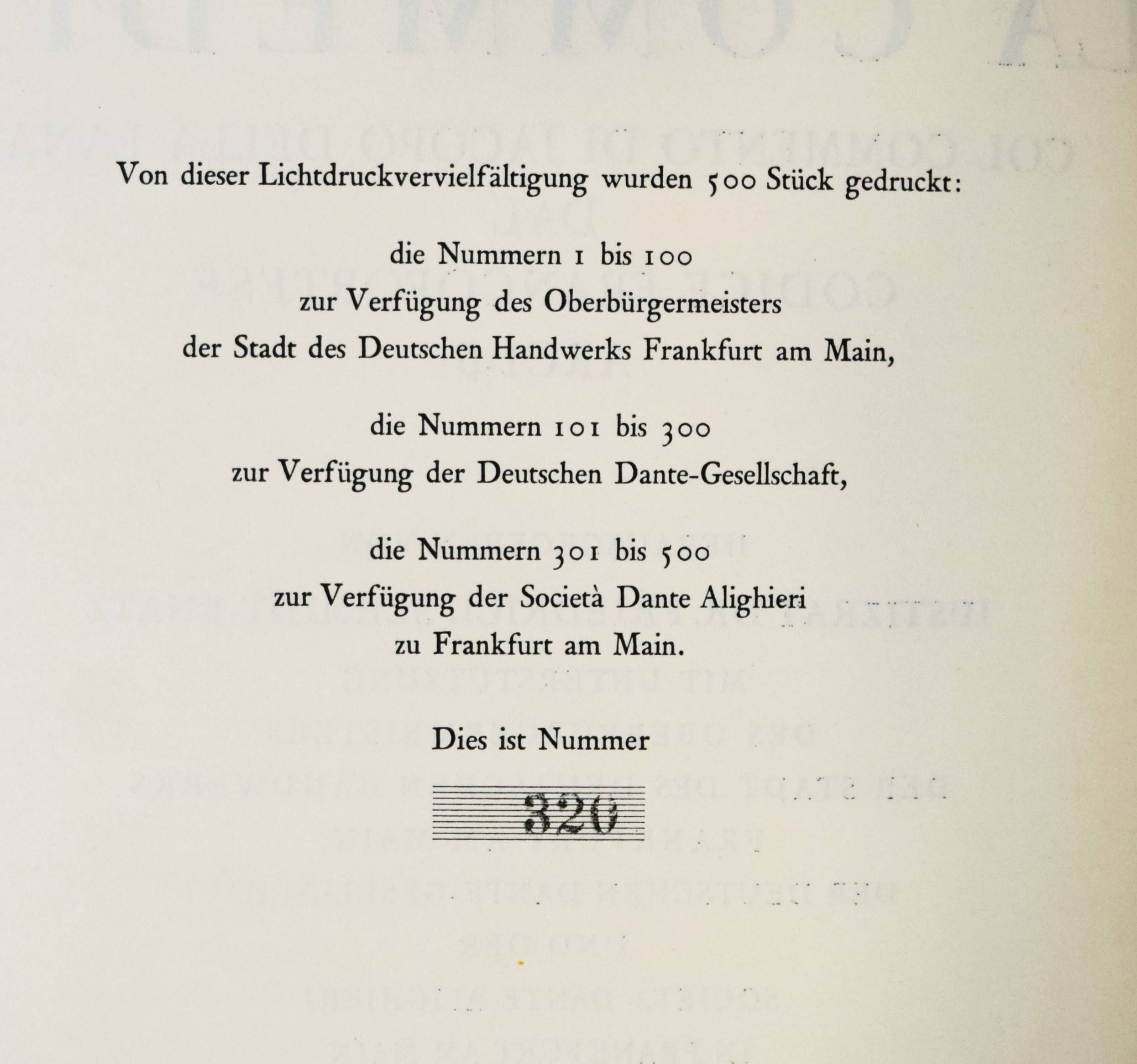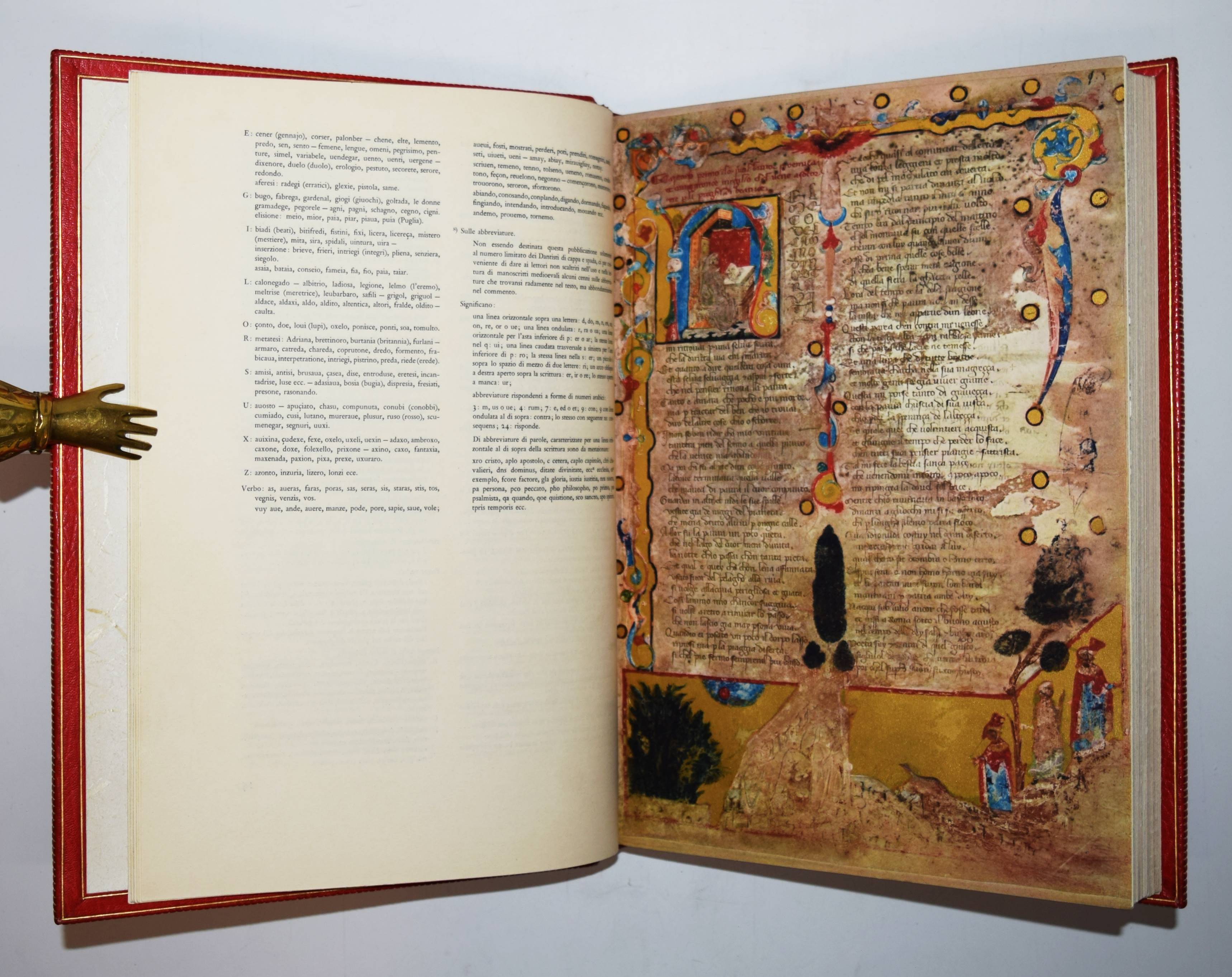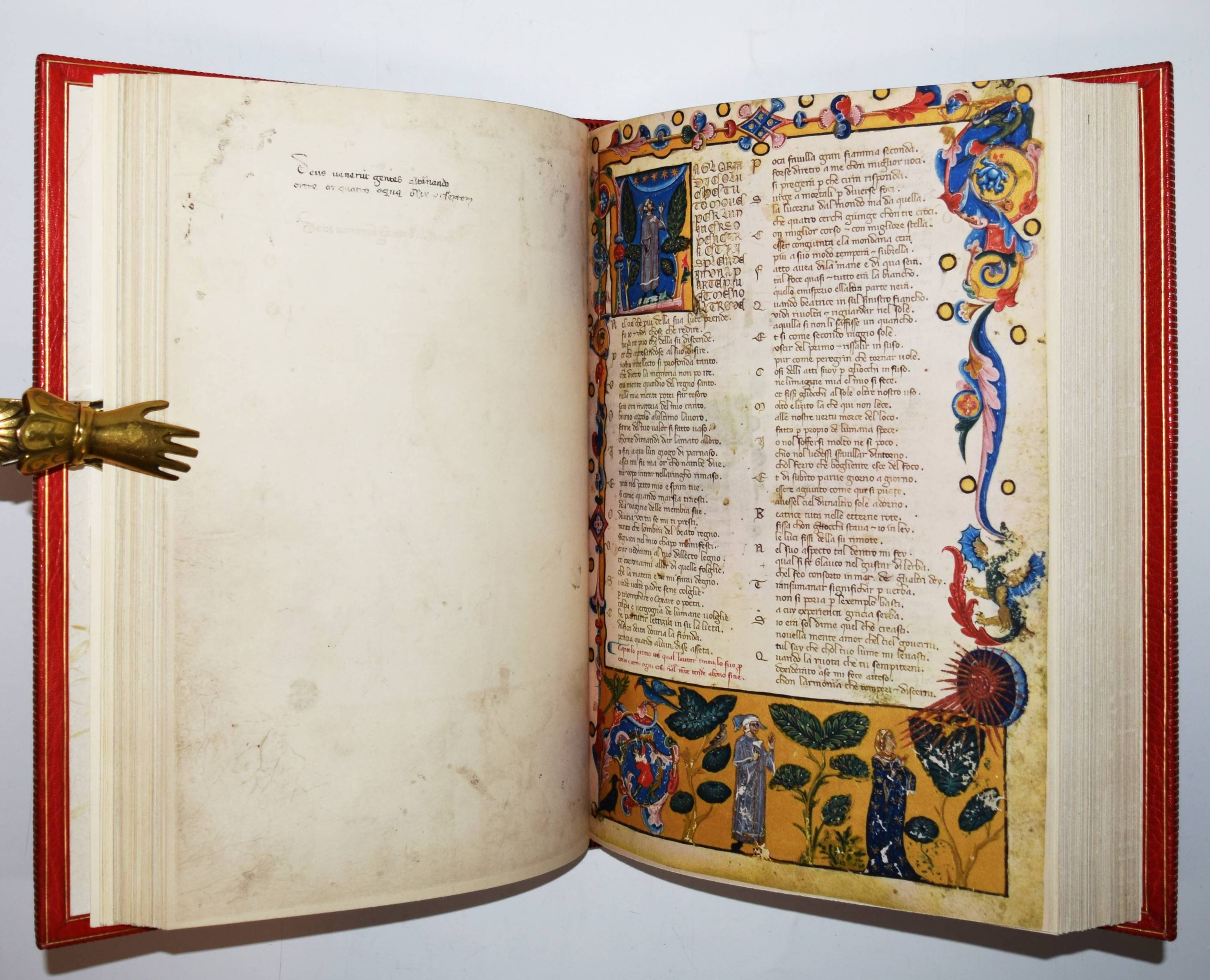 Dante, Alighieri. La Commedia. Col commento di Jacopo della Lana dal codice Francofortese Arci-(beta). Herausgegeben von Friedrich Schmidt-Knatz mit Unterstützung des Oberbürgermeisters der Stadt des Deutschen Handwerks Frankfurt am Main, der Deutschen Dante-Gesellschaft und der Società Dante Alighieri in Frankfurt am Main. Frankfurt am Main, Reichsdruckerei Berlin für die Stadt Frankfurt 1939. Folio (36,5 x 26 cm.). 15 S. (Texteinführung und Lesarten), 218 (in der Handschrift paginierte, davon 4 farbige) Blätter im Lichtdruck faksimiliert. Weinroter genarbter Maroquin-Lederband der Zeit mit goldgepr. Rückentitel auf 7 Bünden mit Kassettenvergoldung, Deckel-Filetten, Kanten- und Innenkantenvergoldung in Halbleder-Schuber. Eines von 500 num. Exemplaren. – „Die Handschrift hat ihren besonderen Wert einmal durch ihre – von unvermeidlichen Schreibfehlern abgesehen – ausgezeichnete Textüberlieferung, zum anderen durch den ihr angefügten Kommentar des Jacopo della Lana und zum dritten als eine der sogenannten reichen Handschriften durch ihren künstlerisch wertvollen Miniaturenschmuck, der hoch über dem der gleichzeitigen Commedia-Handschriften steht; hierzu kommt, daß sie wegen ihrer schönen Schrift leicht lesbar ist. … Technik, Farben und Formen der Miniaturen sind, wie eine Betrachtung der zahlreichen in Bologna entstandenene, datierten Miniaturhandschriften ergibt, typisch für die Bologneser Miniaturenschule der beiden ersten Drittel des 14. Jahrhunderts, so daß eine Entstehung der Handschrift in Bologna durchaus im Bereich der Möglichkeit und Wahrscheinlichkeit liegt“ (Einleitung des Herausgebers in Deutsch und Italienisch). – Sehr schönes Exemplar in einem prachtvollen Handeinband. Provenienz: Christian Scheffler, ehemaliger Leiter des Klingspor-Museums, Offenbach.