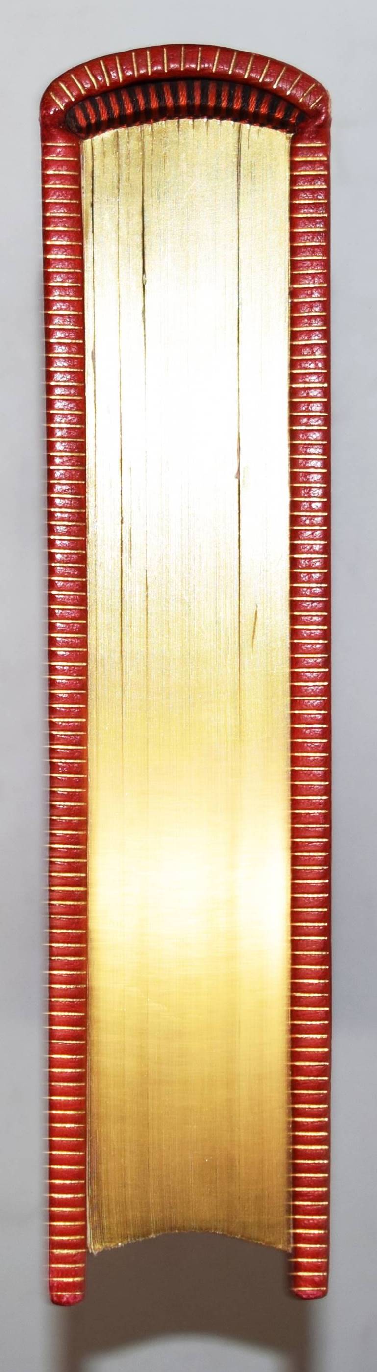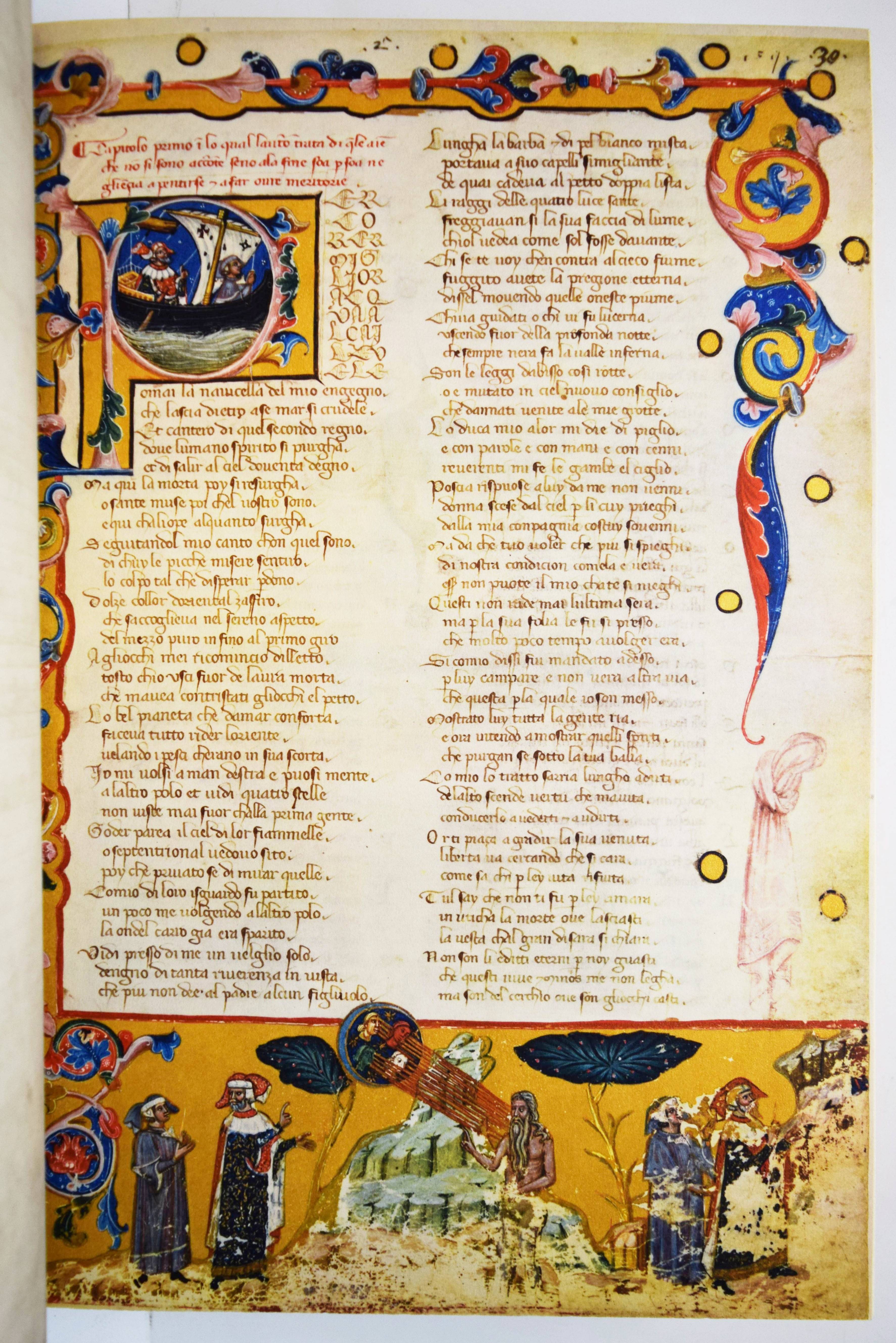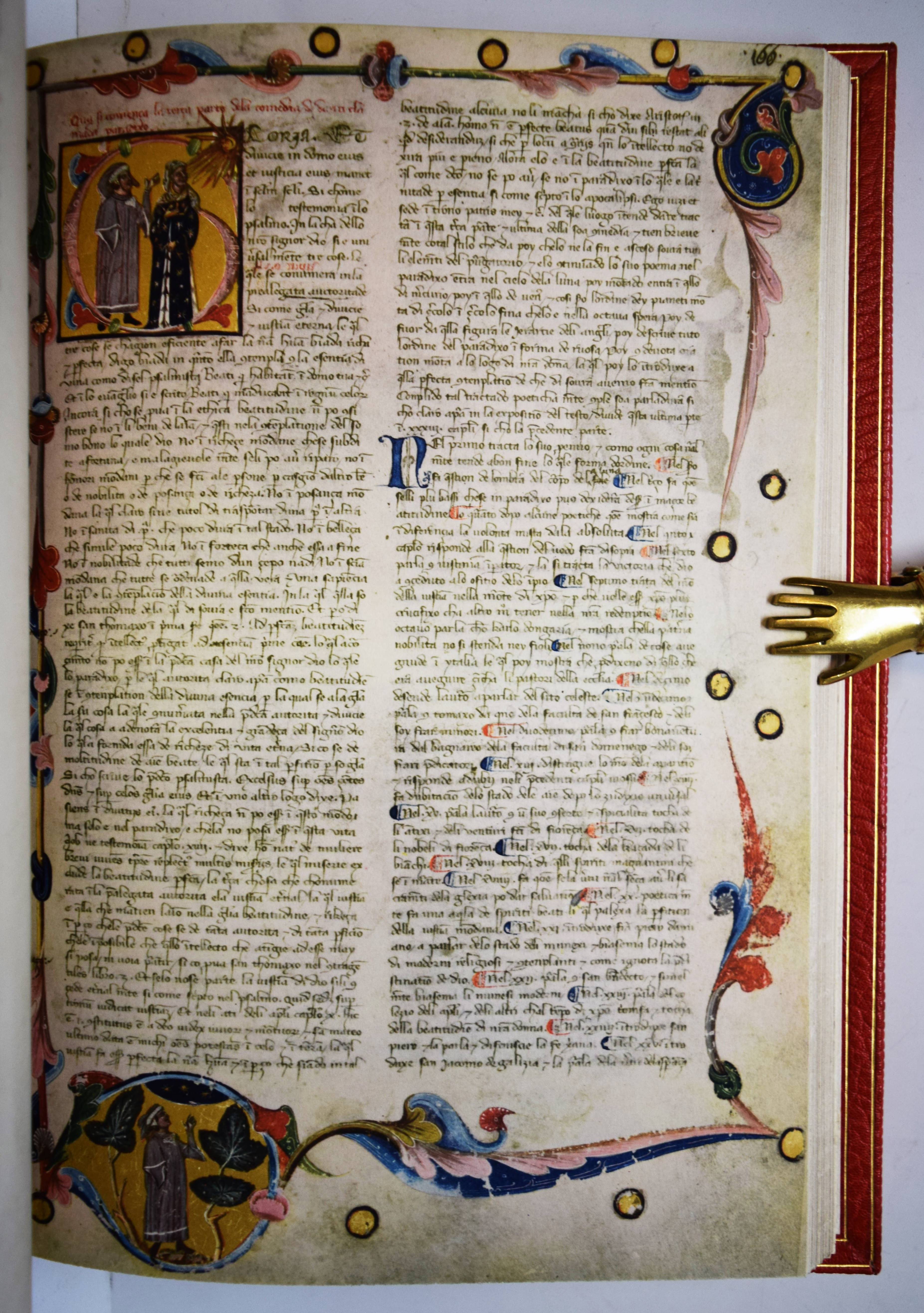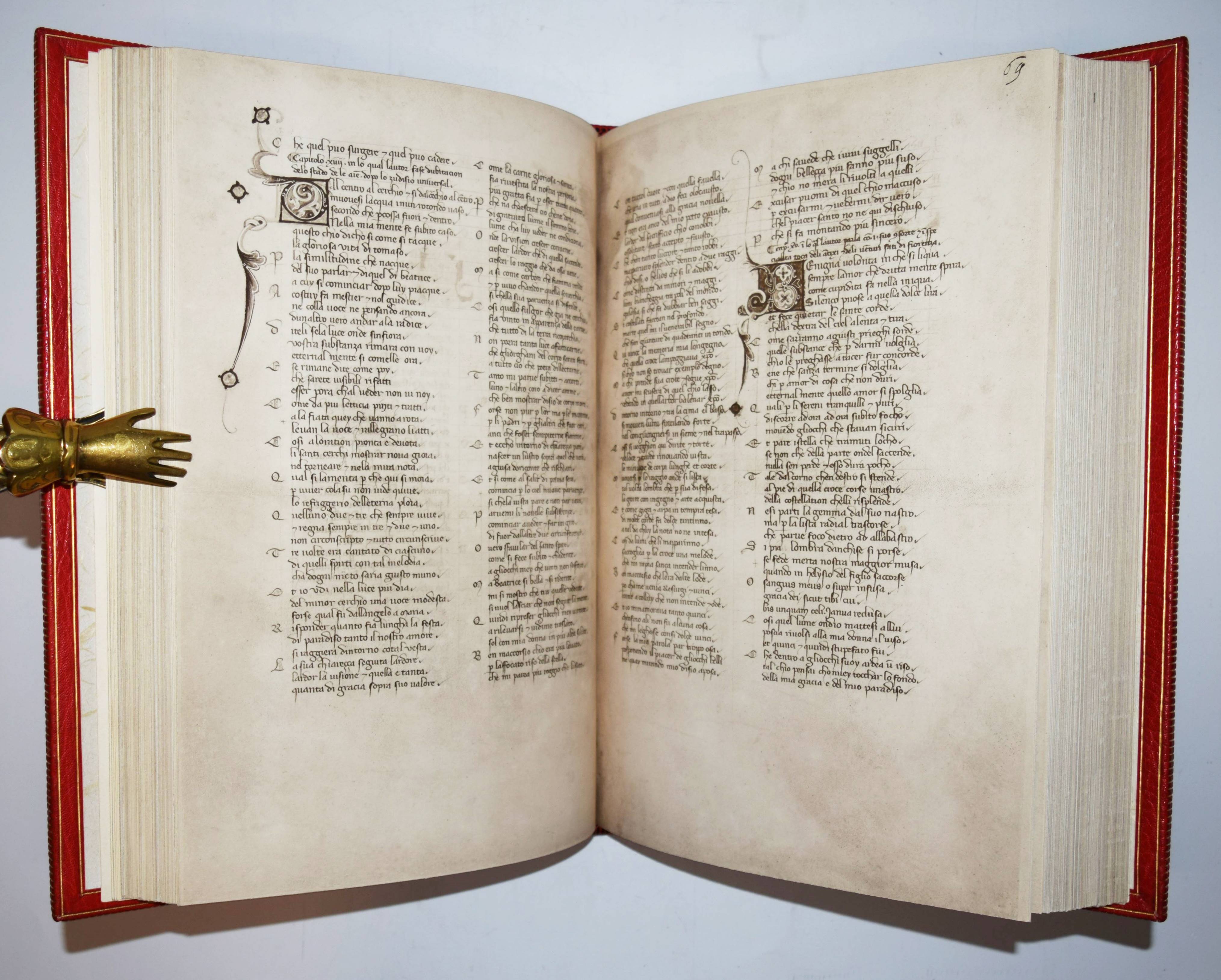 Dante, Alighieri. La Commedia. Col commento di Jacopo della Lana dal codice Francofortese Arci-(beta). Herausgegeben von Friedrich Schmidt-Knatz mit Unterstützung des Oberbürgermeisters der Stadt des Deutschen Handwerks Frankfurt am Main, der Deutschen Dante-Gesellschaft und der Società Dante Alighieri in Frankfurt am Main. Frankfurt am Main, Reichsdruckerei Berlin für die Stadt Frankfurt 1939. Folio (36,5 x 26 cm.). 15 S. (Texteinführung und Lesarten), 218 (in der Handschrift paginierte, davon 4 farbige) Blätter im Lichtdruck faksimiliert. Weinroter genarbter Maroquin-Lederband der Zeit mit goldgepr. Rückentitel auf 7 Bünden mit Kassettenvergoldung, Deckel-Filetten, Kanten- und Innenkantenvergoldung in Halbleder-Schuber. Eines von 500 num. Exemplaren. – „Die Handschrift hat ihren besonderen Wert einmal durch ihre – von unvermeidlichen Schreibfehlern abgesehen – ausgezeichnete Textüberlieferung, zum anderen durch den ihr angefügten Kommentar des Jacopo della Lana und zum dritten als eine der sogenannten reichen Handschriften durch ihren künstlerisch wertvollen Miniaturenschmuck, der hoch über dem der gleichzeitigen Commedia-Handschriften steht; hierzu kommt, daß sie wegen ihrer schönen Schrift leicht lesbar ist. … Technik, Farben und Formen der Miniaturen sind, wie eine Betrachtung der zahlreichen in Bologna entstandenene, datierten Miniaturhandschriften ergibt, typisch für die Bologneser Miniaturenschule der beiden ersten Drittel des 14. Jahrhunderts, so daß eine Entstehung der Handschrift in Bologna durchaus im Bereich der Möglichkeit und Wahrscheinlichkeit liegt“ (Einleitung des Herausgebers in Deutsch und Italienisch). – Sehr schönes Exemplar in einem prachtvollen Handeinband. Provenienz: Christian Scheffler, ehemaliger Leiter des Klingspor-Museums, Offenbach.