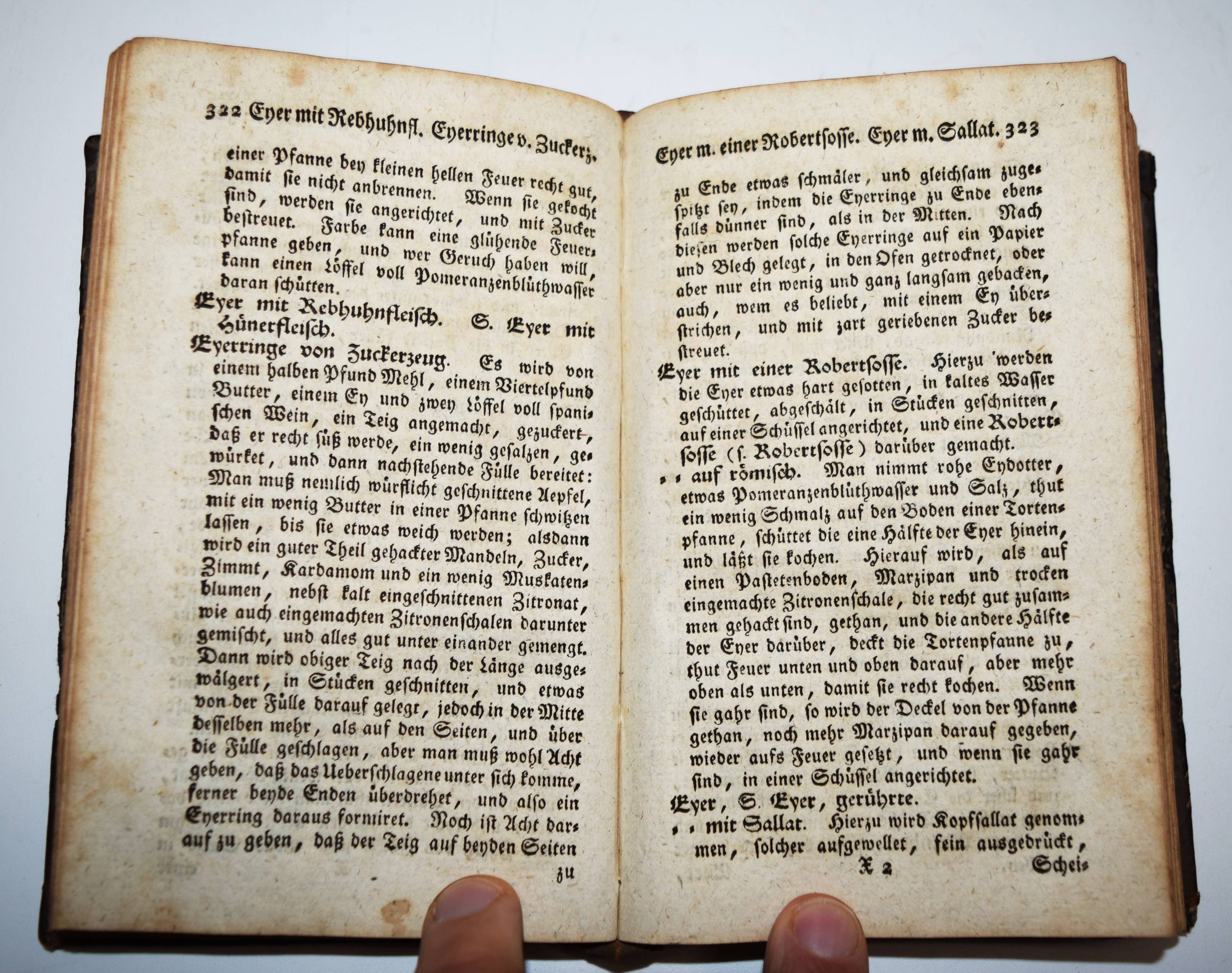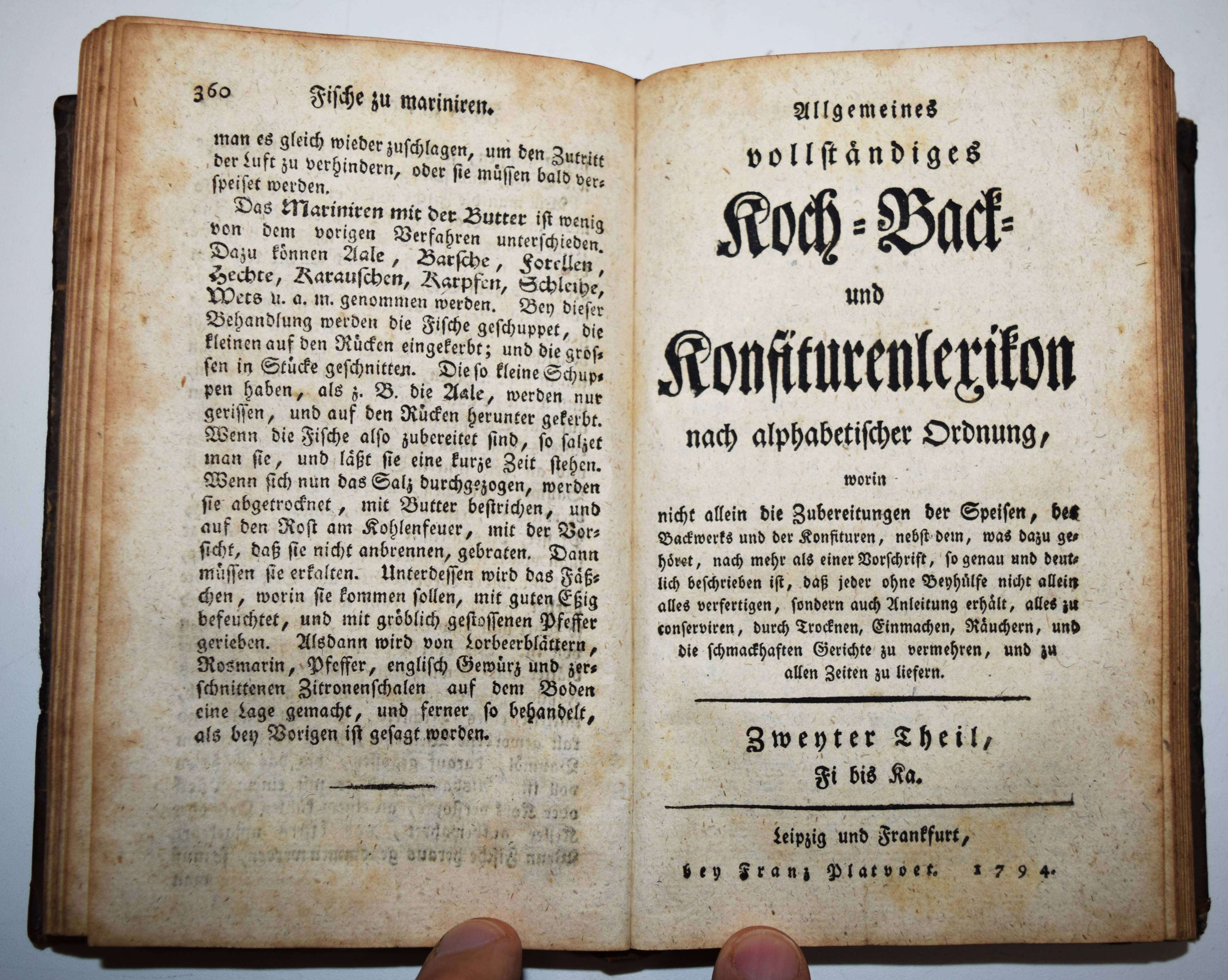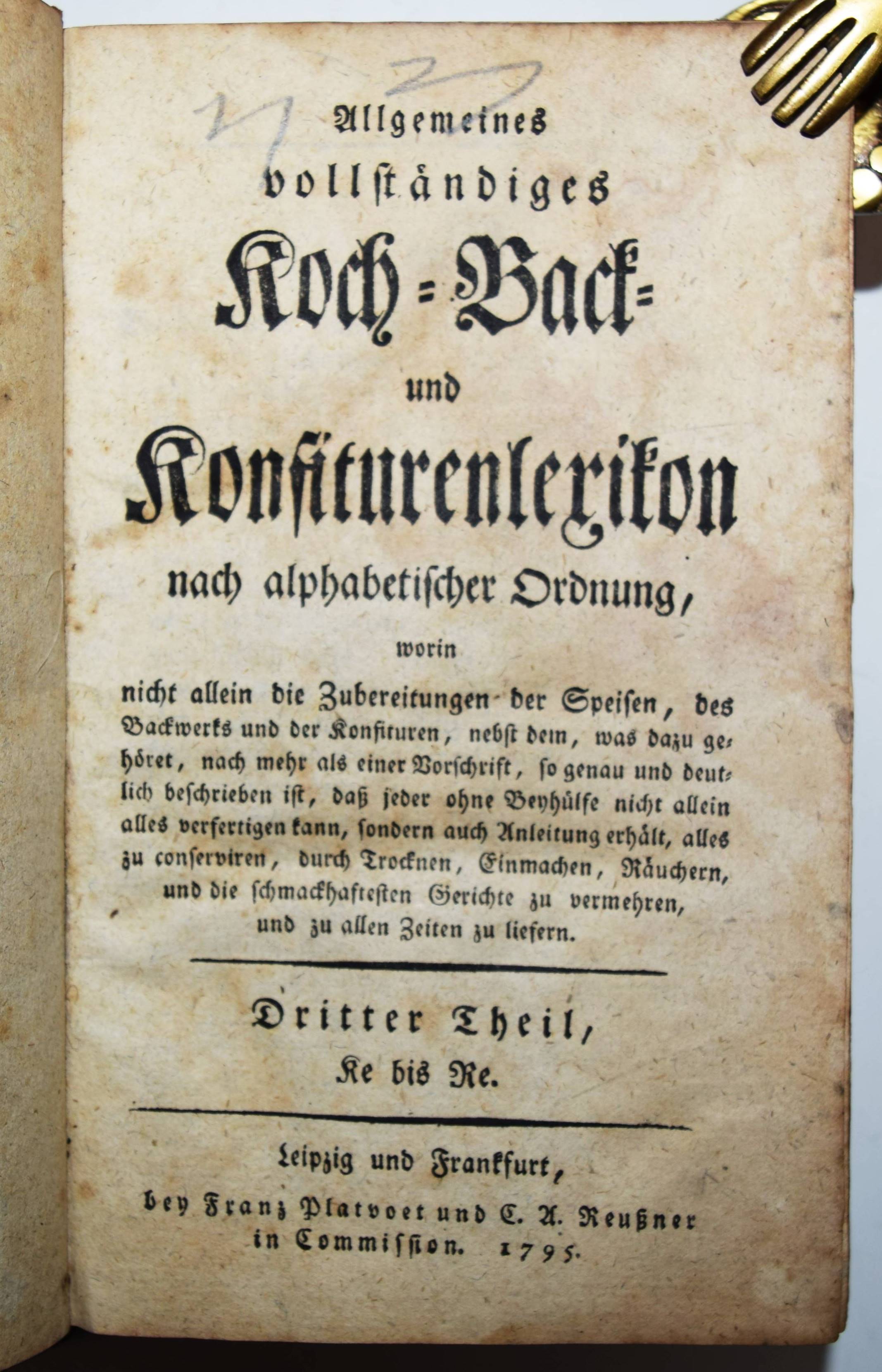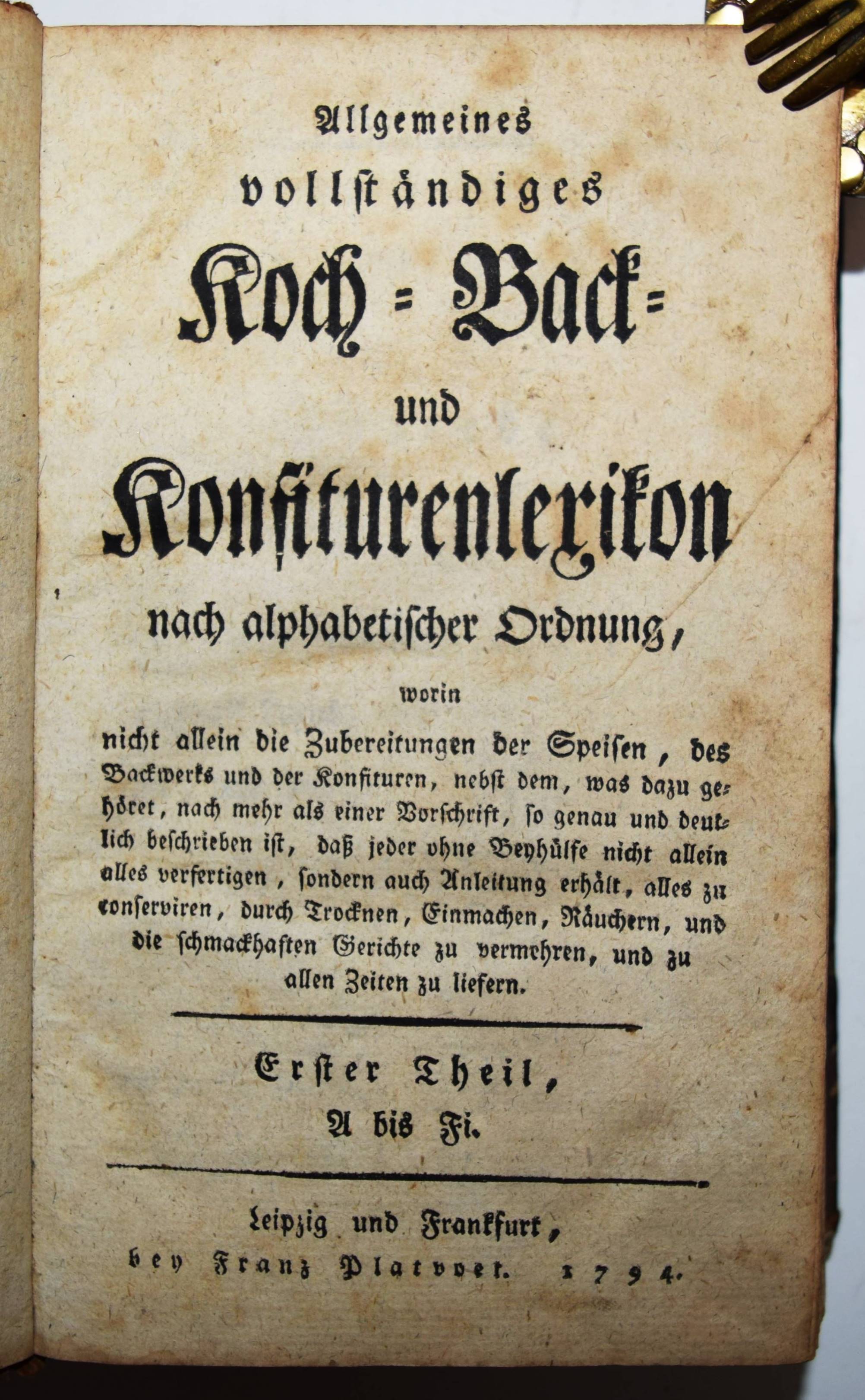 (Gaum, Johann Ferdinand). Allgemeines vollständiges Koch- Back- und Konfiturenlexikon nach alphabetischer Ordnung. Worin nicht allein die Zubereitungen der Speisen, des Backwerks und der Konfituren, nebst dem, was dazu gehöret, nach mehr als einer Vorschrift, so genau und deutlich beschrieben ist, daß jeder ohne Beyhülfe nicht allein alles verfertigen, sondern auch Anleitung erhält, alles zu conserviren, durch Trocknen, Einmachen, Räuchern, und die schmackhaften Gerichte zu vermehren, und zu allen Zeiten zu liefern. (2. stark vermehrte und verbesserte Auflage). 4 Teile in 2 Bänden. Leipzig und Frankfurt, Franz Platvoet 1794-1795. 8°. [4] Bl., 360 S.; 361-734 S.; Titel, 418 S.; [4] Bl., 424 S. Halblederbände der Zeit. VD18 13343998. Weiss 4006. Zischka S. 251. – Gegenüber der ersten Ausgabe von 1786 wesentlich erweiterte Ausgabe des sehr seltenen Koch-Lexikons. – „Hier in diesem Buche habe ich jeden Artikel vorgenommen, und nach mehr als einer Vorschrift gezeigt, wie jeder Fisch, jedes Fleisch, jede Geleen, Marmeladen, Pasteten, Torten, und dergleichen, zubereitet werden kann. Es hat also ein jeder zu wählen, was ihm vor eine beliebt“ (der Herausgeber in der Vorrede). – J. F. Gaum (1738-1814) Professor im Kloster Blaubeuren, hat vorwiegend theologische Abhandlungen, aber auch „Reisen eines Curländers durch Schwaben …“ (1784) und „Die Schäferey öconomisch betrachtet …“ (1783) veröffentlicht. – Rücken etwas berieben, Deckelbezüge restauriert, stellenweise etwas braunfleckig und gebräunt, sehr gutes vollständiges Exemplar.