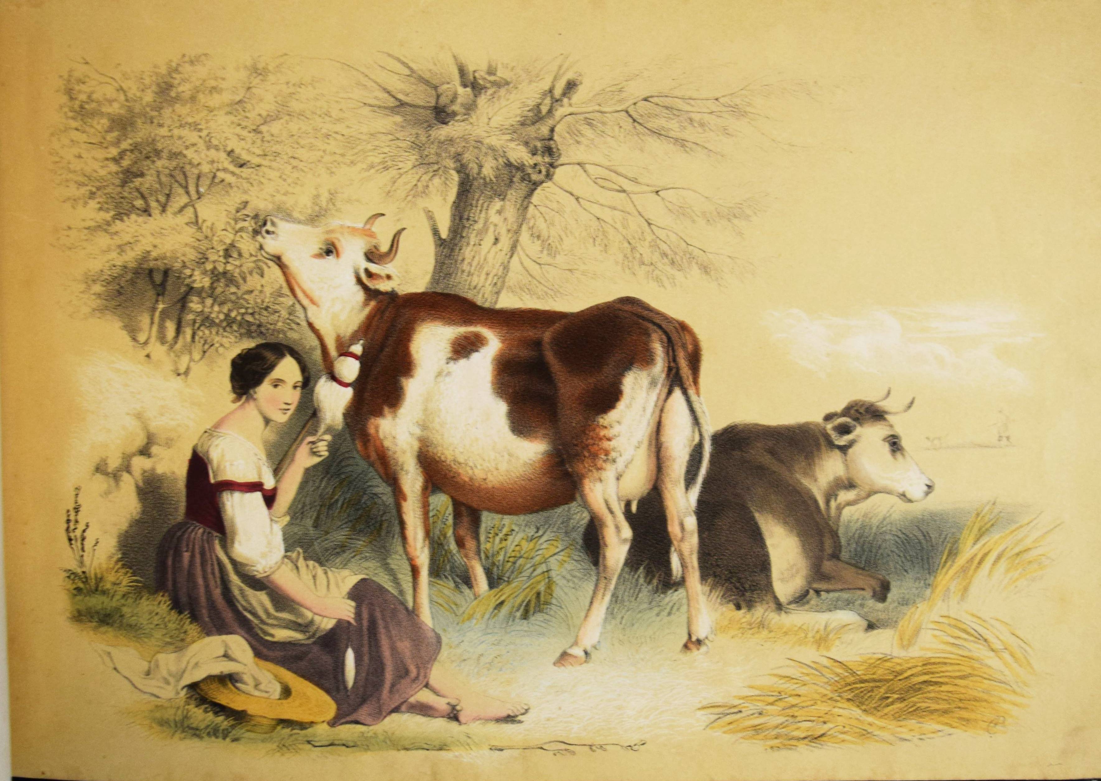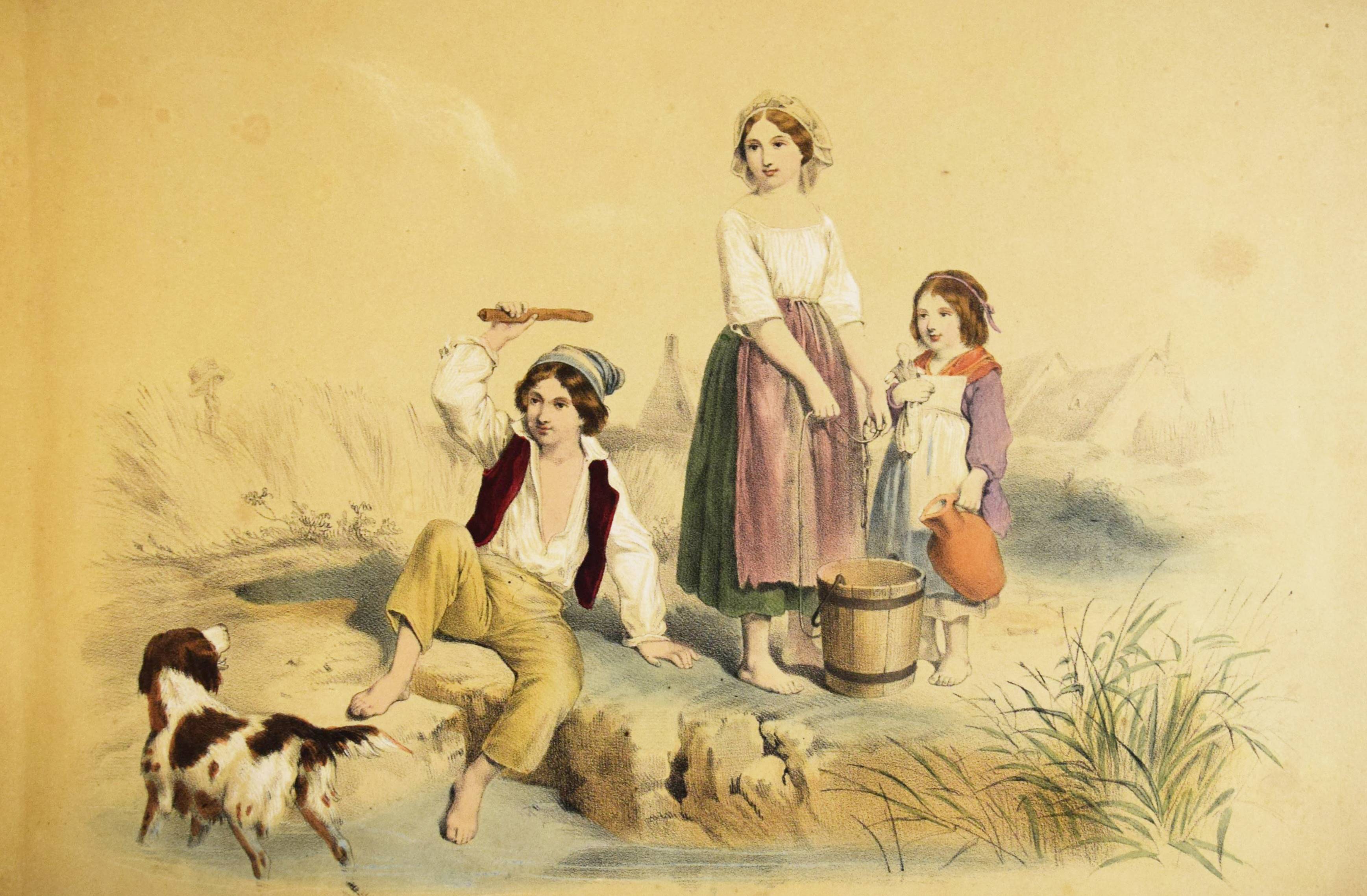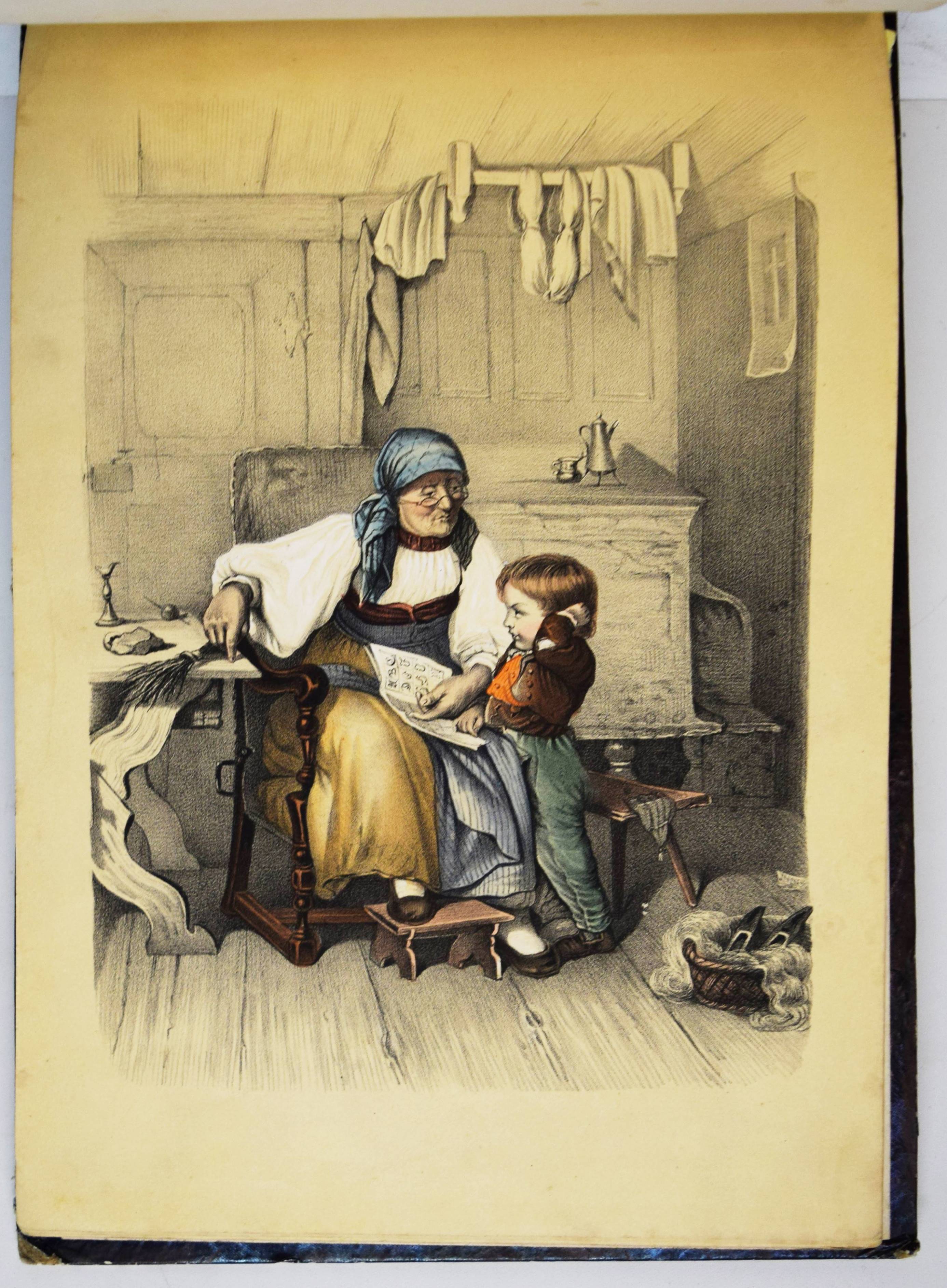 Album (Deckeltitel). Ohne Ort, Druck und Jahr (Mulhouse, Engelmann um 1860). Quer-4° (22 x 32 cm.). 20 handkol. lithogr. Tafeln. Orig.-Pappband mit goldgepr. Deckeltitel und Deckelvergoldung. Bilder-Album ohne Text mit 20 Genre- und Kinderszenen: Bärenjagd, raufende Jungen, kleiner Junge welcher einen schlafenden Wanderer bestehlen will, drei Schiffbrüchige, Kückenszene, Marktszene, Schulszene, Großmutter mit ABC-Buch etc. – Mit einem Etikett der Elsässer Lithographie-Anstalt Engelmann Père & Fils. Der Zeichner und Lithograph Godefroy Engelmann (1788-1839) erhielt am 31. August 1837 zusammen mit seinem Sohn Jean ein zehnjähriges Patent für „ein neues lithografisches Farbdruckverfahren“, das sie „lithocolore impression“ und bald darauf „chromolithographie“ nannten. – Rücken mit Fehlstellen, Kanten berieben, vorderes Innengelenk angeplatzt und unsachgemäss geklebt, sonst gut erhalten.