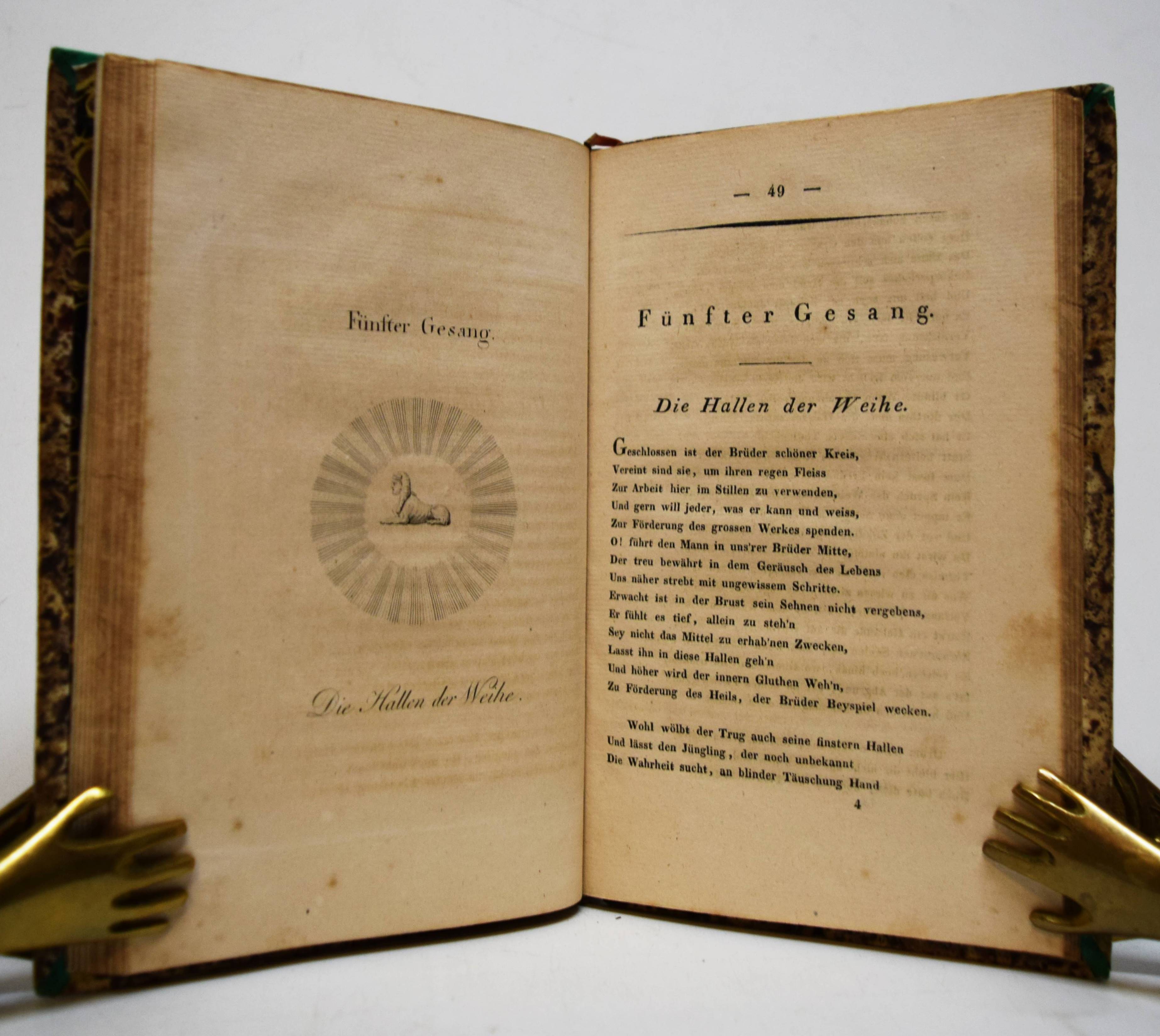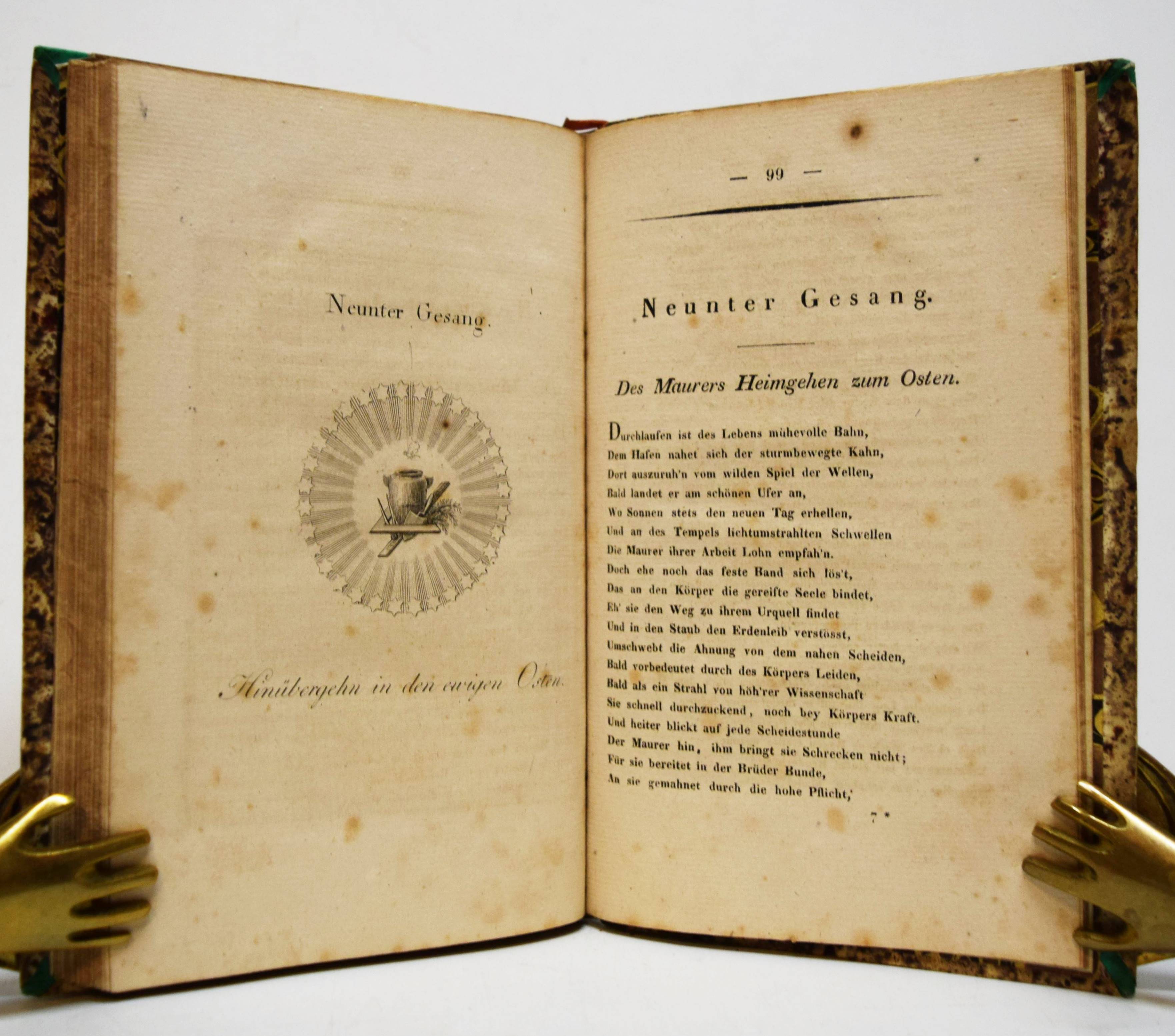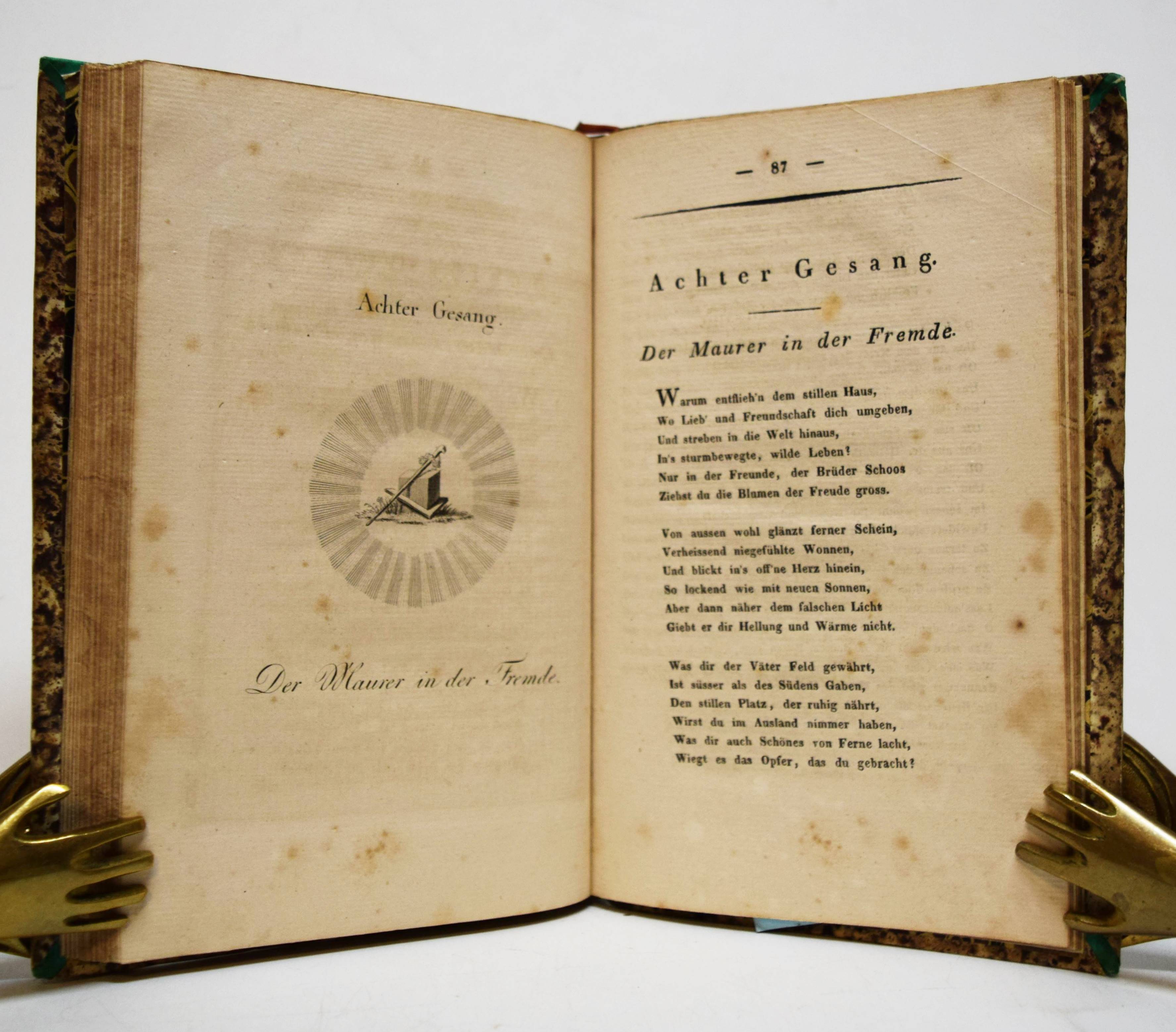 Winkler, K(arl) G(ottlieb) Th(eodor), (d. i. Theodor Hell). Des Maurers Leben. Dargestellt in 9 Gesängen. 3. Aufl. Dresden, Arnold 1825. 8°. XVI, 110 S. mit gestoch. Frontispiz und 9 gestoch. illustr. Zwischentiteln. Halblederband der Zeit mit goldgepr. Rückentitel und Rückenvergoldung. ADB XI, 693 f. Wolfstieg 26704. – Erschien zuerst 1816. – Gesänge über Religion, Vaterlandsliebe, Bruderliebe, die Liebe zu den Schwestern, die Hallen, die Weihe, den Maurer in der Fremde etc. – Der Dramatiker und Dichter T. Hell (1775-1856) war sächsischer Hofrat, Opern-Regisseur und Theater-Intendant in Dresden. – Einband etwas berieben, Exlibris, durchgehend braunfleckig, gutes Exemplar.