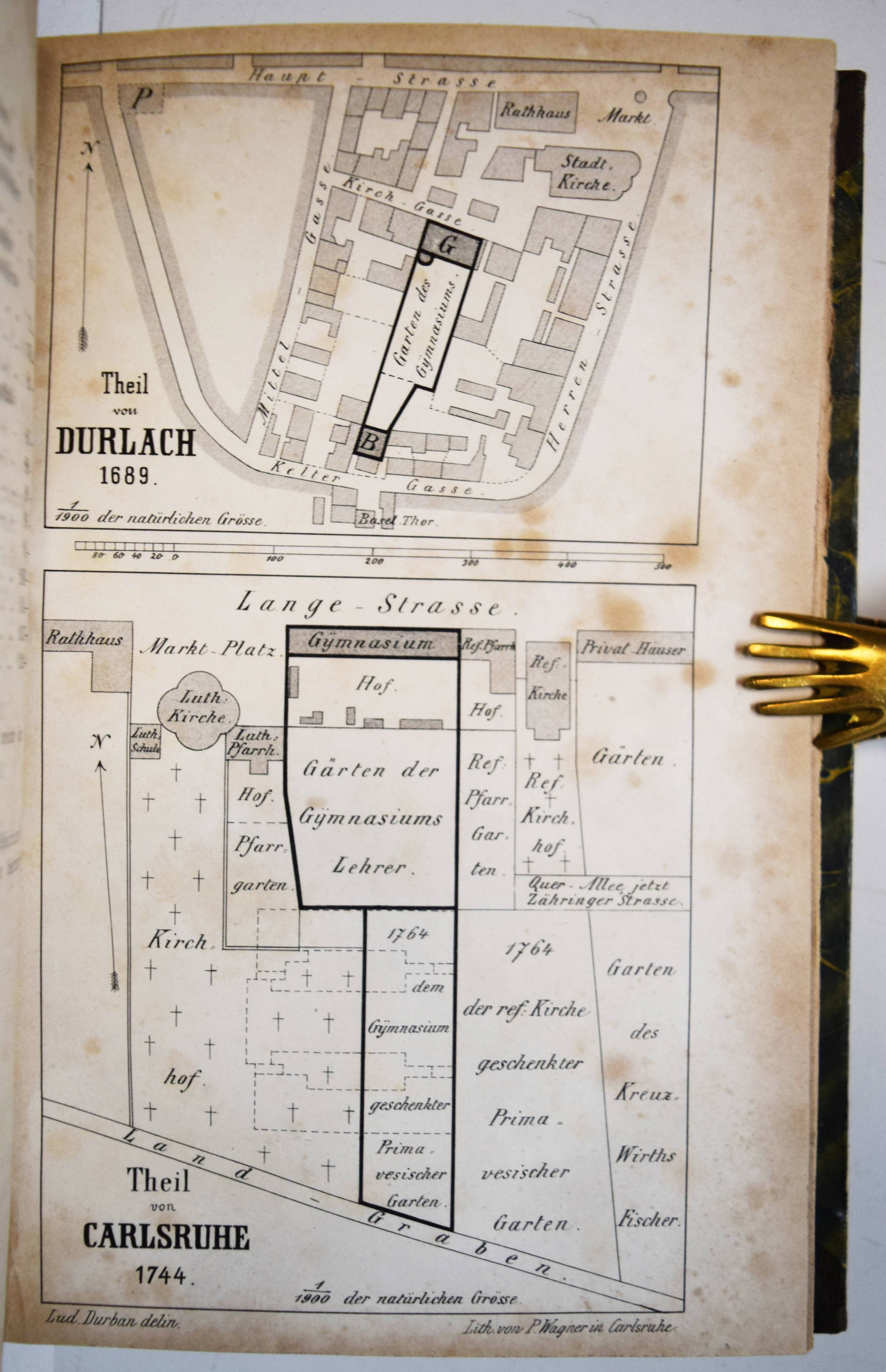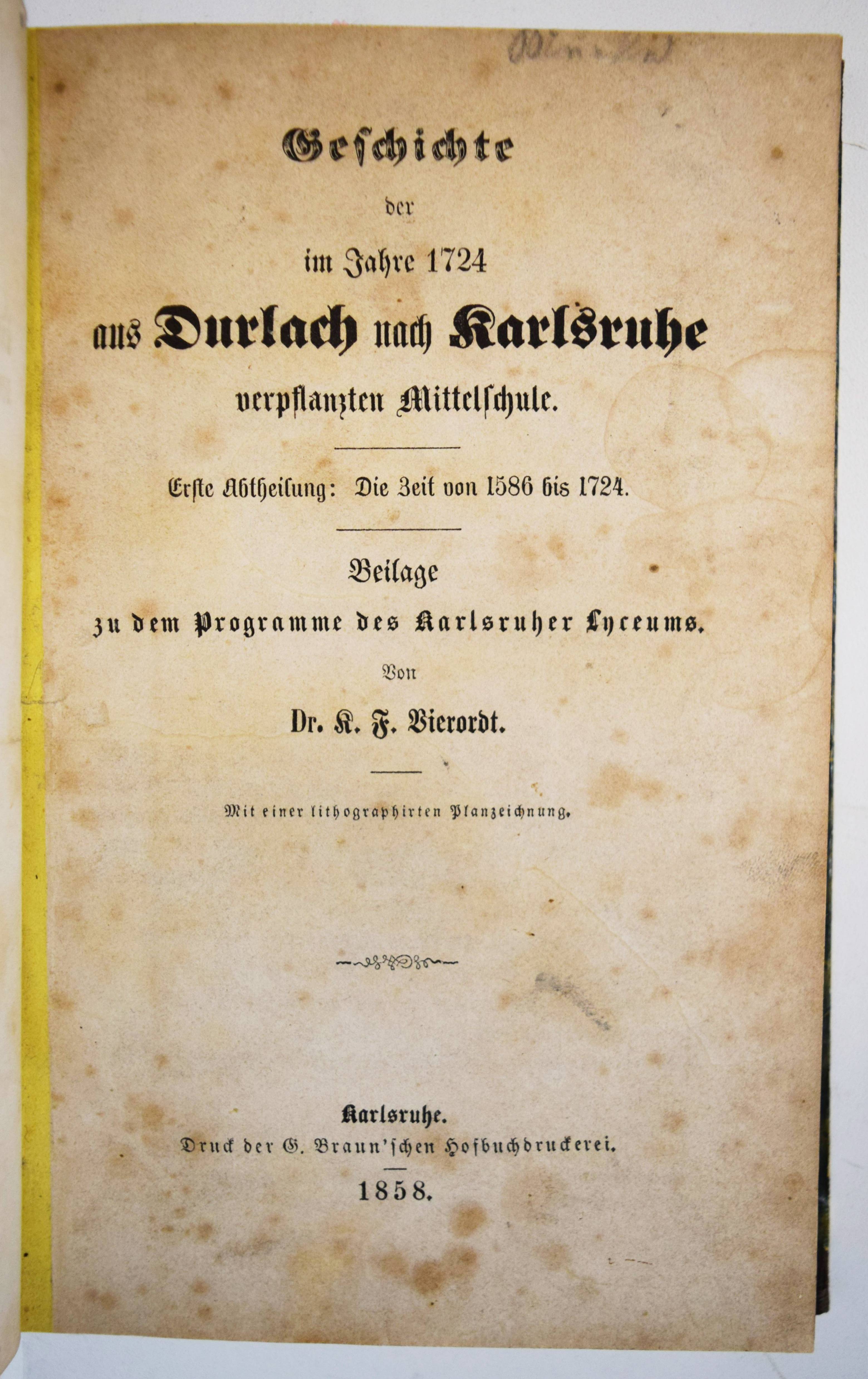 Vierordt, K(arl) F(riedrich). Geschichte der im Jahre 1586 zu Durlach eröffneten und 1724 nach Karlsruhe verpflanzten Mittelschule. Erste Abtheilung: Die Zeit von 1856 bis 1724. – Zweite Abtheilung: Die Zeit von 1724 bis 1859. 2 Teile in 1 Band. Karlsruhe, G. Braun 1859. 8°. 328 S. mit 1 lithogr. Plan. Halbleinenband der Zeit. (Beilage zum Programme des Karlsruher Lyceums). Vollständig sehr seltene Geschichte des Markgrafen Gymnasiums in Durlach. – Stellenweise, teils stärker braunfleckig, sonst gut erhalten.