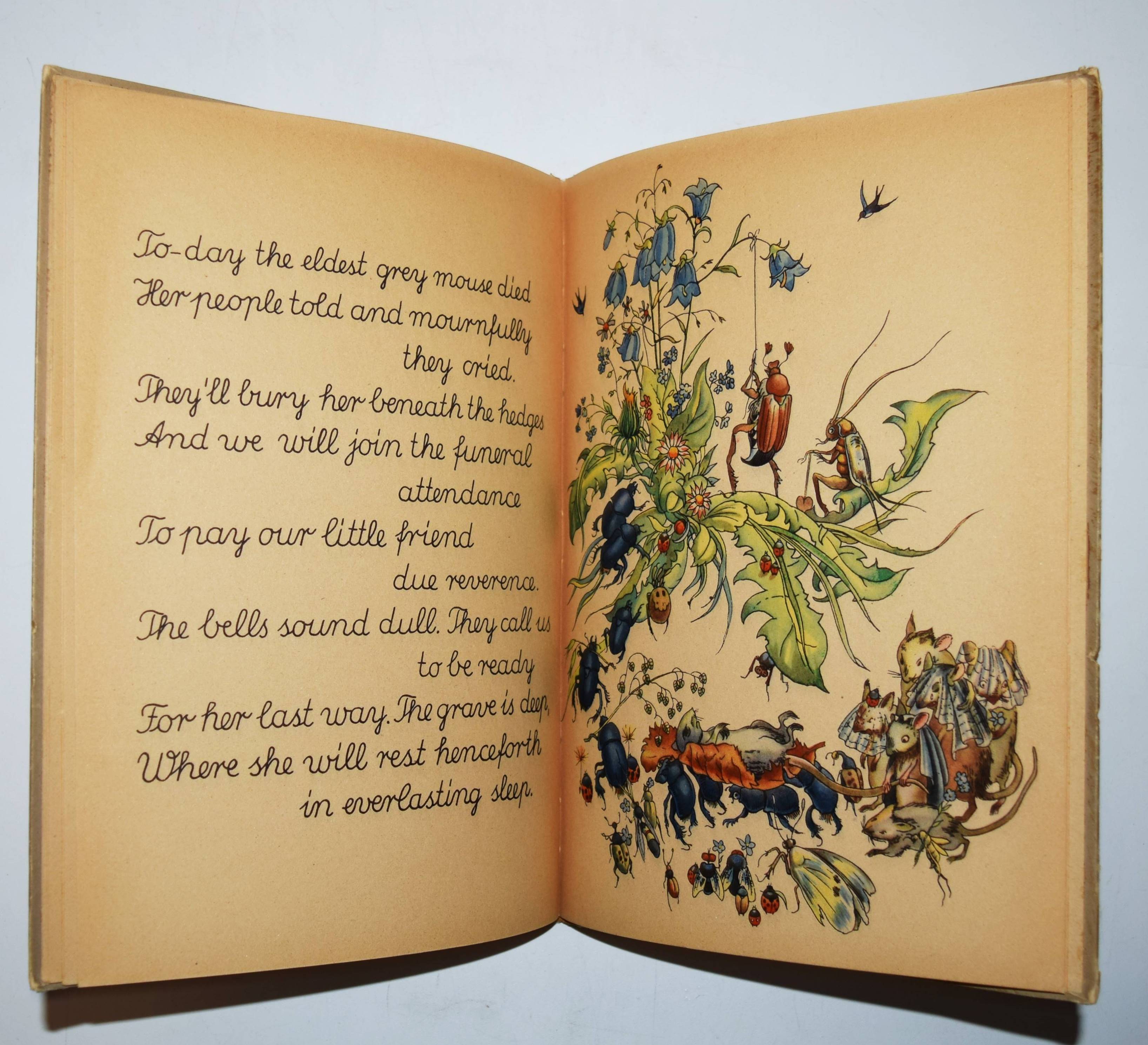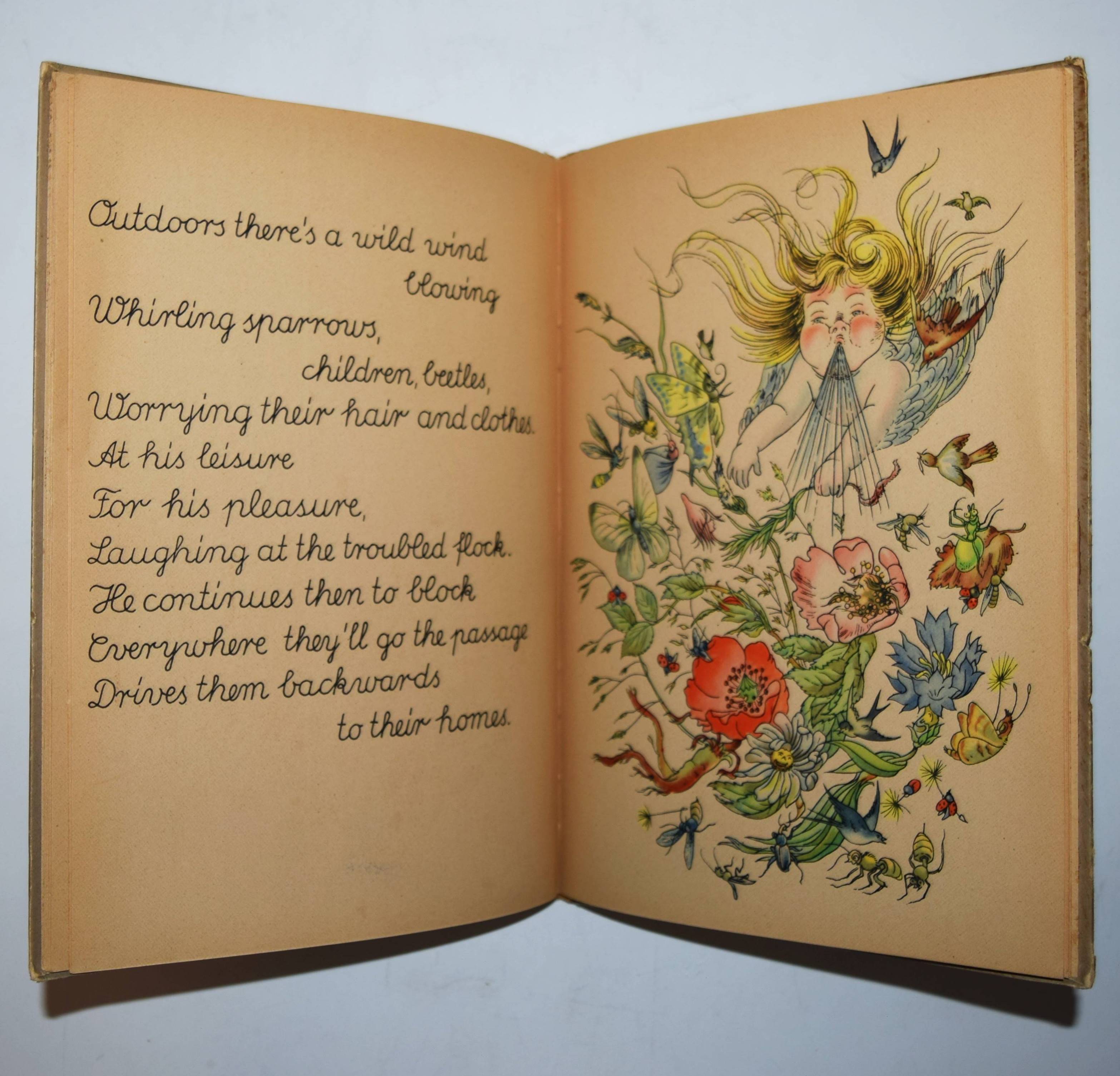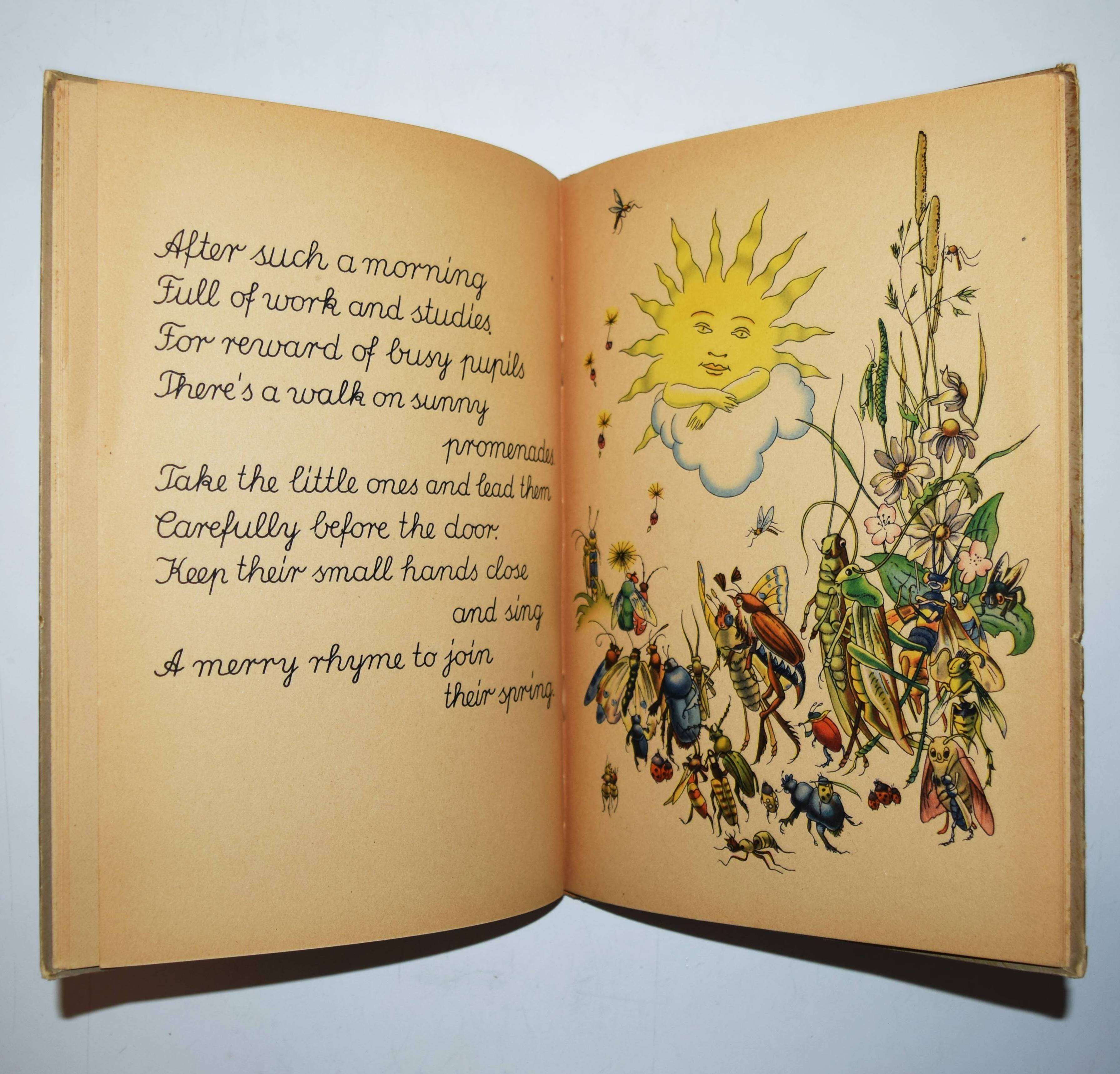 Faller, Lies. Our tiny darlings ! A picture-book for children. Karlsruhe, Kunstdruckerei Künstlerbund o. J. (1948). 4°. [14] Bl. mit farb. illustr. Titel und 11 ganzs. farb. Illustrationen von Leo Faller. Farbig illustr. Orig.-Halbleinenband. (Picture-Book Nr.1). Vgl. Muck II, 6662 und Slg. Kling 64 (beide deutsche Ausgabe mit dem Titel: „Vogel, Katze, Käfer, Kind!“). – Sehr seltene englische Ausgabe für die Kinder der US-Armee, die bis 1995 in fünf Kasernen in Karlsruhe und Ettlingen betrieb. – „Die Vermenschlichung der Tierwelt nimmt hier eine Zwischenstellung zwischen Jugendstil und Comic ein. Sie erinnert teilweise an „Lurchis Abenteuer“, die späteren Werbehefte der Schuh-Firma Salamander.“ (V. Haase in Slg. Kling). Text in Schreibschrift. – Kanten und Deckel etwas berieben, papierbedingt leicht gebräunt, gutes Exemplar.