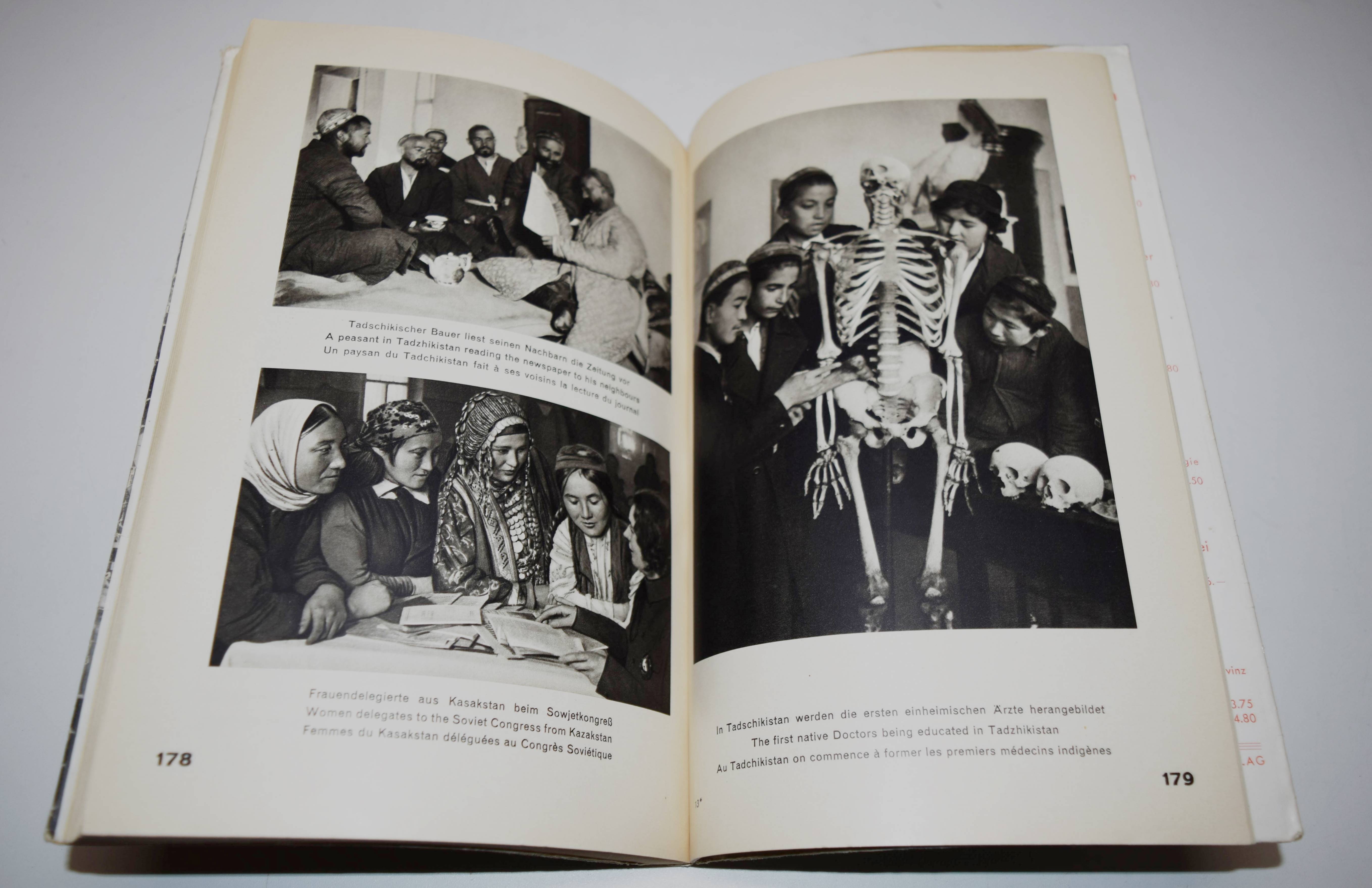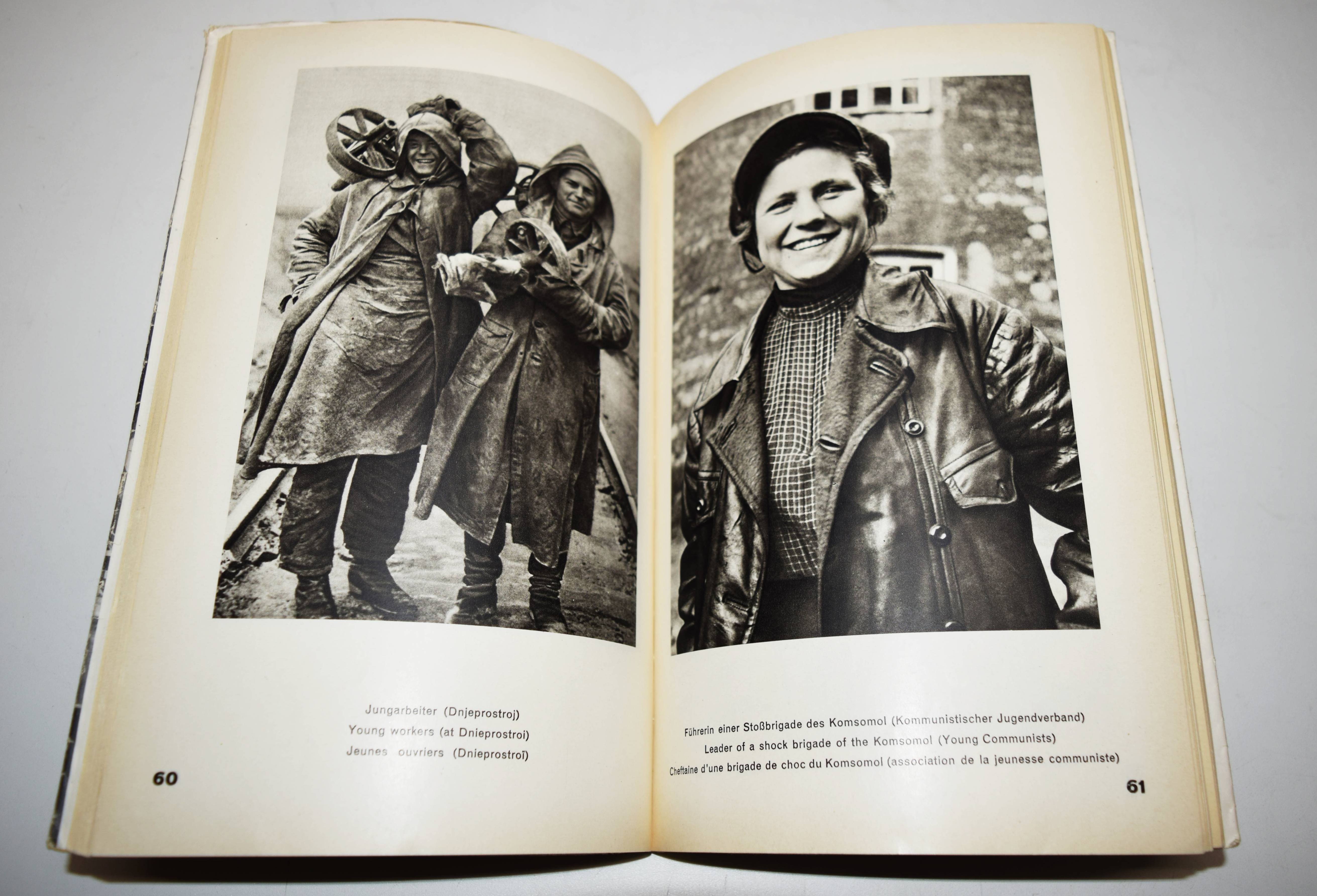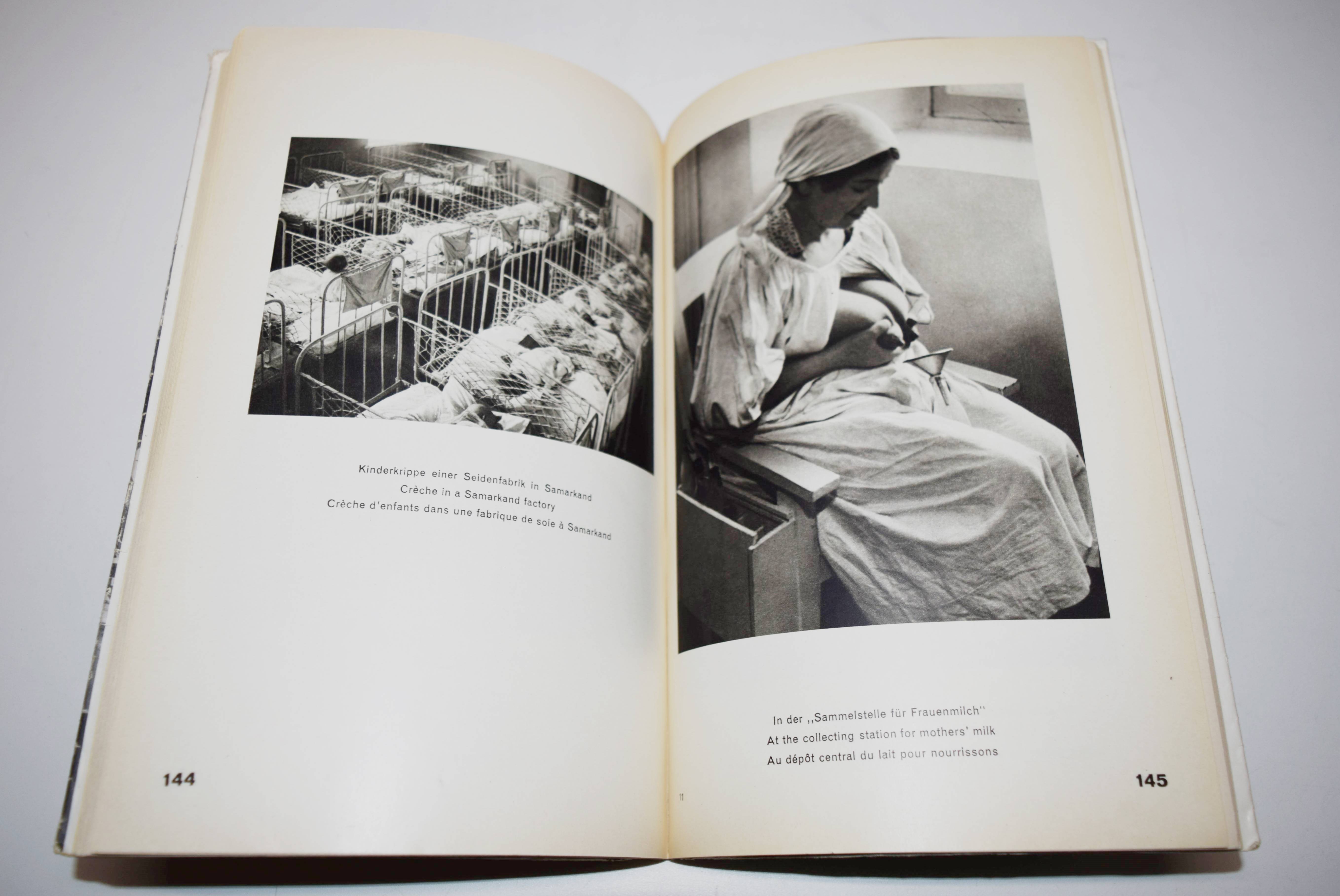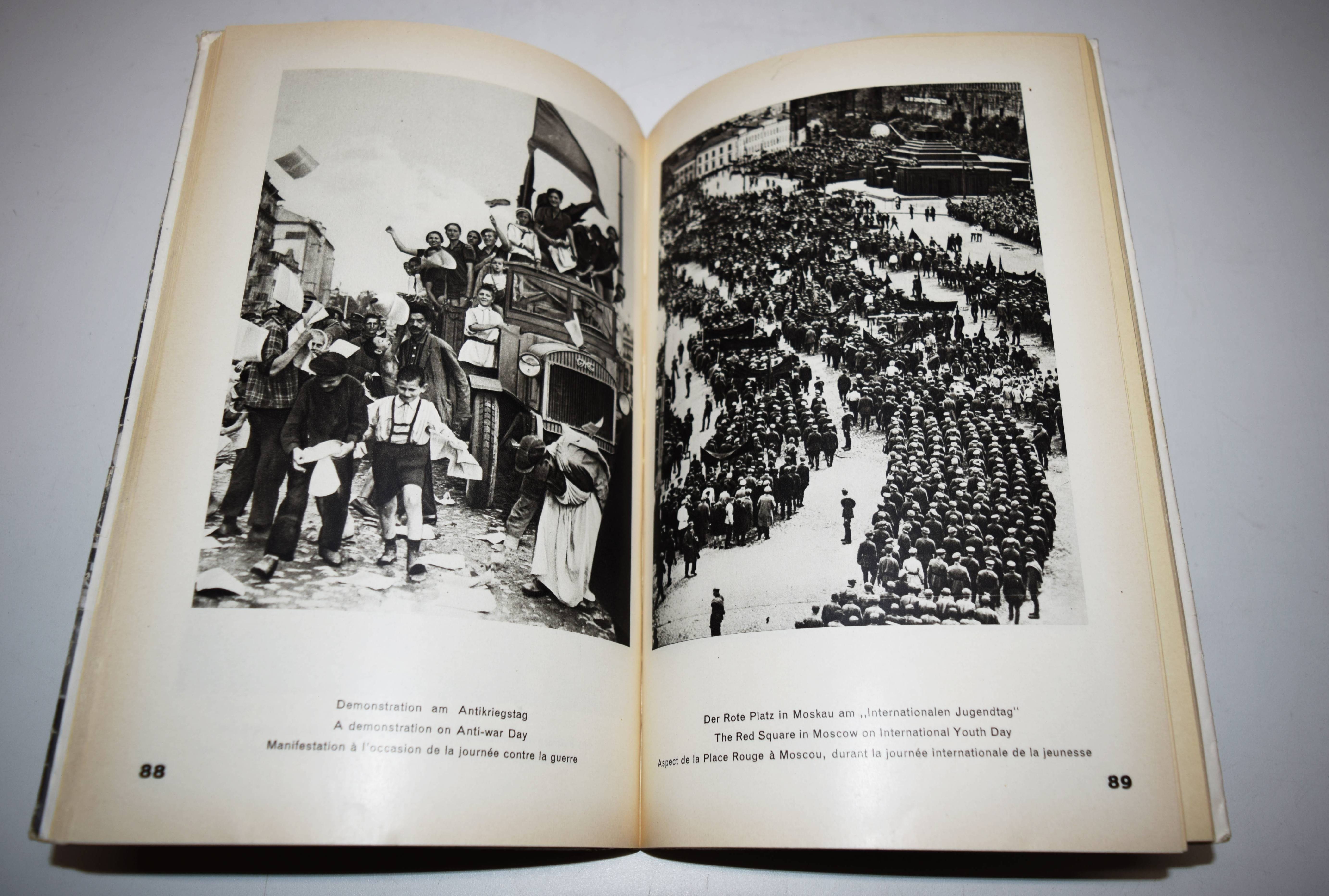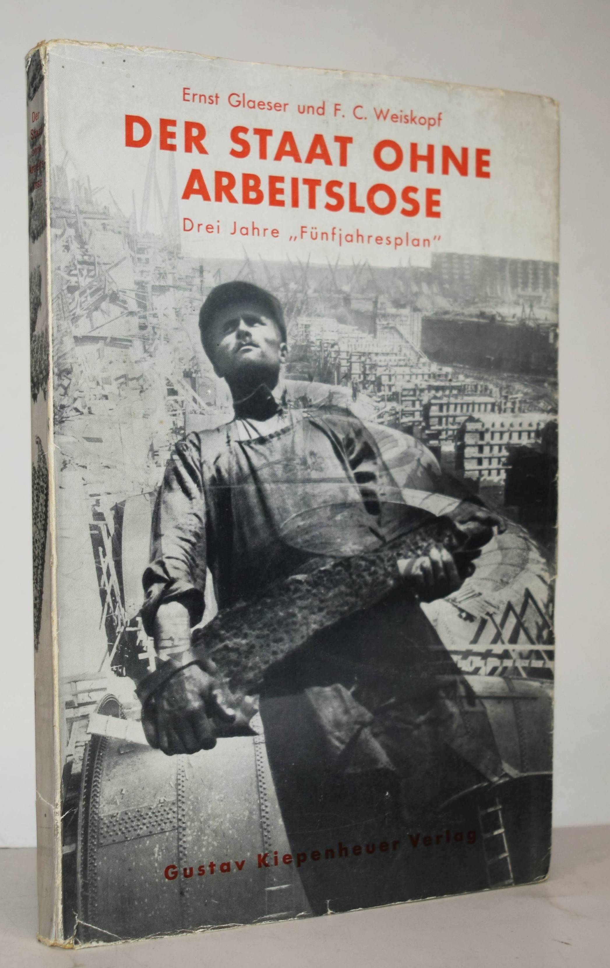 Glaeser, Ernst und F(ranz) C(arl) Weiskopf. Der Staat ohne Arbeitslose. Drei Jahre „Fünfjahresplan“. Mit einem Nachwort von Alfred Korella. Berlin, Gustav Kiepenheuer (1931). Gr.-8°. VIII, 198 S., [1] Bl. mit 265 Abbildungen nach Fotografien von Alexander Michailowitsch Rodtschenko u. a. und 2 Karten. Orig.-Kartonumschlag mit Schutzumschlag (Fotomontage von John Heartfield). Heiting/Jaeger I, 285 ff. Heidtmann 15387. Melzwig 744.1. W.-G.² 5. – Erste Ausgabe. – „Während Tucholskys Blick auf Deutschland von Kritik und beißendem Sarkasmus durchzogen war, warfen Ernst Glaeser und Franz Carl Weiskopf 1931, anlässlich von „Drei Jahren ‚Fünfjahresplan‘“, einen wohlwollend-bewundernden Blick auf die junge Sowjetunion, den vermeintlichen Staat ohne Arbeitslose. Schon 1927 hatte Weiskopf in seinem bei Malik erschienenen Reisebericht Umsteigen ins 21. Jahrhundert den Sowjetstaat als Vorbild für die Gesellschaftsordnung der Zukunft gefeiert. Für den Bildband im Berliner Verlag Gustav Kiepenheuer wurde ein 184-seitiger, lateinisch durchnummerierter Buchblock mit 265 Abbildungen zusammengestellt, die die Herausgeber laut Impressum aus über 5.000 Bildern der russischen Agentur Ogonjok und der Berliner Unionbild aus wählten. Dieser Bildteil, im Kupfertiefdruck bei Oscar Brandstetter in Leipzig produziert, enthält die Bildunterschriften in drei Sprachen (Deutsch / Englisch / Französisch) und wurde analog für die französische und englische Ausgabe des Buches verwendet. Lediglich das römisch nummerierte Vorwort der Herausgeber und das erklärende Nachwort zum Fünfjahresplan von Alfred Kureila wurden für die jeweiligen nationalen Ausgabennoch übersetzt. Die deutsche Variante erschien zunächst ohne Angabe einer Auflagenhöhe in einer kartonierten Ausgabe mit aufgeklebtem Schutzumschlag von John Heartfield, der sich zur selben Zeit auf einer mehrmonatigen Reise in die Sowjetunion befand.“ (P. Rössler in Heiting/Jaeger). – Schutzumschlag mit geringfügigen Randläsuren, sehr gutes Exemplar.