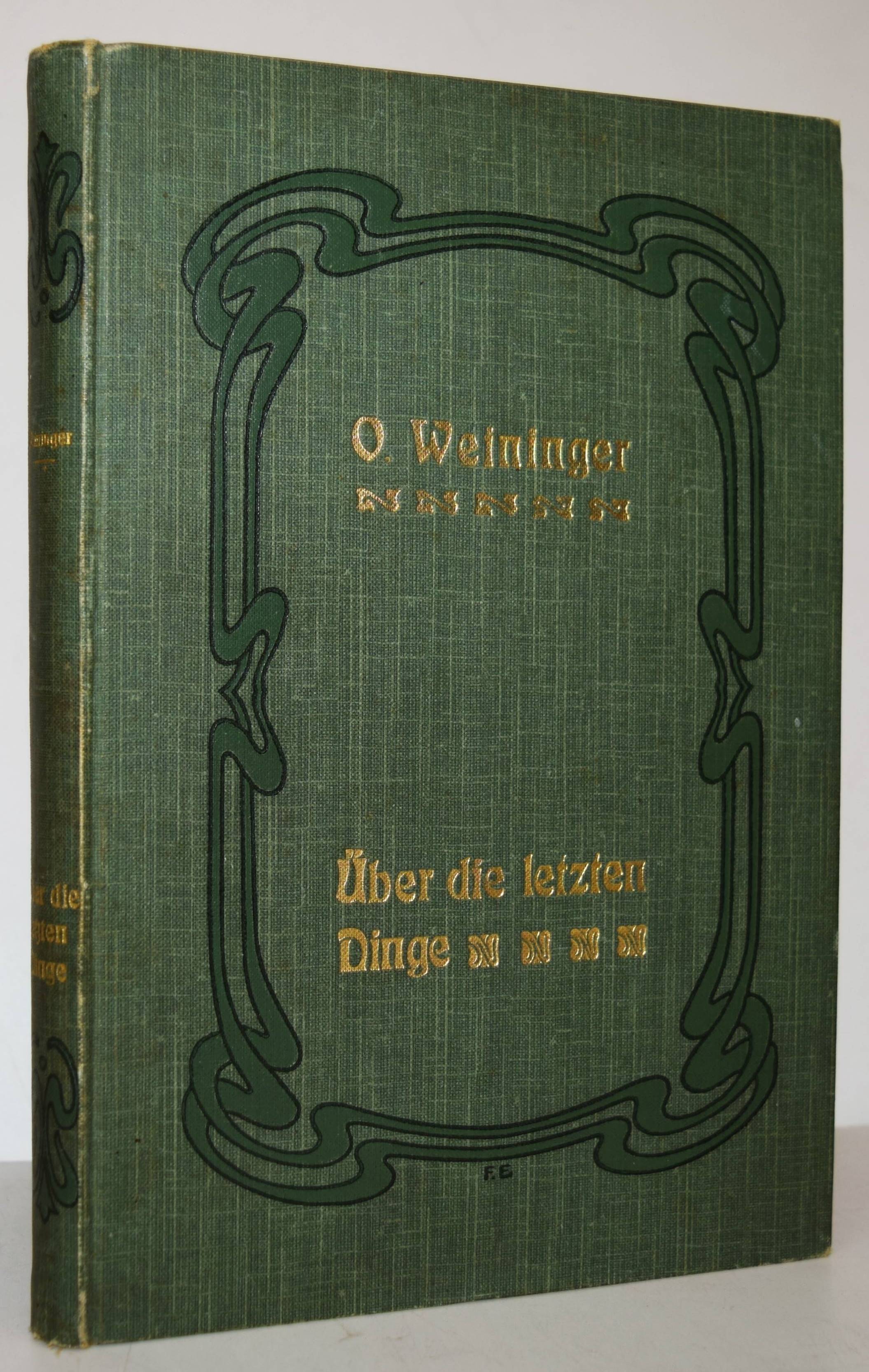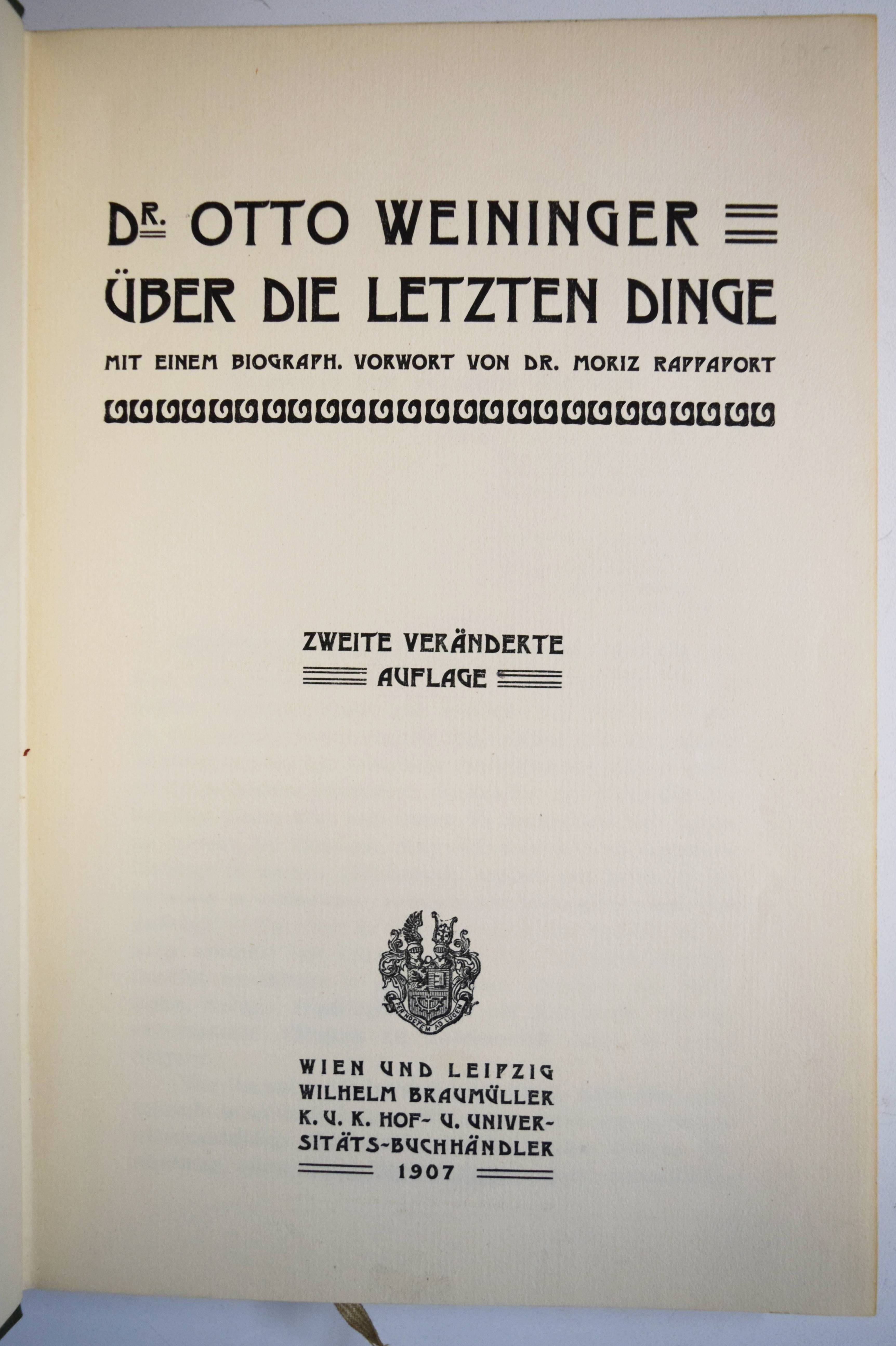 Weininger, Otto. Über die letzten Dinge. Mit einem biografischen Vorwort von Moritz Rappaport. 2. veränderte Auflage. Wien, Wilhelm Braumüller 1907. 8°. XXIII, [1] Bl., 178 S. Orig.-Leinenband mit goldgepr. Rücken- und Deckeltitel und Jugendstil-Ornamentik. Ziegenfuss II, 847. – Zweite veränderte Auflage des posthum veröffentlichten Werks; die erste Ausgabe erschien 1904, im Jahr nach Weiningers Freitod. – Der Wiener Philosoph O. Weininger (1880-1903), der besonders durch sein Hauptwerk „Geschlecht und Charakter“ berühmt wurde und zahlreiche andere Denker seiner Zeit beeinflusste, „entwickelte die Theorie von der psychisch-physischen Bisexualität des Menschen. Neben der Pschologie und Metaphysik der Geschlechter beschäftigt ihn die Psychologie des Genies“ (W. Ziegenfuss). – Weiningers Philosophie war stark von Immanuel Kant geprägt, wies aber auch starke antisemitische und misogyne Züge auf. Im Jahre 1903, im Alter von 23 Jahren, nahm sich Otto Weininger in Beethovens Sterbehaus in Wien das Leben. – Sehr schönes Exemplar im dekorativen Jugendstil-Einband.