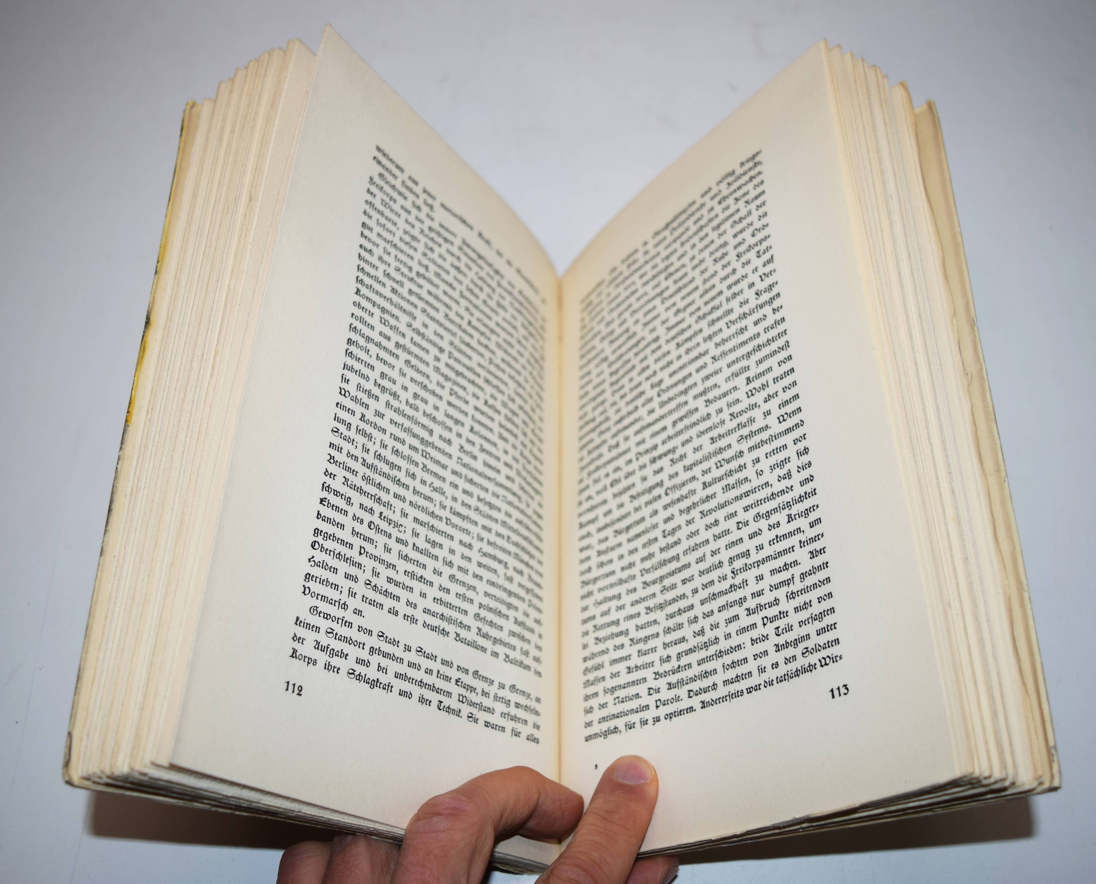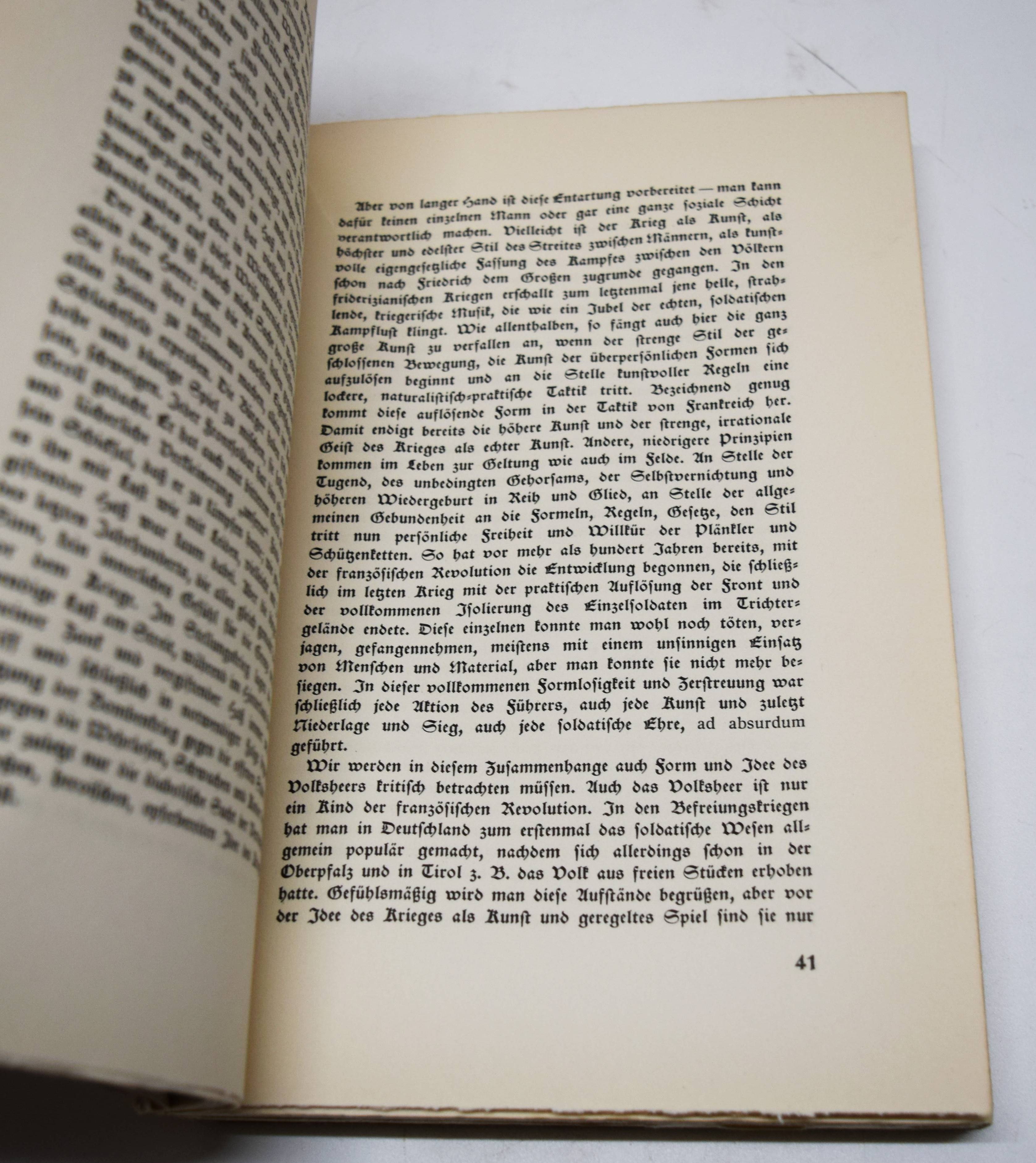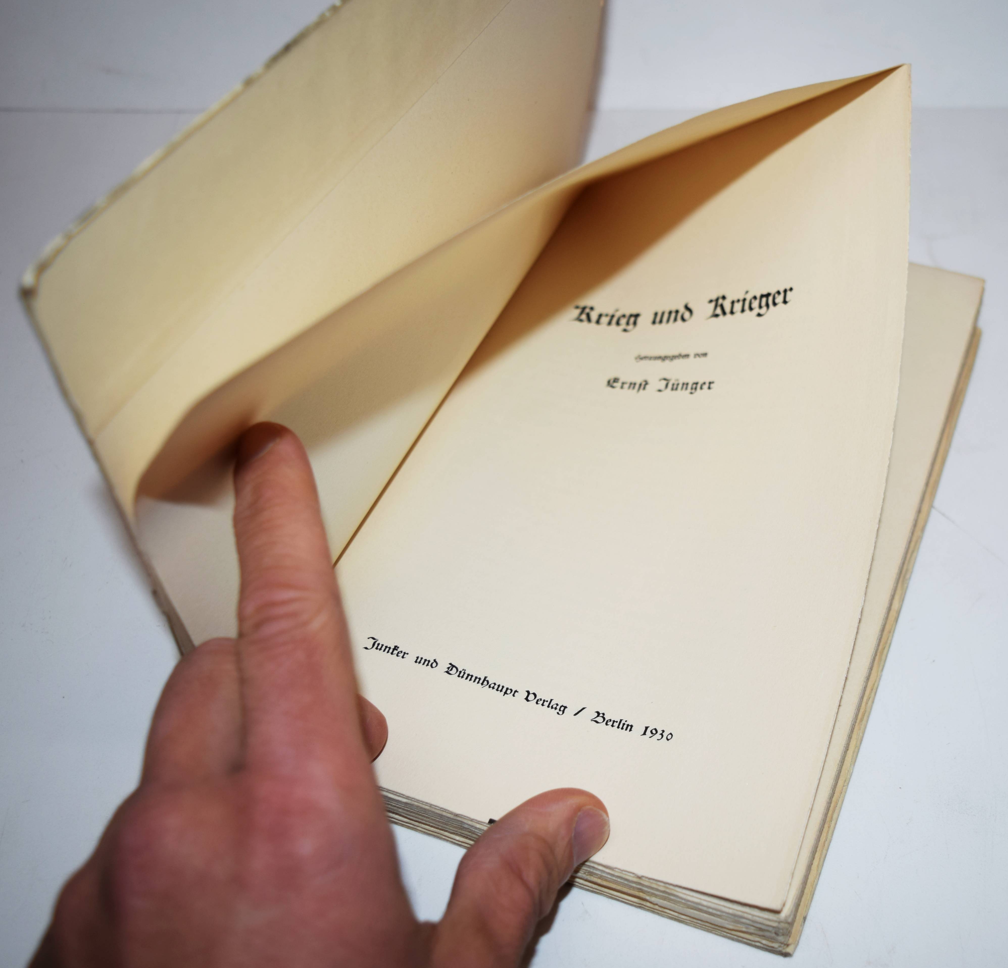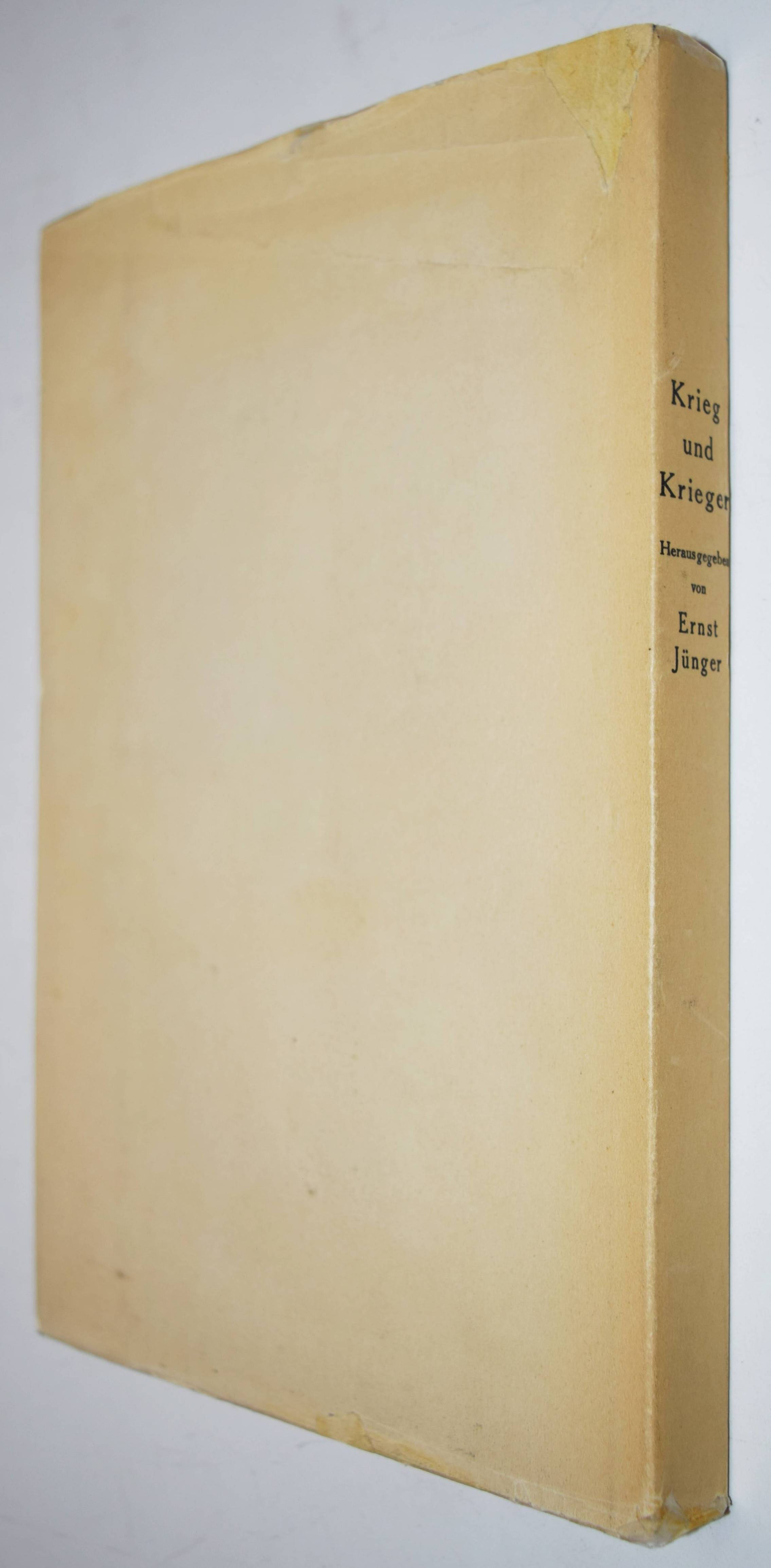 Jünger, Ernst (Hrsg.). Krieg und Krieger. Berlin, Junker und Dünnhaupt 1930. Gr.-8° (24 x 16,5 cm.). 203 S. Orig.-Kartonumschlag mit farbig illustr. Schutzumschlag (von Rudolf Schlichter). Des Coudres-Mühleisen C5. Holstein, Buchumschläge 298. – Erste Ausgabe. – Enthält neun Beiträge; von E. Jünger Vorwort und „Die totale Mobilamchung“ (S. 9-30). – Die andern Beiträge von Wilhelm v. Schramm „Schöpferische Kritik des Krieges“, von Friedrich Georg Jünger „Krieg und Krieger“, Albrecht Erich Günther „Die Intelligenz und der Krieg“, Ernst v. Salomon „Der verlorene Haufe“, Friedrich Hielscher „Die große Verwandlung“, Werner Best „Der Krieg und das Recht“, Gerhard Günther „Die Bändigung des Krieges durch den Staat“. – „Die erschreckende Umschlagzeichnung mit einem Tank, derÄhnlichkeit mit einem sinkendem Schiff hat, mit vorbeimarschierenden Soldaten und Bombentrichtern. Blut überall“ (J. Holstein). – Schutzumschlag am Rückendeckel mit geschlossenem Einriß, sehr gutes sauberes und unbeschnittenes Exemplar.