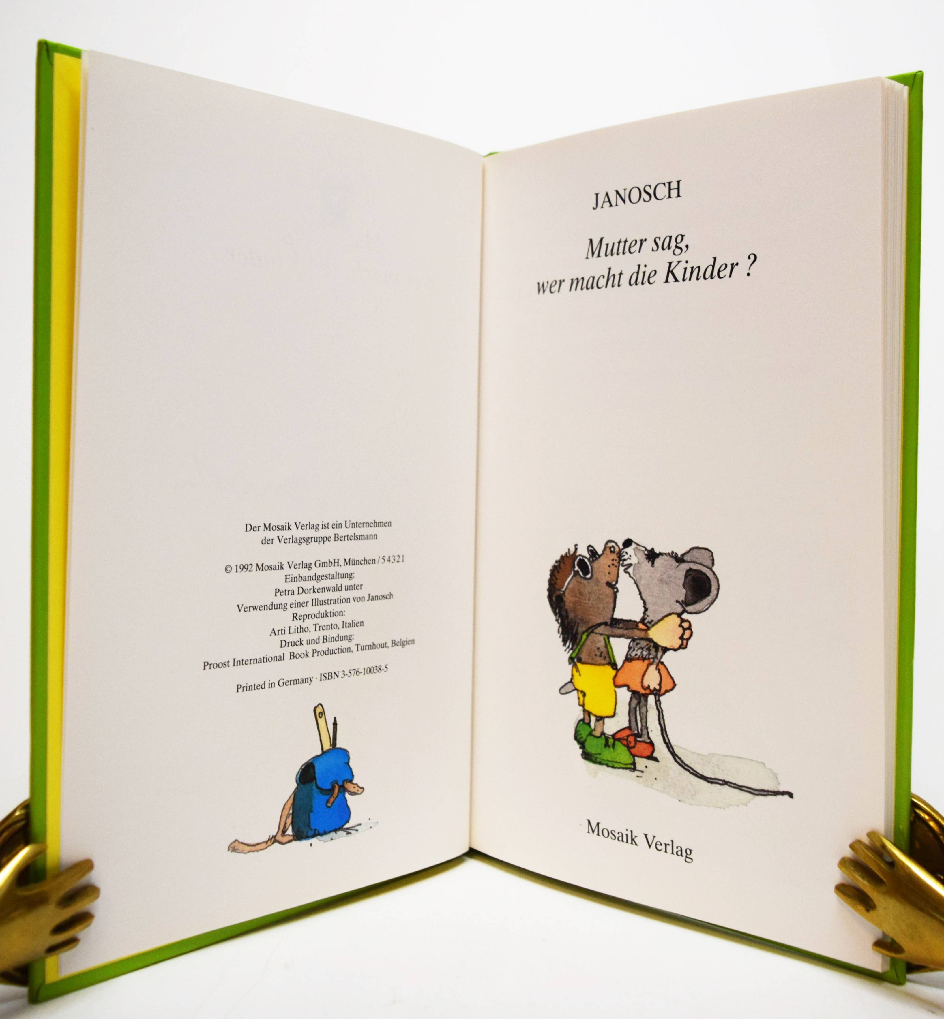 Janosch (d. i. Horst Eckert). Mutter sag, wer macht die Kinder? München, Mosaik-Verlag (1992). 4°. [22] Bl. mit farbigen illustrationen. Farbig illustr. Orig.-Pappband. Erste Ausgabe. – Von Janosch signiert. – Sehr gutes Exemplar.