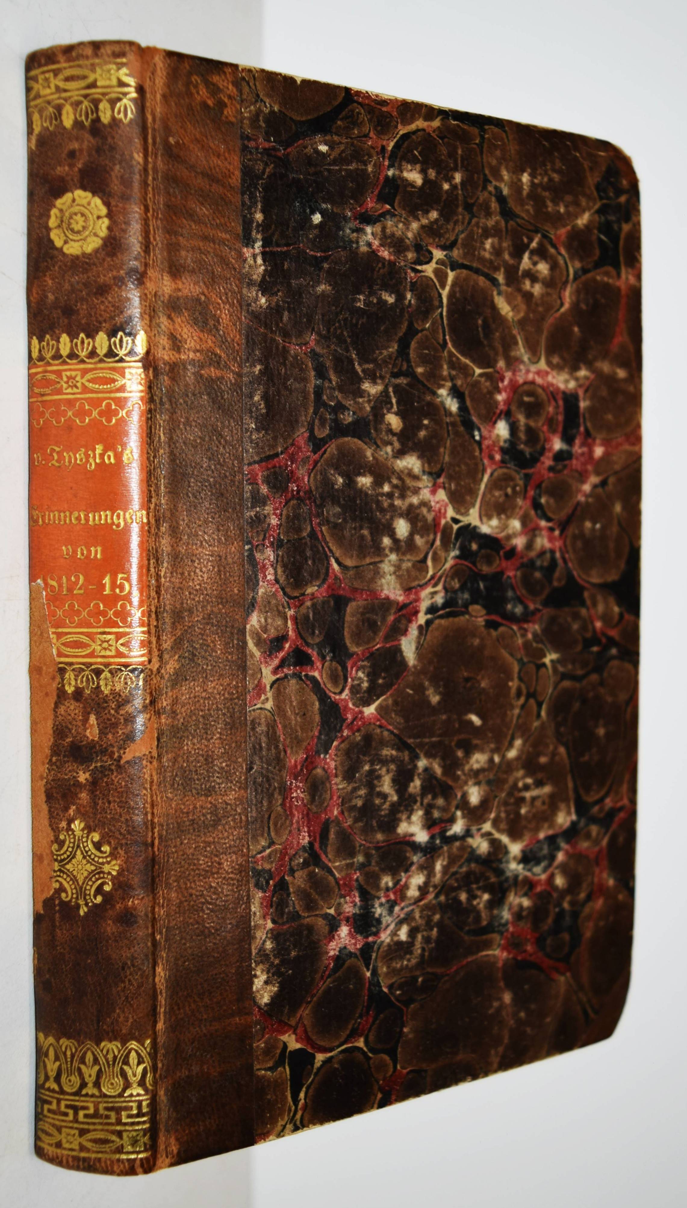 Tyszka, (Karl Wilhelm) v. Erinnerungen aus den Jahren 1812, 1813, 1814 und 1815. Auch enthaltend: Die Geschichte des 1sten (vormals litthauischen) Dragoner-Regiments, während der Feldzüge in dieser Zeit. Gumbinnen, J. W. W. Krauseneck (1829). 8°. Titel, XVI, 366 S., [1] Bl. Halblederband der Zeit mit goldgepr. Rückenschild und Rückenvergoldung. Erste Ausgabe. – „Zum Besten der durch die Ueberschwemmung in der Tilsiter Niederung Nothleidenden herausgegeben“. – Tyszka, Rittmeister im Ersten Dragoner-Regiment, hat 1837 auch eine „Geschichte des köngl. Preußischen 1sten Dragoner-Regiments, seit dessen Stiftung im Jahr 1717 bis auf die gegenwärtige Zeit“ herausgegeben. – „Das Dragoner-Regiment „Prinz Albrecht von Preußen“ (Litthauisches) Nr. 1 war ein Dragonerverband der Preußischen Armee, der von 1717 bis 1919 bestand und zu den ältesten Kavallerieregimentern der Preußischen Armee zählte. … Der Verband nahm zunächst in Tilsit und Insterburg Quartier. Die Hälfte des Regiments (zwei Eskadron) nahm 1812 im Mobilen 1. Dragoner-Regiment im preußischen Hilfskorps unter General Yorck an Napoleons Feldzug gegen Russland und 1813/14 an den Feldzügen gegen Frankreich teil“ (Wikipedia). – Rücken am hinteren Gelenk mit Abriebstelle, Deckel etwas berieben, gutes sauberes Exemplar.
