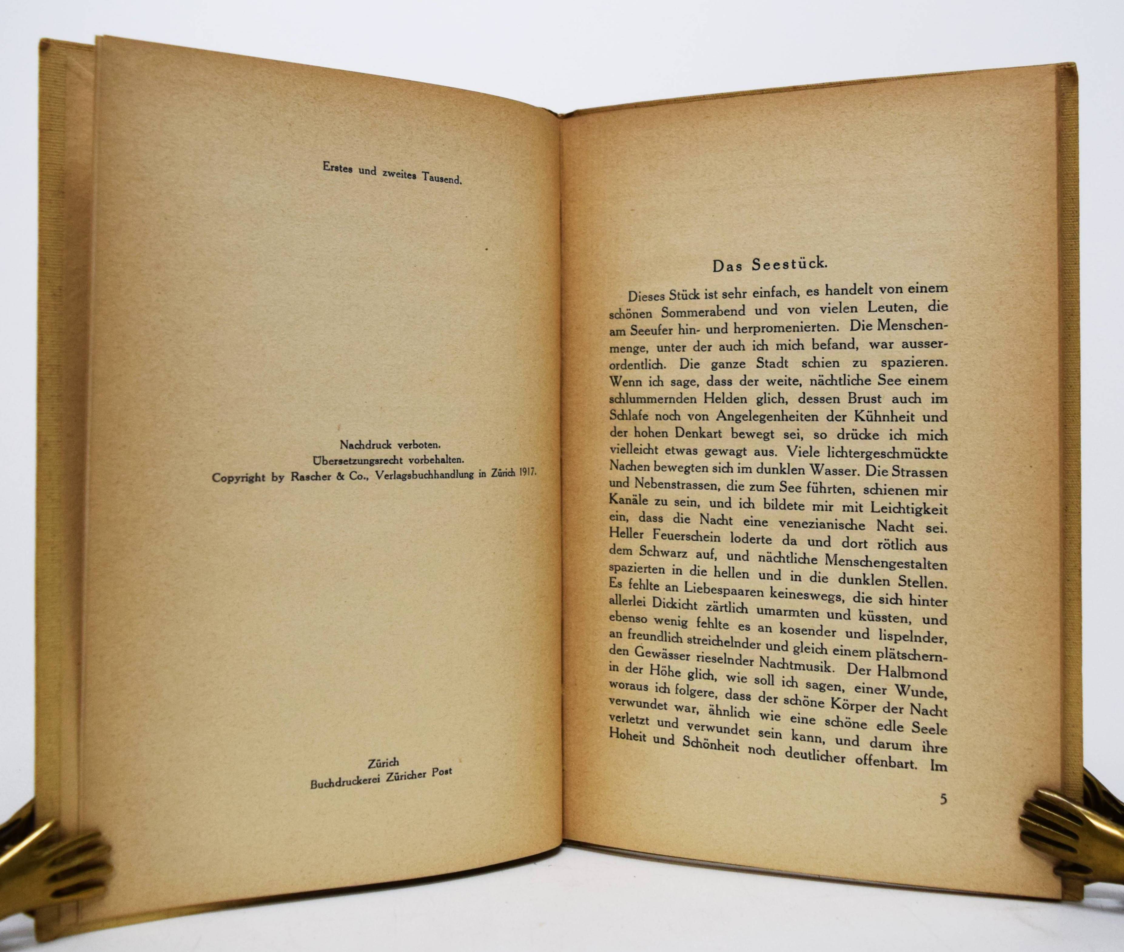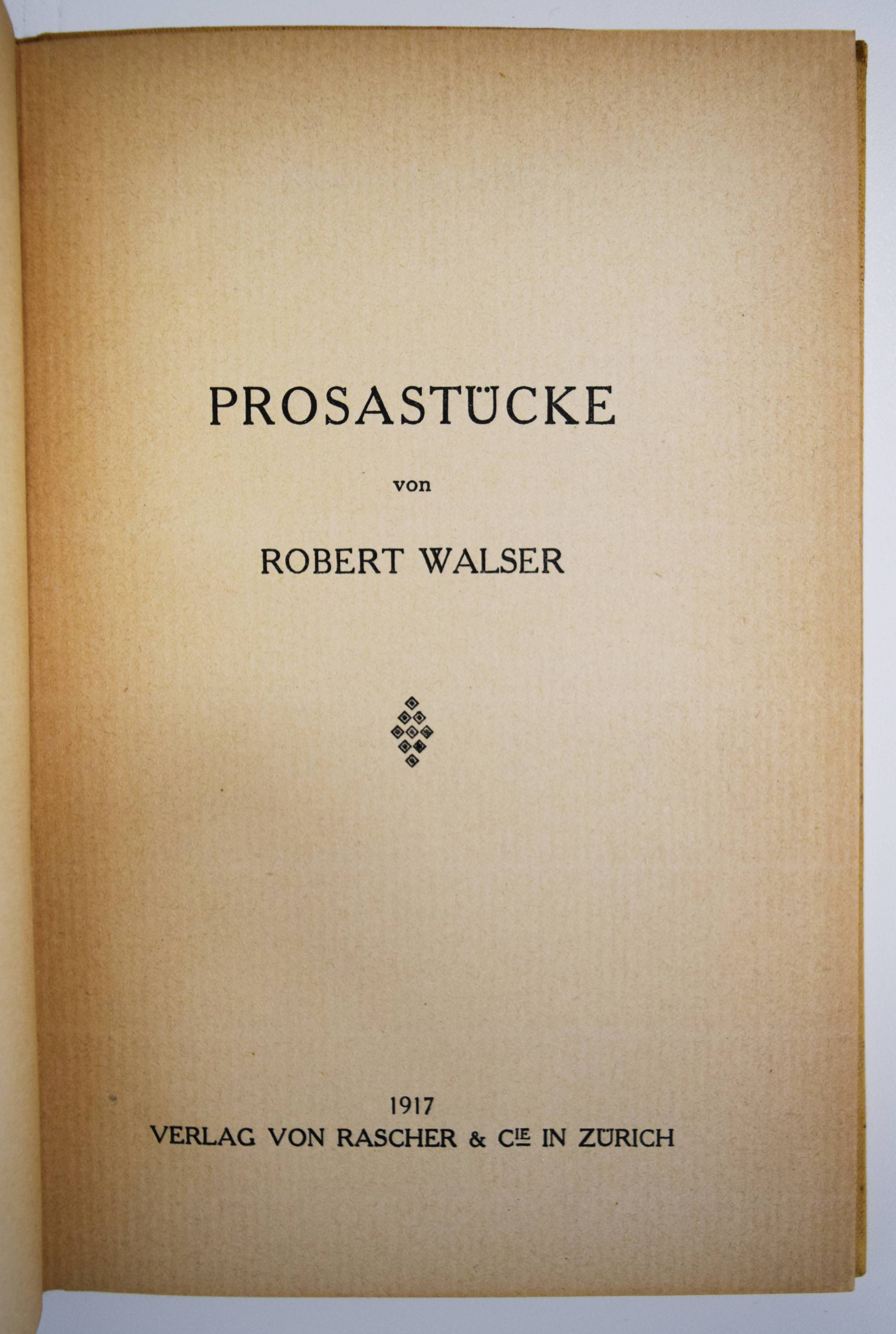 Walser, Robert. Prosastücke. Zürich, Rascher & Cie. 1917. 8°. 50 S., [3] Bl. Illustr. Orig.-Leinenband (Illustration: Karl Walser). (Schriften für Schweizer Art und Kunst, Band 55). Badorrek-Hoguth B 88. W.-G.² 9. – Erste separate Ausgabe und das erste in der Schweiz verlegte Buch des Schriftstellers. Auf dem Vorderdeckel ist „1916“ angegeben. Eines von 2000 Exemplaren. – Sammlung bis dahin ungedruckter Prosa mit den Erzählungen: Das Seestück; Die italienische Novelle; Koffermann und Zimmermann; Der Flinke und der Faule; Der Maskenball; Die Verlassene; Die Mörderin; Die Brüder; Schüler und Lehrer; Sohn und Mutter; Die böse Frau; Berta; Die Wurst; Der Junggeselle; Zahnschmerzen; Der andere Junggeselle; Schwendimann und Ich habe nichts. – „Der Verlag brachte den Band sowohl broschiert mit Reihentitel als auch gebunden (Leinen und Pappband) heraus. Ausserdem wurden Druckbögen in das ‚Schweizer Novellen und Skizzenbuch‘ intergriert, das 1917 als vierte Folge von ‚Raschers Jahrbuch für Schweizer Art und Kunst‘ erschien“ (Echte, Robert Walser. Sein Leben und Werk, 2006, Nr. 564). – Einband etwas angestaubt, Name auf dem Vorsatz, gutes Exemplar der sehr seltenen gebundenen Ausgabe.