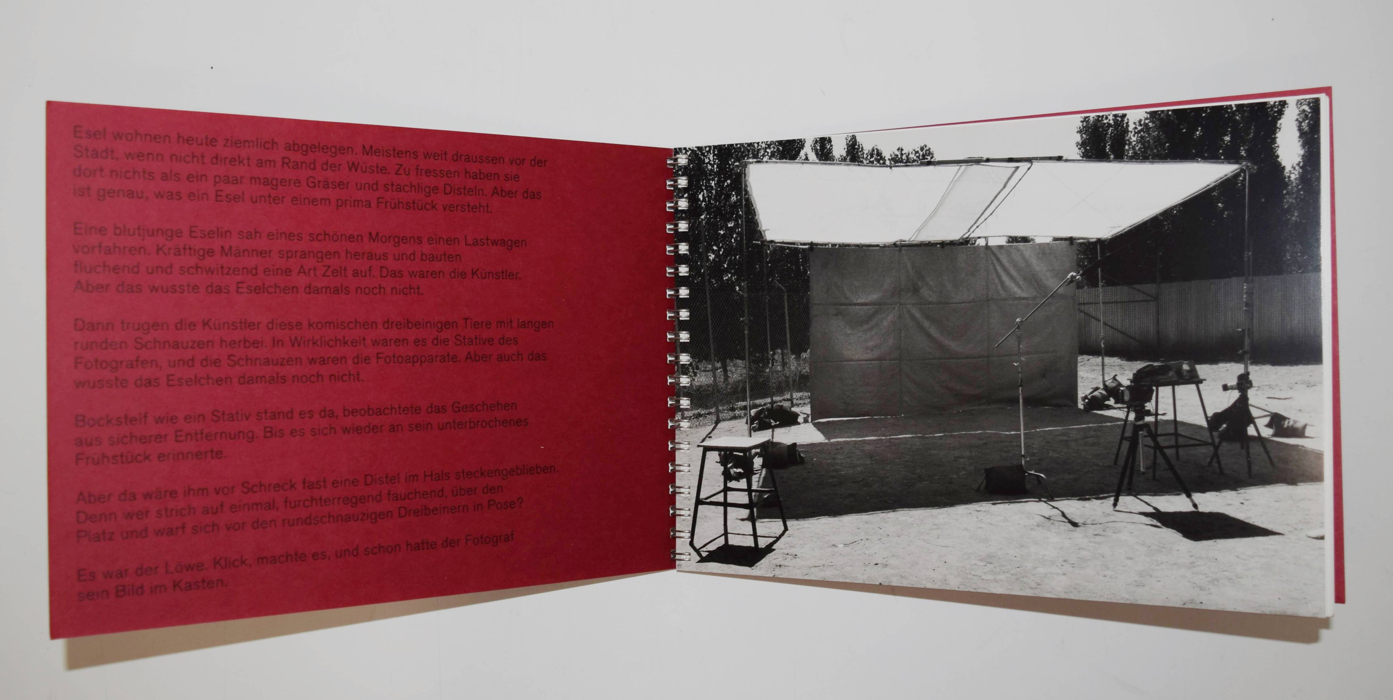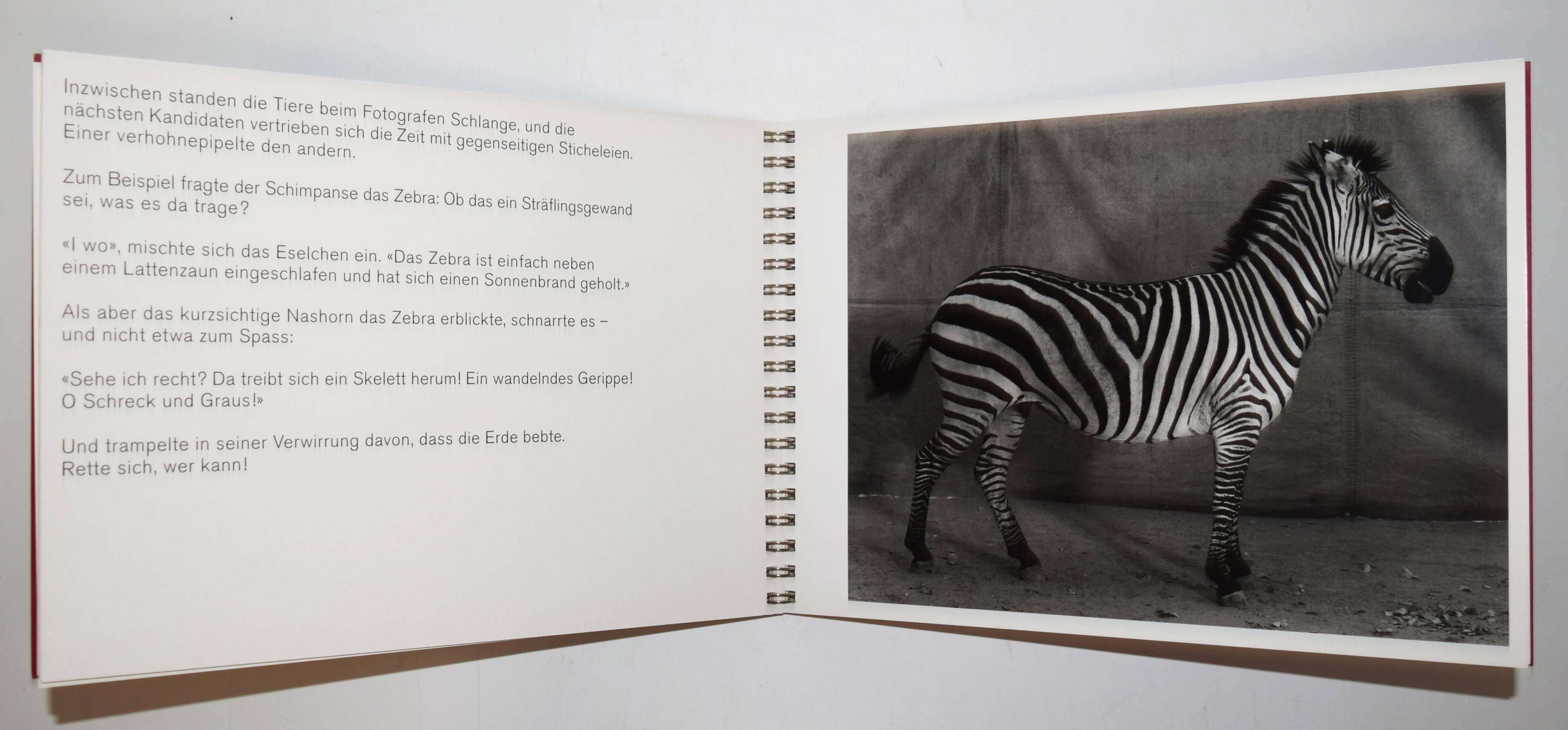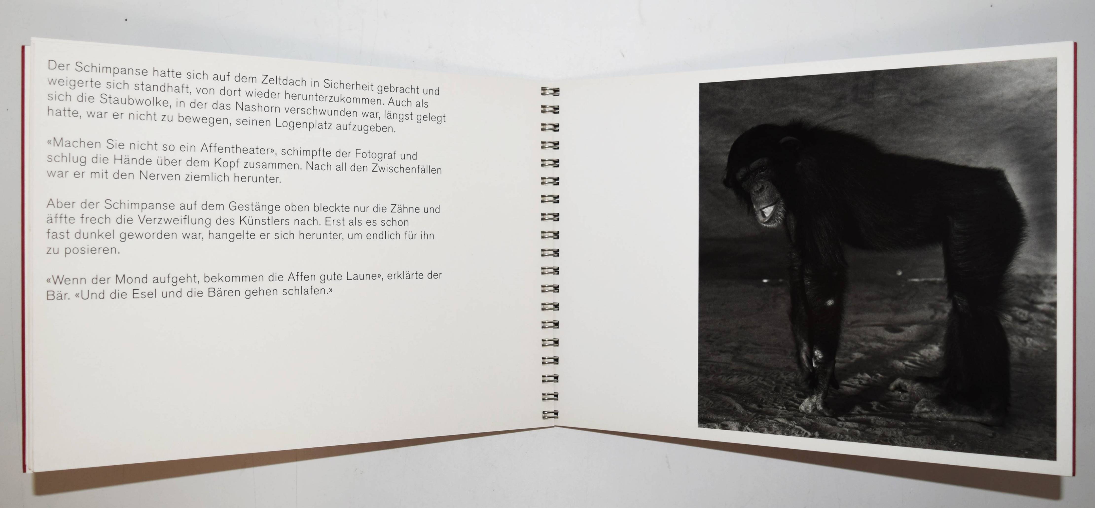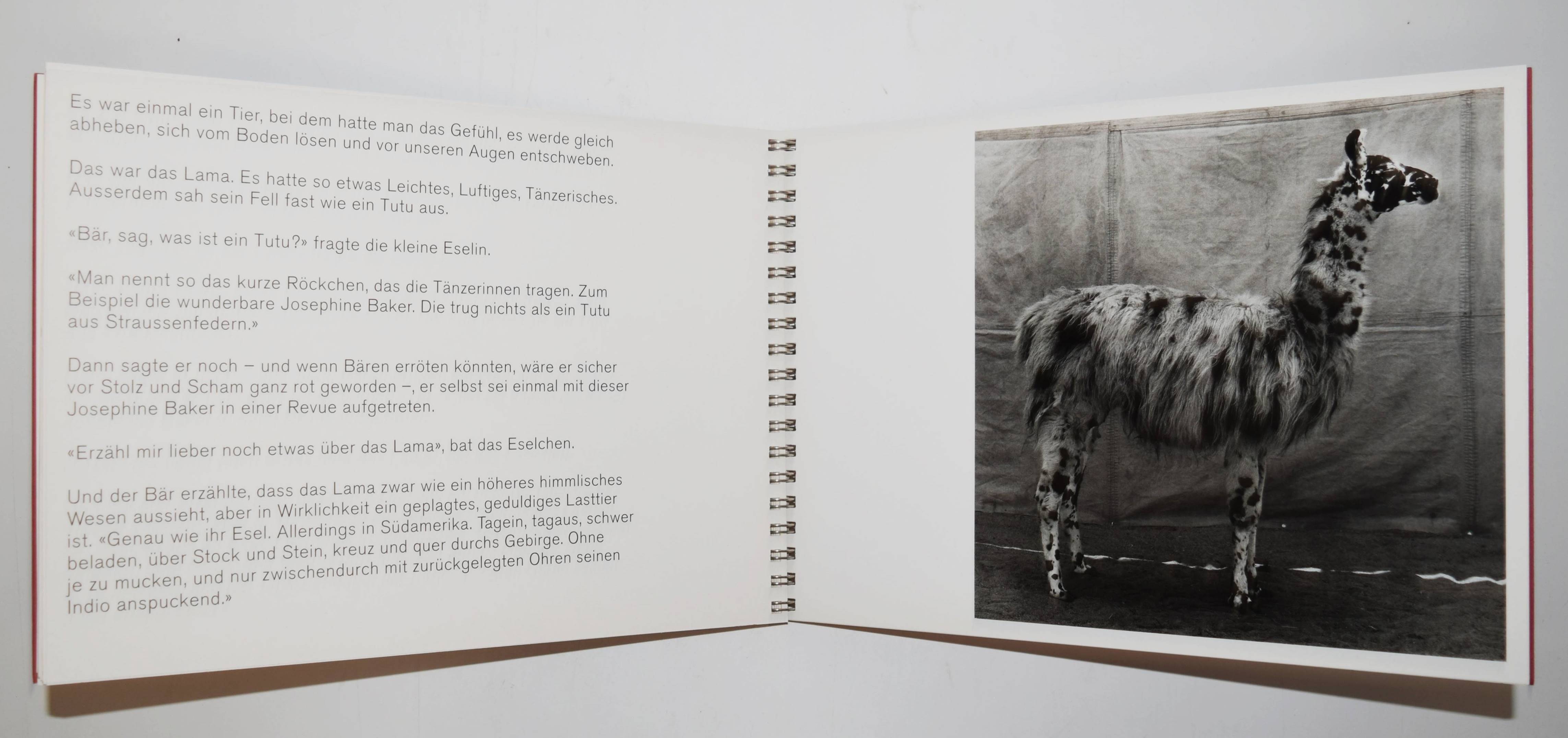 Burkhard, Balthasar und Markus Jakob. „Klick!“ sagte die Kamera. Baden, Lars Müller (1997). Quer-4° (24 x 35 cm.). 21 Duotone-Tafeln auf dünnem Karton mit rückseitigem Text von M. Jakob. Illustr. Orig.-Pappband mit Metall-Ringheftung. Schweizer Fotobücher 454 ff. – Erste Ausgabe. – „Zwanzig Tiere treffen sich zum Schönheitswettbewerb beim Fotografen. Auf Balthasar Burkhards Porträts sind alle Tiere gleichermassen schön. Die Protagonistin der Geschichte ist eine scheue Eselin, die dem fröhlichen Treiben zusieht. Liebevoll und mit viel Humor beschreibt Markus Jakob das illustre Stelldichein“ (Lars Müller). – B. Burkhard, Lehrling von Kurt Blum in Bern, „arbeitete zunächst als Dokumentarfotograf der Kunsthalle Bern, bevor er im Jahr 1969 seine Künstlerlaufbahn begann. Seine Arbeiten wurden vor allem im Zusammenhang mit zeitgenössischer Kunst ausgestellt, in der Fotografieszene tauchte sein Name nur selten auf. Dabei brachte er durchaus seine Fähigkeit als klassischer Fotograf zur Geltung – mit Werken in Schwarzweiss und im Grossformat. Das Buch „Klick!, sagte die Kamera“ kann denn auch als eine Hommage an die Geschichte der Fotografie gedeutet werden. Burkhard ist in die Rolle eines Studiofotografen geschlüpft. Indem er die Zirkustiere vor einem Laken posieren lässt, schliesst er alles Exotische aus. Bei seinen Bildern denkt man an Porträts des 19. Jahrhunderts, als Fotografen ihr Studio auf den Jahrmärkten aufbauten. Die serielle Vorgehensweise verweist aber auch auf eine wegweisende Arbeit des 20. Jahrhunderts, die Urformen der Kunst von Karl Blossfeldt. Das 1928 erschienene Fotobuch führte ein, was später zu einem Merkmal der deutschen Fotografie werden sollte: die Beschäftigung mit „Typologien“. Die seriellen Aufnahmen erlaubten es, die individuellen Merkmale einer Kategorie herauszuarbeiten. August Sander ging bei seiner Bestandsaufnahme gesellschaftlicher Typen ähnlich vor. Ein spätes Echo auf diese Arbeiten der 1920er-Jahre. Mit seinem Ansatz beugt er, genau wie die Fotografen der Neuen Sachlichkeit, jedwedem subjektiven Ausdruck vor. Diese stringente und ungekünstelte Vorgehensweise findet sich auch bei anderen Künstlern seiner Generation wieder, so etwa bei Bernd und Hilla Becher. Das Subjekt, das seinem Kontext enthoben ist, wird zum Motiv“ (N. Herschdorfer in Schweizer Fotobücher S. 457). – Sehr gutes Exemplar.
