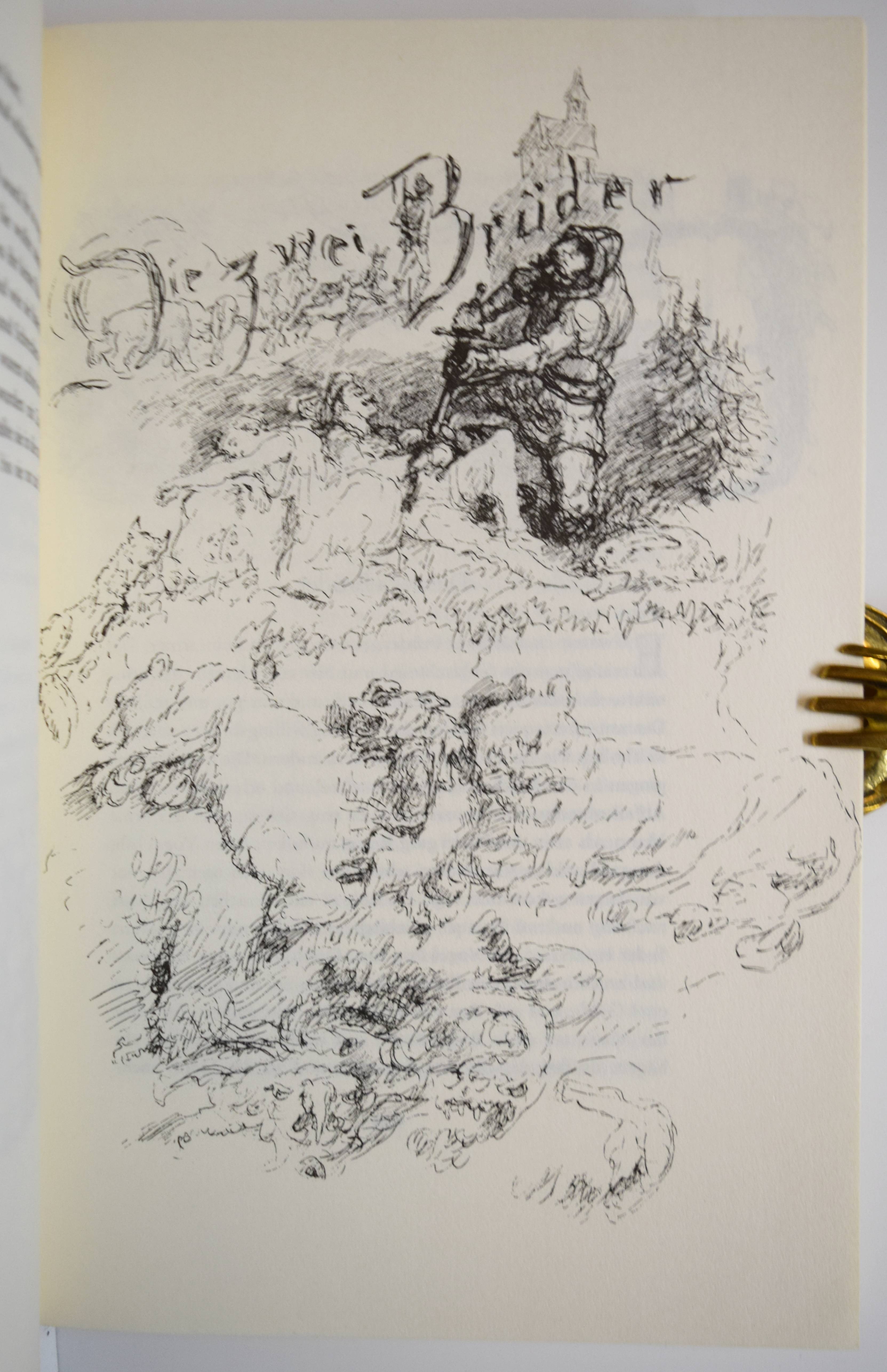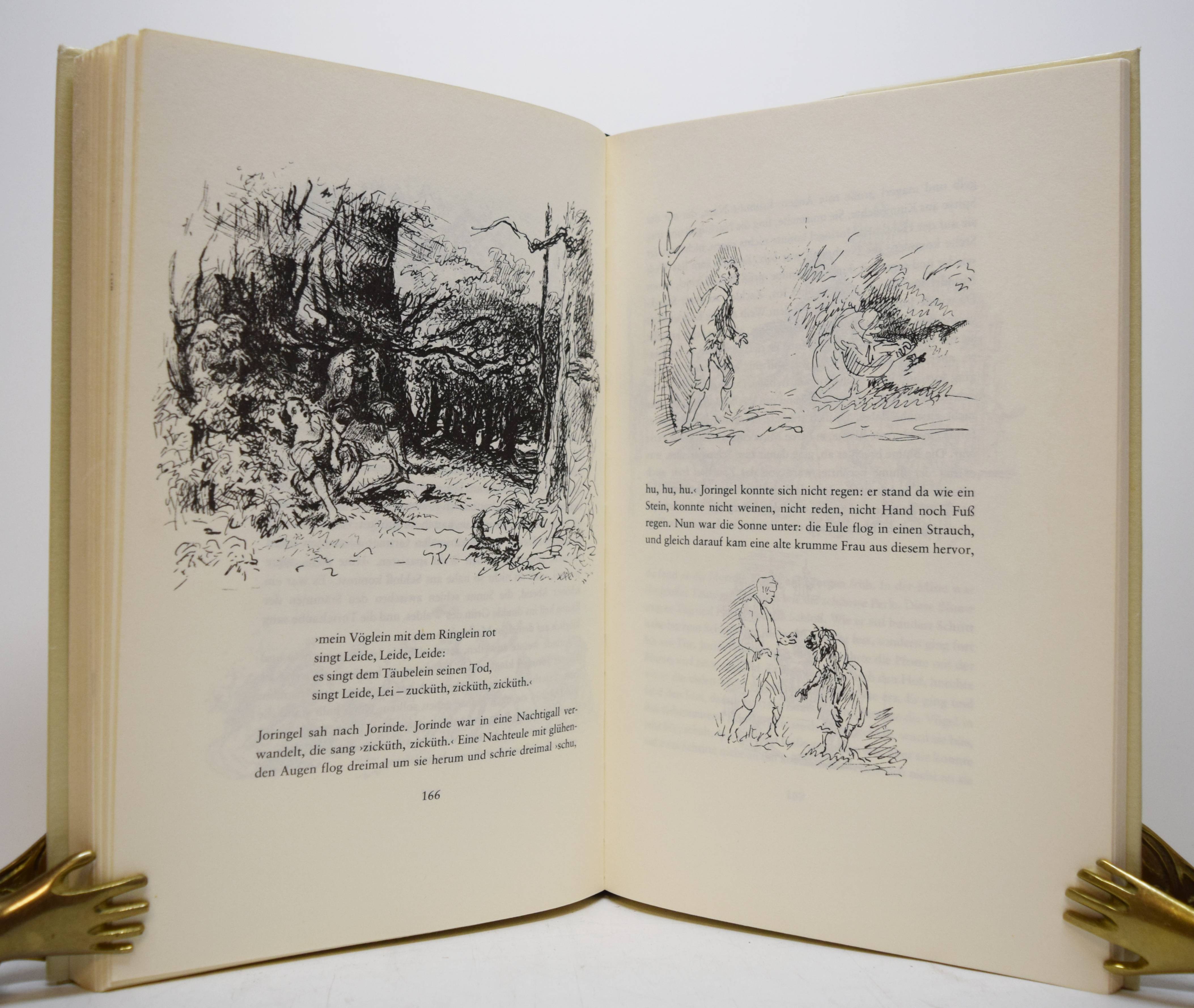 Grimm, (Jacob und Wilhelm). Kinder- und Hausmärchen. Mit 197 Federzeichnungen von Max Slevogt. Tübingen, Rainer Wunderlich Verlag, Hermann Leins (1976). 4°. 240 S. mit 197 Illustrationen. Orig.-Pappband mit illustr. Schutzumschlag in Pappschuber. Erste Gesamtausgabe der von Slevogt illustrierten Märchen der Brüder Grimm. – Sehr schönes Exemplar.