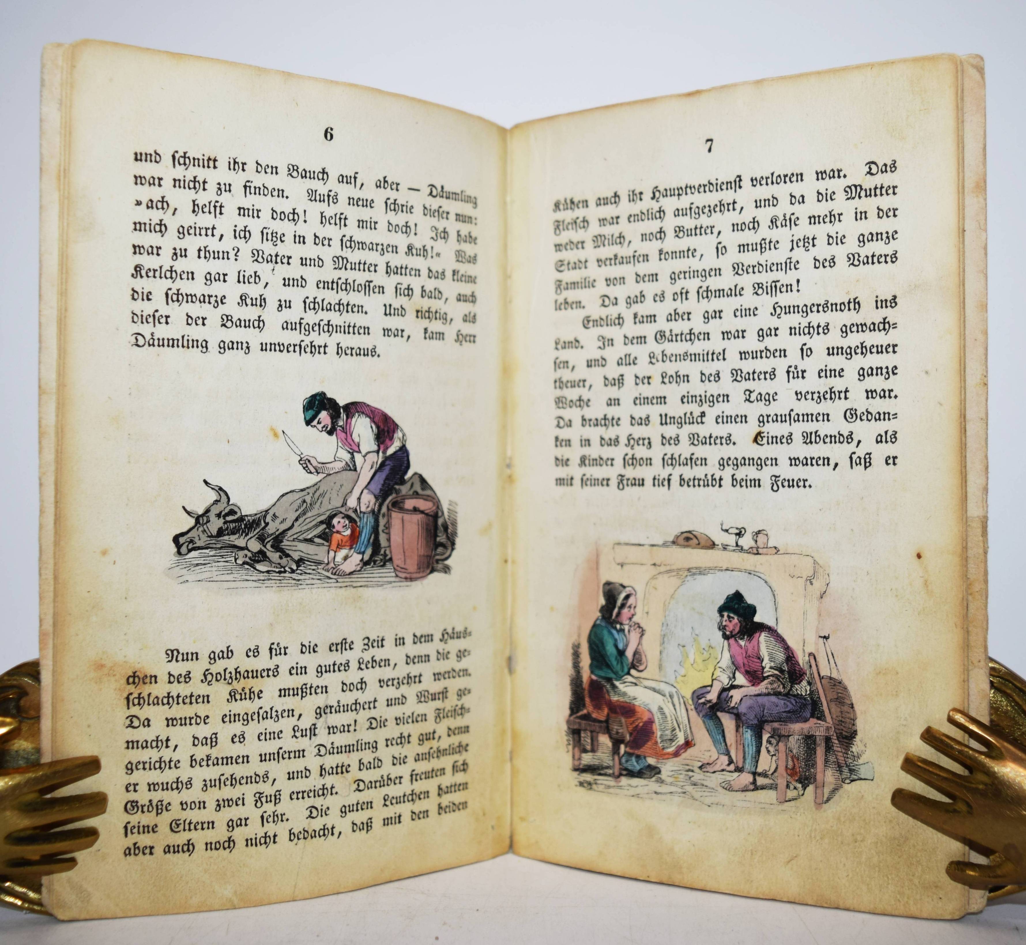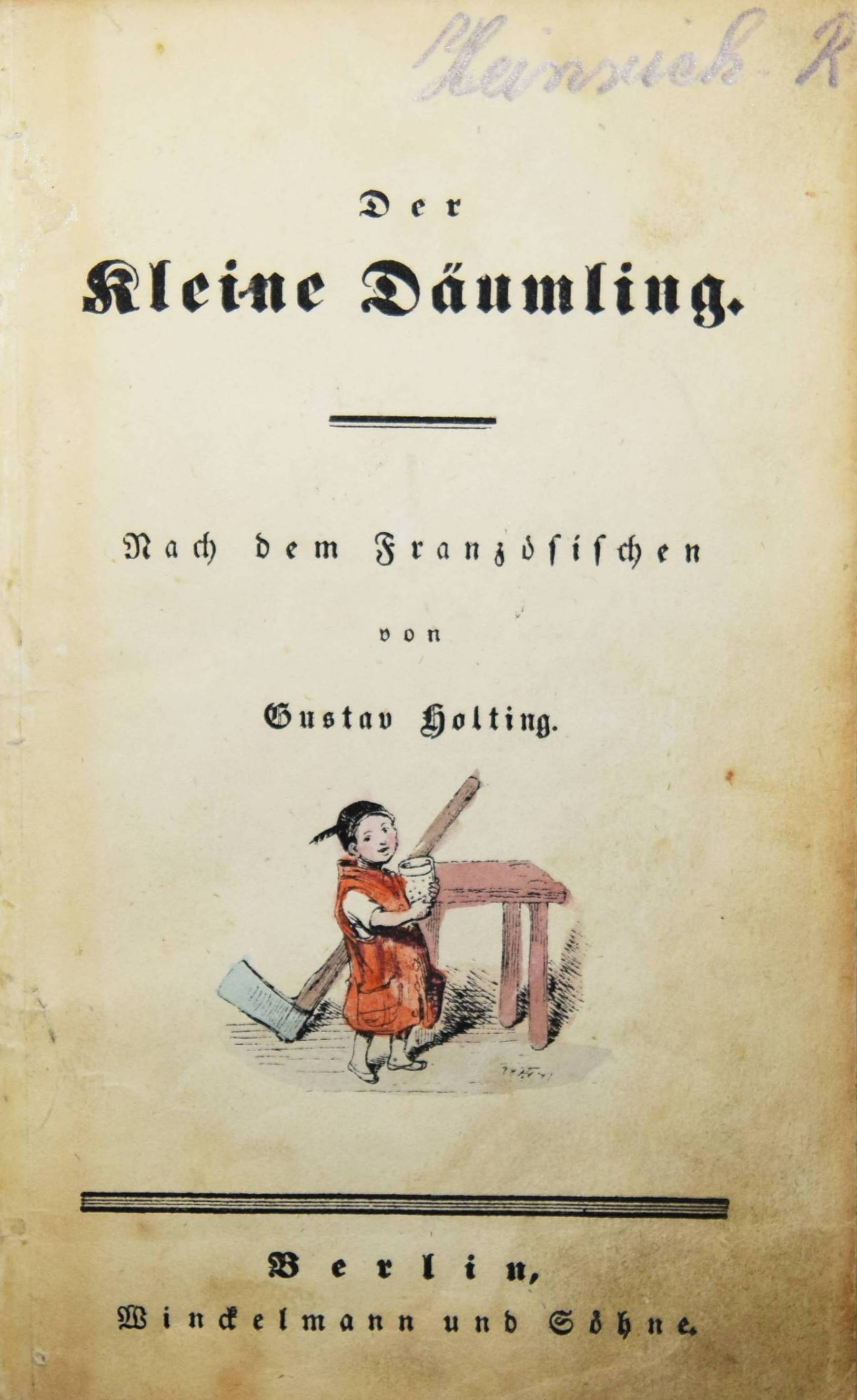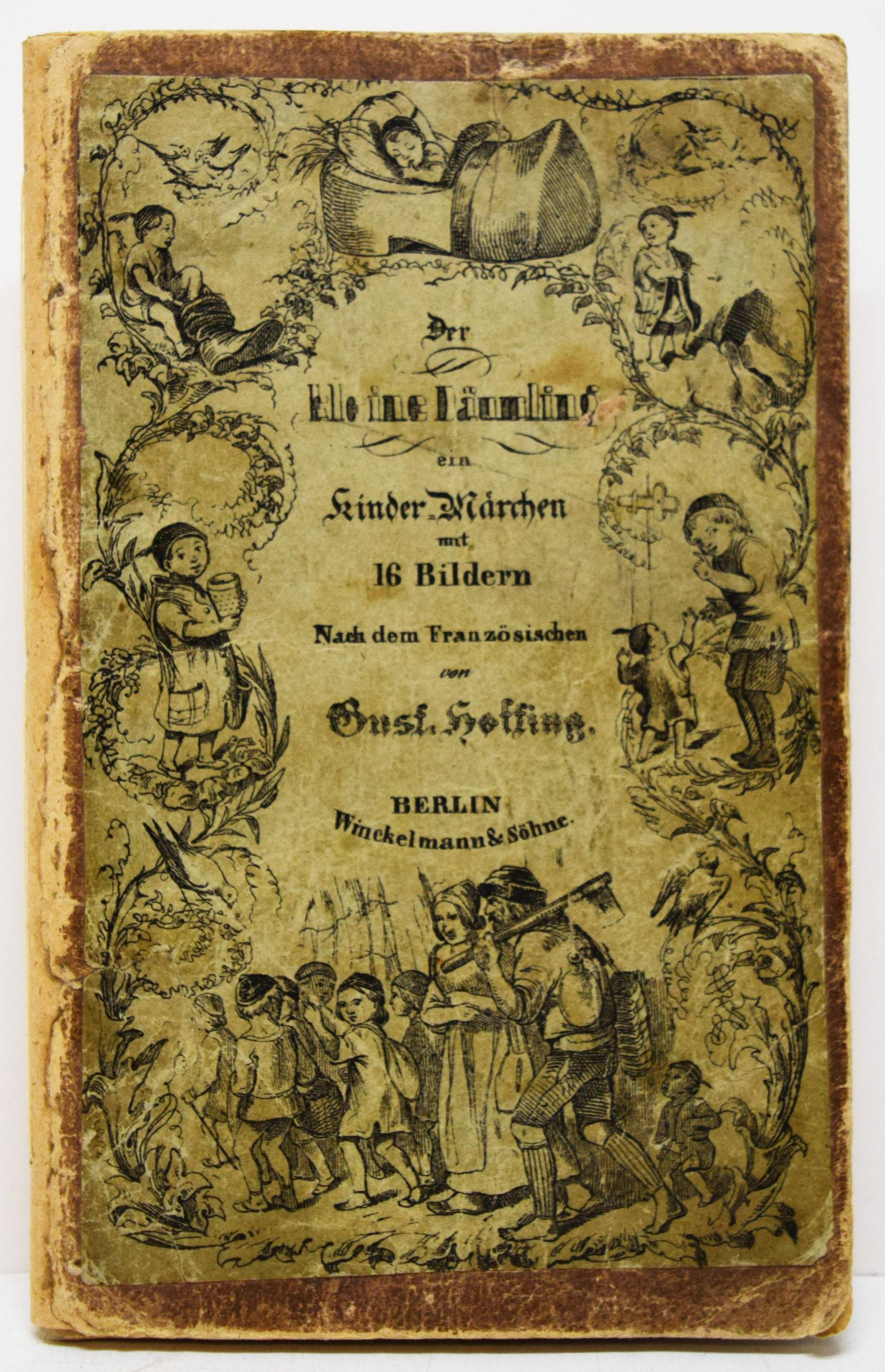 Holting, Gustav (d. i. Karl Gustav Winkelmann). Der kleine Däumling. Nach dem Französischen. Berlin, Winckelmann und Söhne o. J. (1841). Kl.-8° (16,5 x 10,5 cm.). 24 S. mit 16 handkolorierten Vignetten in Federlithographie von T(heodor) H(osemann). Pappband der Zeit mit montiertem illustr. Orig.-Umschlag. Brieger, Hosemann 65. Wegehaupt III, 1726. Vgl. Bilderwelt 266. Hobrecker, Frankfurt 153. Rümann. Illustr. Bücher 862. Rümann, Kinderbücher 189 (mit Farbabb.) und Wegehaupt I, 1018 (Alle französische Ausgabe). – Erste Ausgabe. – Das Märchen ist der Perrault’schen Fassung von Winkelmann neu nacherzählt. – „Hosemann streut Vignetten in den Märchentext ein, der als preiswerte Monographie erschienen ist. Diese Art der Durchsetzung hat als erster Pocci im „Märlein von Sneewittchen“ (1837) angewandt“ (A. Petri in Bilderwelt). – Rücken erneuert, Umschlag berieben, Name auf dem Titel, im Blattrand teils fingerfleckig, sonst gut erhalten.