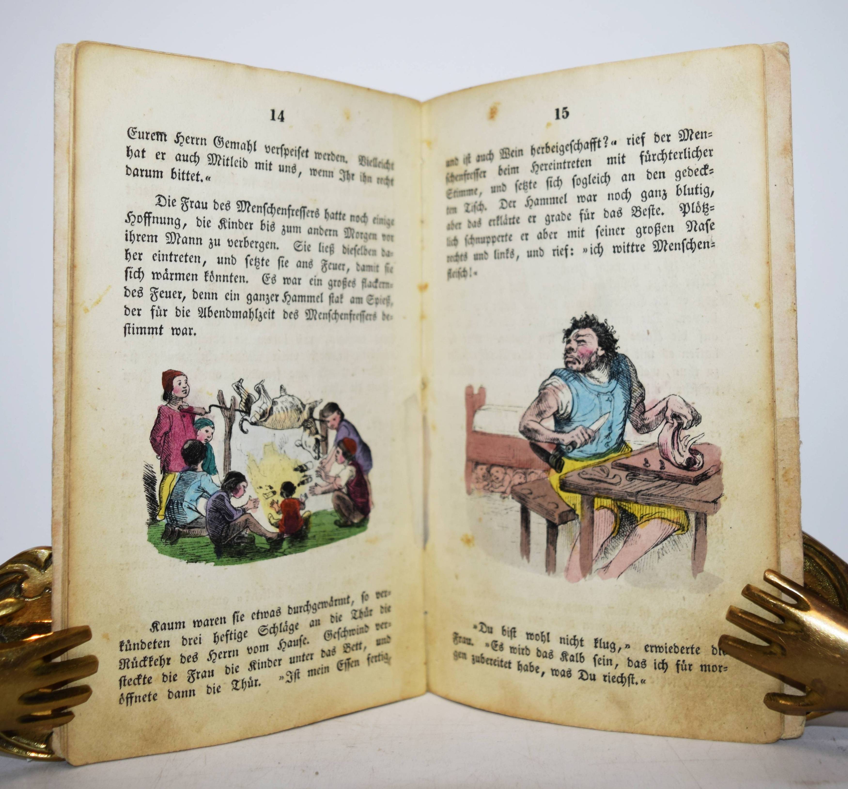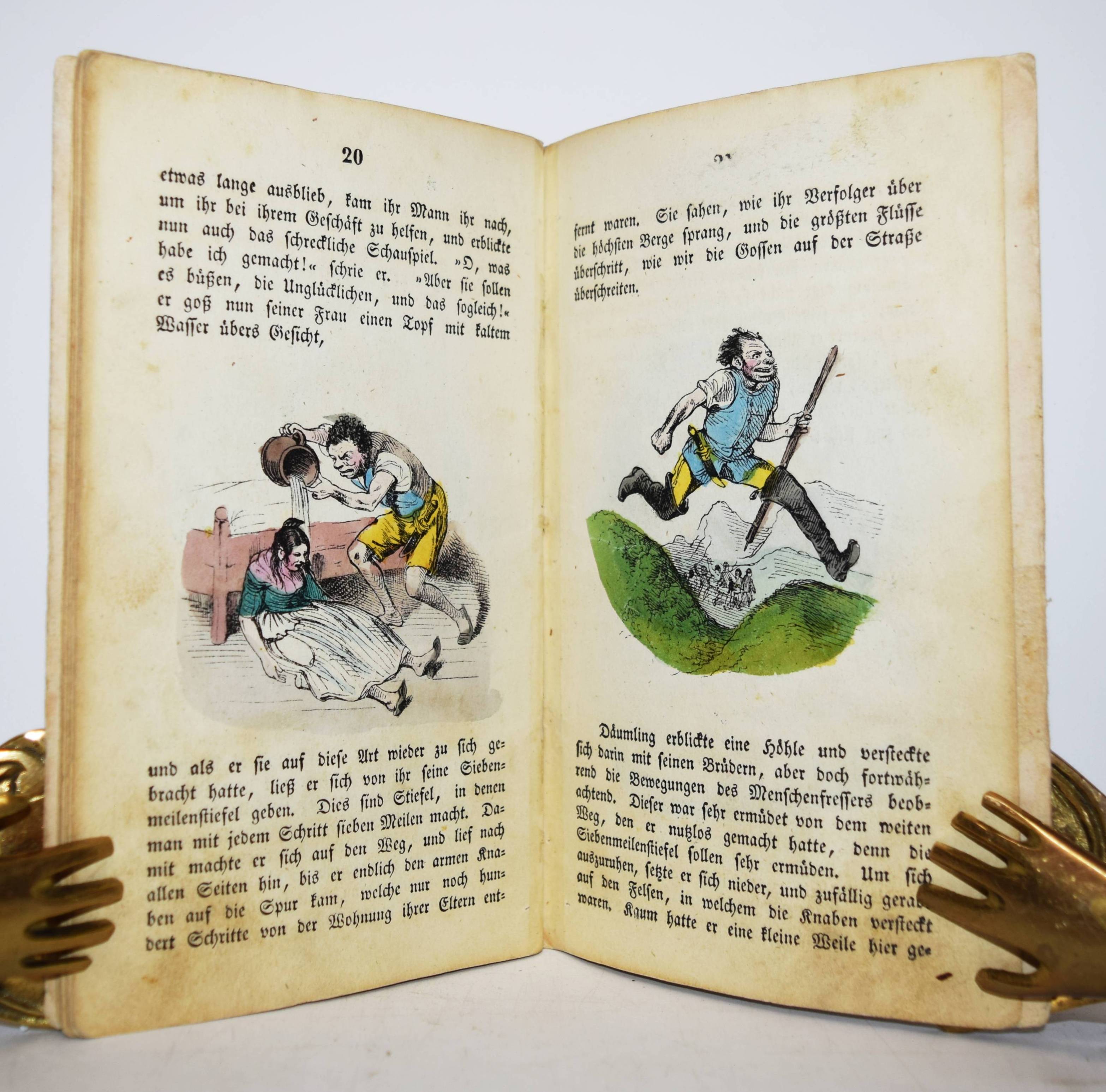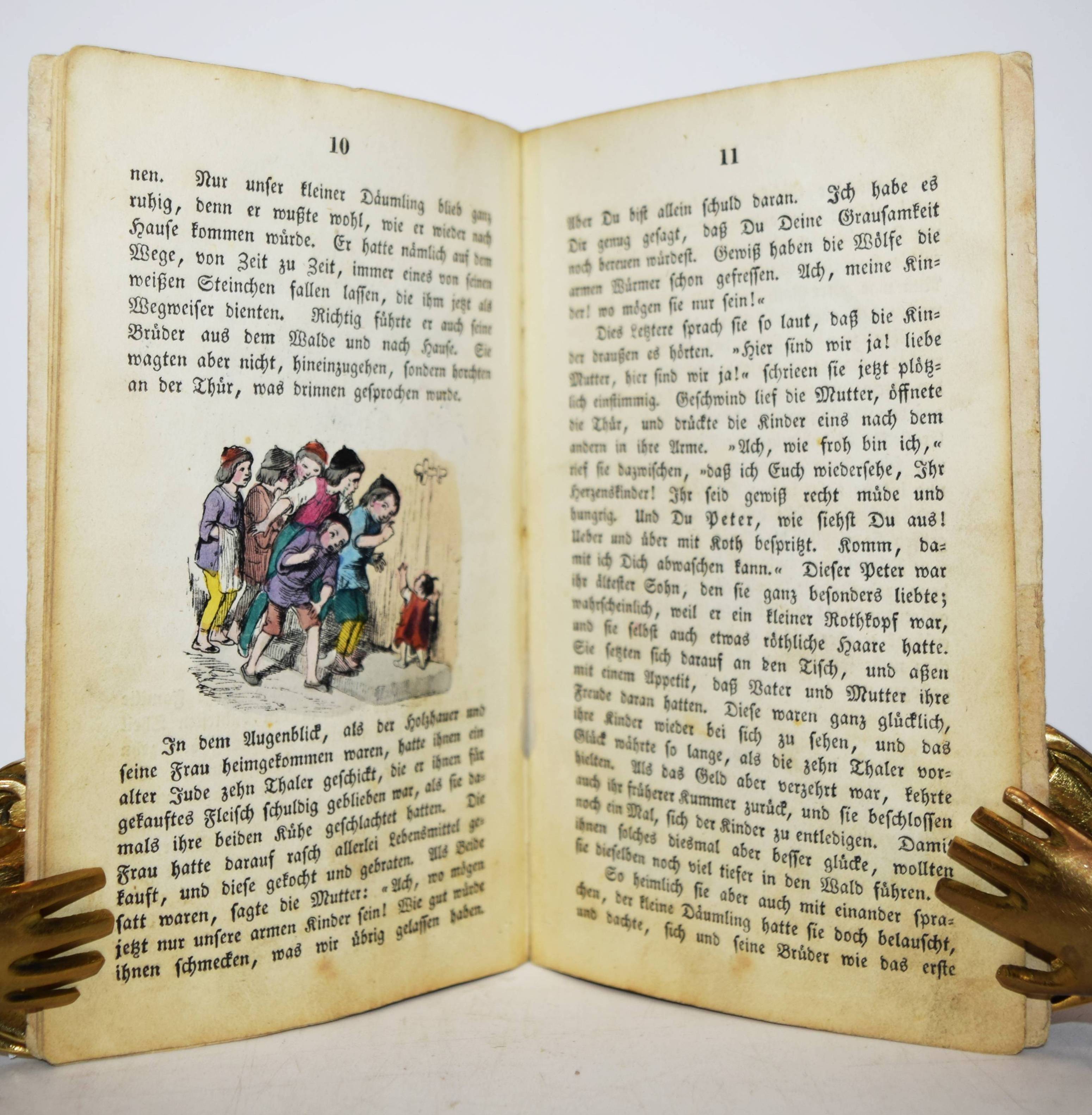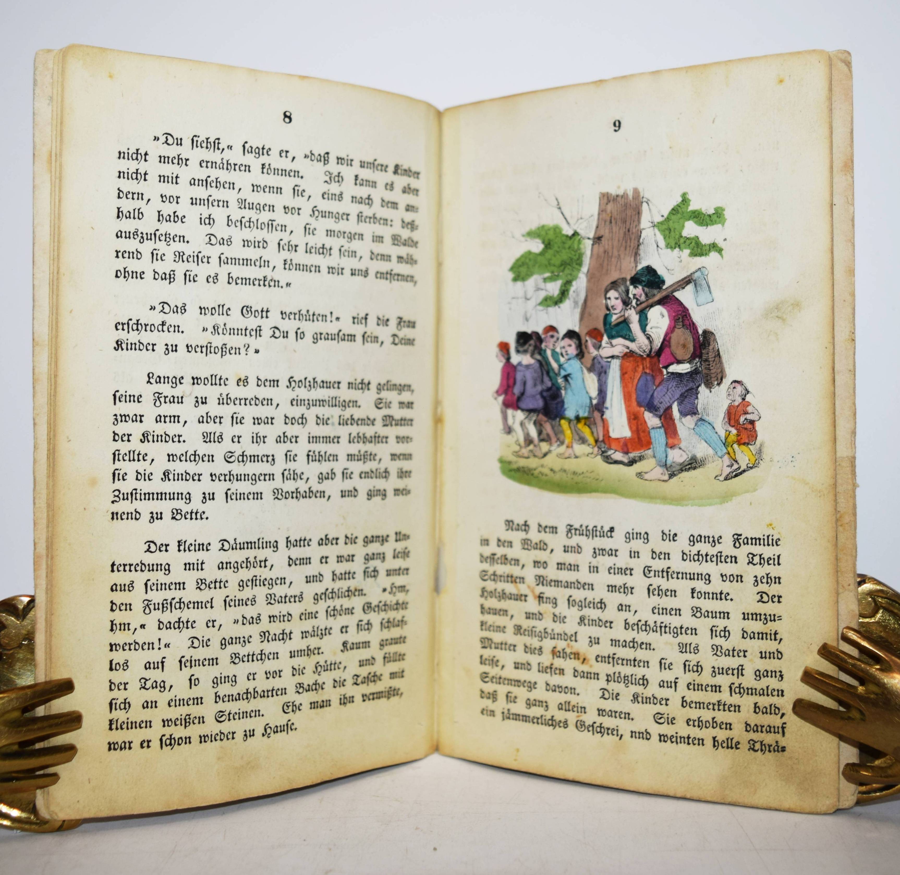 Holting, Gustav (d. i. Karl Gustav Winkelmann). Der kleine Däumling. Nach dem Französischen. Berlin, Winckelmann und Söhne o. J. (1841). Kl.-8° (16,5 x 10,5 cm.). 24 S. mit 16 handkolorierten Vignetten in Federlithographie von T(heodor) H(osemann). Pappband der Zeit mit montiertem illustr. Orig.-Umschlag. Brieger, Hosemann 65. Wegehaupt III, 1726. Vgl. Bilderwelt 266. Hobrecker, Frankfurt 153. Rümann. Illustr. Bücher 862. Rümann, Kinderbücher 189 (mit Farbabb.) und Wegehaupt I, 1018 (Alle französische Ausgabe). – Erste Ausgabe. – Das Märchen ist der Perrault’schen Fassung von Winkelmann neu nacherzählt. – „Hosemann streut Vignetten in den Märchentext ein, der als preiswerte Monographie erschienen ist. Diese Art der Durchsetzung hat als erster Pocci im „Märlein von Sneewittchen“ (1837) angewandt“ (A. Petri in Bilderwelt). – Rücken erneuert, Umschlag berieben, Name auf dem Titel, im Blattrand teils fingerfleckig, sonst gut erhalten.