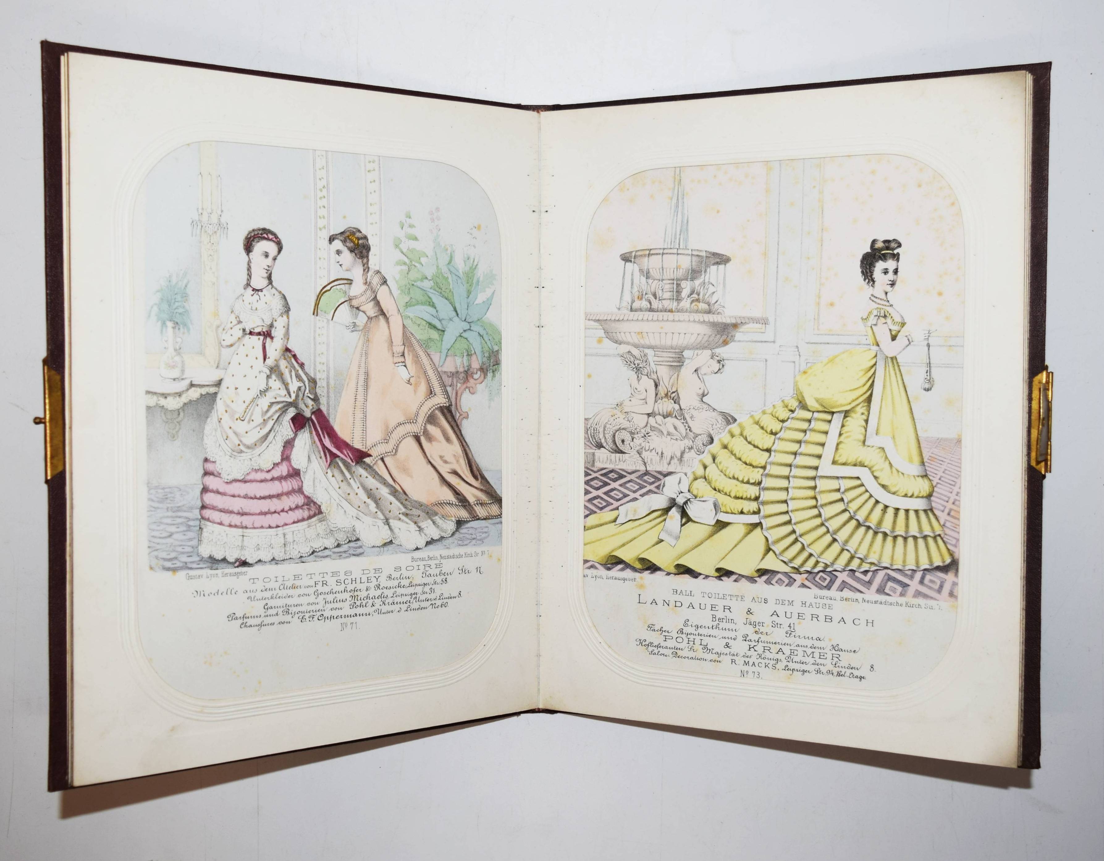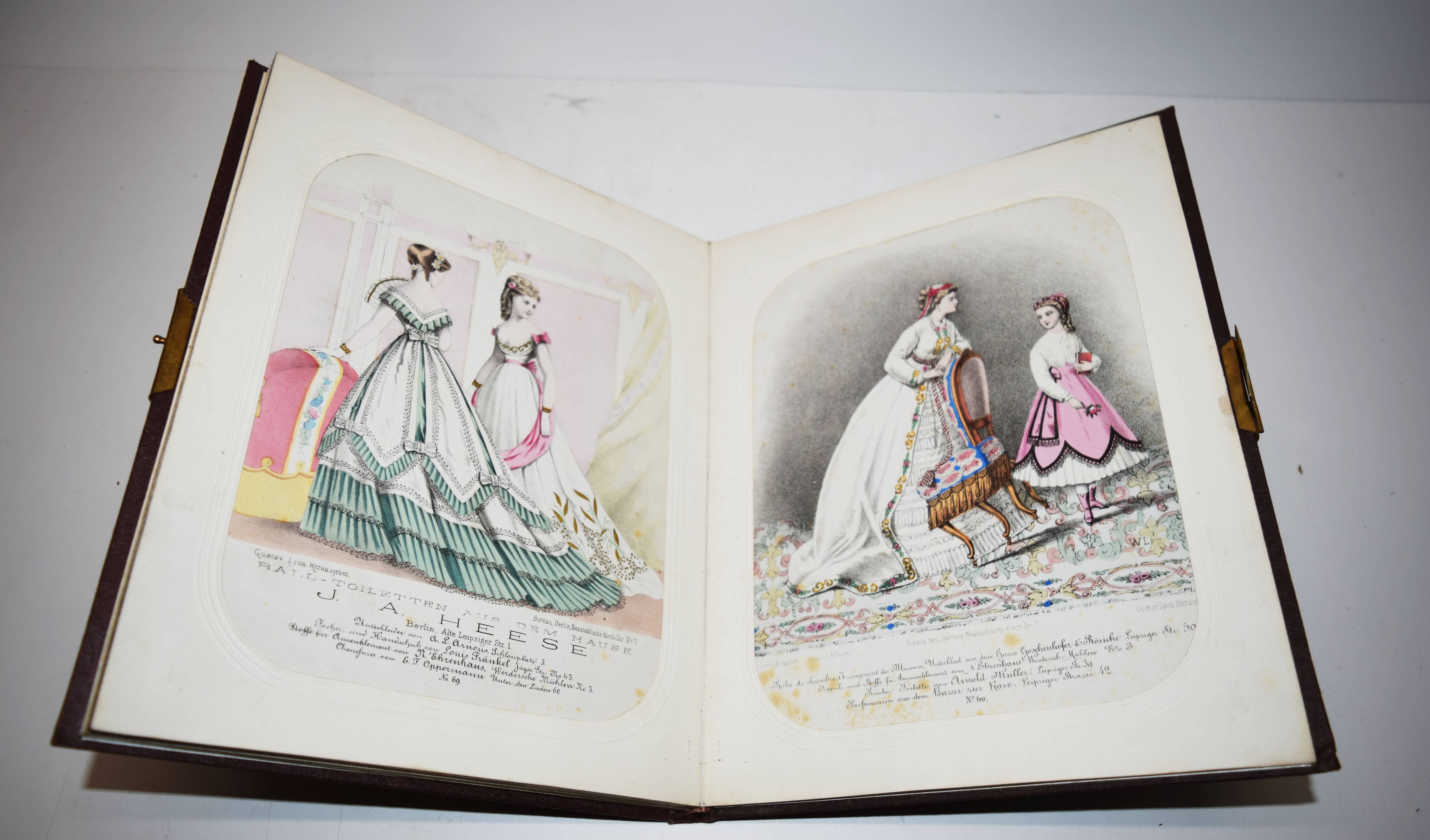 Lyon, Gustav (Hrsg.). Das Museum (Deckeltitel). 14 handkolorierte Lithographien mit Damen-Mode. Berlin, Gustav Lyon (um 1865). 4° (31 x 24 cm.). 14 handkolorierte Lithographien (ca. 25 x 19,5 cm.) unter Passepartouts. Orig.-Leinenband mit goldgepr. Deckeltitel und Messing-Schließe. Die dekorativen Tafeln zeigen junge Damen in „Promenaden“– und Ballkleidern. Im unteren Rand mit den Adressen von Berliner Mode-Geschäften oder den Stoff-Herstellern. – Der bedeutende Berliner Verlag für Modezeitschriften und Schnittmuster wurde 1842 von Gustav Lyon gegründet und war bis in die 1940er Jahre tätig. – Wenige Tafeln etwas braunfleckig, sonst sehr gut erhalten.