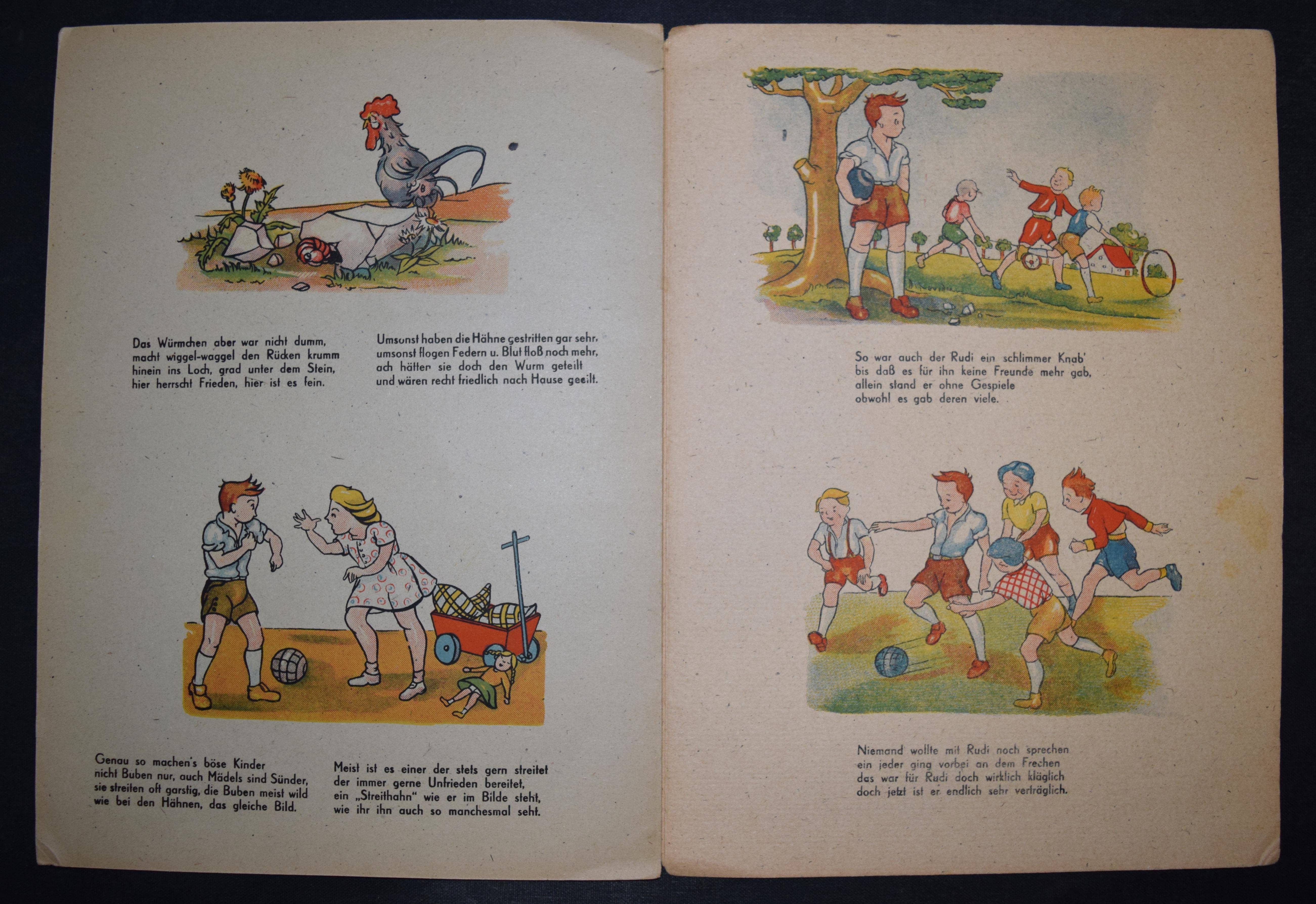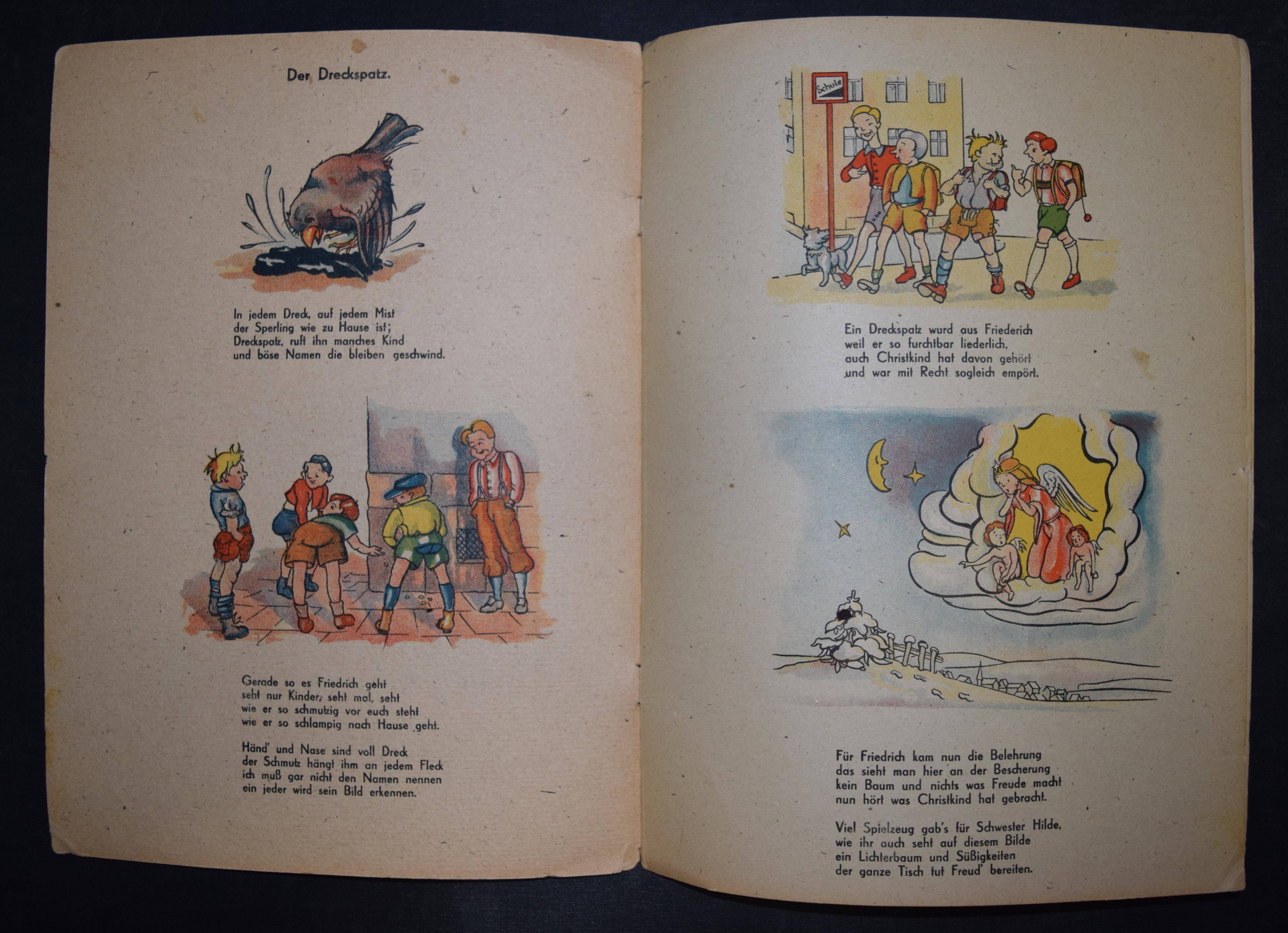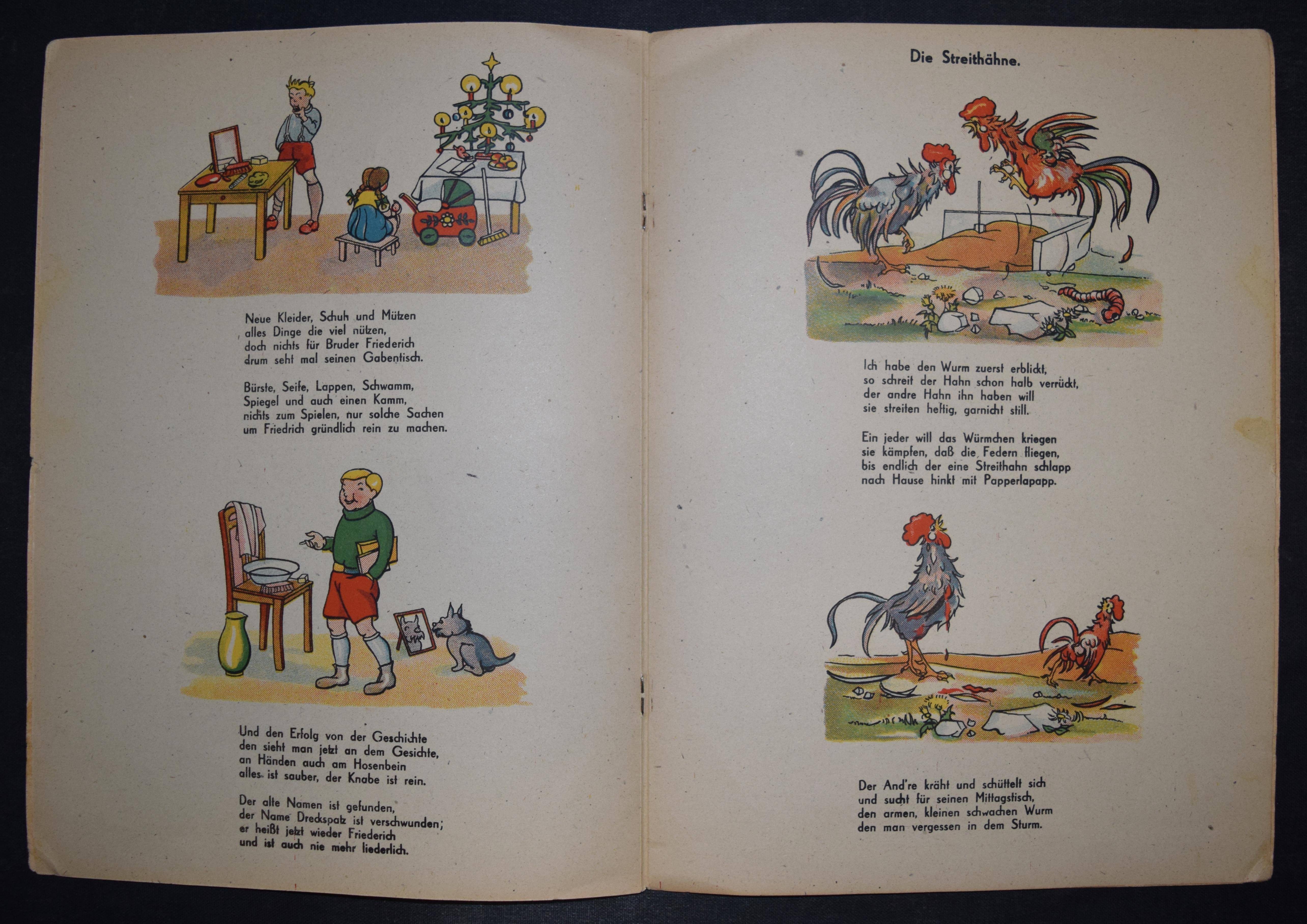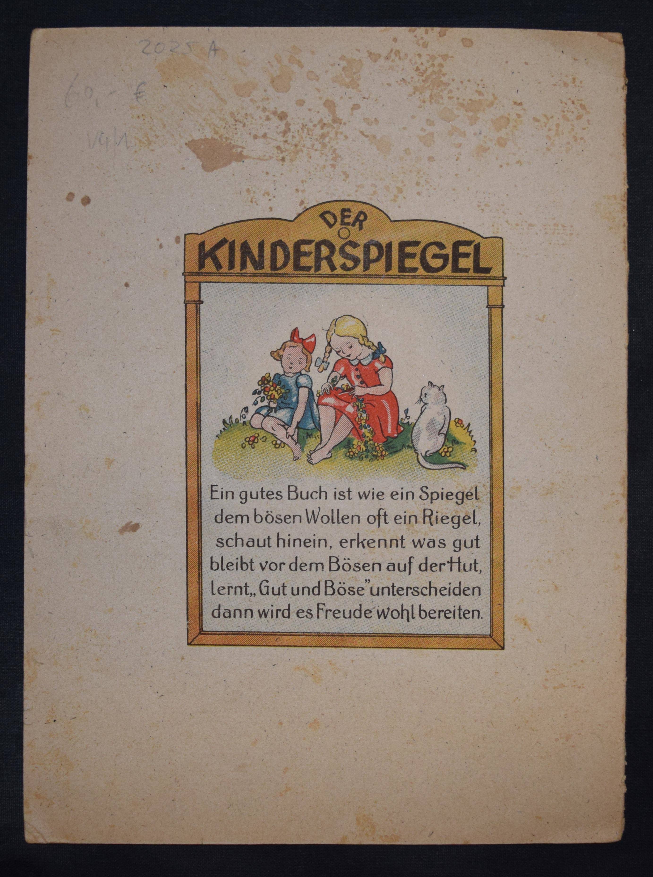 Struwwelpeteriade – Braun, Heinrich. Der Dreckspatz. Die Streithähne. Bilder von Erika Keßler. O. O., Dr. u. J. (Nürnberg ? um 1945). 4°. 6 unbez. S. mit farb. Illustrationen. Farbig illustr. OKart. Rühle 423. – „Möglicherweise im Selbstverlag erschienenes dünnes Bilderbuch mit zwei Geschichten ohne übergeordneten Sachtitel… Der Reihentitel „Der Kinderspiegel“ knüpft an alte Vorbilder des 19. Jahrhunderts an…“ (R. Rühle). – Rückendeckel mit der Aufschrift: „Der Kinderspiegel. Ein gutes Buch ist wie ein Spiegel dem bösen Wollen oft ein Riegel, schaut hinein, erkennt was gut bleibt vor dem Bösen auf der Hut, lernt „Gut und Böse“ unterscheiden dann wird es Freude wohl bereiten.“ – Umschlag etwas fleckig, sonst gut erhalten