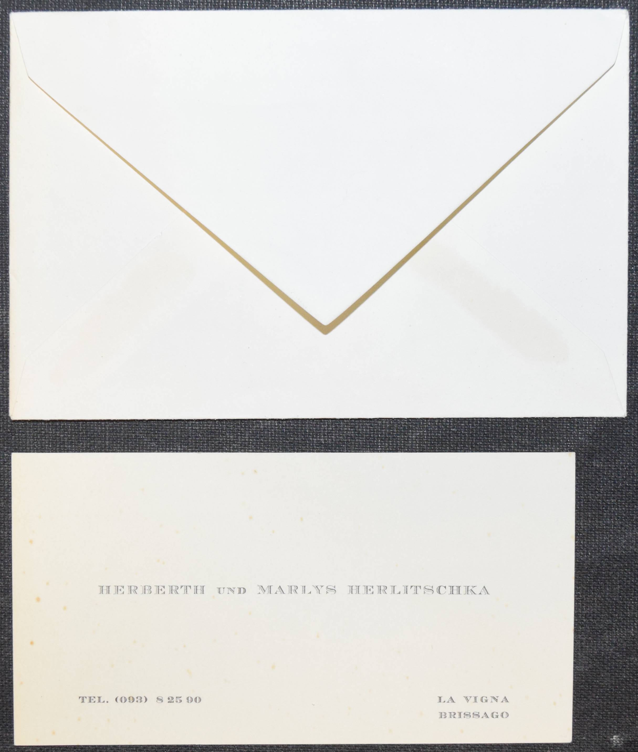 Herlitschka, Herberth (1893-1970) u. Marlys (1905-1975). Visitenkarte mit eigenh. Weihnachtsgrüßen auf der Rückseite für den bekannten Züricher Theater-Regisseur Kurt Hirschfeld (1902-1964) im Orig.-Briefumschlag. Der bekannte in Wien geborene Übersetzer und Schriftsteller H. E. Herlitschka, studierte englische Literatur in Groß Britannien und lehrte dann an der Universität in Wien. 1938 emigrierte er mit seiner Frau Marlys nach England und arbeitete dort seit 1942 für die BBC. 1948 erhielt das Ehepaar die britische Staatsbürgerschaft und arbeitete sehr erfolgreich als Übersetzer zahlreicher wichtiger Autoren. Später übersiedelten sie ins Tessin.