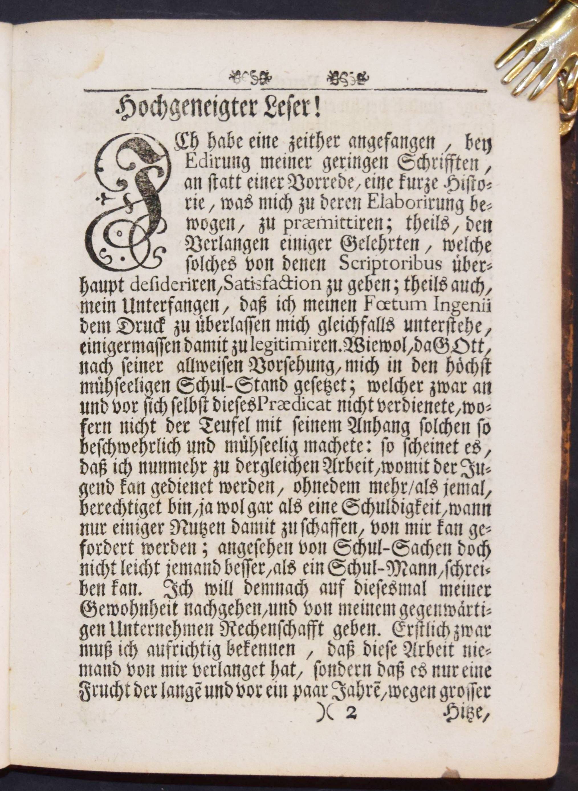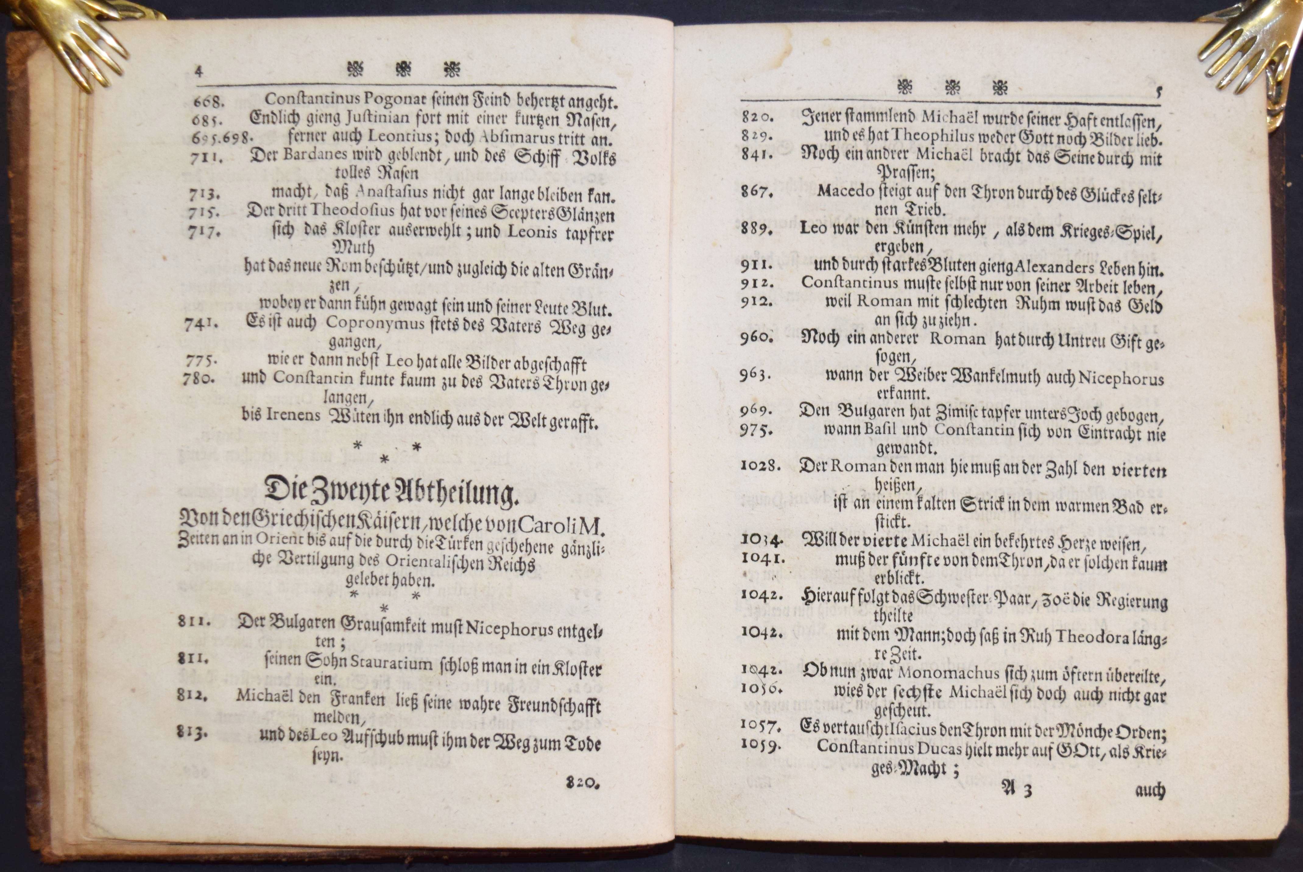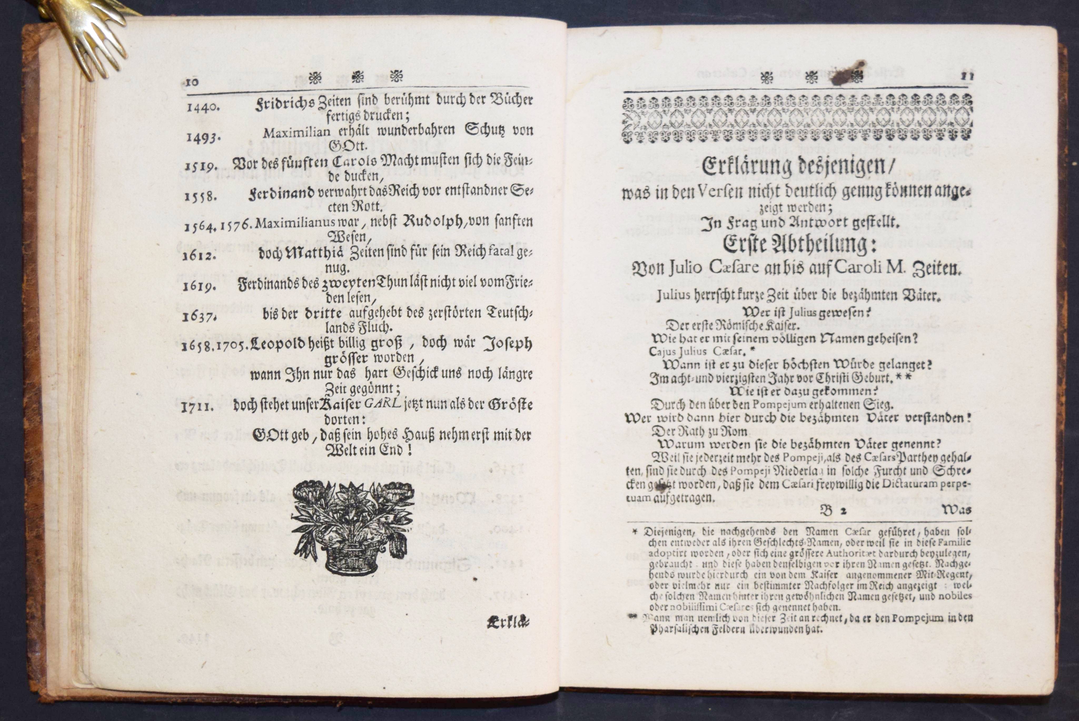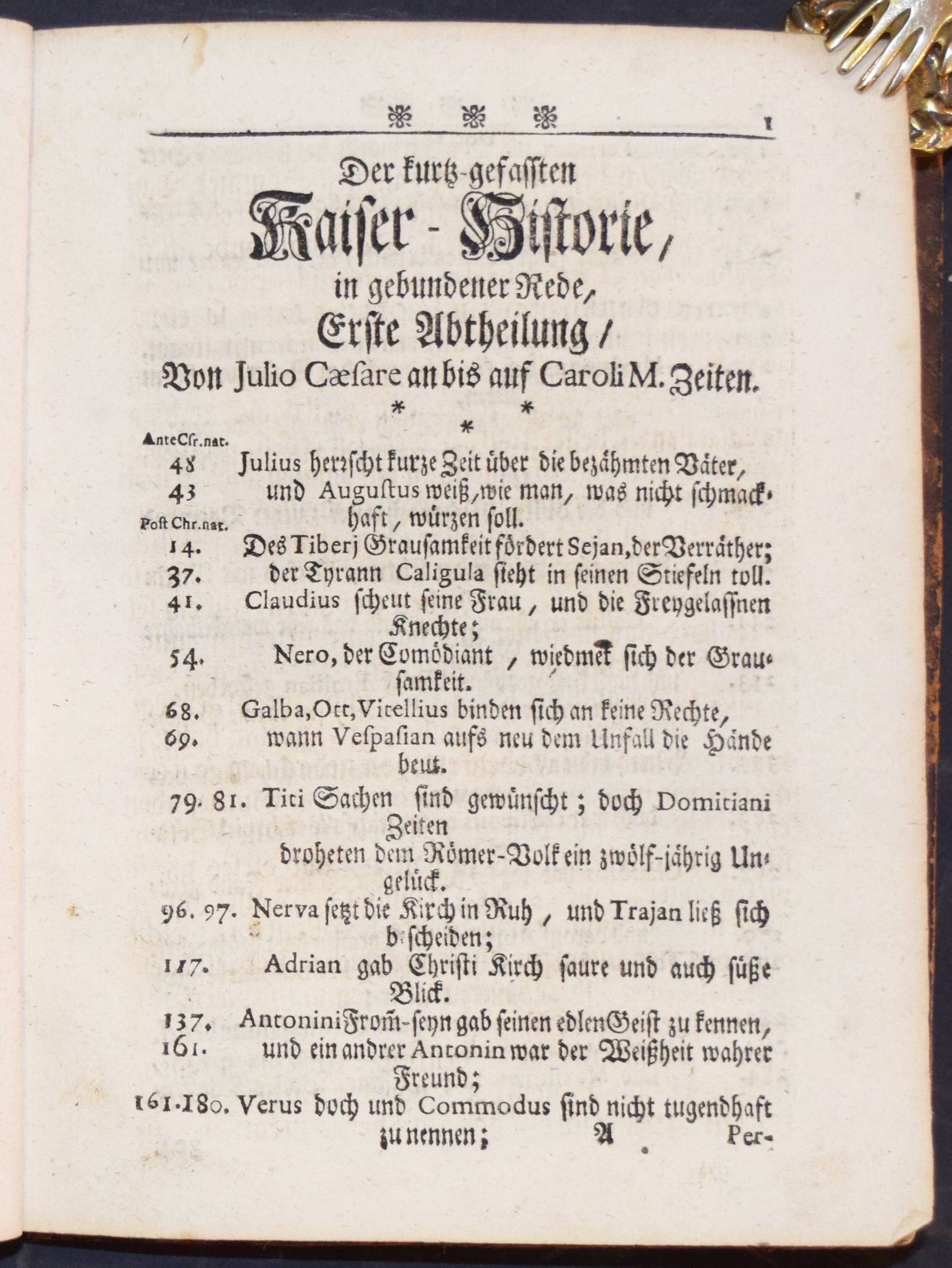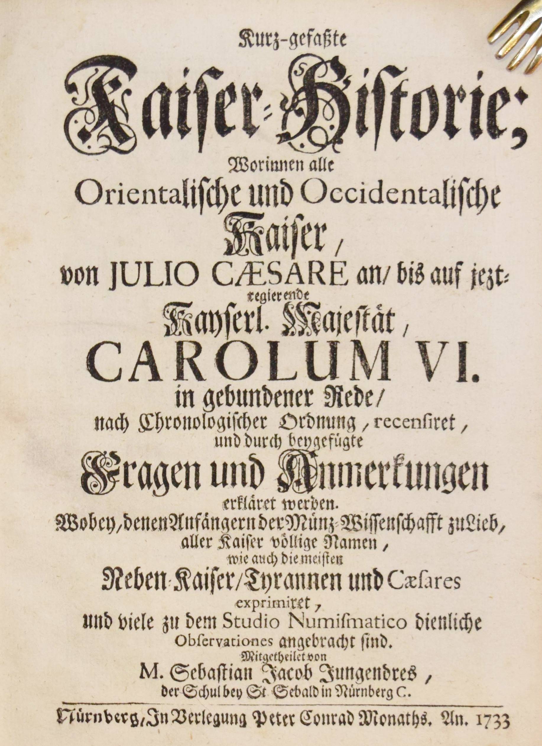 Jungendres, Sebastian Jacob. Kurz-gefaßte Kaiser-Historie. Worinnen alle Orientalische und Occidentalische Kaiser, von Julio Caesare an, bis auf jezt-regierende Kayserl. Majestät, Carolum VI. in gebundener Rede, nach Chronologischer Ordnung, recensiret, und durch beygefügte Fragen und Anmerkungen erkläret werden. Wobey … viele zu dem Studio Numismatico dienliche Observationes angebracht sind. Nürnberg, Monath 1733. Gr.-8°. [6] Bl., 116 S., [14] Bl. mit gestoch. Frontisp. Ldr. d. Zt. mit goldgepr. Rückensch. Baader I/1, 261, 15. Jöcher-Adelung II, 2352. Meusel VI, 335. – Erste Ausgabe. – Seltenes Lehrbuch mit chronologischen Kaiser-Biographien bis zu Karl VI. in Frage- und Antwortform. Am Beginn jeden Kapitels werden Fragen nach dem Namen und den Taten des Kaisers gestellt, die danach in leicht verständlicher Sprache beantwortet werden. – Einband geringf. berieben, vord. Gelenk etwas spröde, zeitgenöss. Besitzvermerk a. V., sehr gutes sauberes Exemplar.