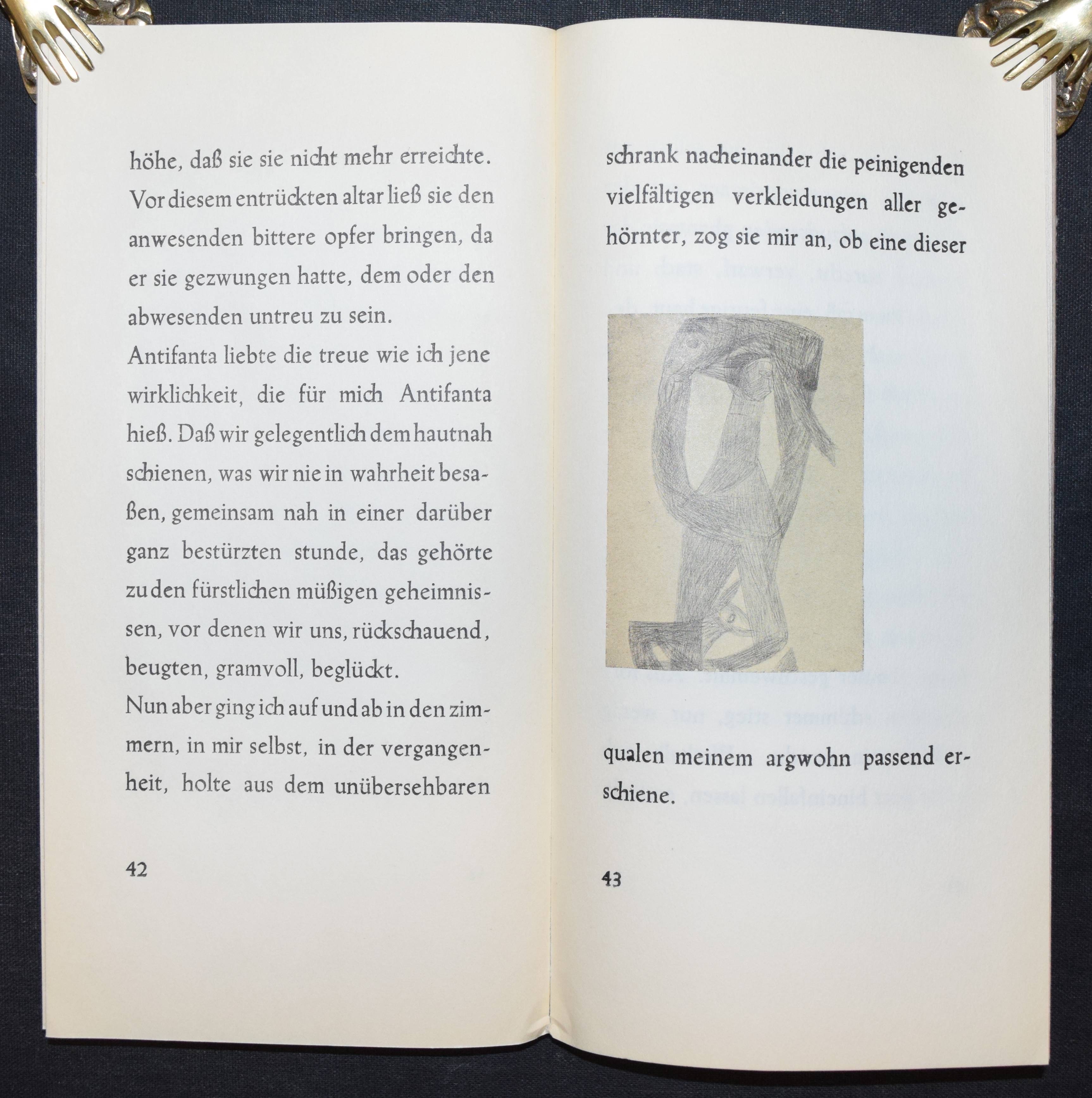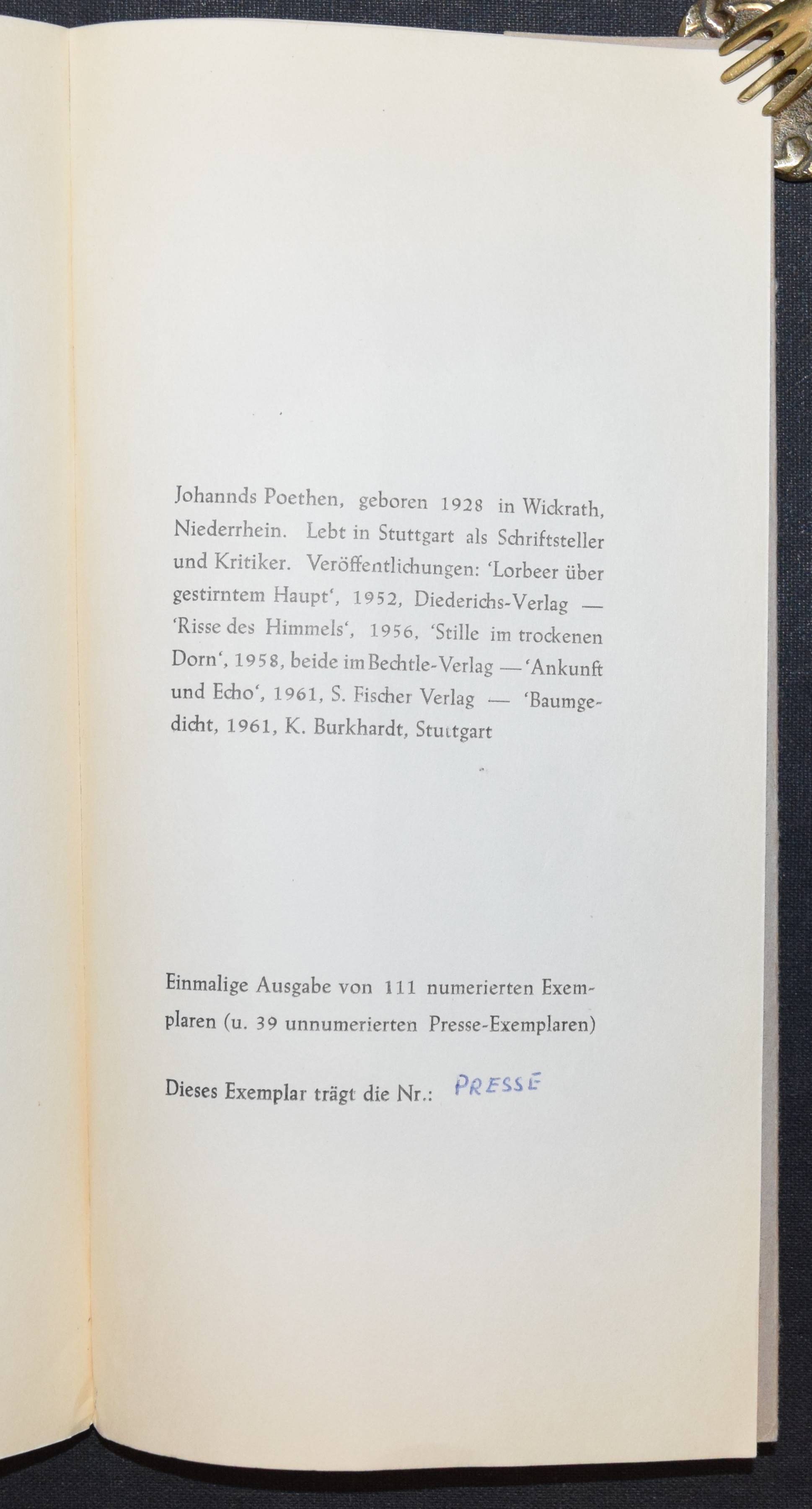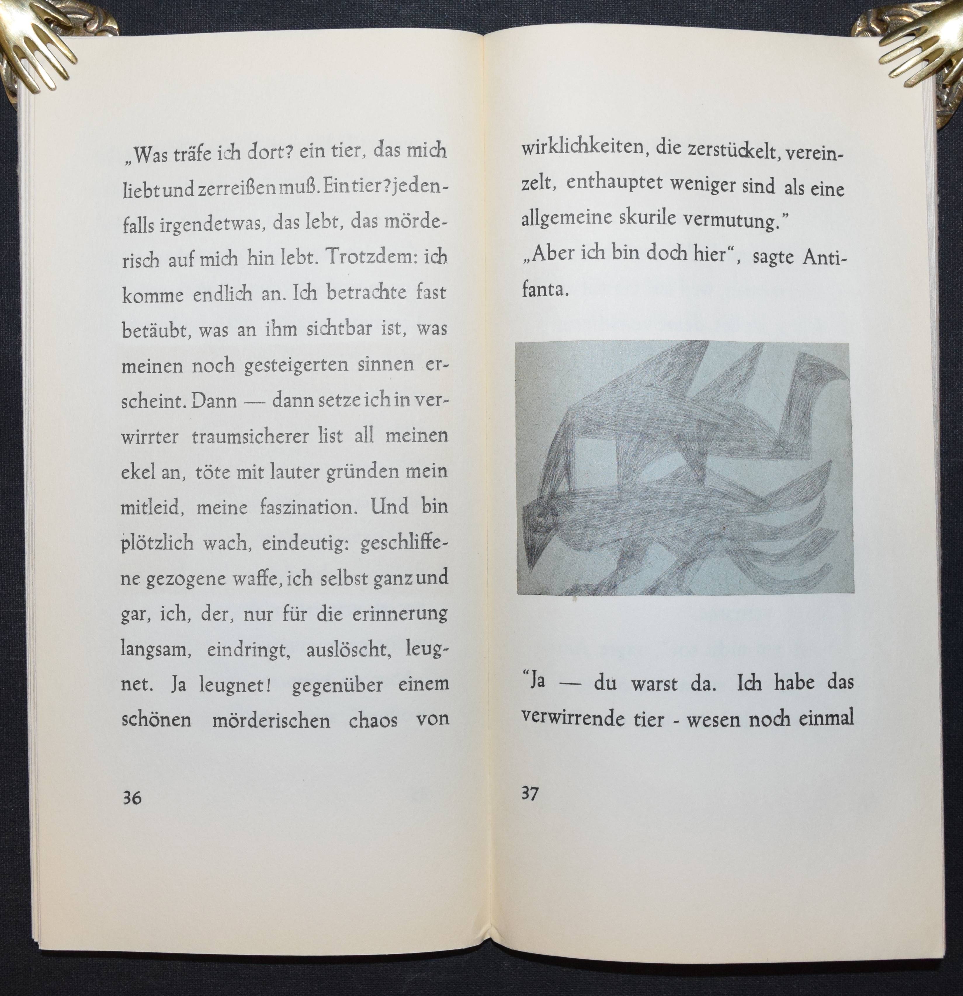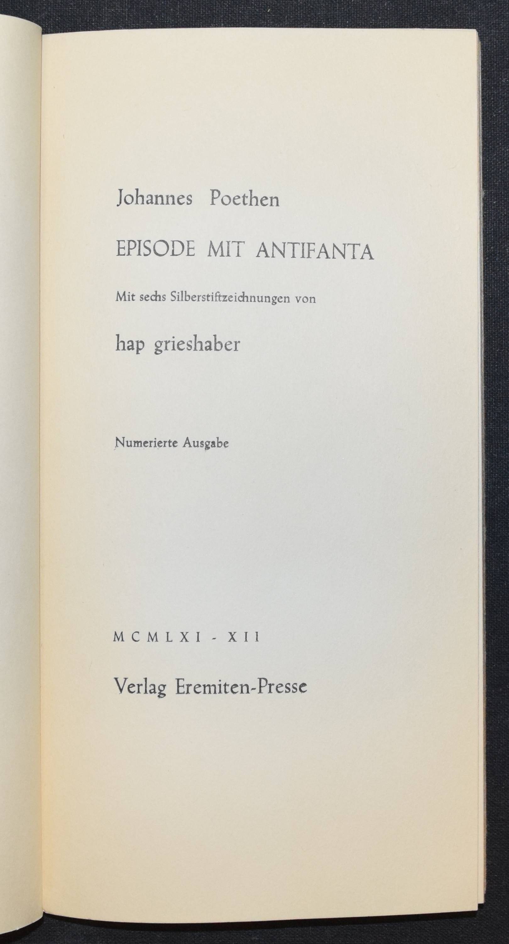 Poethen, Johannes. Episode mit Antifanta. Stierstadt im Taunus, Eremiten-Presse 1962. 8°. 49 S. mit 6 Silberstiftzeichnungen von HAP Grieshaber. OKart. mit mont. Deckelbild. (Proroman 4). Eines von 39 unnumerierten Presse-Exemplaren (GA 111 Exemplare). – Gutes Exemplar.
