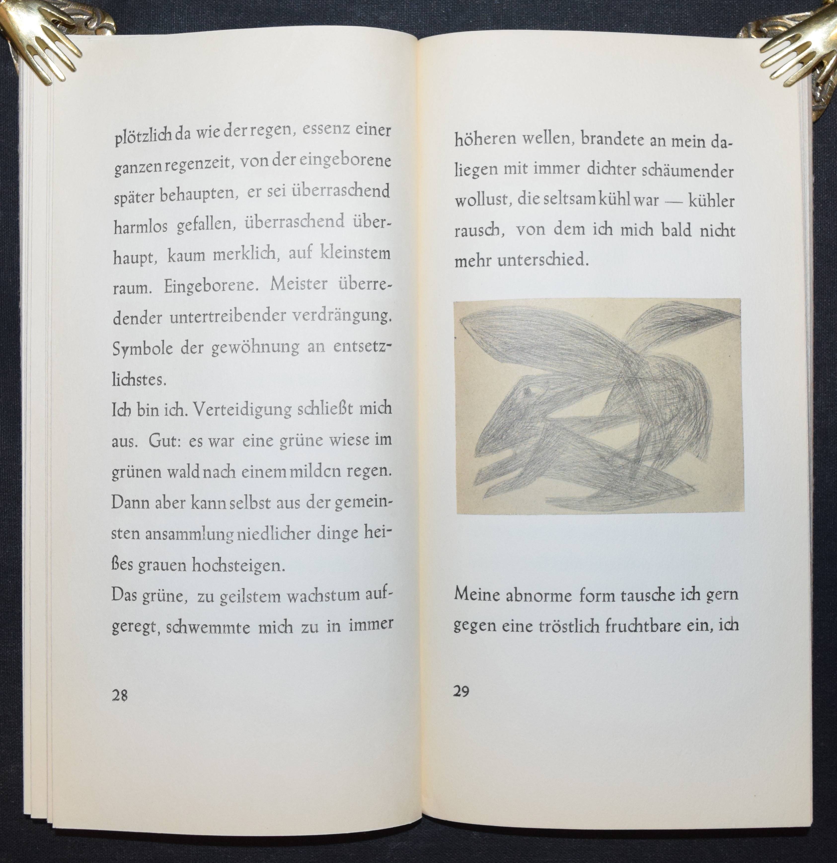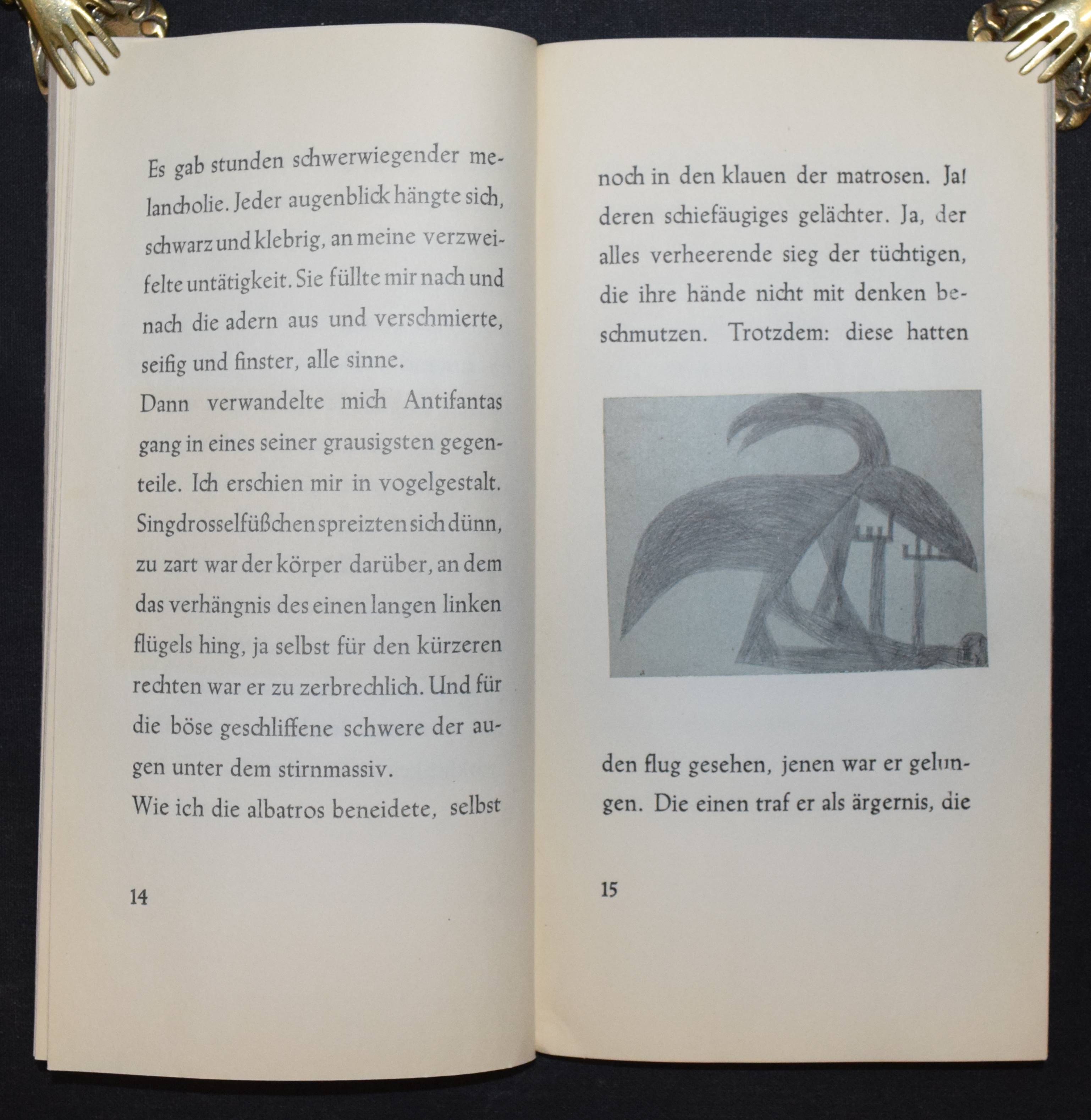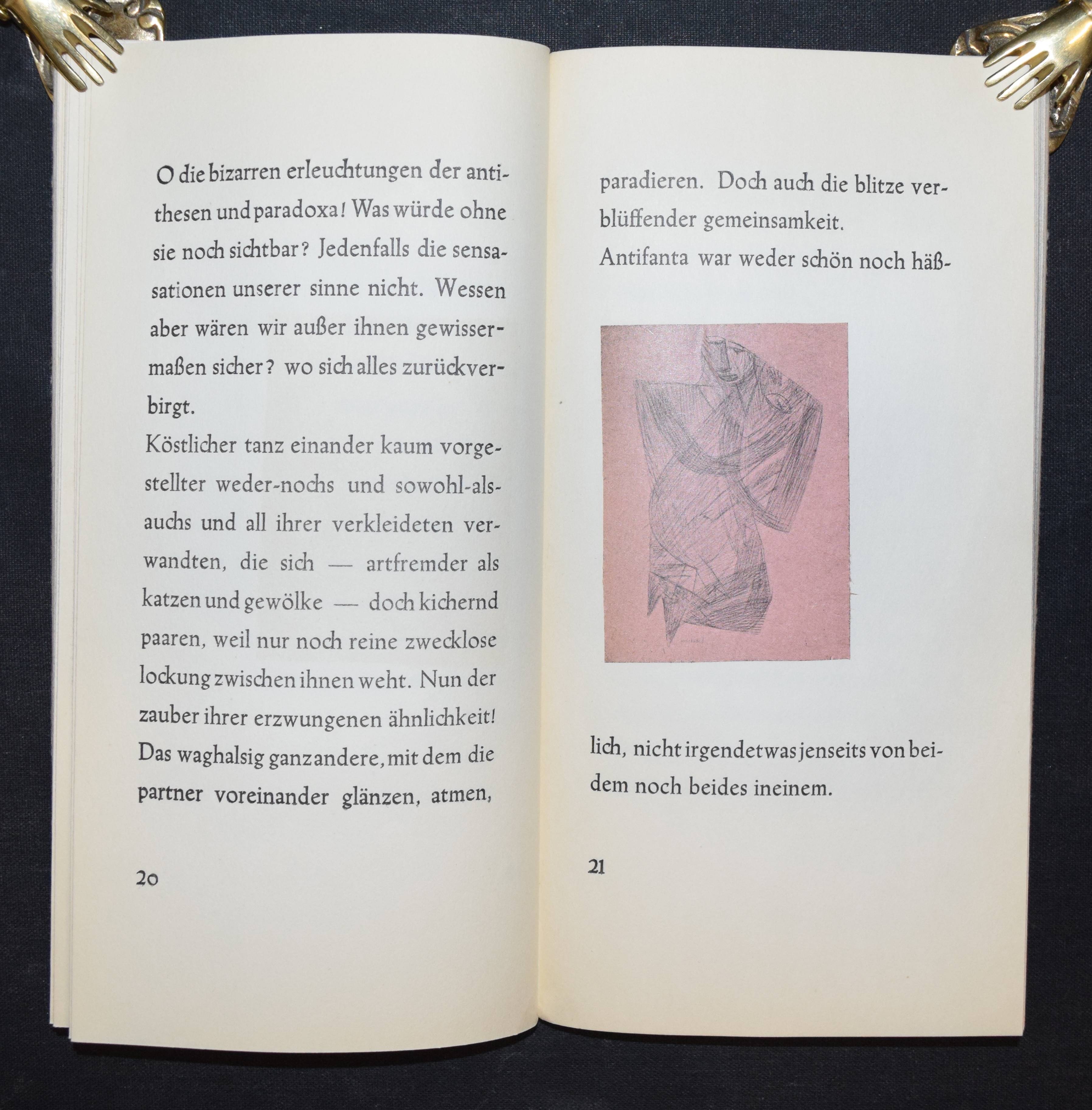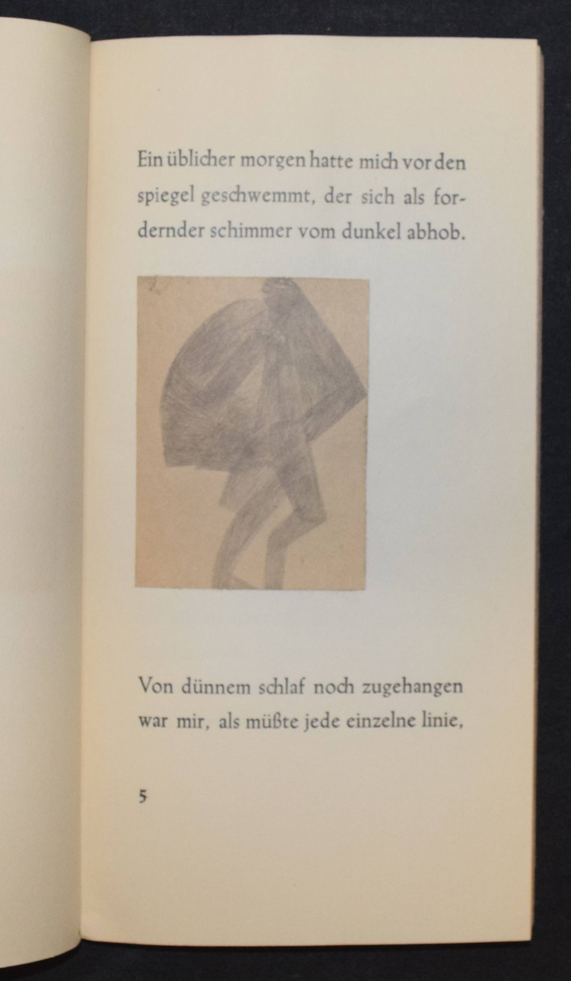 Poethen, Johannes. Episode mit Antifanta. Stierstadt im Taunus, Eremiten-Presse 1962. 8°. 49 S. mit 6 Silberstiftzeichnungen von HAP Grieshaber. OKart. mit mont. Deckelbild. (Proroman 4). Eines von 39 unnumerierten Presse-Exemplaren (GA 111 Exemplare). – Gutes Exemplar.