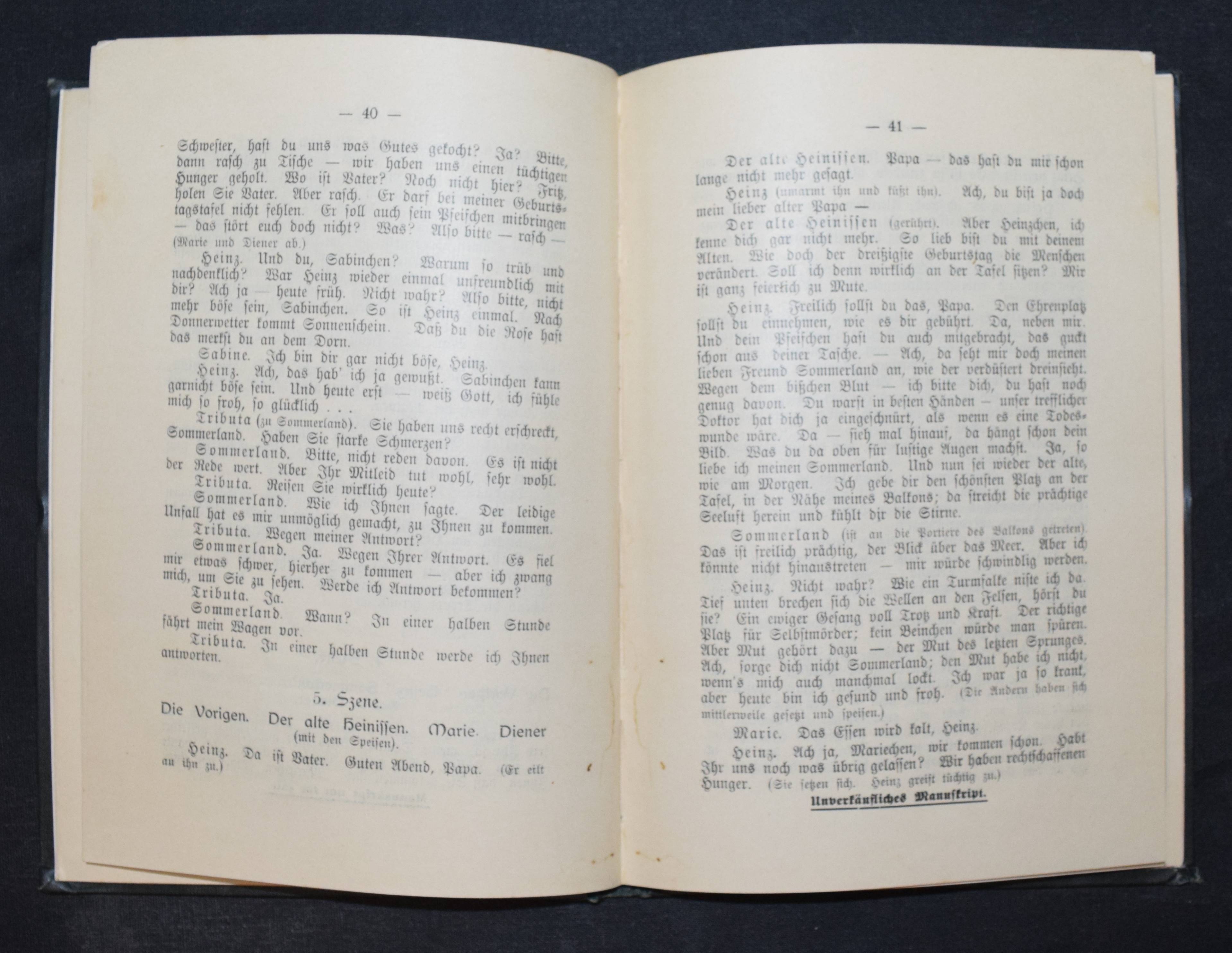 Wittenbauer, Ferdinand. Der Dämon. Drama in 5 Aufzügen. Berlin, Berliner Theater-Verlag 1911. 8°. 70 S., 1 Bl. Ln. d. Zt. Sehr seltene erste Ausgabe. – Als „unverkäuliches“ Bühnen-Manuskript erschienen. – Der österr. Techniker und Schriftsteller F. Wittenbauer (1857-1922) war Professor an der Technischen Hochschule in Graz. Sein dichterisches Werk geriet bald nach seinem Tod in Vergessenheit, jedoch wurden seine Theaterstücke auf deutschsprachigen seit der Jahrhundertwende gerne aufgeführt. Sein bekanntestes Drama „Der Privatdozent“ wurde 1906 nach der Uraufführung im Deutschen Volkstheater in Wien von Hermann Bahr rezensiert. – Gutes Exemplar.