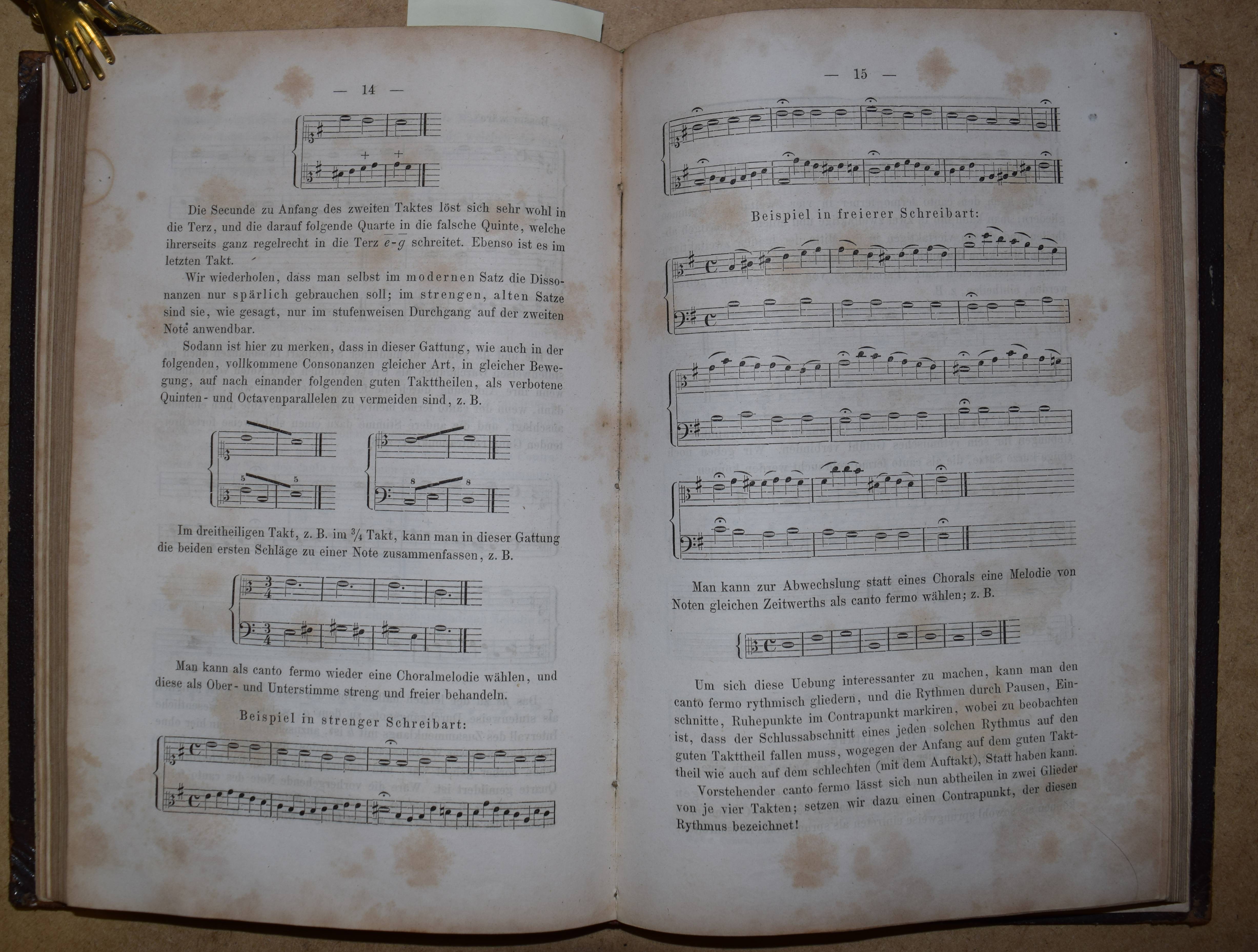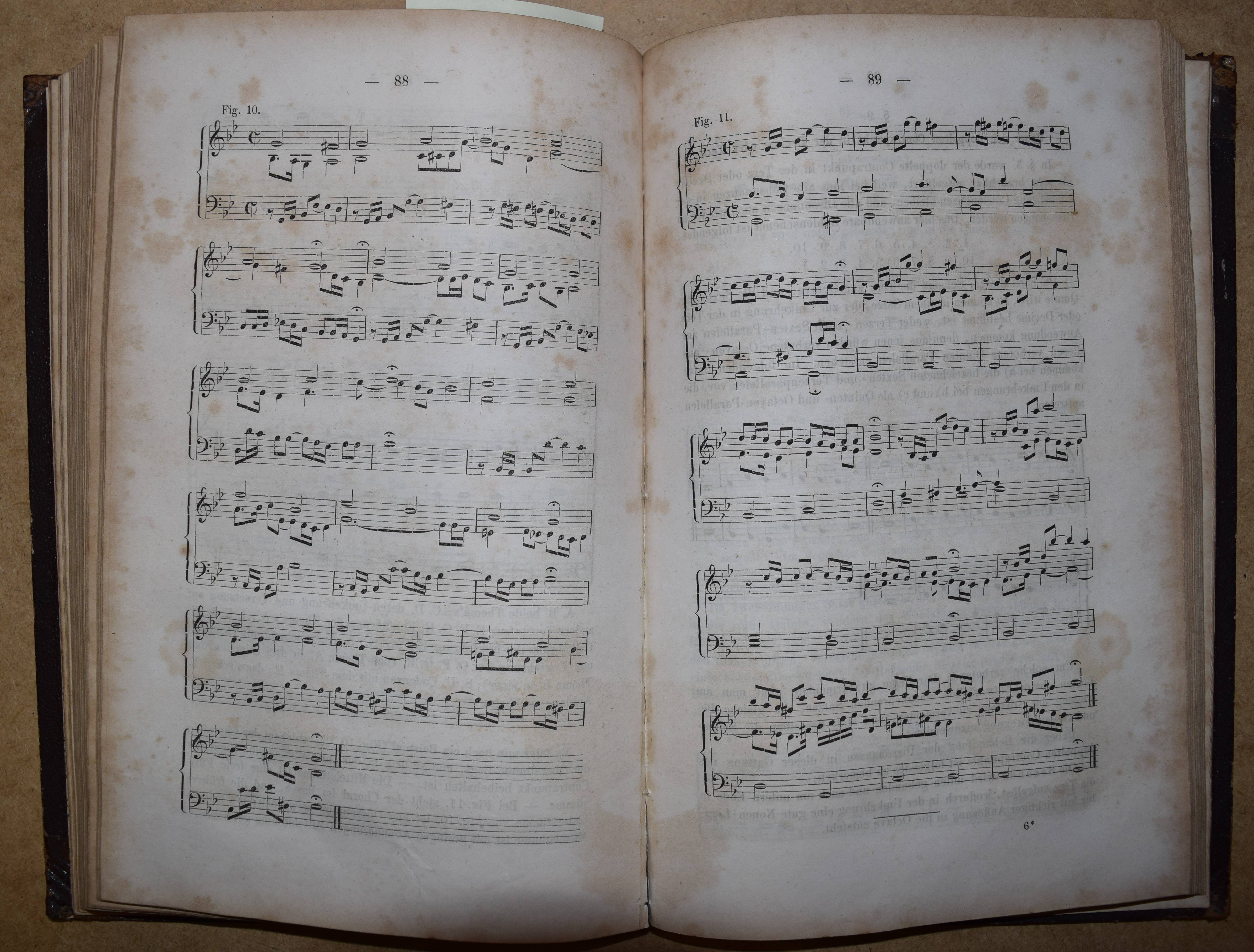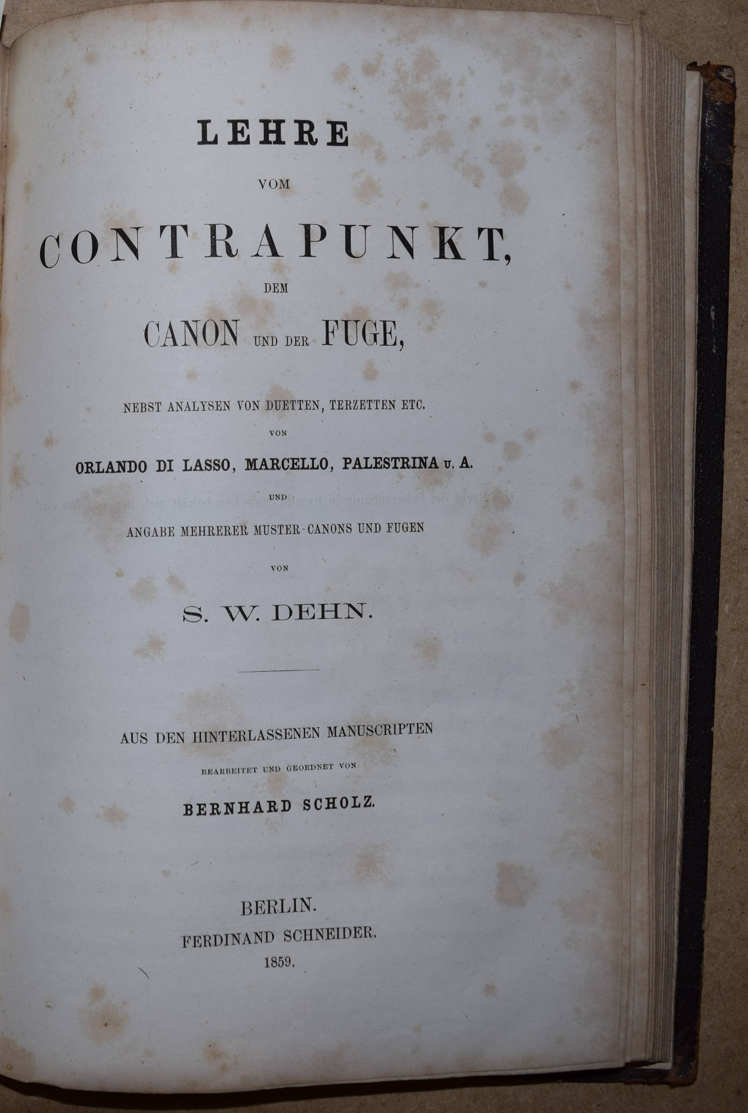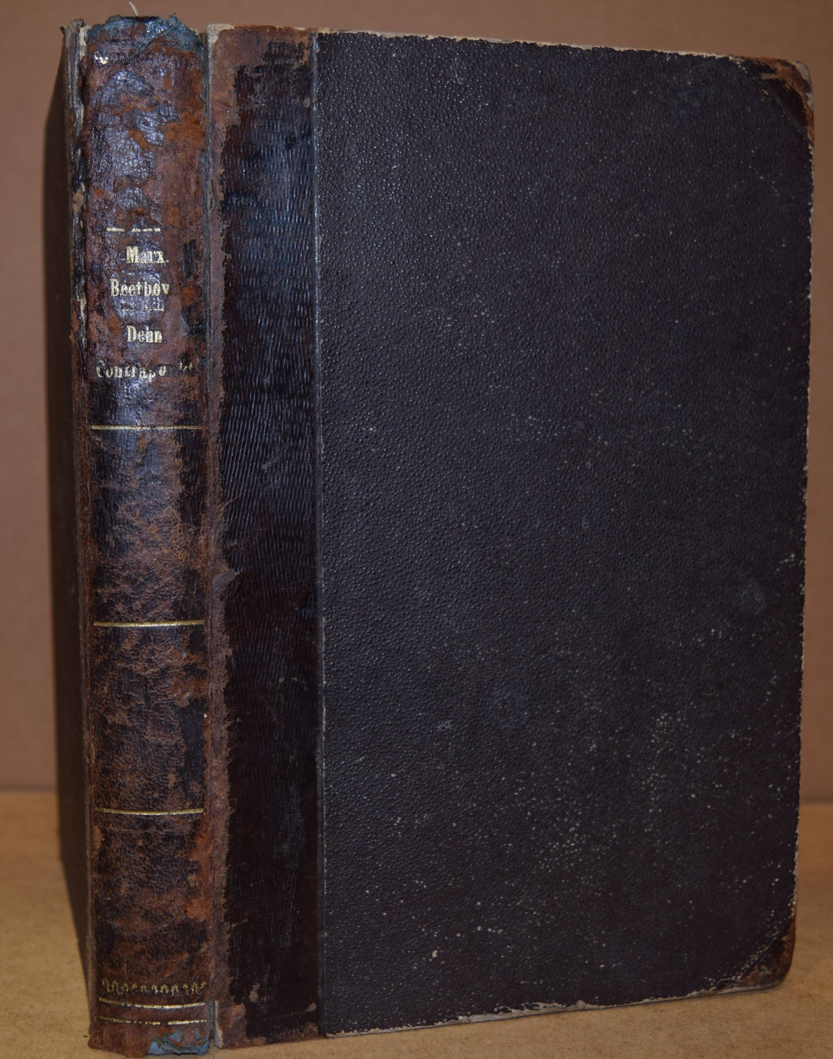 Marx, Adolf Bernhard. Anleitung zum Vortrag Beethovenscher Klavierwerke. Berlin, Janke 1863. 8°. IV, 156 S. mit zahlr. Notenbeispielen. Hldr. d. Zt. mit goldgepr. Rückentitel u. Linienverg. Erste Ausgabe. – Beigebunden: Dehn, S.W. Lehre vom Contrapunkt, dem Canon und der Fuge, nebst Analysen von Duetten, Terzetten etc. von Orlando di Lasso, Marcello, Palestrina u. A. und Angabe mehrerer Muster-Canons und Fugen. Berlin, Schneider 1859. VIII, 182, 78 S. mit zahlr. Notenbeispielen. – Erste Ausgabe. – Rücken stärker berieben und aan den Gelenken oben etwas angeplatzt, stellenweise etwas stockfl.