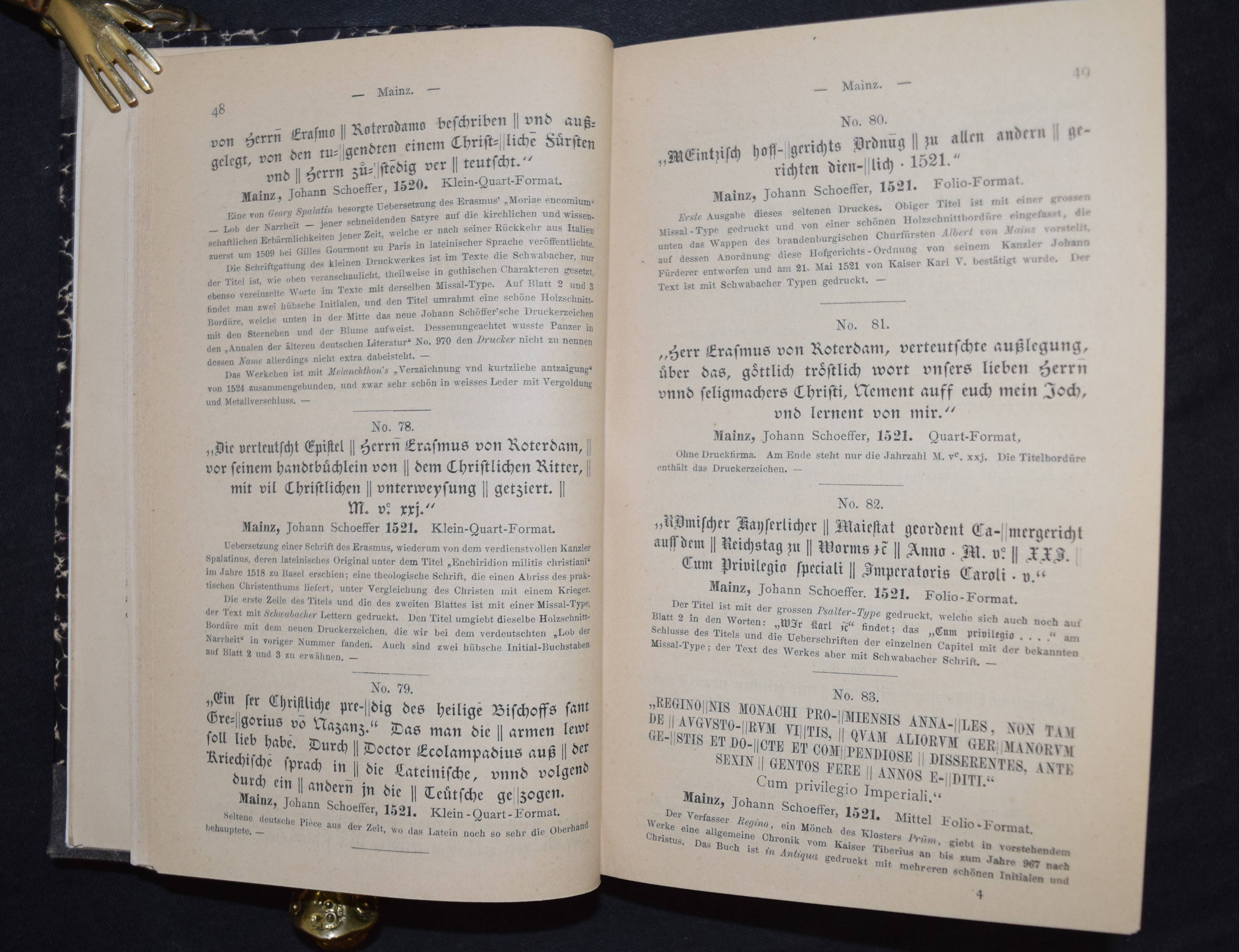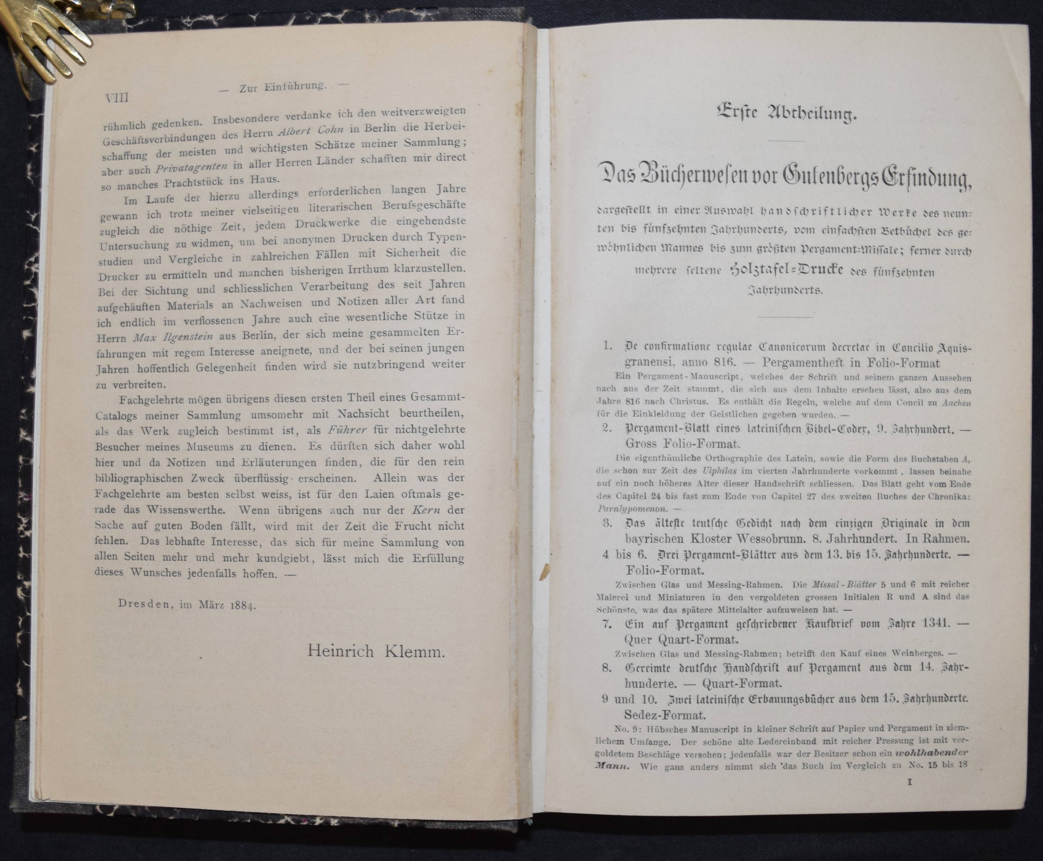 Klemm, Heinrich. Beschreibender Catalog des Bibliographischen Museums. Erste und zweite Abteilung: Manuscripte und Druckwerke des 15. und 16. Jahrhunderts aus den frühesten bis 1470 bekannt gewordenen Druckstädten, zusammen über 1000 Gegenstände umfassend. Dresden, Klemm 1884. 8°. VIII, 509 S. mit lithogr. Frontispiz (Gutenbergs Druckerpresse). Hln. d. Zt. mit goldgepr. Rückentitel. Vorderes Gelenk in der Mitte angeplatzt, St.a.T., gutes Exemplar.