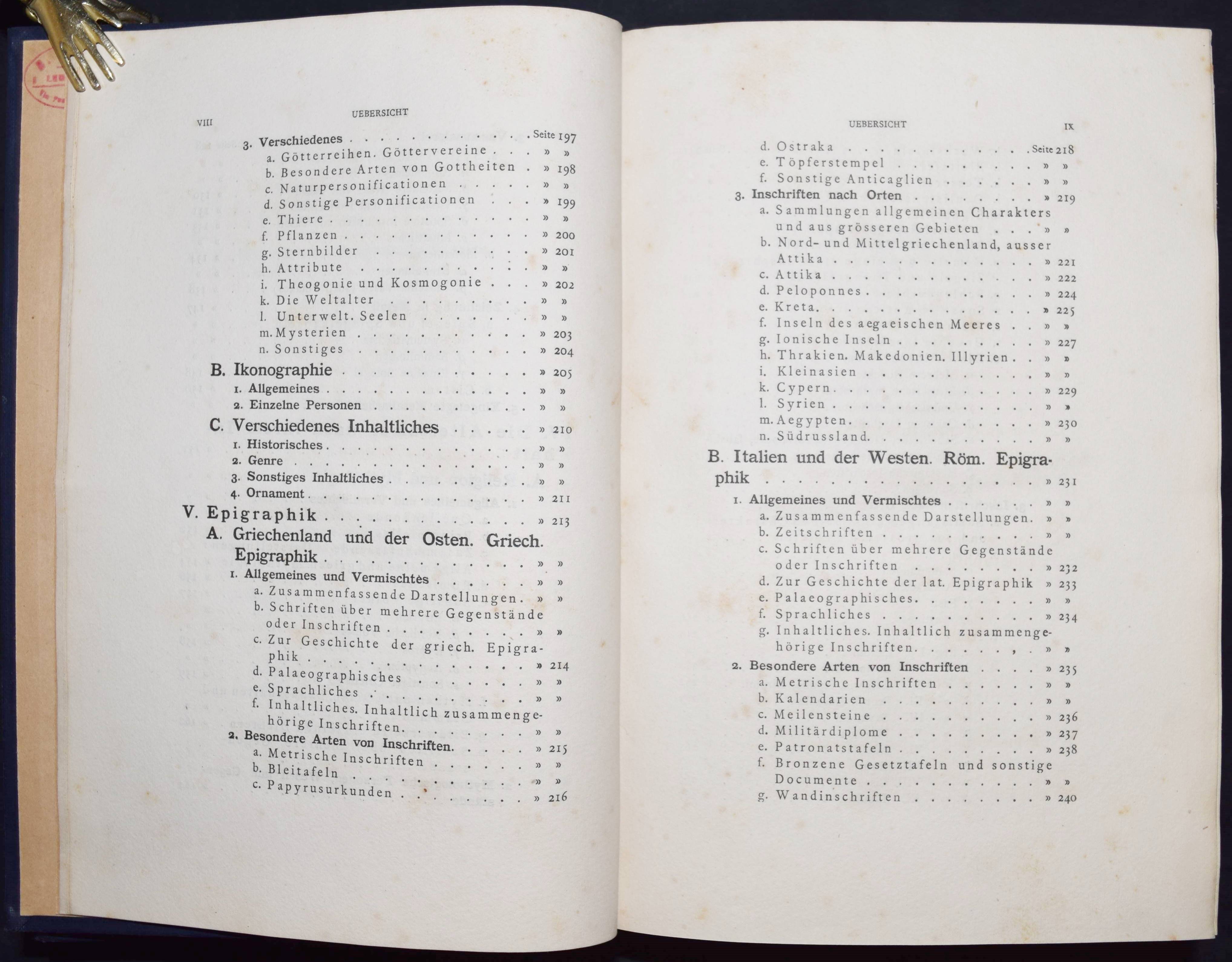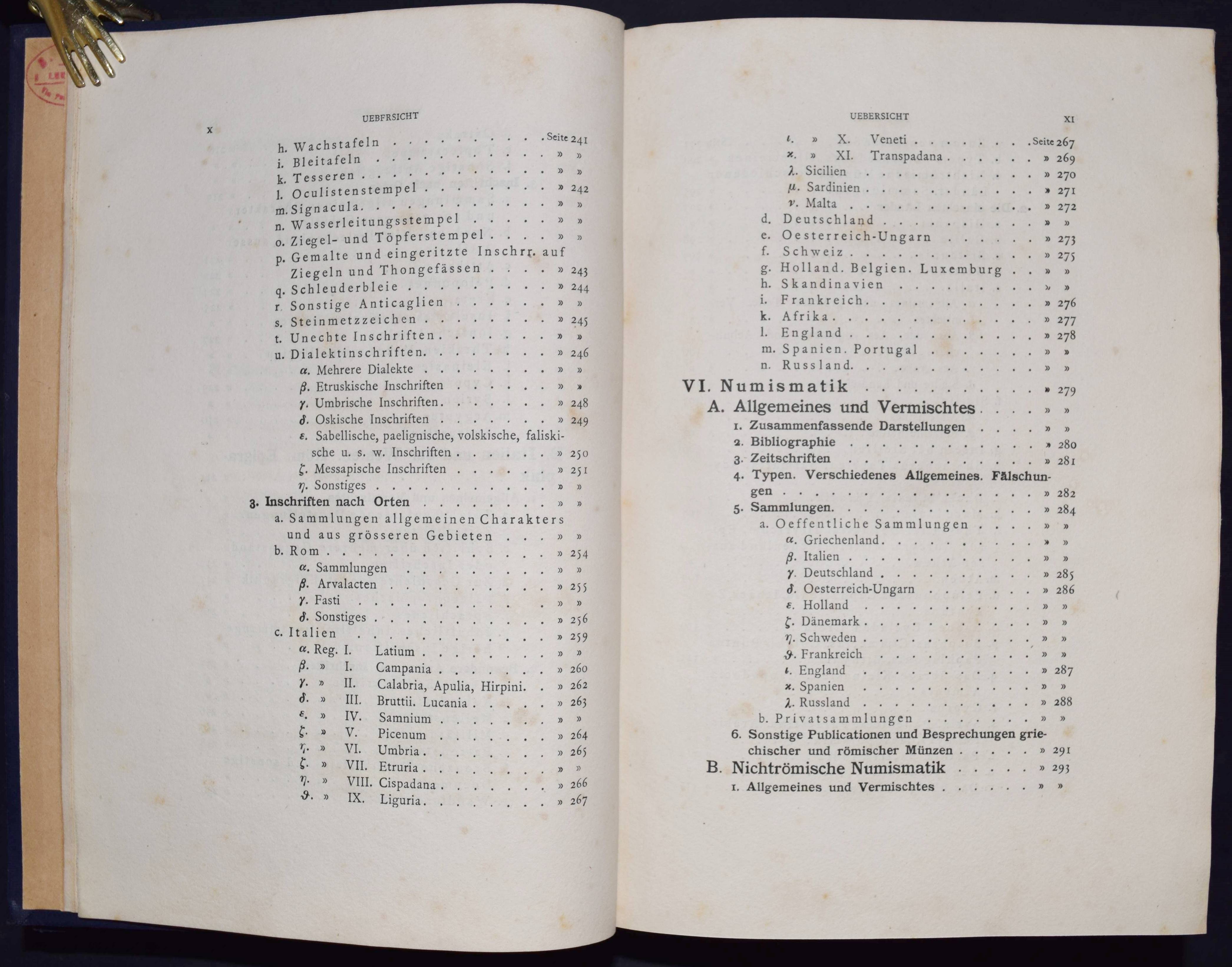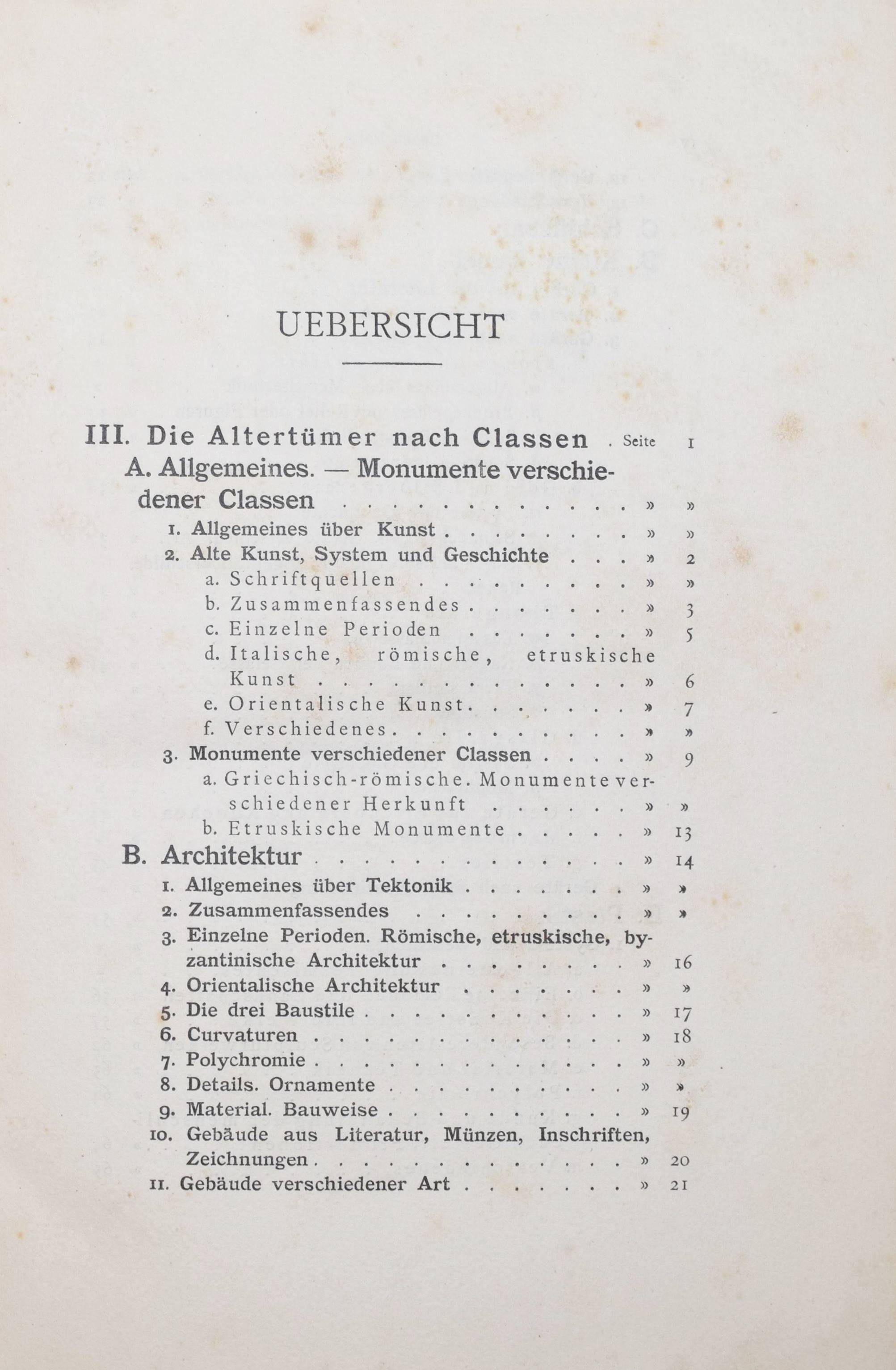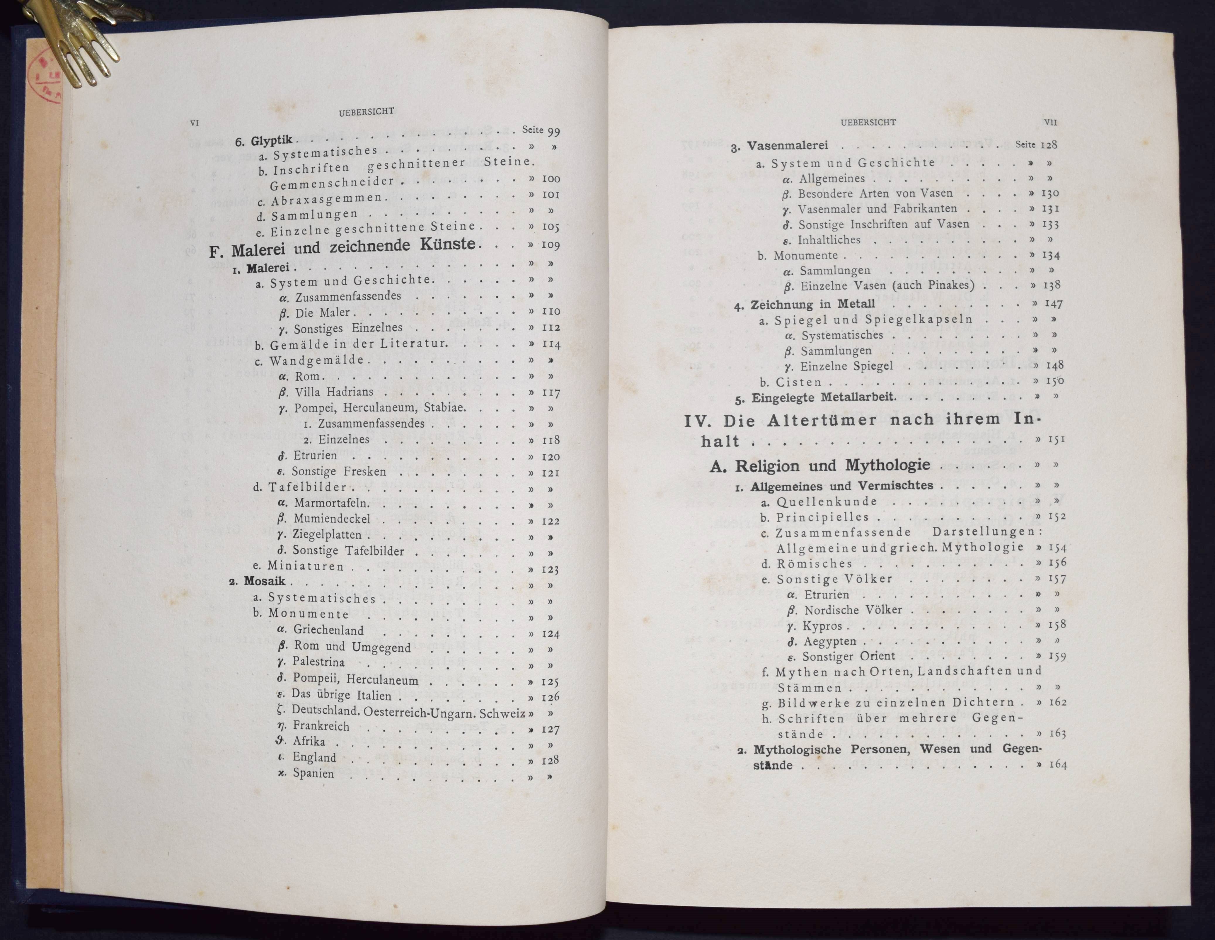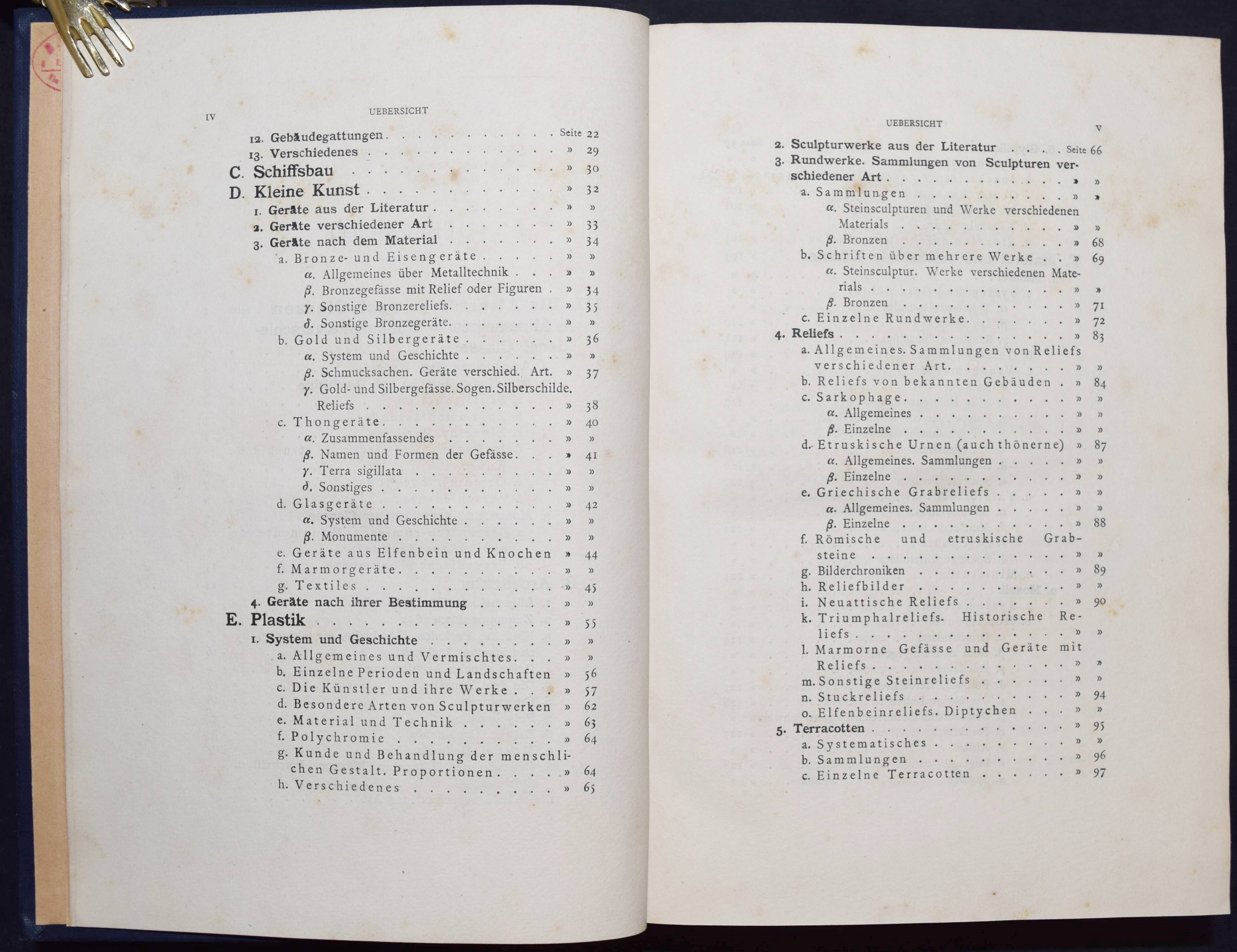 Mau, August. Katalog der Bibliothek des Kaiserlich Deutschen Archäologischen Instituts in Rom. 2 Bände. Rom, Loescher & Co. 1900-1902. Gr.-8°. X, 431 S.; XV, 615, (1) S. OLn. mit goldgepr. Rückentiteln. Seltene Originalausgabe des wichtigen Katalogs. – Später erschien noch ein kl. Supplement. – Vereinzelt leicht stockfl. u. gebräunt, sehr gutes Exemplar.