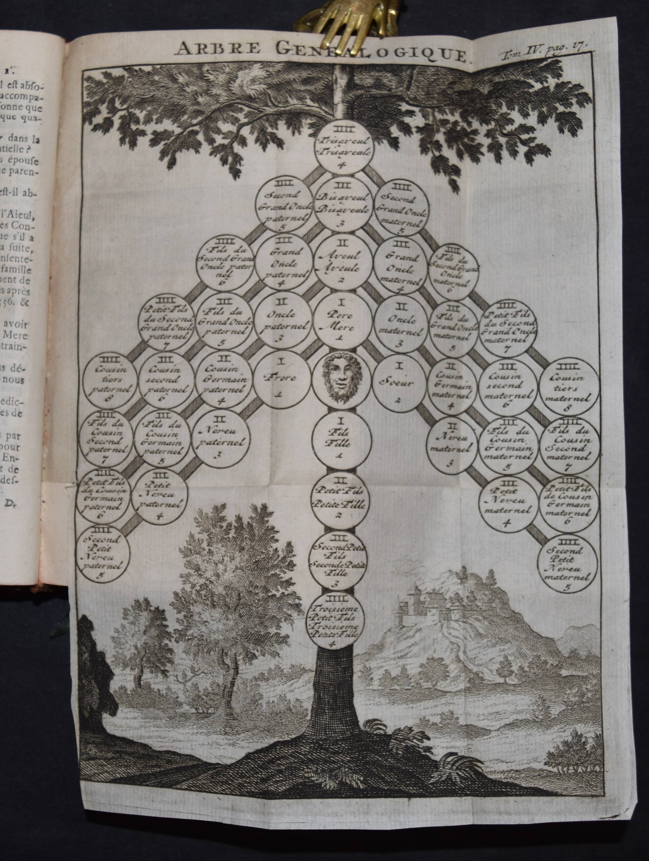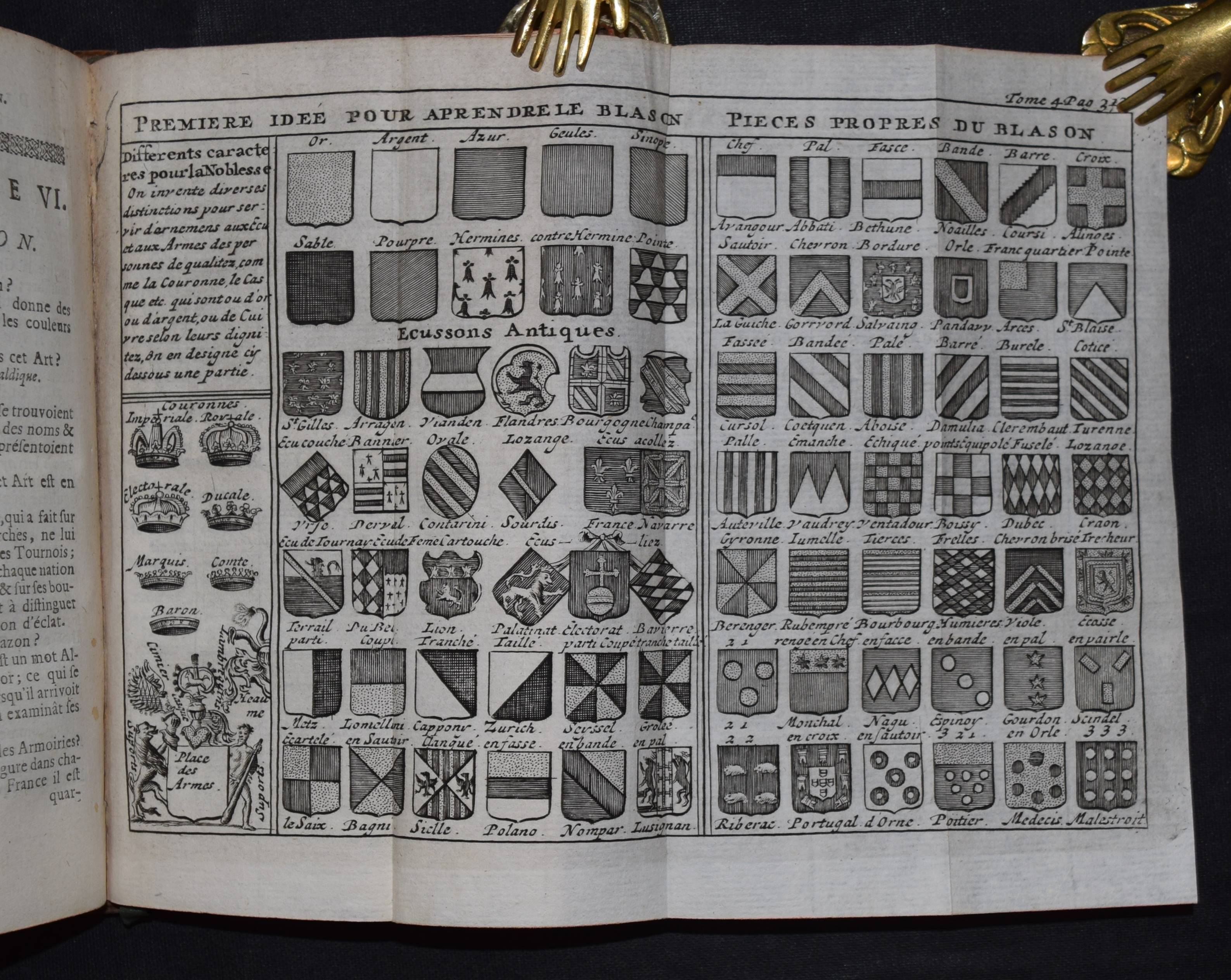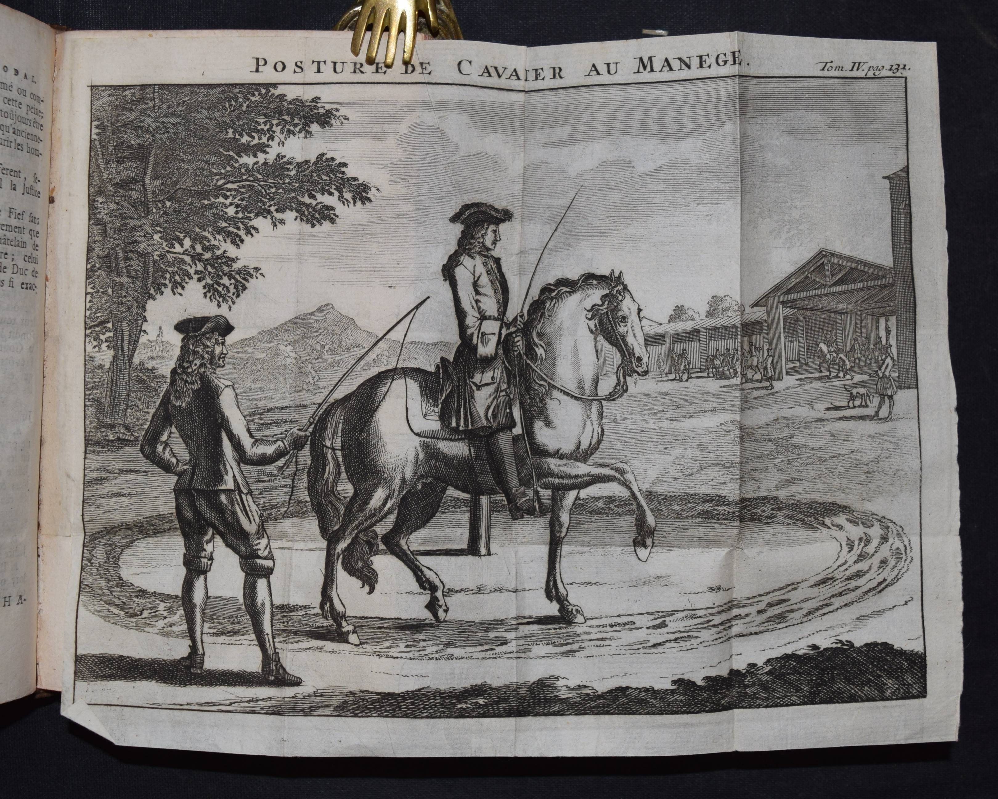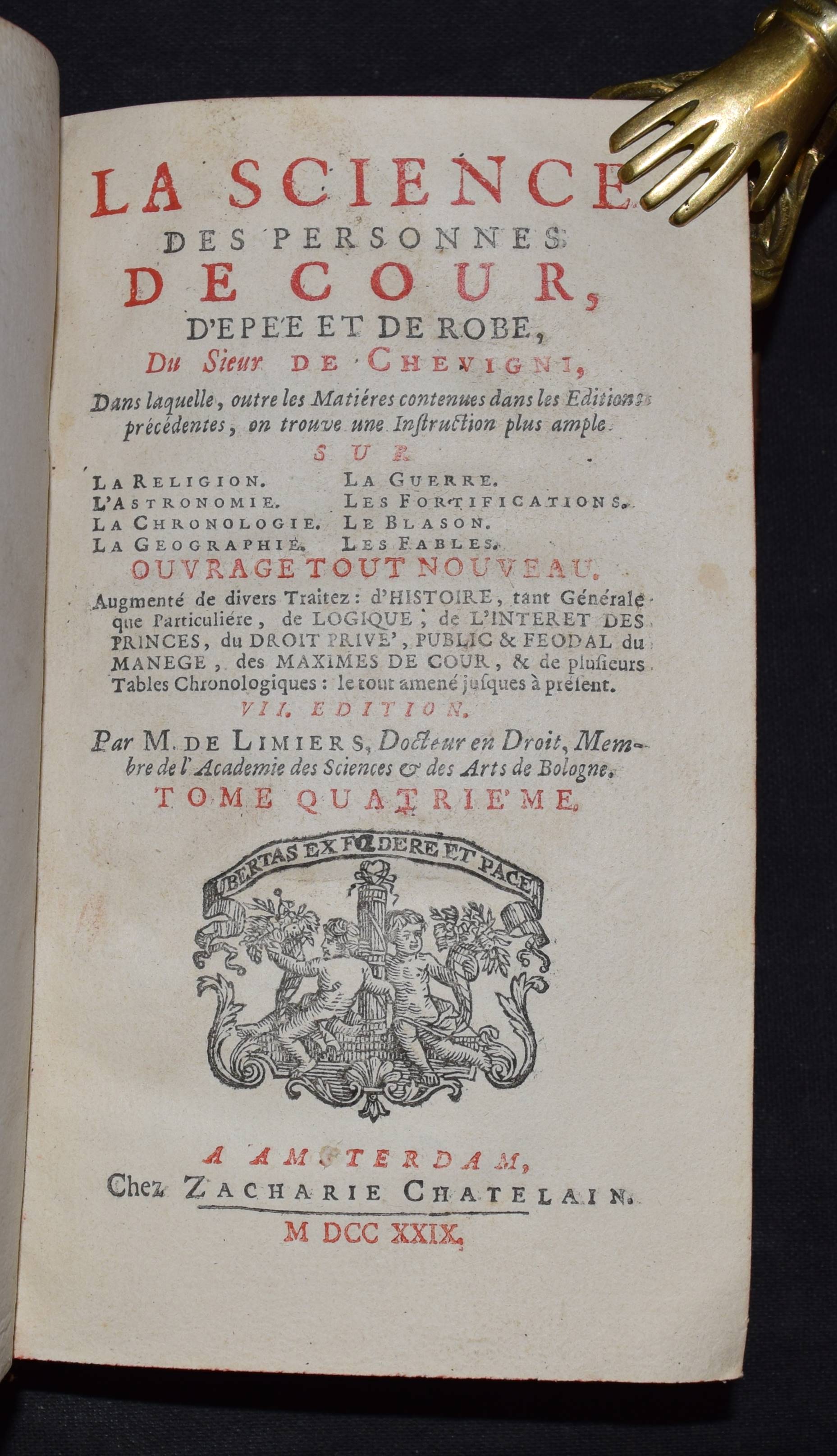 Chevigny, (Pierre Massuet) de. La science des personnes de la cour, de l`epée et de la robe, du Sieur de Chevigni, dans laquelle, outre les matieres contenues dans les editions precedentes, on trouve une instruction plus ample sur la religion. … VII. edition. Par M. de Limiers, … Tome quadrième (de 4). Amsterdam, Chez Zacharie Chatelain M DCC XXIX. [1729]. Kl.-8°. Titel in Rot u. Schwarz, [1] Bl., 410 S. mit 7 gefalt. Kupfertafeln. Ldr. d. Zt. mit 2 goldgepr. Rückensch. u. reicher floraler Rückenverg. Cioranescu 19429 f. (and. Ausgabe). – Vollständiger letzter Band der interessanten Enzyklopädie zur Pädagogik von Adeligen. – Das Werk erschien zuerst 1706 und erlebte zahlreiche Neuauflagen. – Der vorliegende Band enthält Beiträge über Rechtswissenschaft, Reitlehre, Militär, Marine, Heraldik und Fabeln. Die Kupfertafeln zeigen einen Stammbaum, ein Pferd in einer Manege, militärische Festungen, ein großes Segelschiff und verschiedene Wappen. – Deckel leicht berieben, sehr gutes sauberes Exemplar.