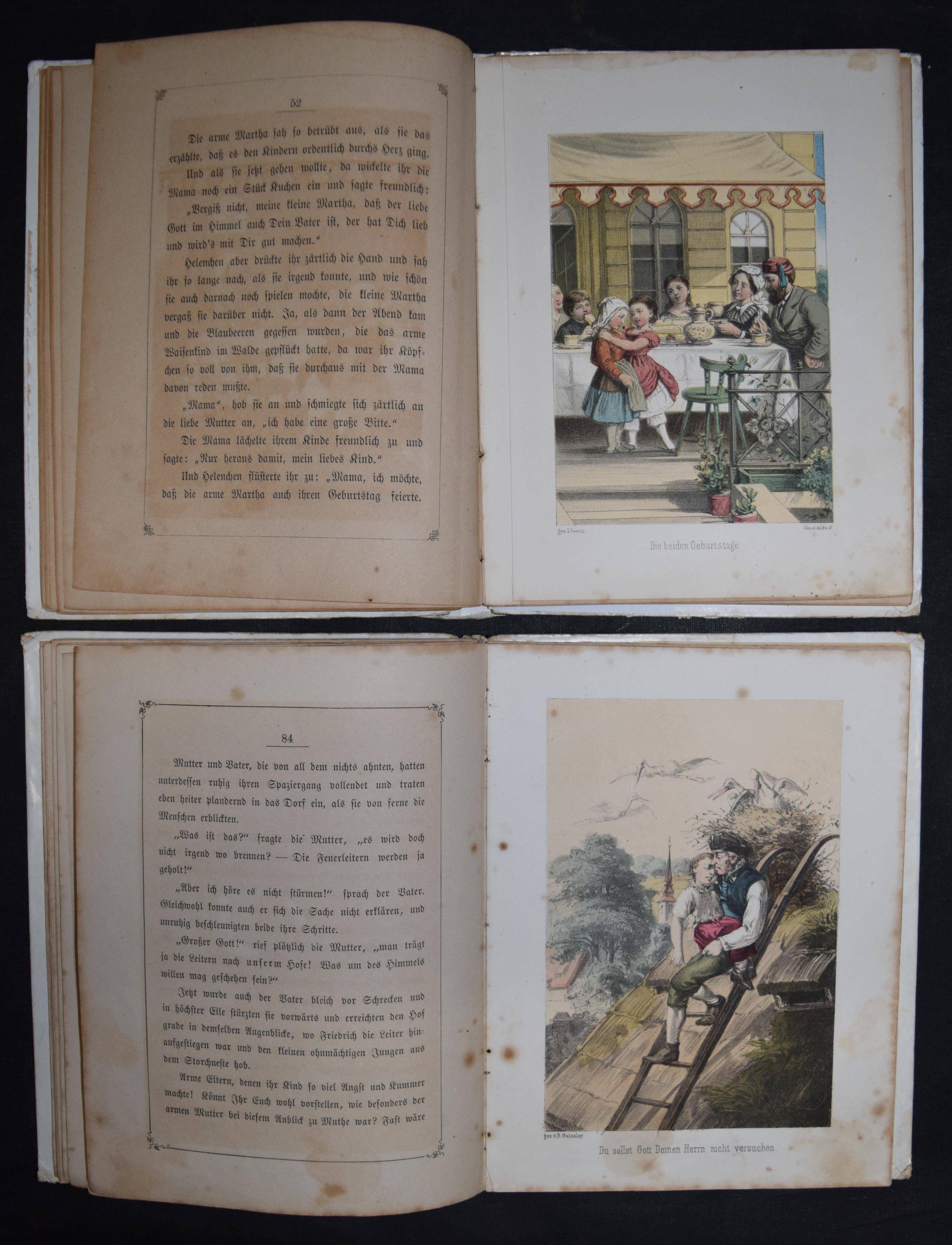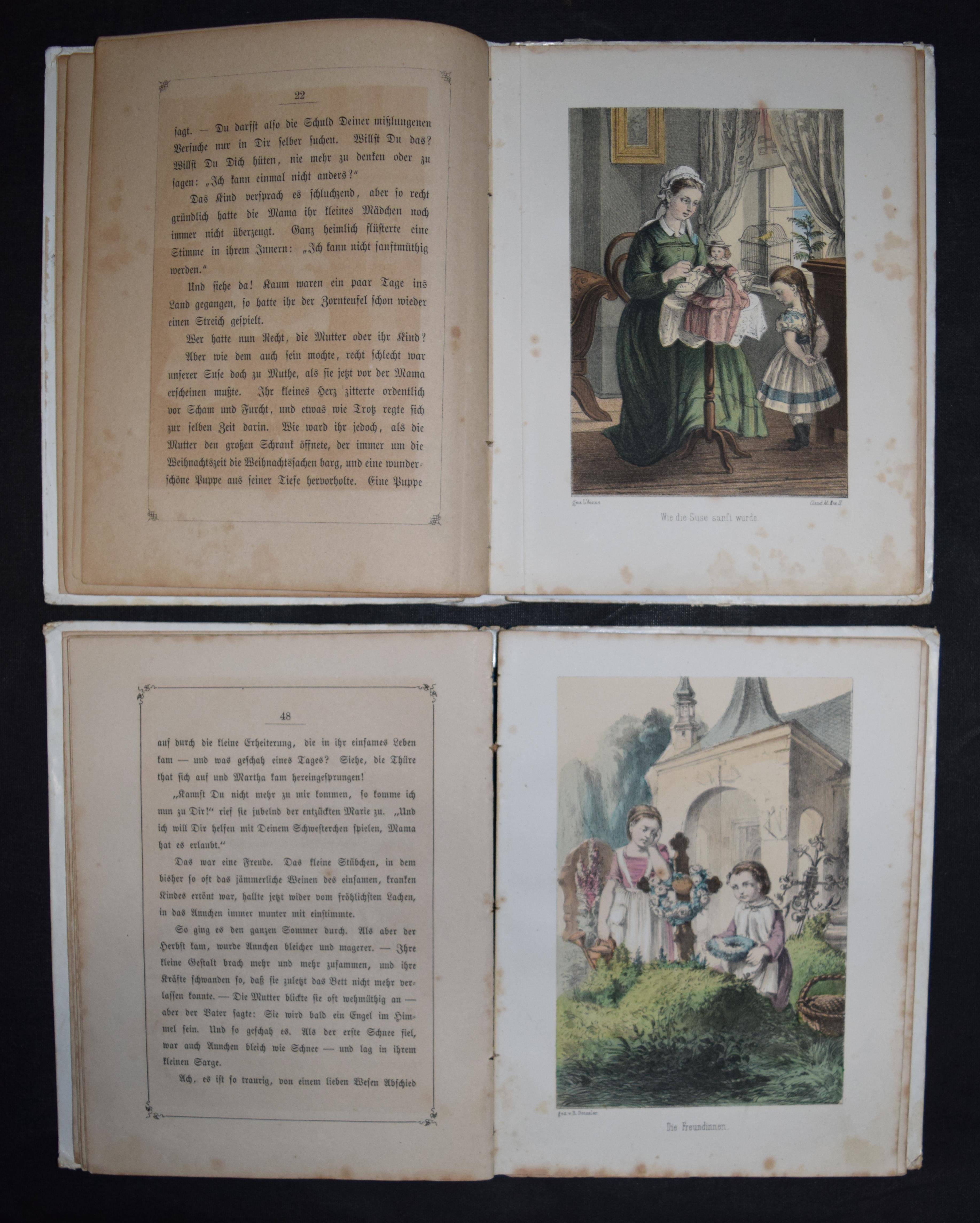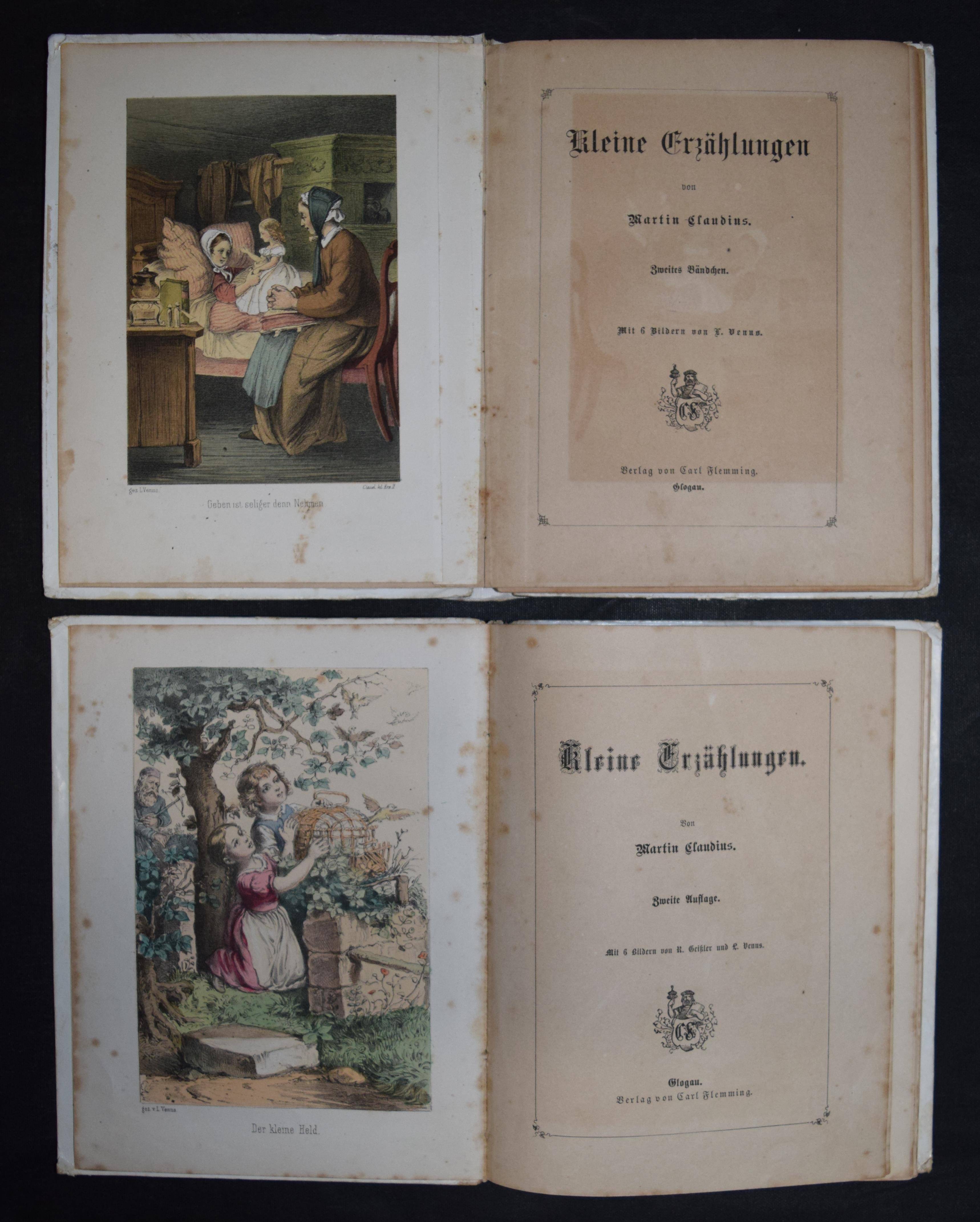 Claudius, Martin (d. i. Wilhelmine Petzel). Kleine Erzählungen. 2. Aufl. Glogau, Flemming o. J. (1870). 8°. 2 Bl., 104 S. mit 6 handkol. lithogr. Tafeln mit Tonplatte von R(udolf) Geißler und L(eopold) Venus. OPbd. mit weißem Lackpapier, goldgepr. Deckeltitel sowie hellblauer u. goldgepr. Deckelornamentik. Klotz 886/9. Pataky I, 130 (gibt Rosa Petzel als Verfasserin an) u. II, 128 f. Wegehaupt III, 591 (spätere Ausgabe; gibt Marie Petzel als Verfasserin an). – Seltene frühe Ausgabe dieser seltenen Sammlung mit reizvollen, sorgfältig kolorierten Illustrationen. – Wilhelmina (auch Minna) Petzel war, wie ihre Schwestern Rosa und Marie Mitarbeiterin von „Herzblättchens Zeitvertreib“ und dem „Töchter-Album“; alle Schwestern veröffentlichten unter dem Pseudonym Martin Claudius. – Rücken mit weißem Kunststoffband überklebt, Innengelenke gebrochen, dadurch Buchblock etwas gelockert, stellenweise etwas stockfl. u. gebräunt, gutes Exemplar mit den schönen Verlagseinbänden im Stil der französischen „Cartonage romantique“.