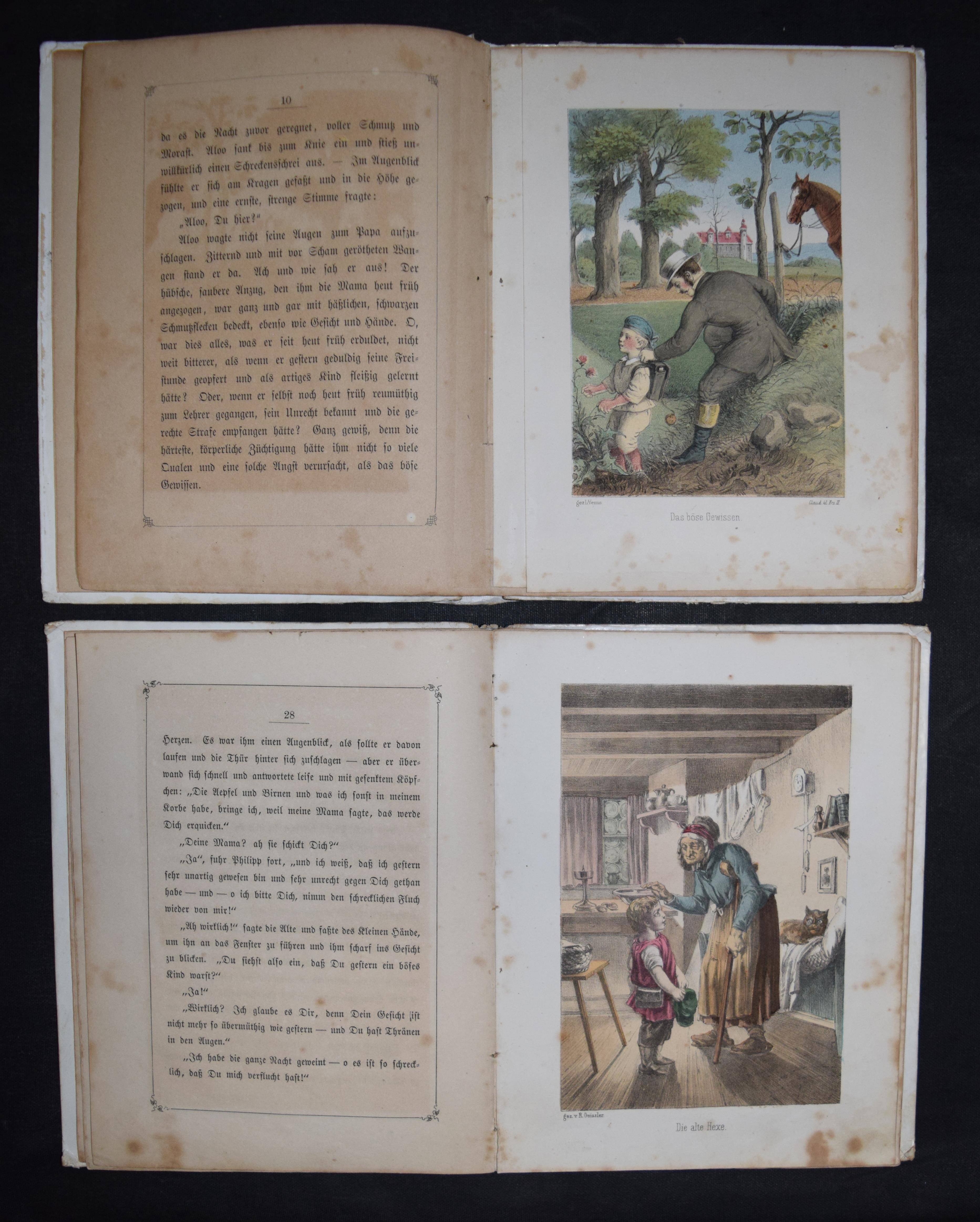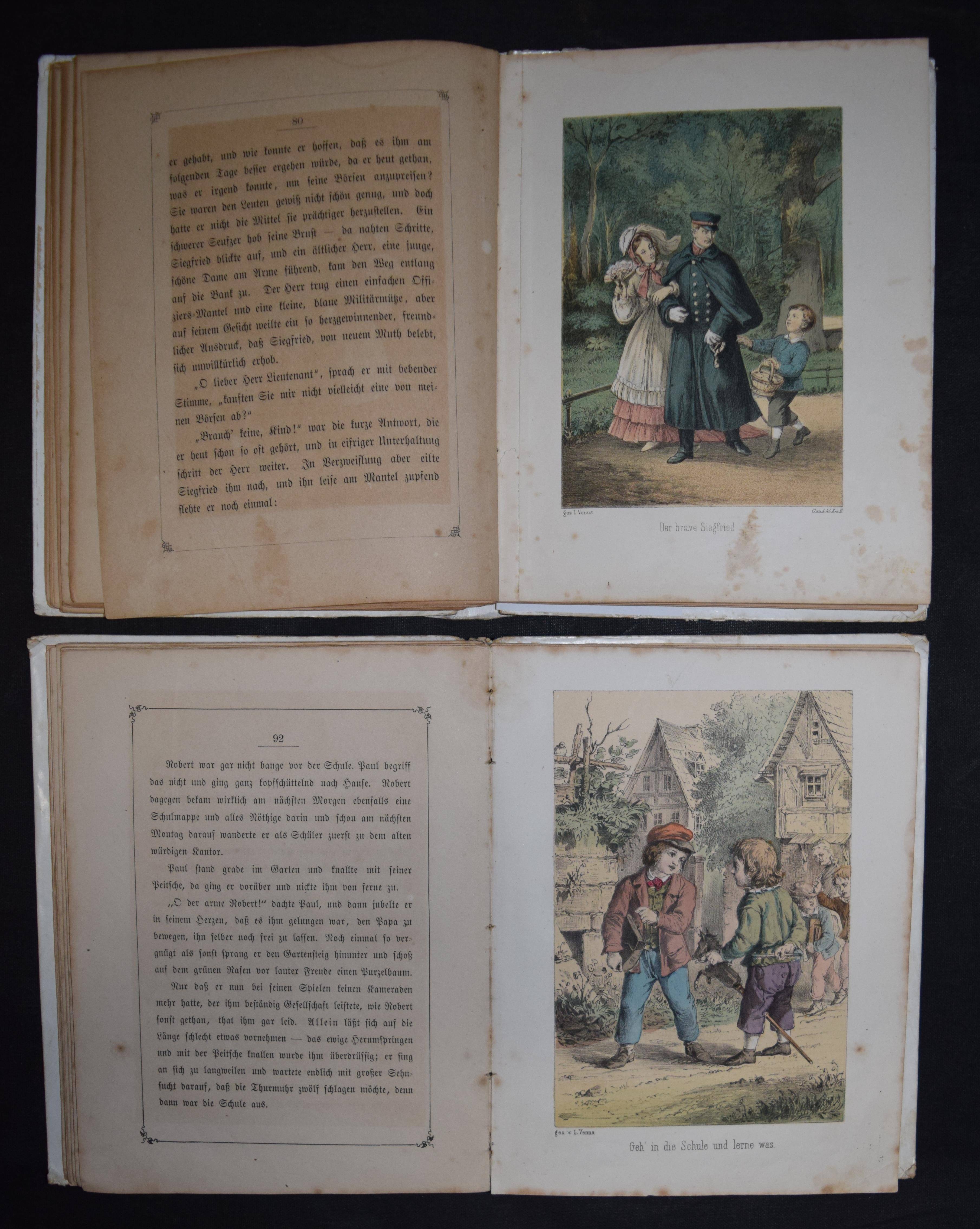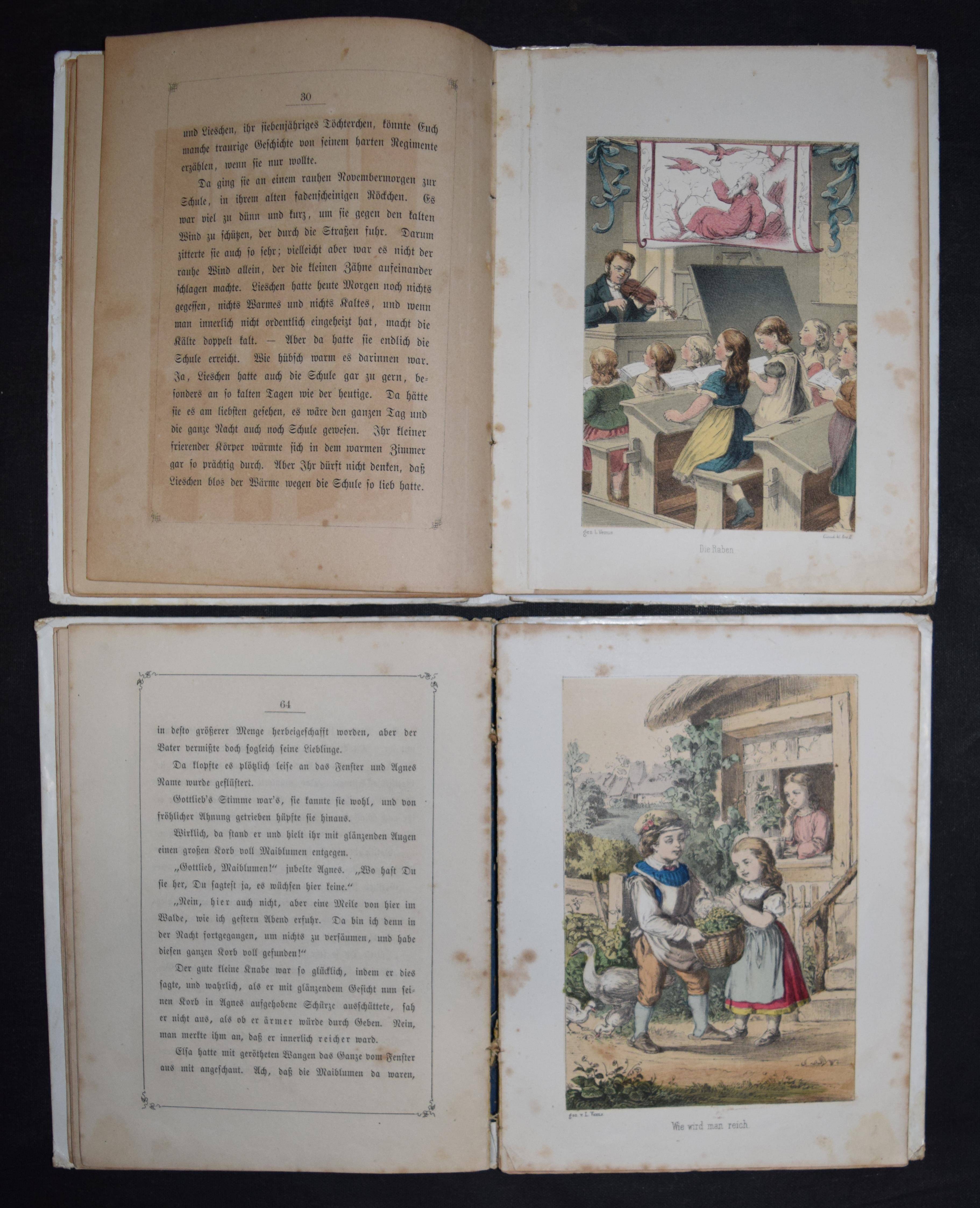 Claudius, Martin (d. i. Wilhelmine Petzel). Kleine Erzählungen. 2. Aufl. Glogau, Flemming o. J. (1870). 8°. 2 Bl., 104 S. mit 6 handkol. lithogr. Tafeln mit Tonplatte von R(udolf) Geißler und L(eopold) Venus. OPbd. mit weißem Lackpapier, goldgepr. Deckeltitel sowie hellblauer u. goldgepr. Deckelornamentik. Klotz 886/9. Pataky I, 130 (gibt Rosa Petzel als Verfasserin an) u. II, 128 f. Wegehaupt III, 591 (spätere Ausgabe; gibt Marie Petzel als Verfasserin an). – Seltene frühe Ausgabe dieser seltenen Sammlung mit reizvollen, sorgfältig kolorierten Illustrationen. – Wilhelmina (auch Minna) Petzel war, wie ihre Schwestern Rosa und Marie Mitarbeiterin von „Herzblättchens Zeitvertreib“ und dem „Töchter-Album“; alle Schwestern veröffentlichten unter dem Pseudonym Martin Claudius. – Rücken mit weißem Kunststoffband überklebt, Innengelenke gebrochen, dadurch Buchblock etwas gelockert, stellenweise etwas stockfl. u. gebräunt, gutes Exemplar mit den schönen Verlagseinbänden im Stil der französischen „Cartonage romantique“.