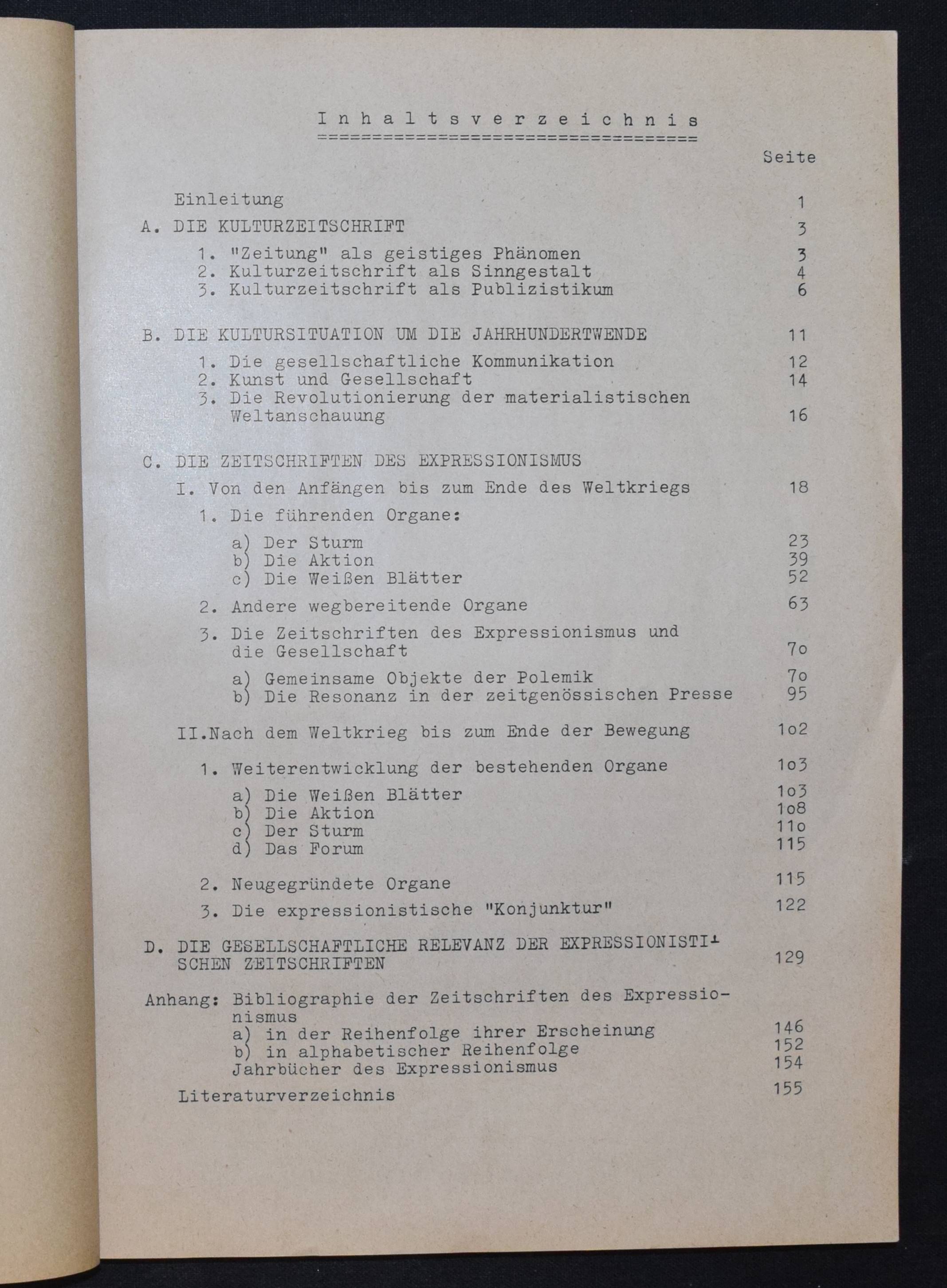 Schacherl, Lillian. Die Zeitschriften des Expressionismus. Versuch einer zeitungswissenschaftlichen Strukturanalyse. Inaugural-Dissertation. [Maschinenschriftliches vervielfältiges Typoskript). München, Ludwig-Maximilians-Universität [1958]. 4°. 157 gez. Bl. OBr. mit Leinenrücken. Gutes Exemplar.