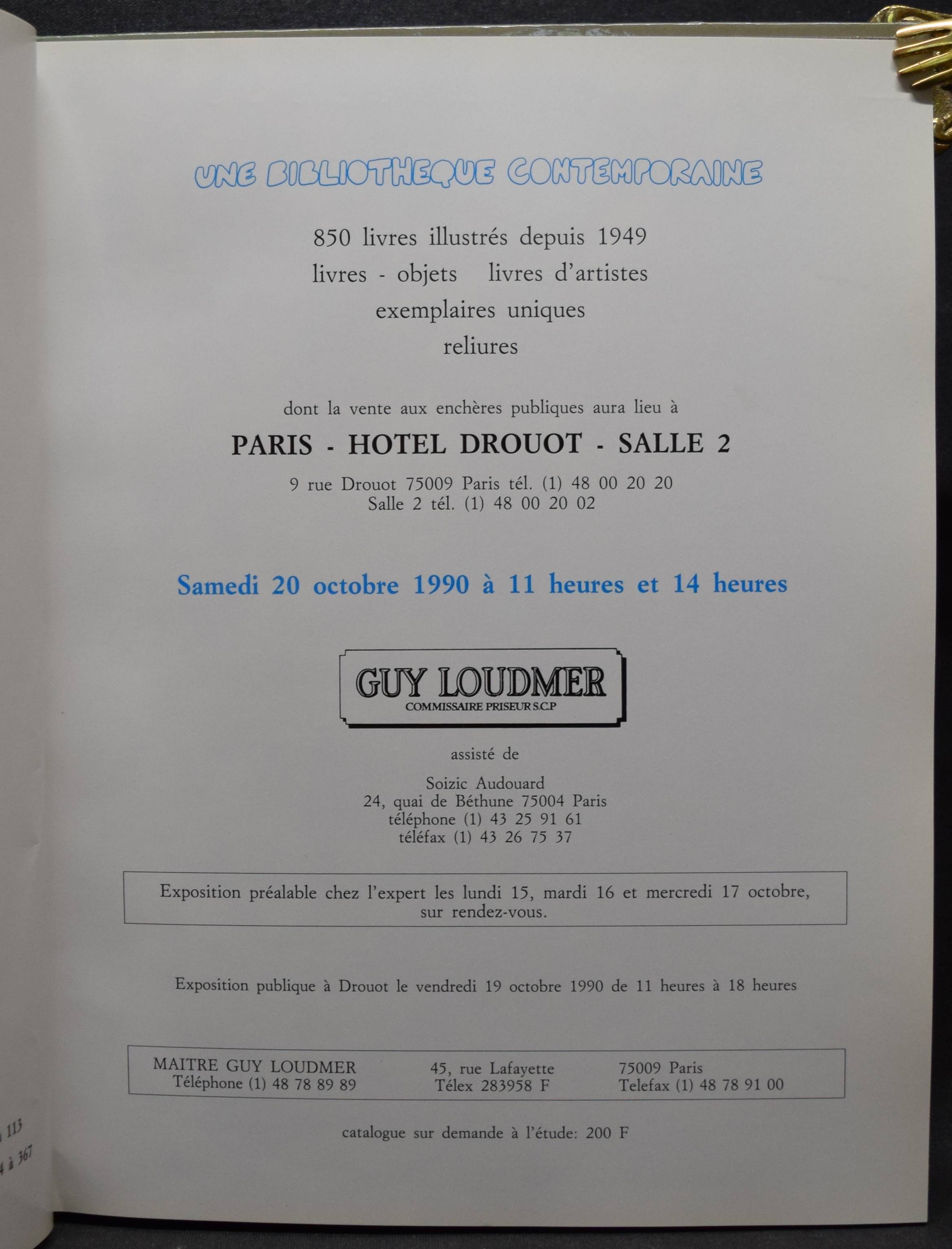 Une bibliotheque contemporaine. 850 livres illustrés depuis 1949. Livres, objets, livres d’artistes, exemplaires uniques, reliures. Dont l vente aux enchères publiques aura lieu à Paris, Hôtel Drouot, Salle 2, samedi 20 octobre 1990. Paris, Guy Loudmer 1990. 4°. [134] S. mit zahl. farb. Abb. Orig.-Kunststoffeinband. Gutes Exemplar.