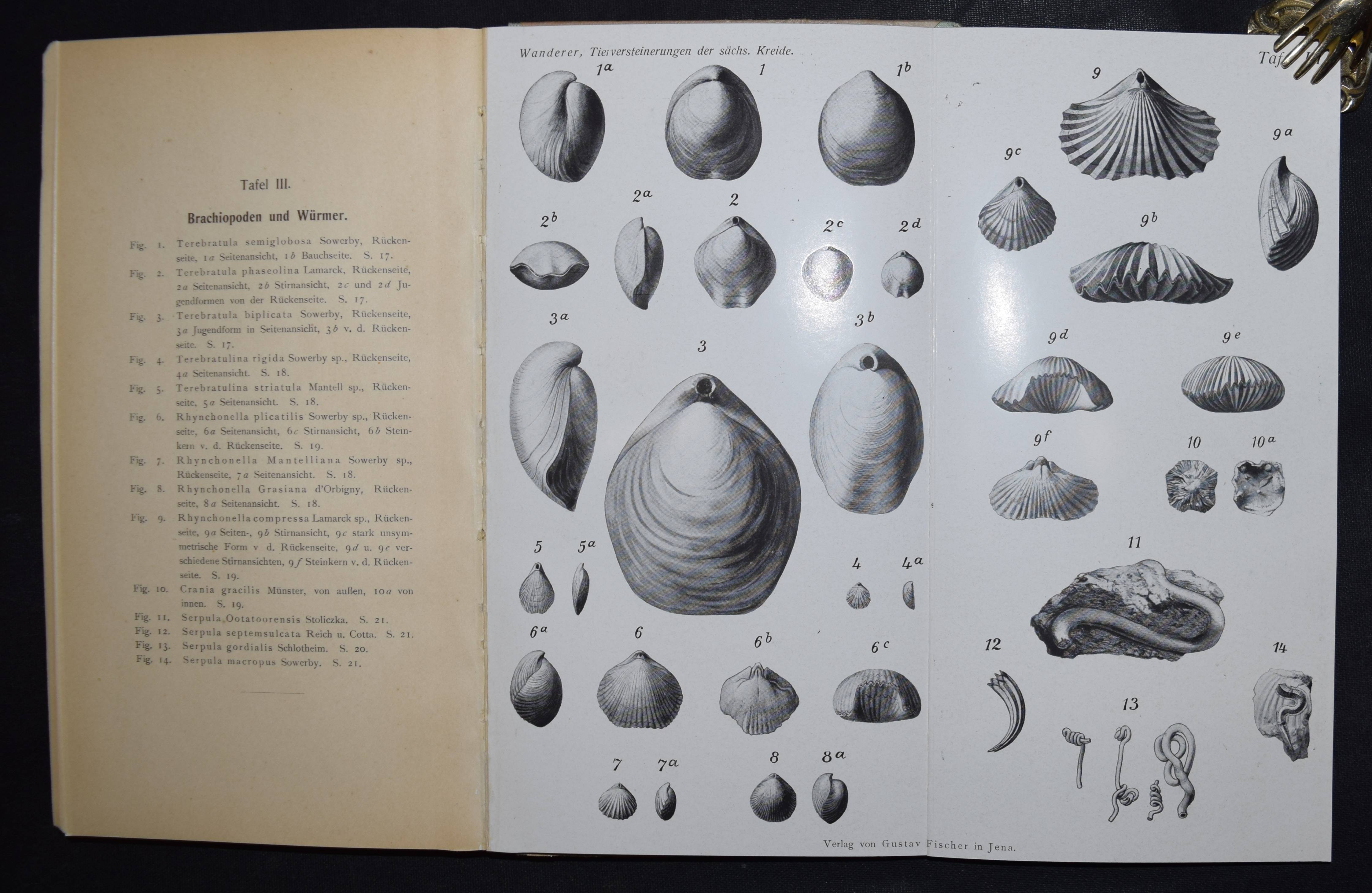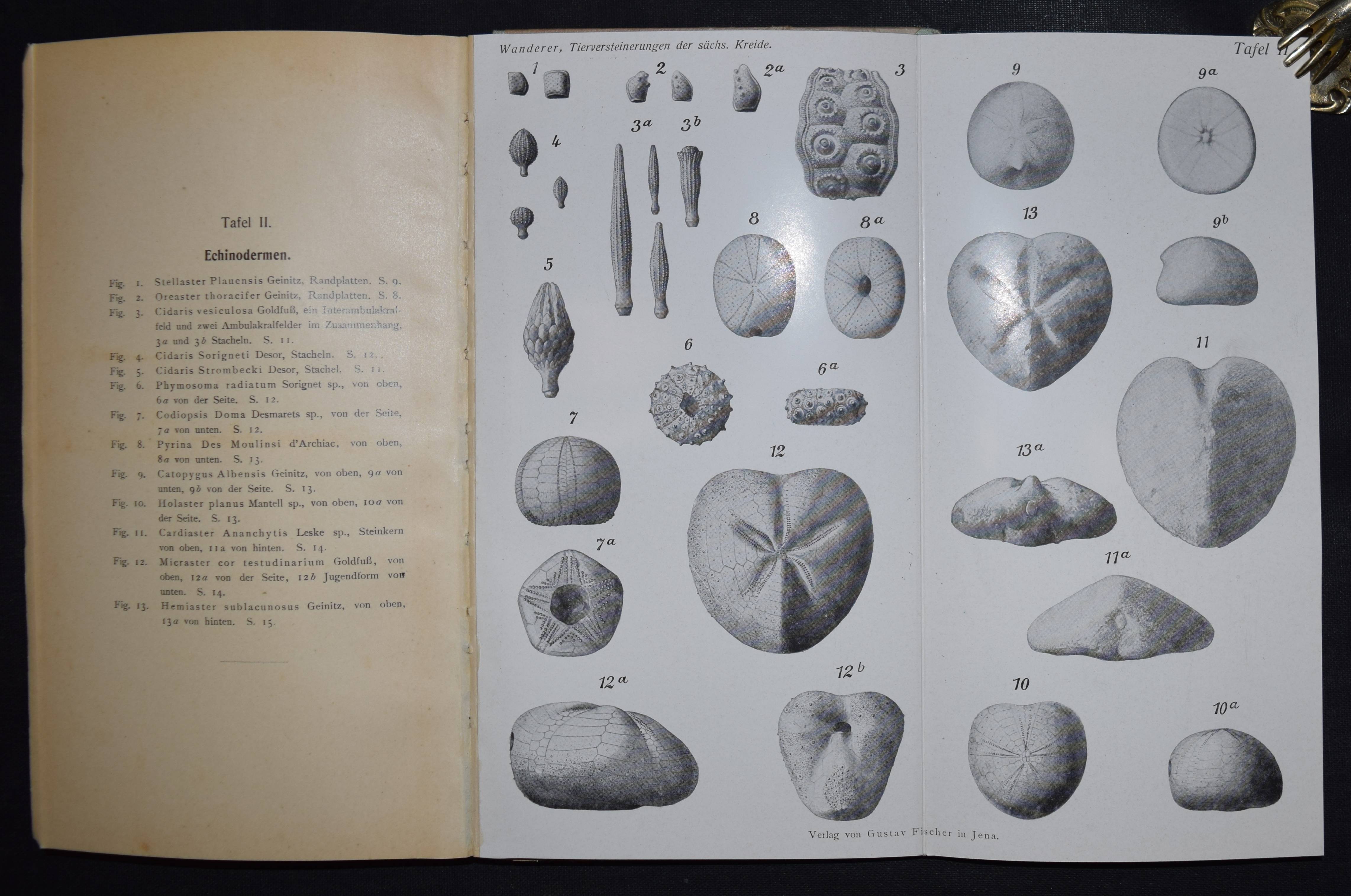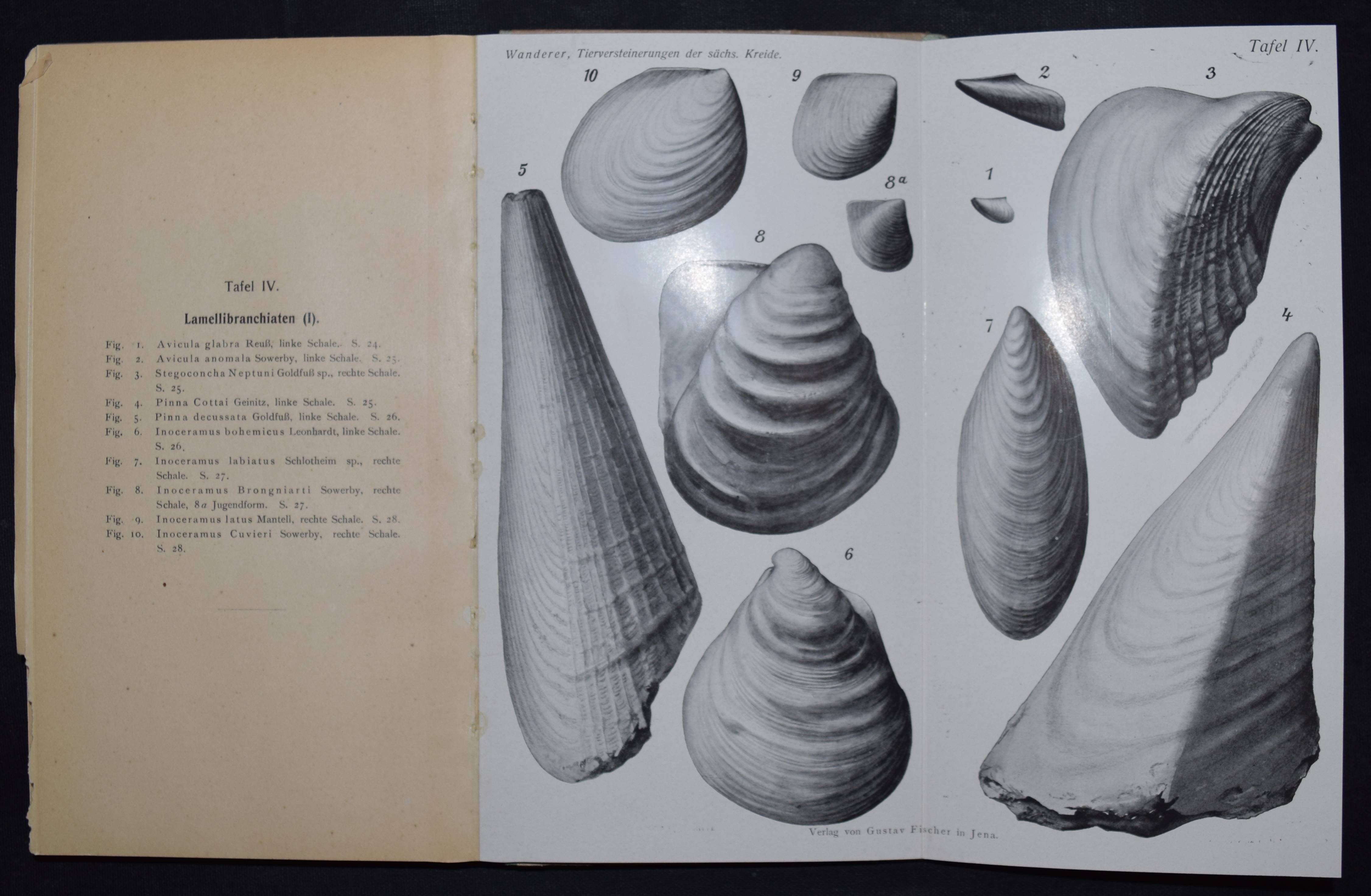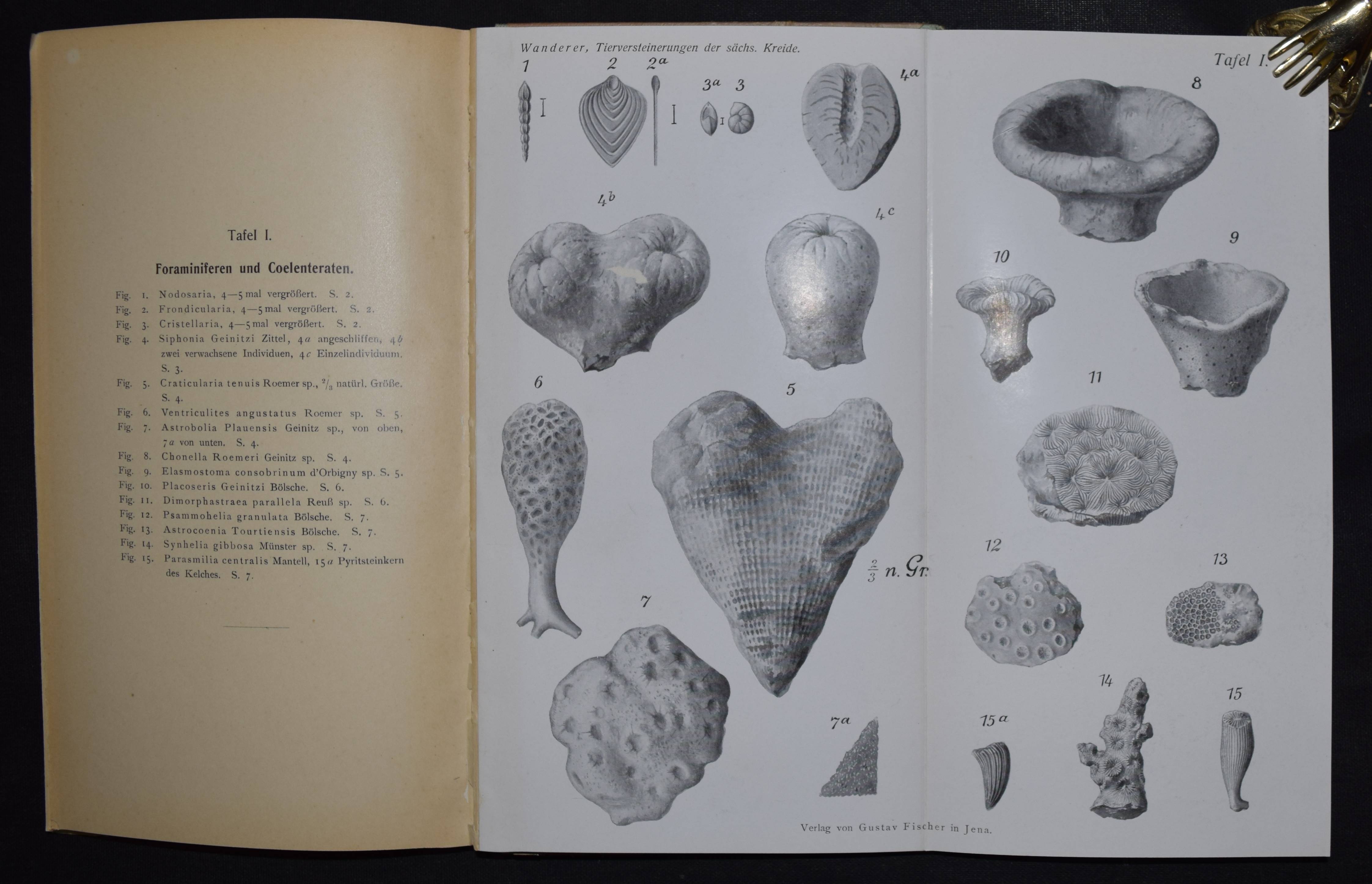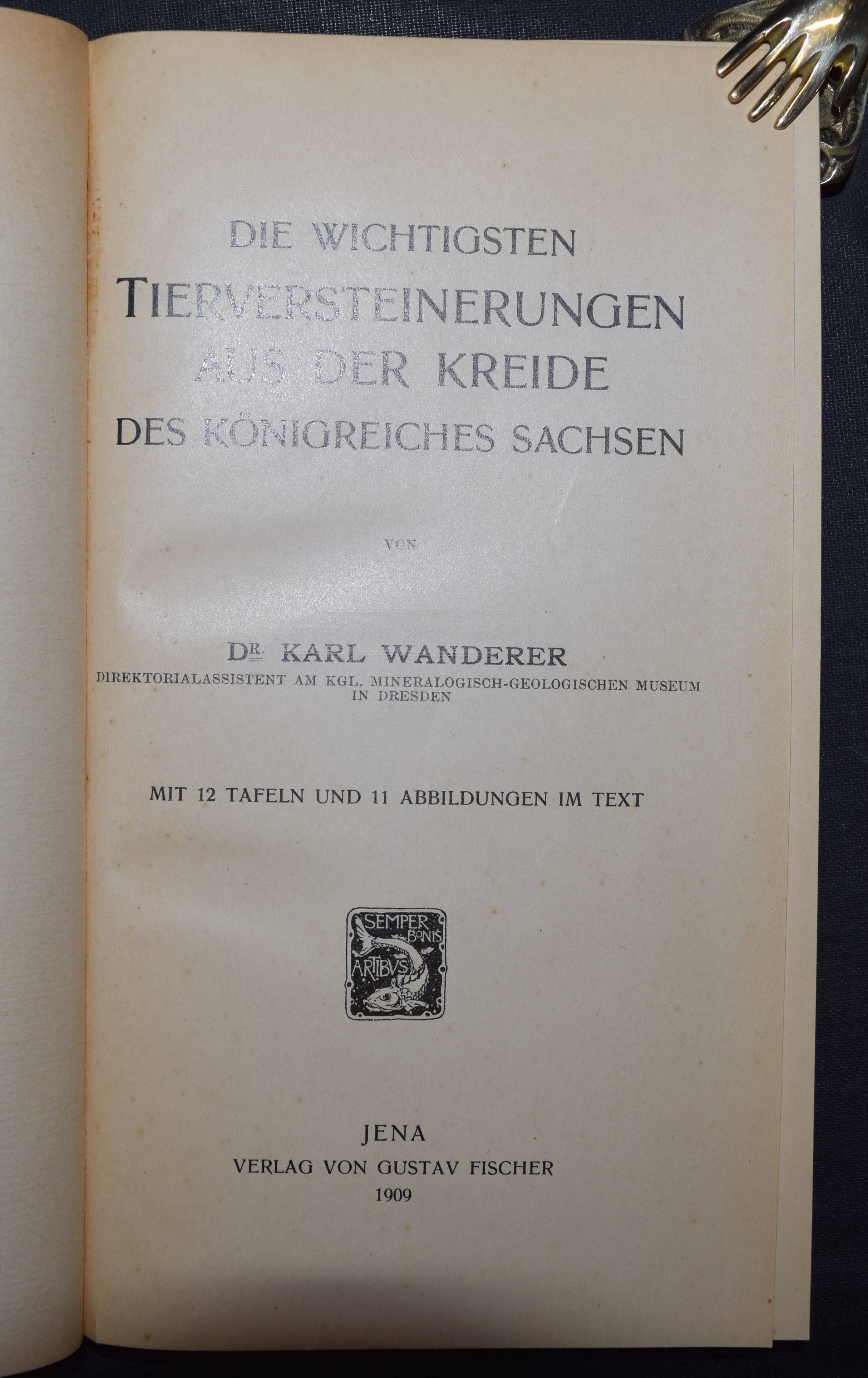 Wanderer, Karl. Die wichtigsten Tierversteinerungen aus der Kreide des Königreiches Sachsen. Jena, Fischer 1909. 8°. XXI, 80 S. mit 12 lithogr. Versteinerungs-Tafeln. OHln. Deckelränder etwas aufgehellt, gutes Exemplar.