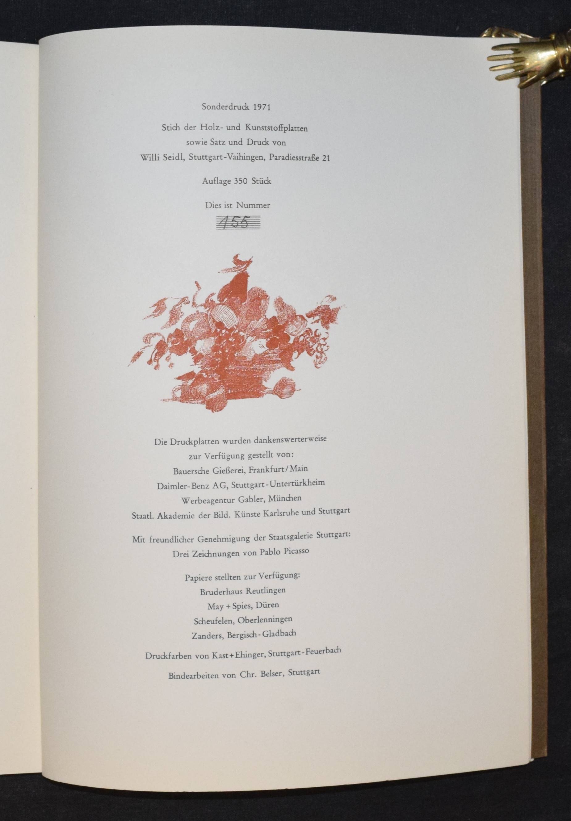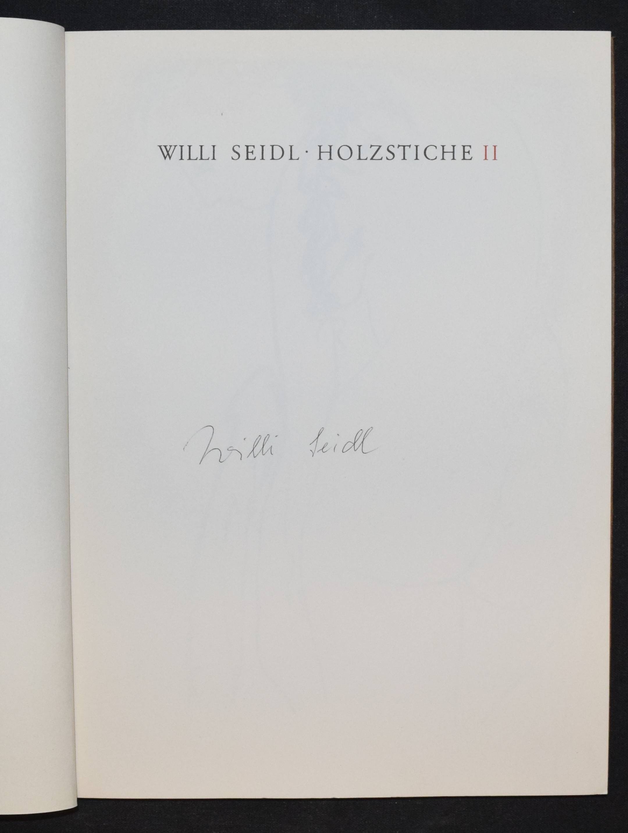 Seidl, Willi. Holzstiche II. (Sonderdruck 1971). Stuttgart, Selbstverlag 1971. 4°. 34 teils farb. Tafeln, 5 Bl. OKart. mit OU. Eines von 350 num. Exemplaren. – Auf dem Titelblatt von Willi Seidl signiert. – Mit Holzstichen nach Arbeiten von Picasso, Käthe Kollwitz, Paul Klee, HAP Grieshaber (4 Farbholzschnitte), H. Klumbies u.v.a. – Tadellos.