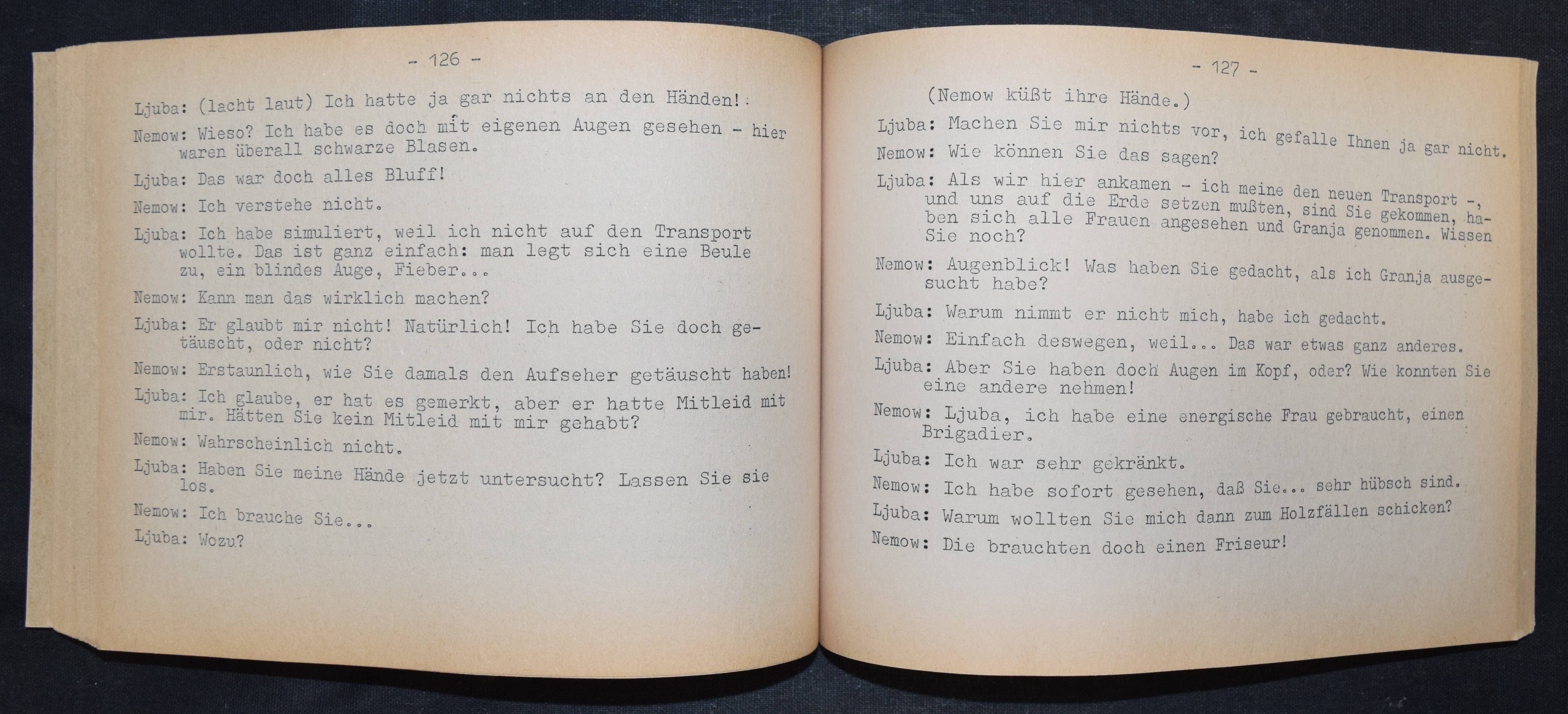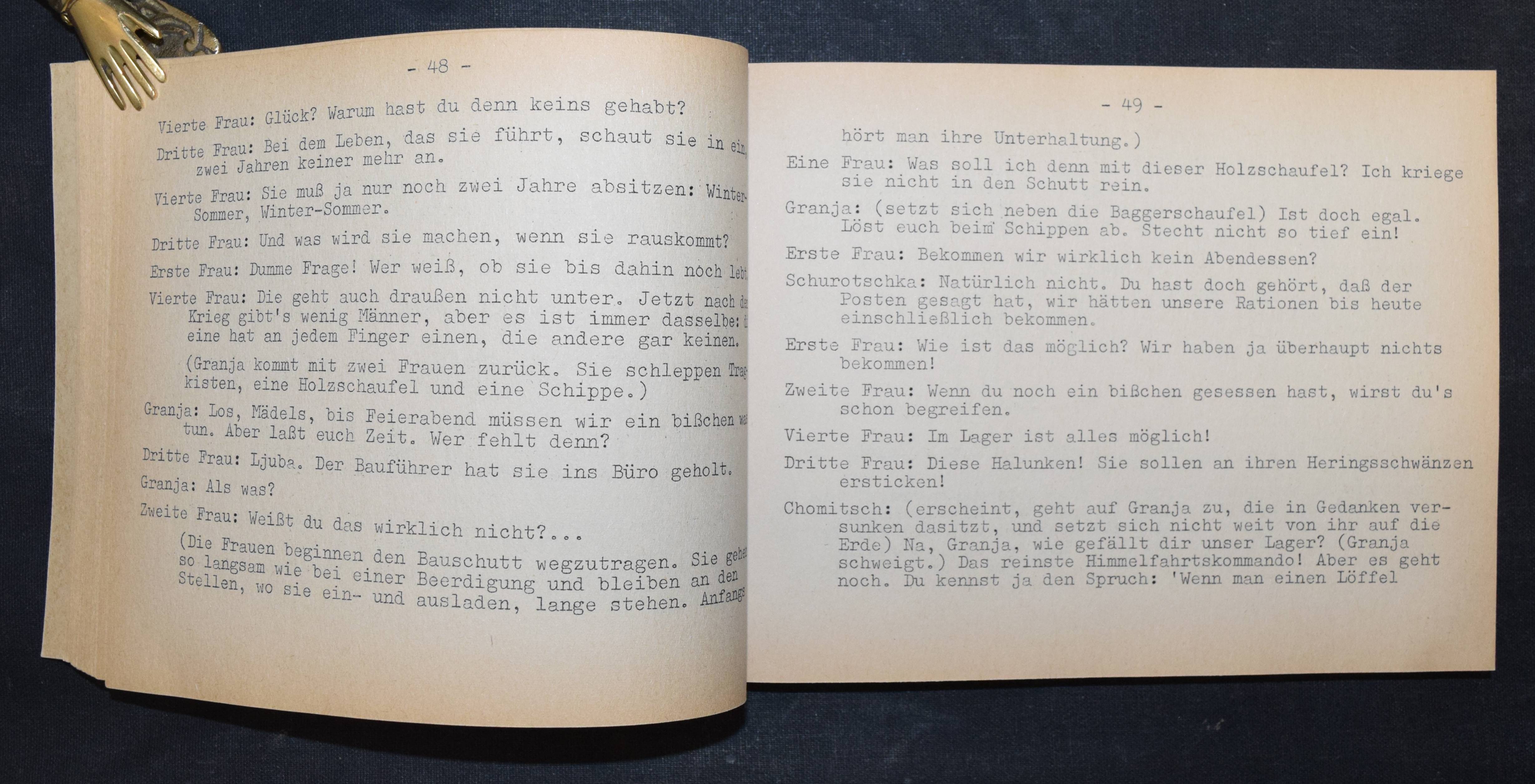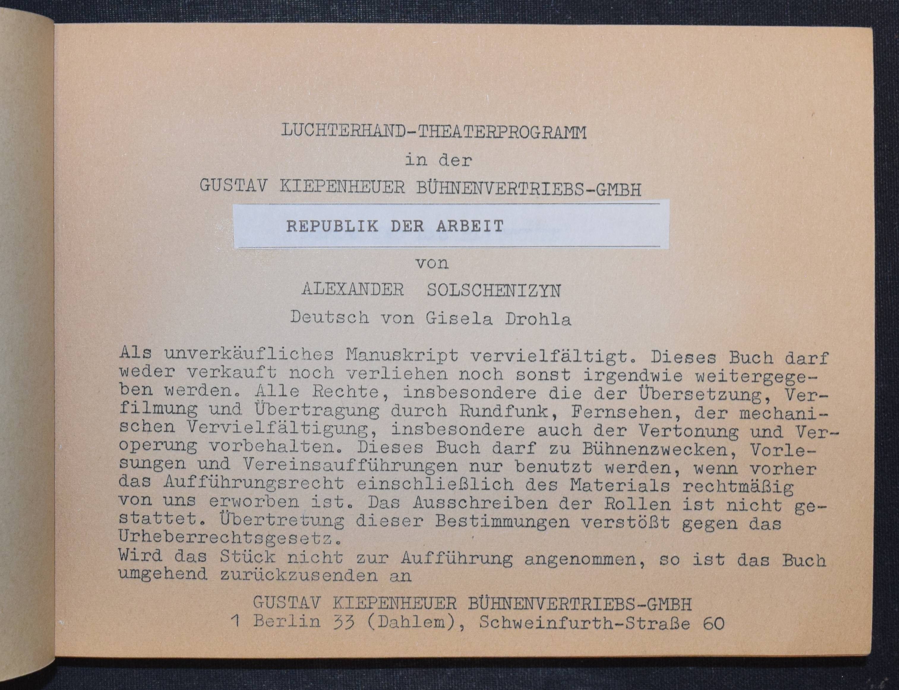 Solschenizyn (Solézenizyn), Aleksandr Isaeviéc. Republik der Arbeit (Olen’ i šalašovka). Deutsch von Gisela Drohla. Berlin, Kiepenheuer o. J. (1975). Quer-8°. 192 S. OKart. mit Leinenrücken. (Luchterhand Theaterprogramm). Sehr seltene erste deutsche Ausgabe als vervielfältigtes unverkäufliches Bühnenmanuskript. Die deutsche Uraufführung des Stücks war an den Städtischen Bühnen in Essen unter der Intendanz von Jürgen Dieter Waidelich. – Papierbedingt etwas gebräunt, sonst sehr gut erhalten.