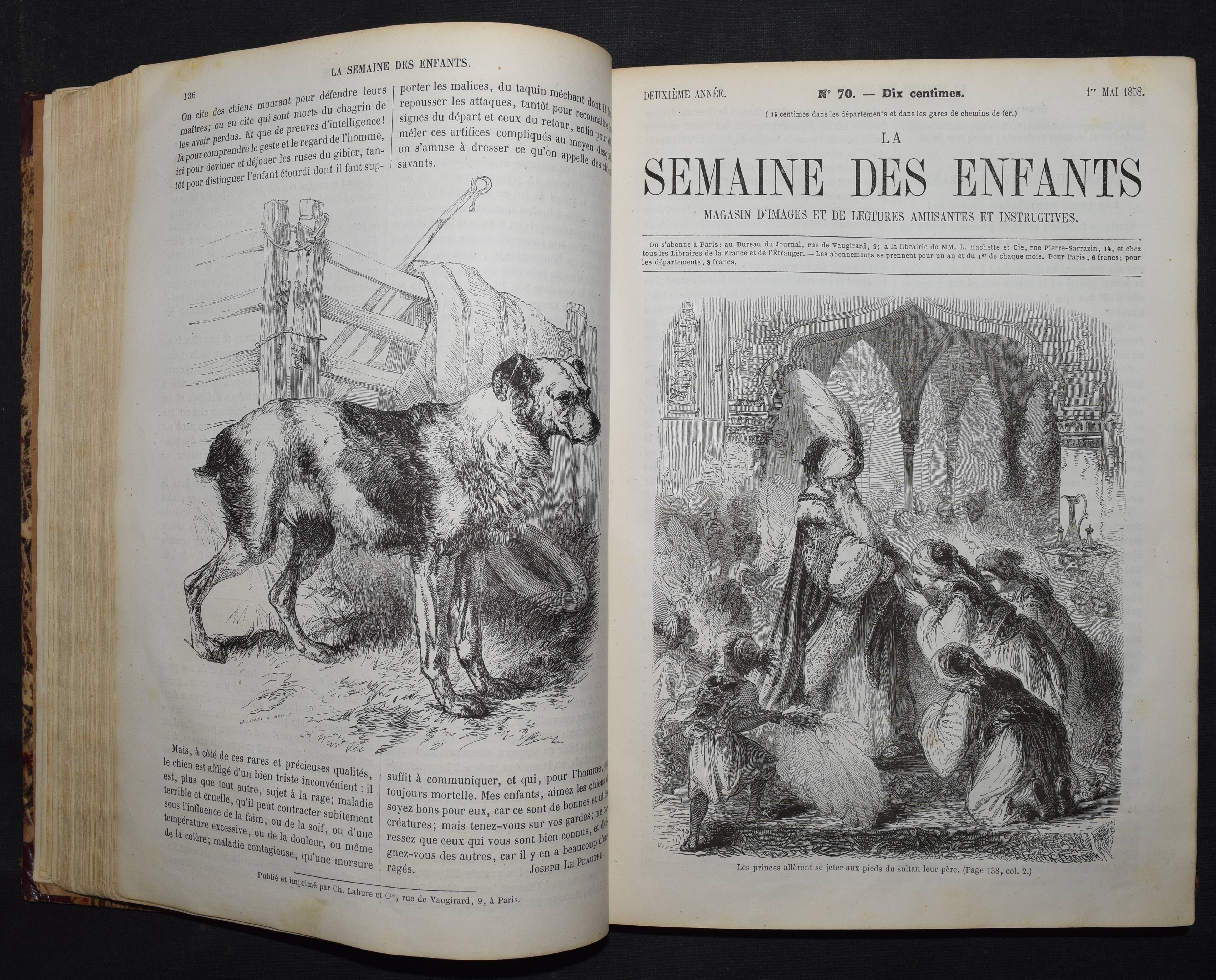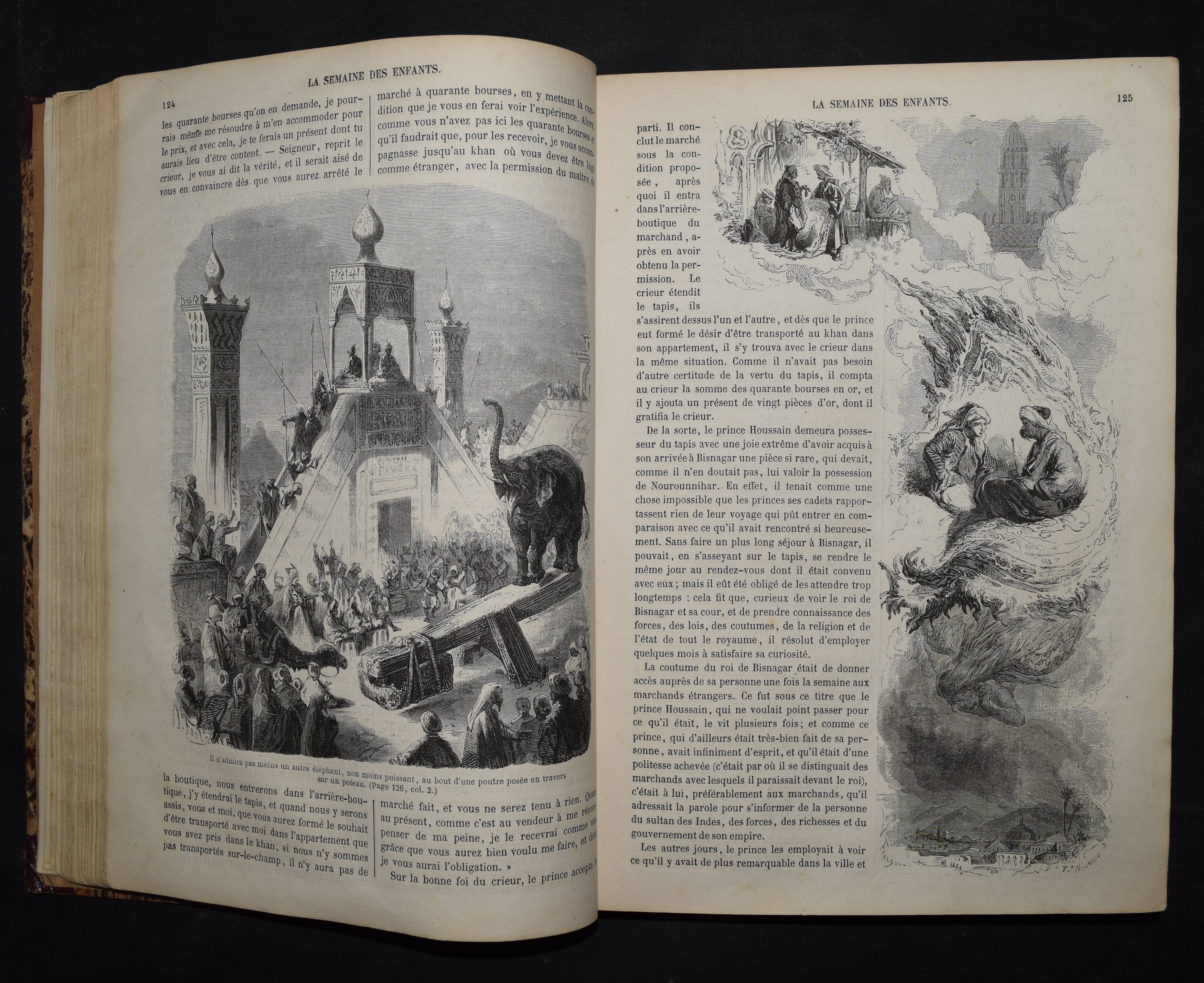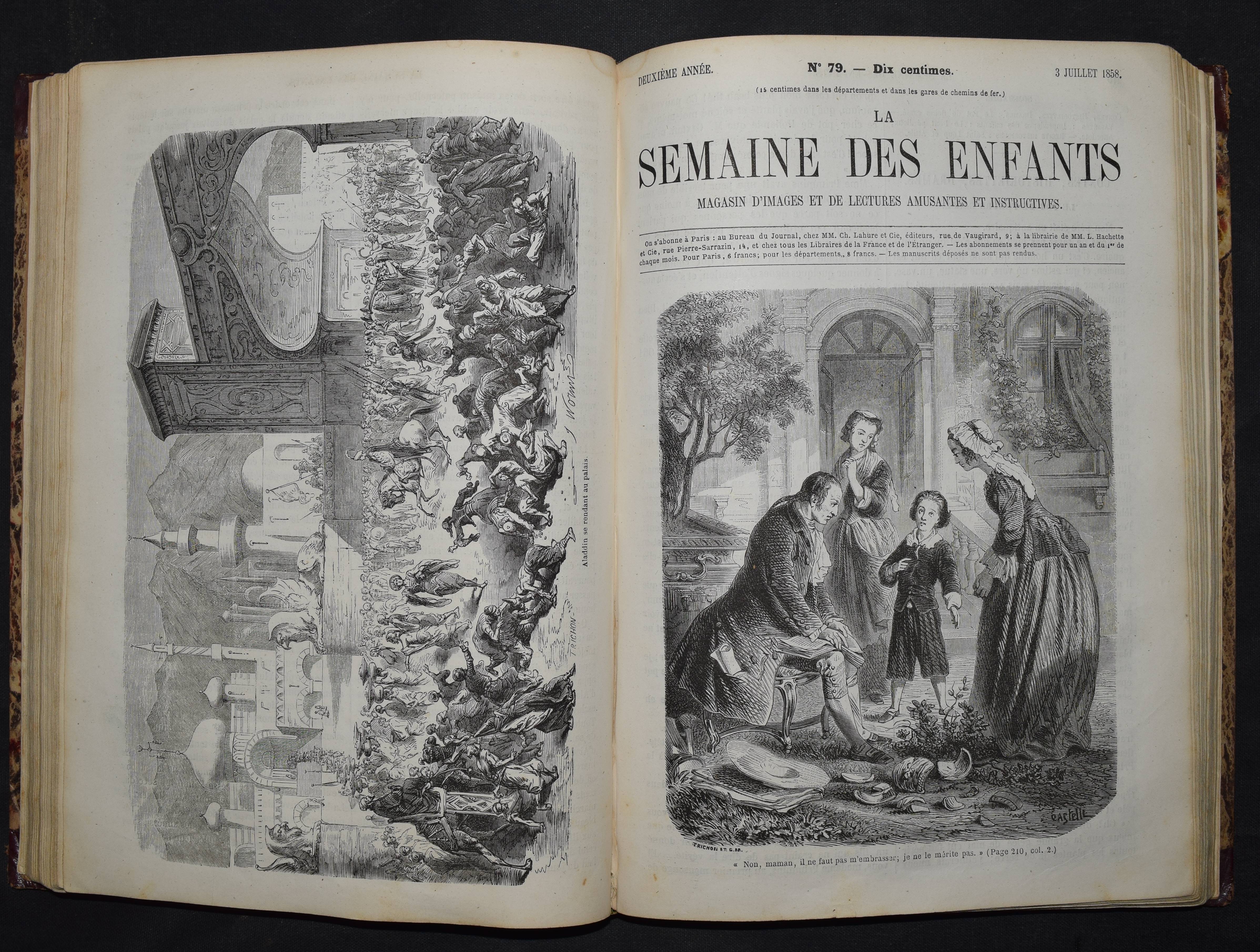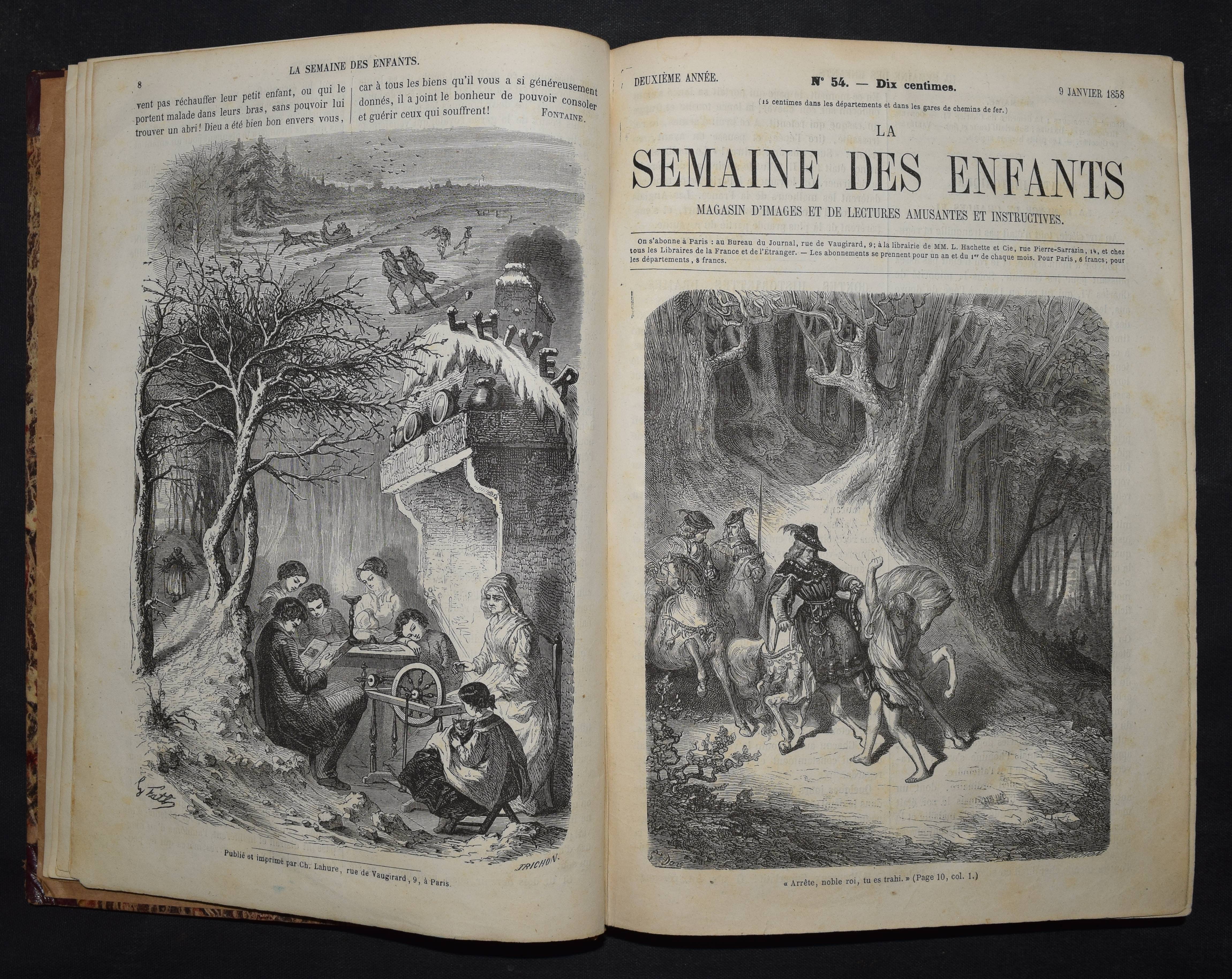 La semaine des enfants (2. Janvier 1858 – 25. Decembre 1858). Magasin d’images et de lectures amusantes et instructives. Paris, Ch. Lahure 1858. 4° 416 S. mit zahlr. Abb. Hldr. der Zeit mit goldgepr. Rückentitel und Romantikervergoldung Rücken und Ecken leicht berieben, schönes dekorativ gebundenes Exemplar.