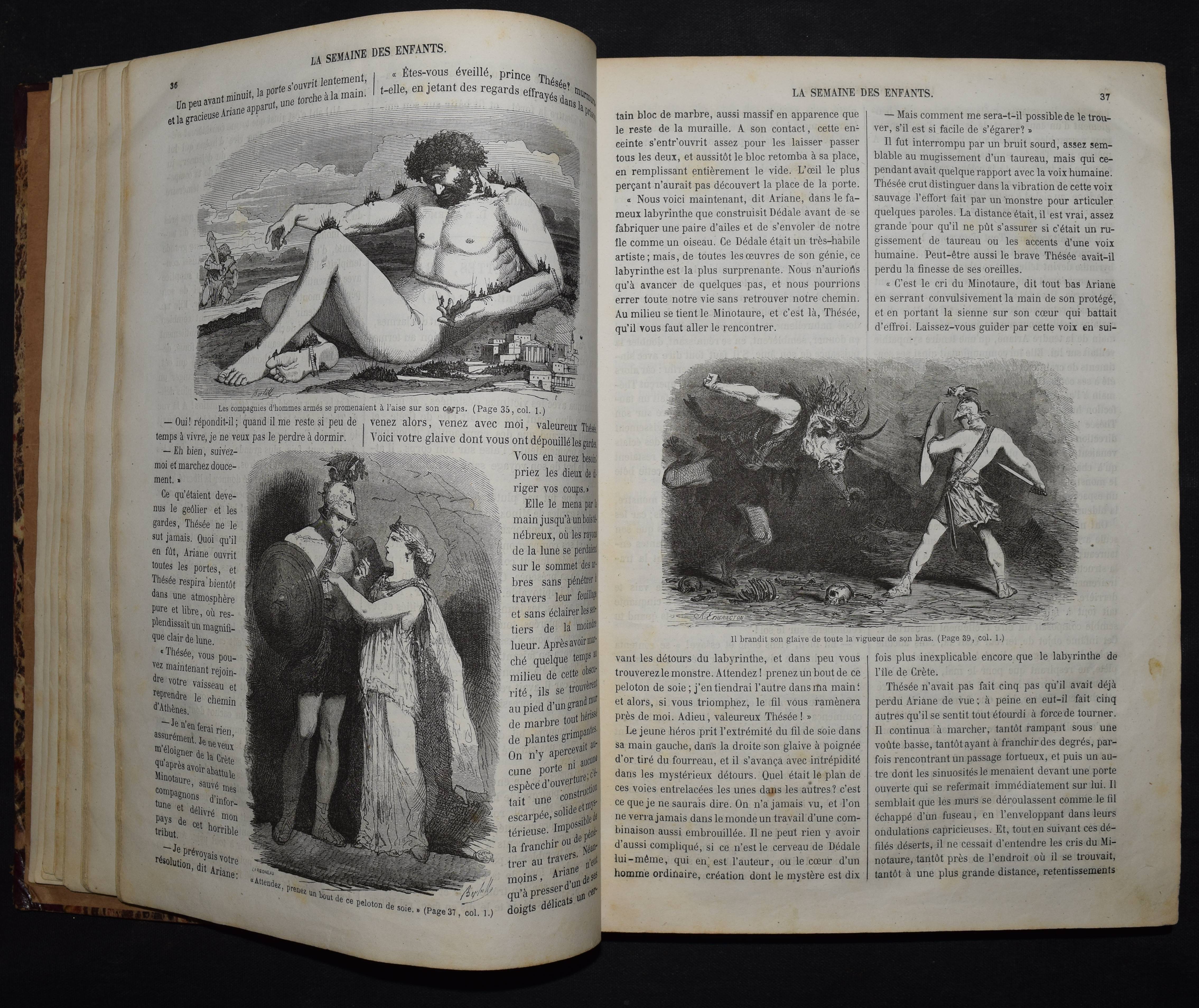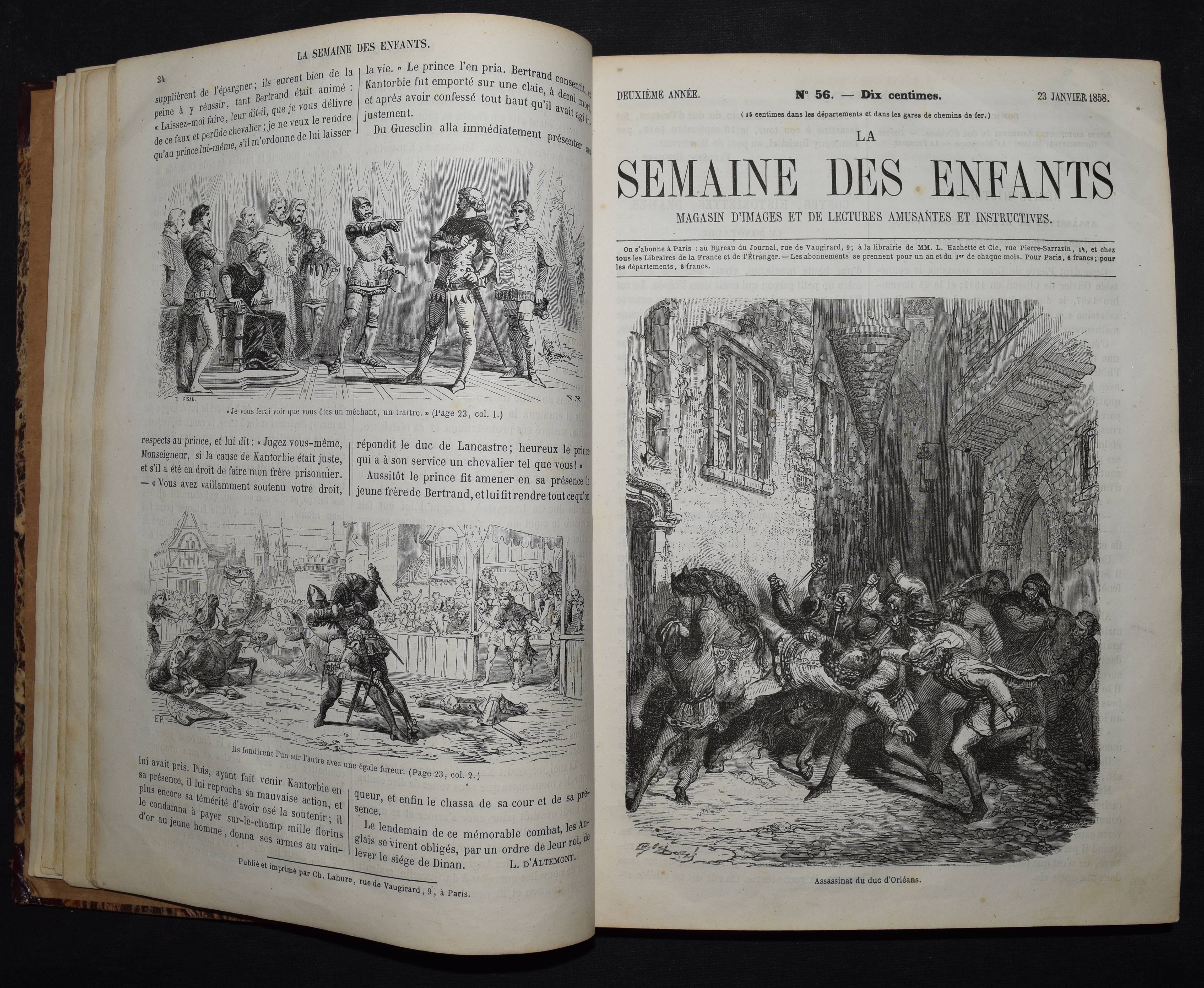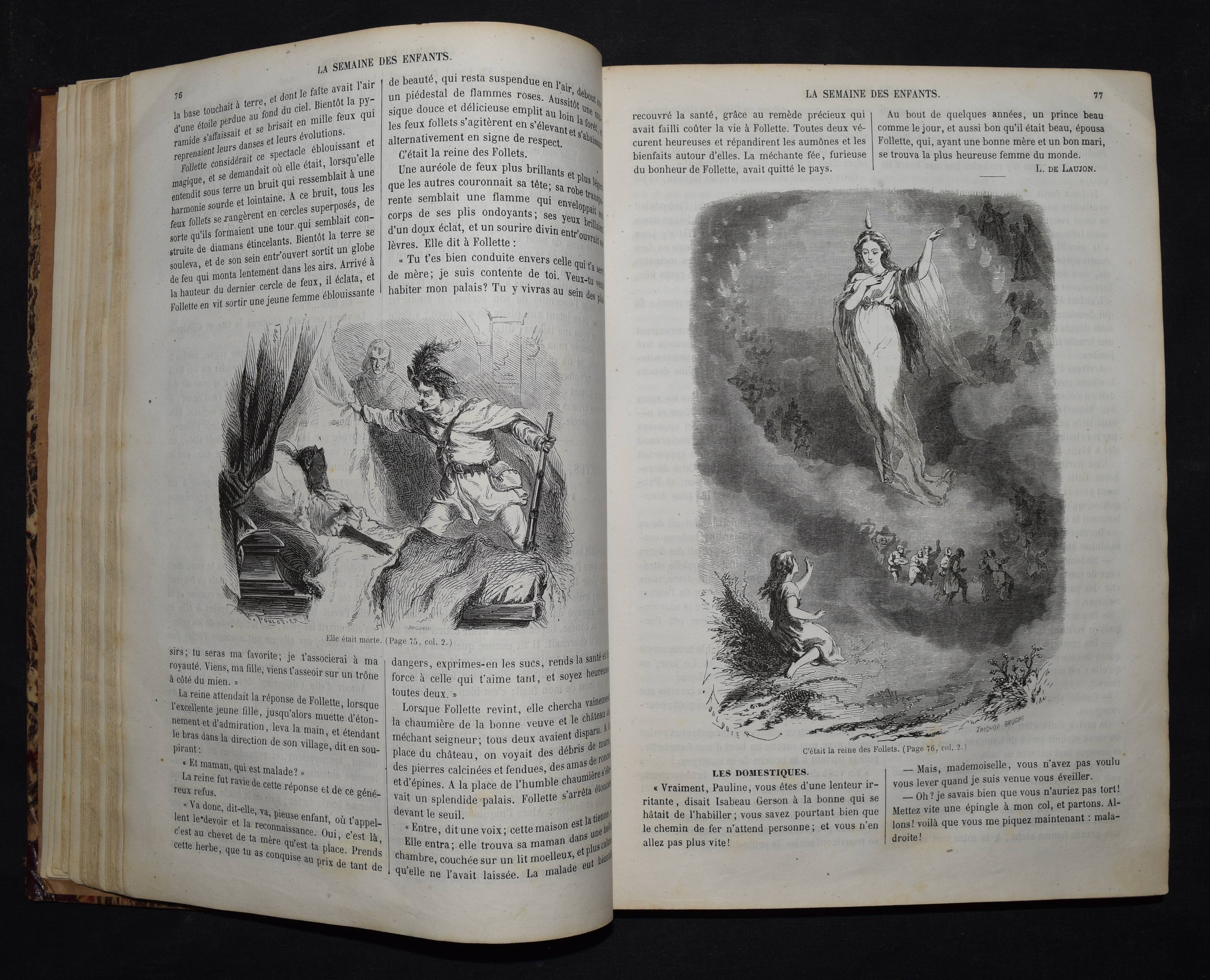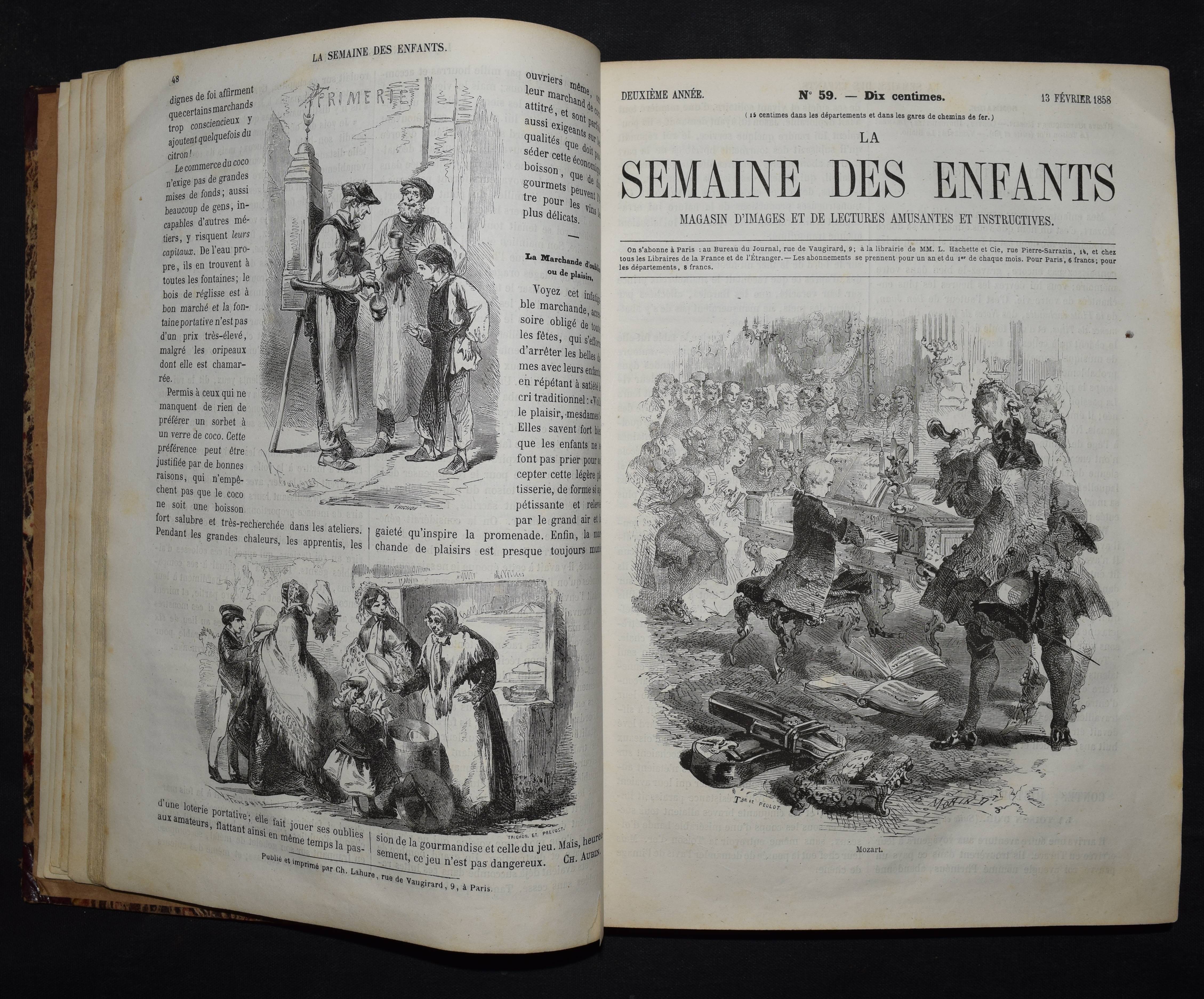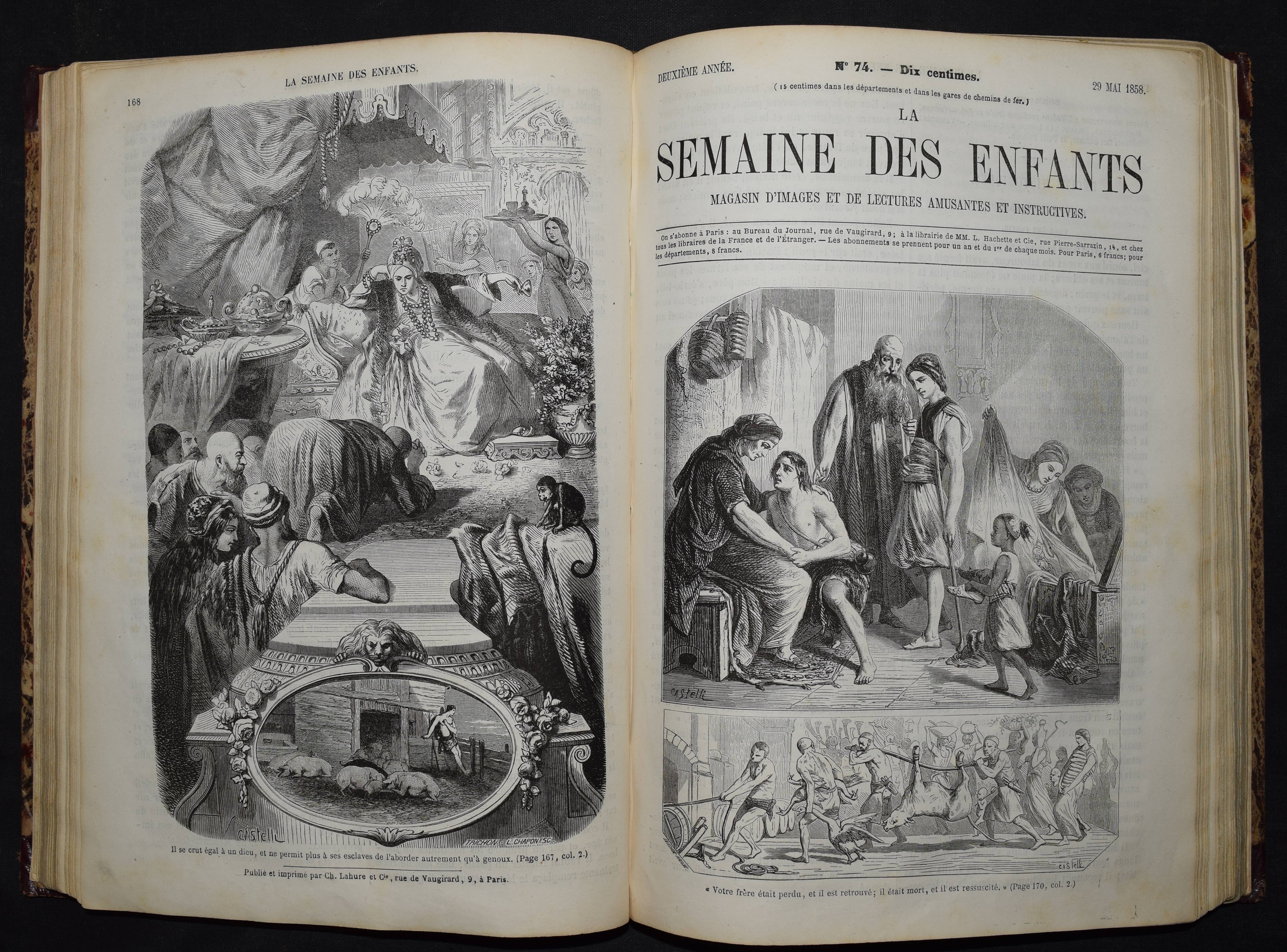 La semaine des enfants (2. Janvier 1858 – 25. Decembre 1858). Magasin d’images et de lectures amusantes et instructives. Paris, Ch. Lahure 1858. 4° 416 S. mit zahlr. Abb. Hldr. der Zeit mit goldgepr. Rückentitel und Romantikervergoldung Rücken und Ecken leicht berieben, schönes dekorativ gebundenes Exemplar.