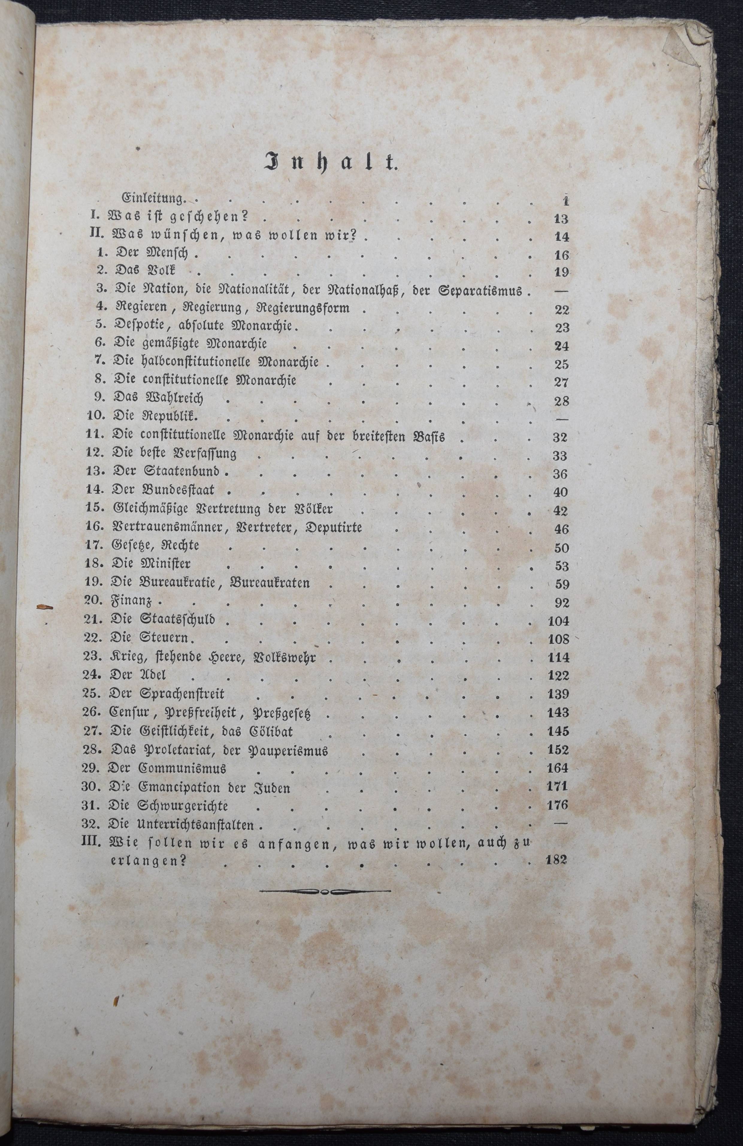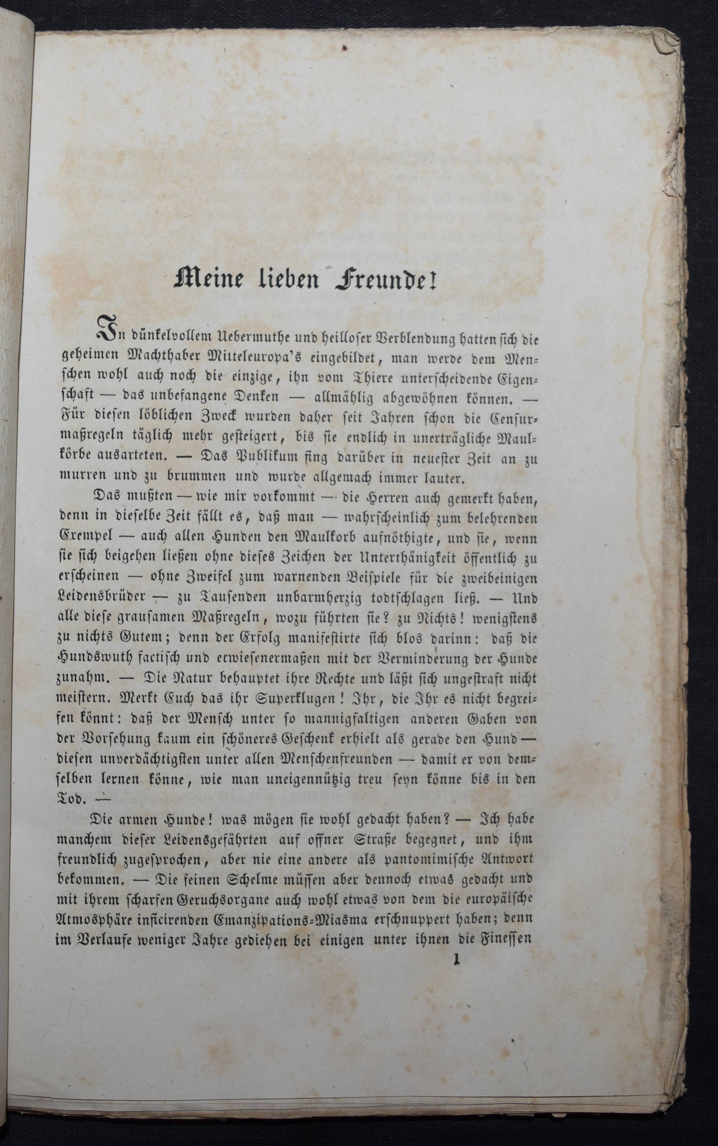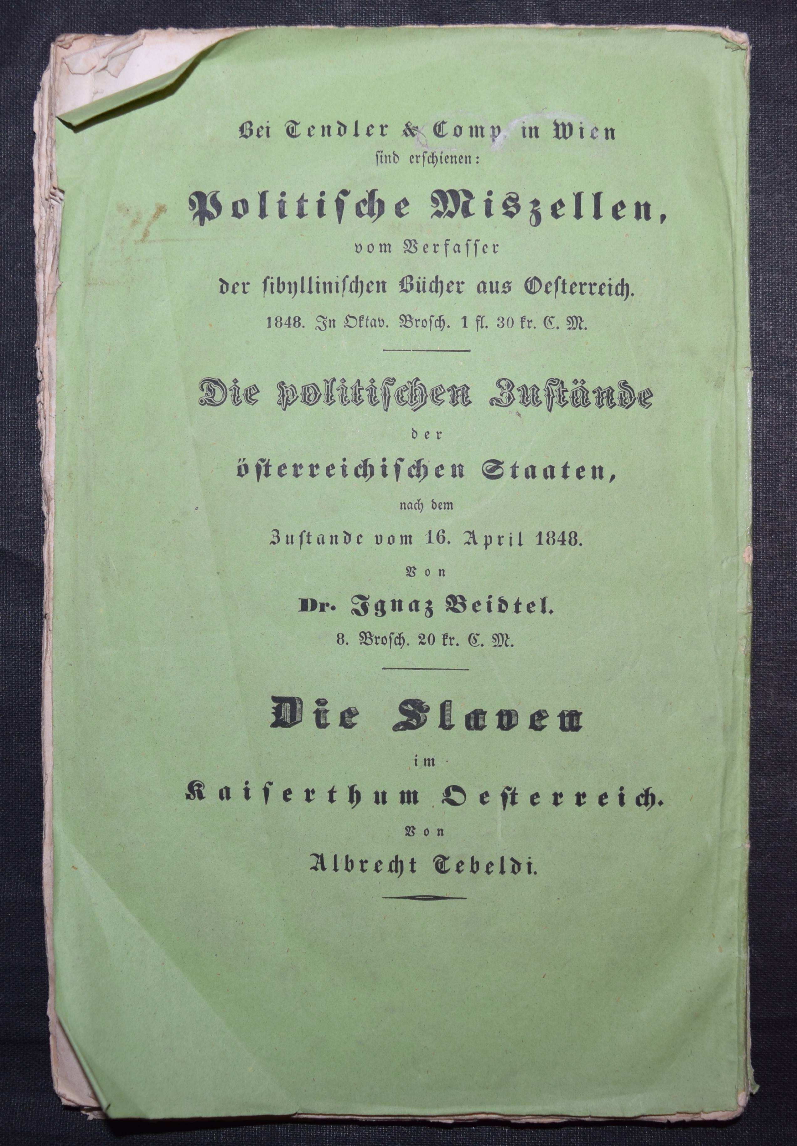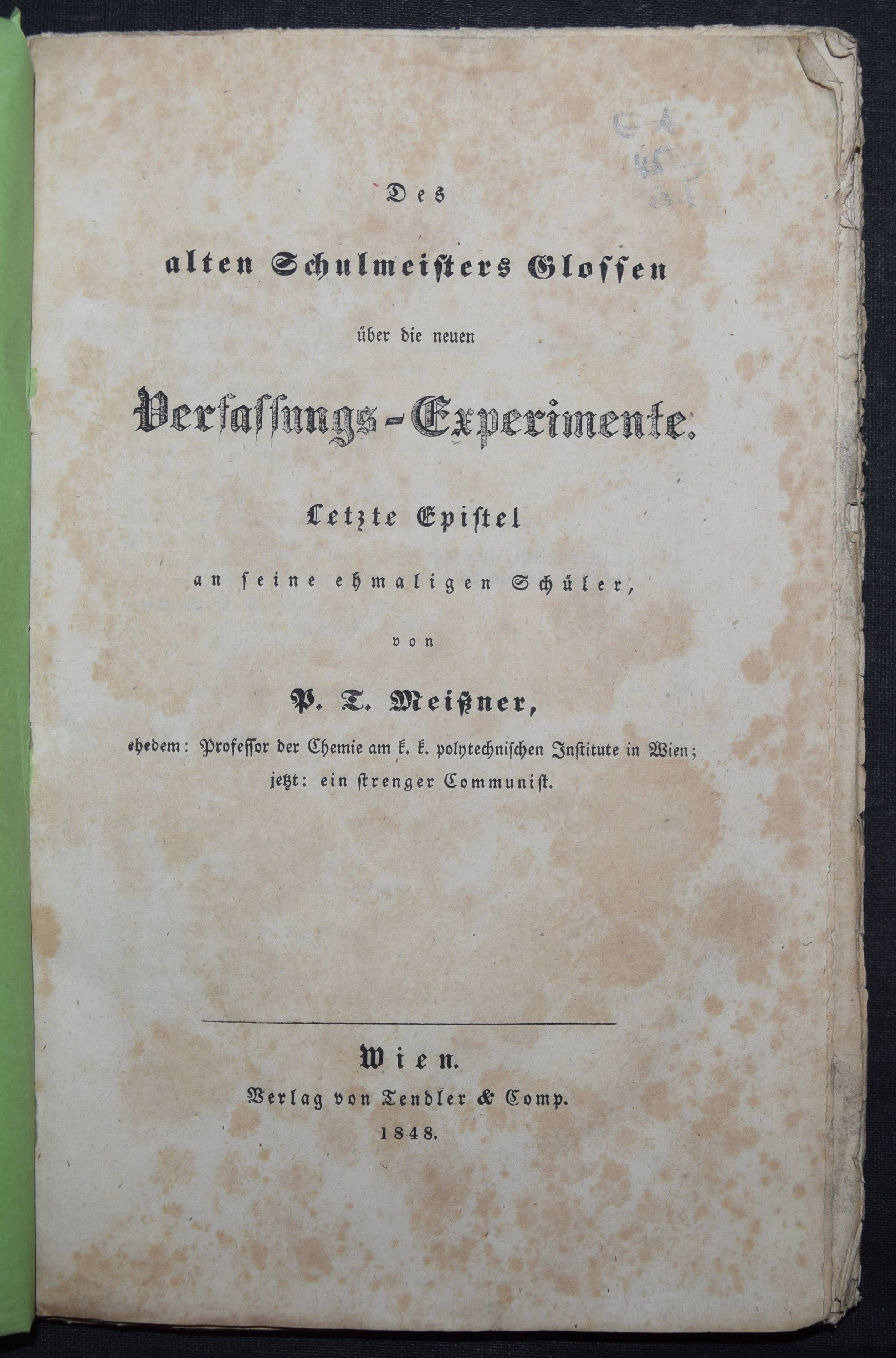 Meissner, P(aul) T(raugott). Des alten Schulmeisters Glossen über die neuen Verfassungs-Experimente. Letzte Epistel an seine ehemaligen Schüler. Wien, Tendler 1848. 183 S. OBr. Umschlag fleckig, angestaubt und mit Randläsuren, Rücken gebrochen, stellenw. stärker stockfleckig.