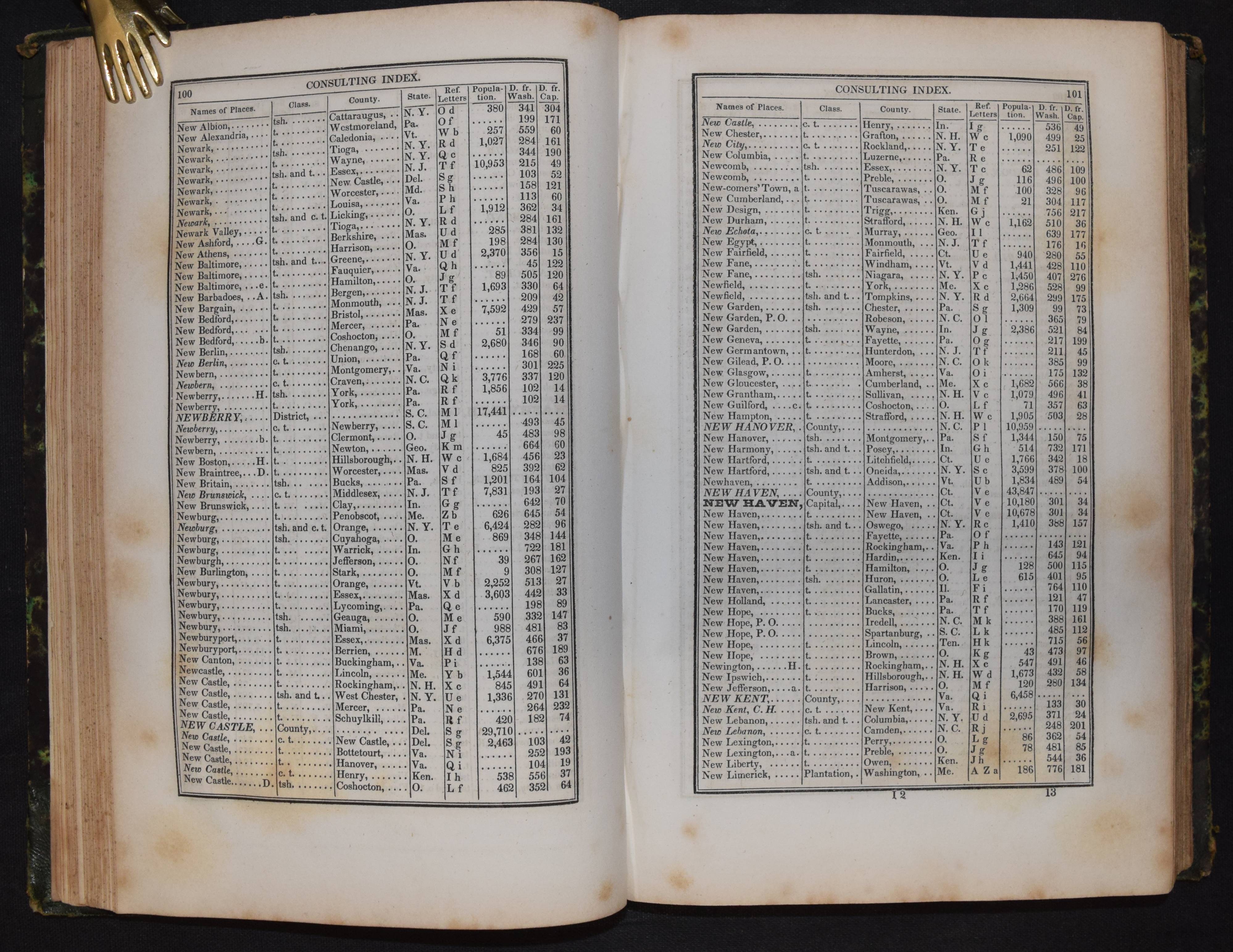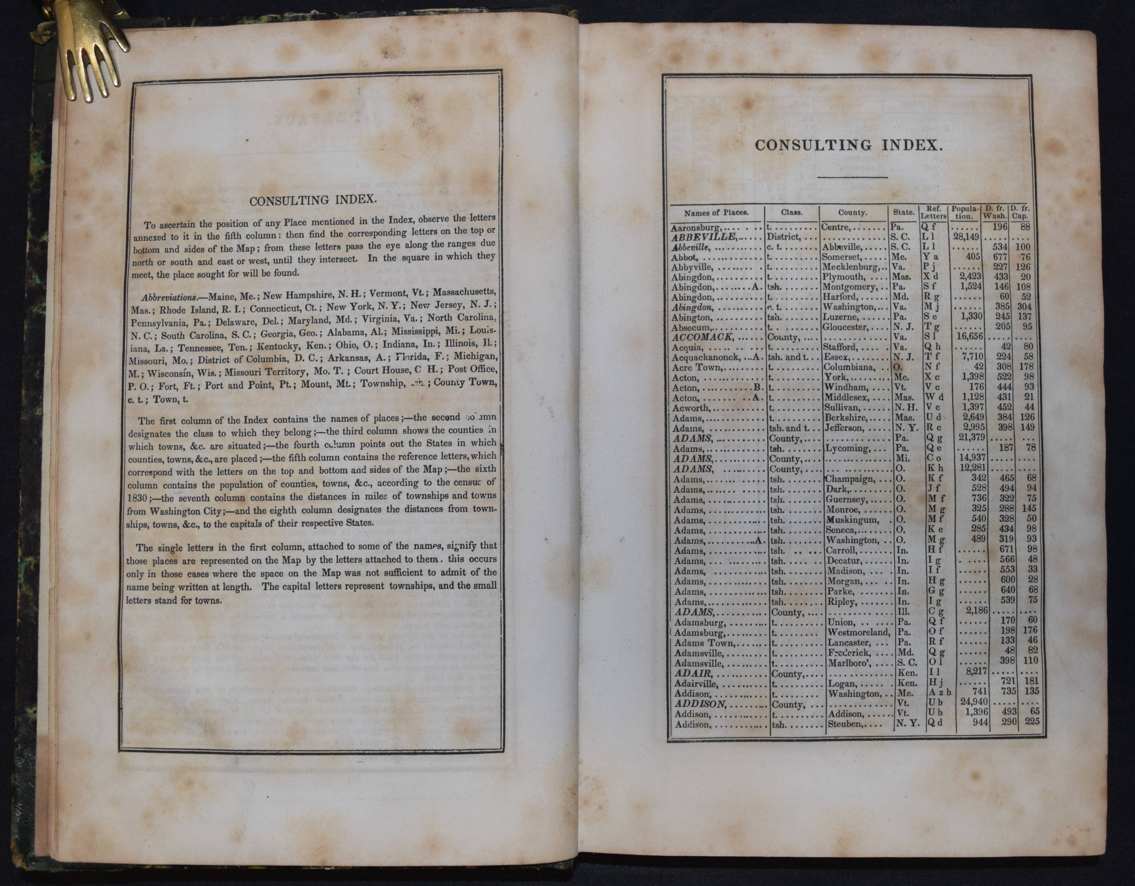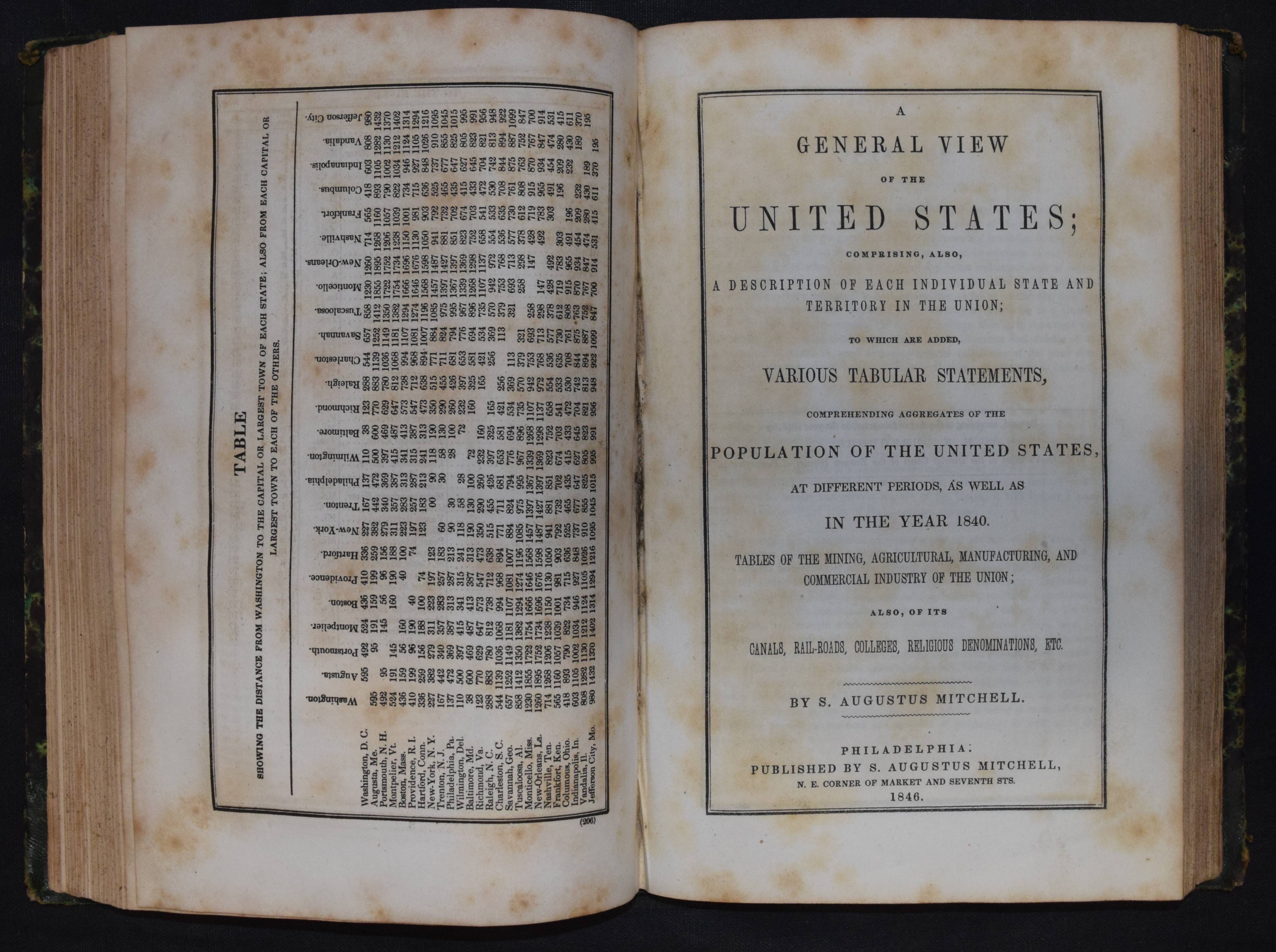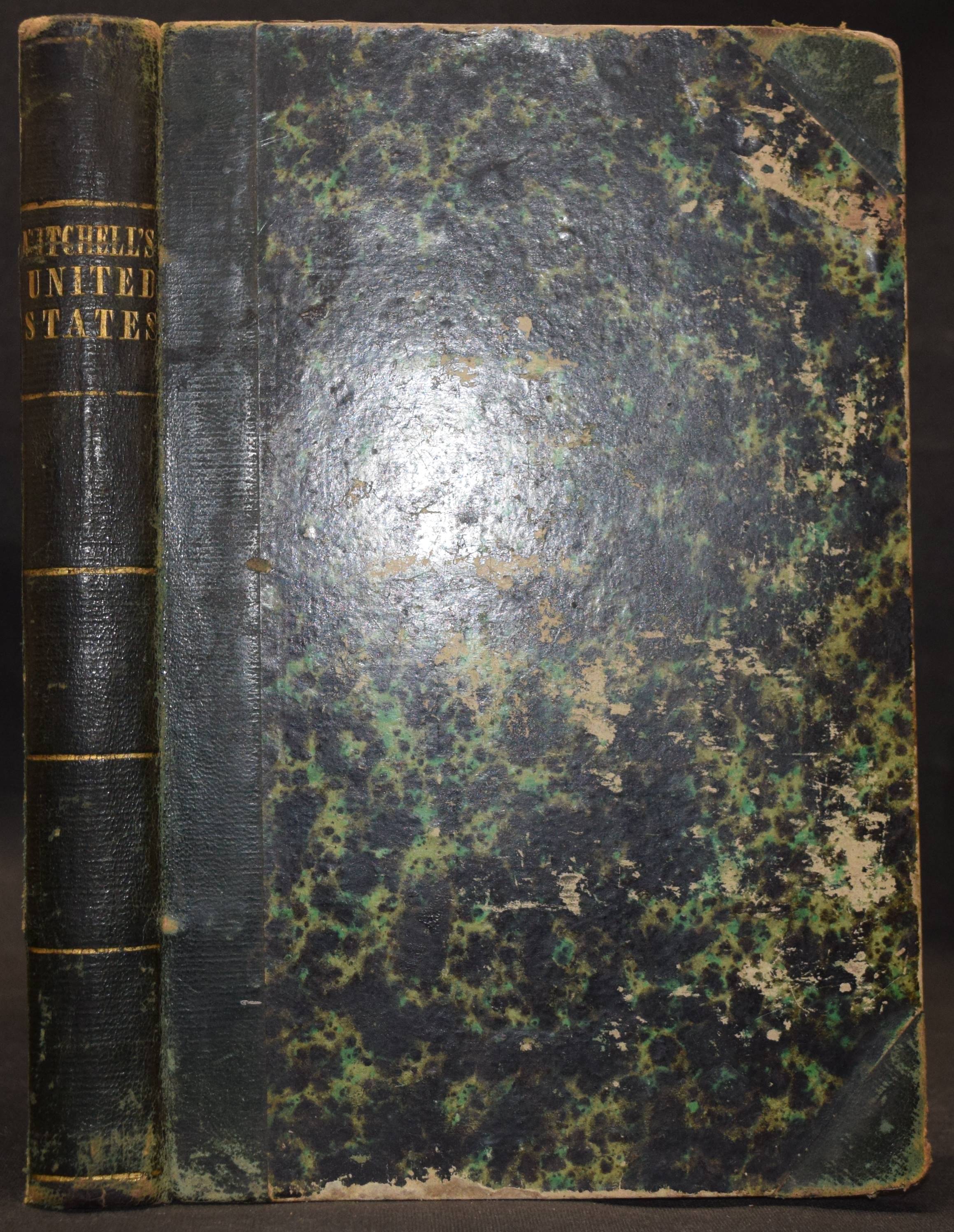 Mitchell, Samuel Augustus. An accompaniment to Mitchell’s reference and distance map of the United States. Containing an index of the various counties, districts, parishes, townships, towns, etc. and an index of the rivers : together with a geographical description of every state and territory in the Union. – Bound with: All Editions of A General View of the United States: Comprising, Also, a Description of Each Individual State and Territory in the Union; To Which Are Added, Various Tabular Statements, Comprehending Aggregates of the Population of the United States, at Different Periods, as… 2 Teile in 1 Band. Philadelphia, S.A. Mitchel 1846-1848. 8°. 203, (1) S.; 128 S. Halbleder der Zeit mit goldgepr. Rückentitel u. Linienverg. Einband berieben und etwas bestoßen, durchgehend stockfleckig, gutes Exemplar.