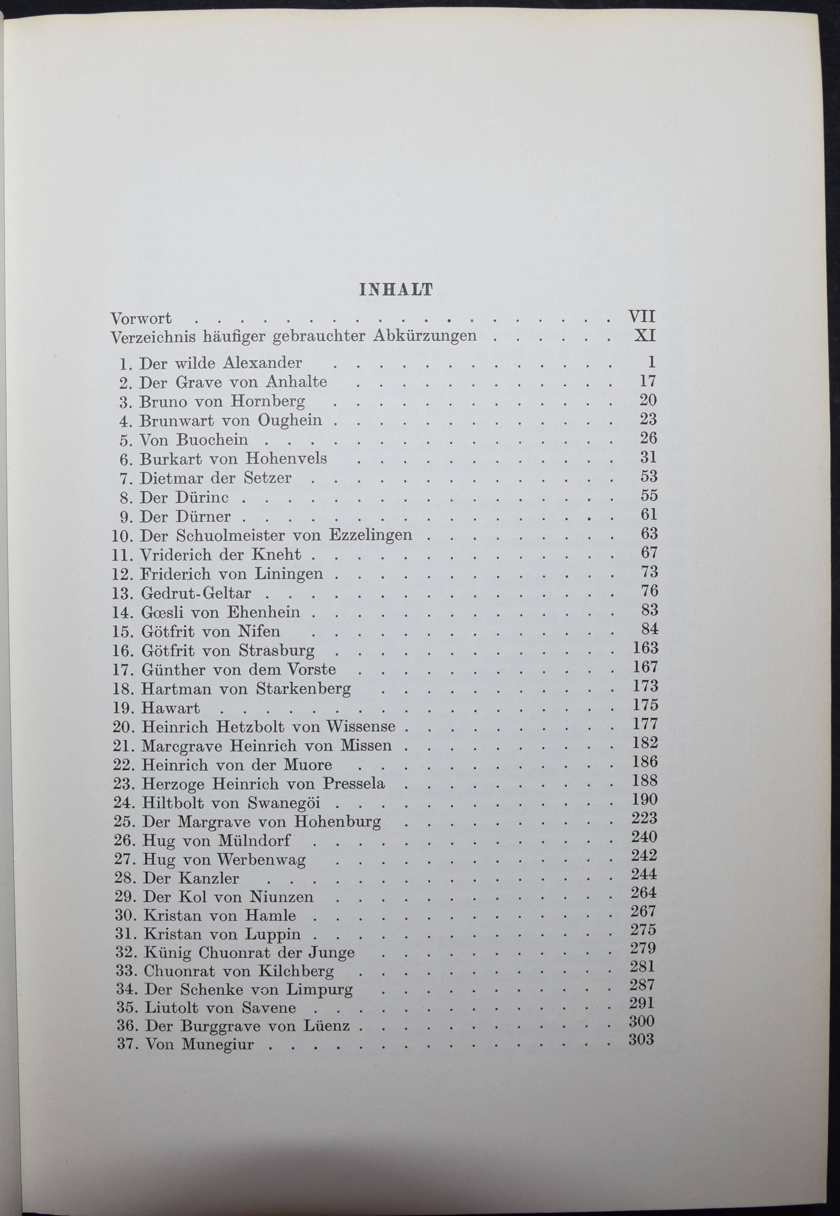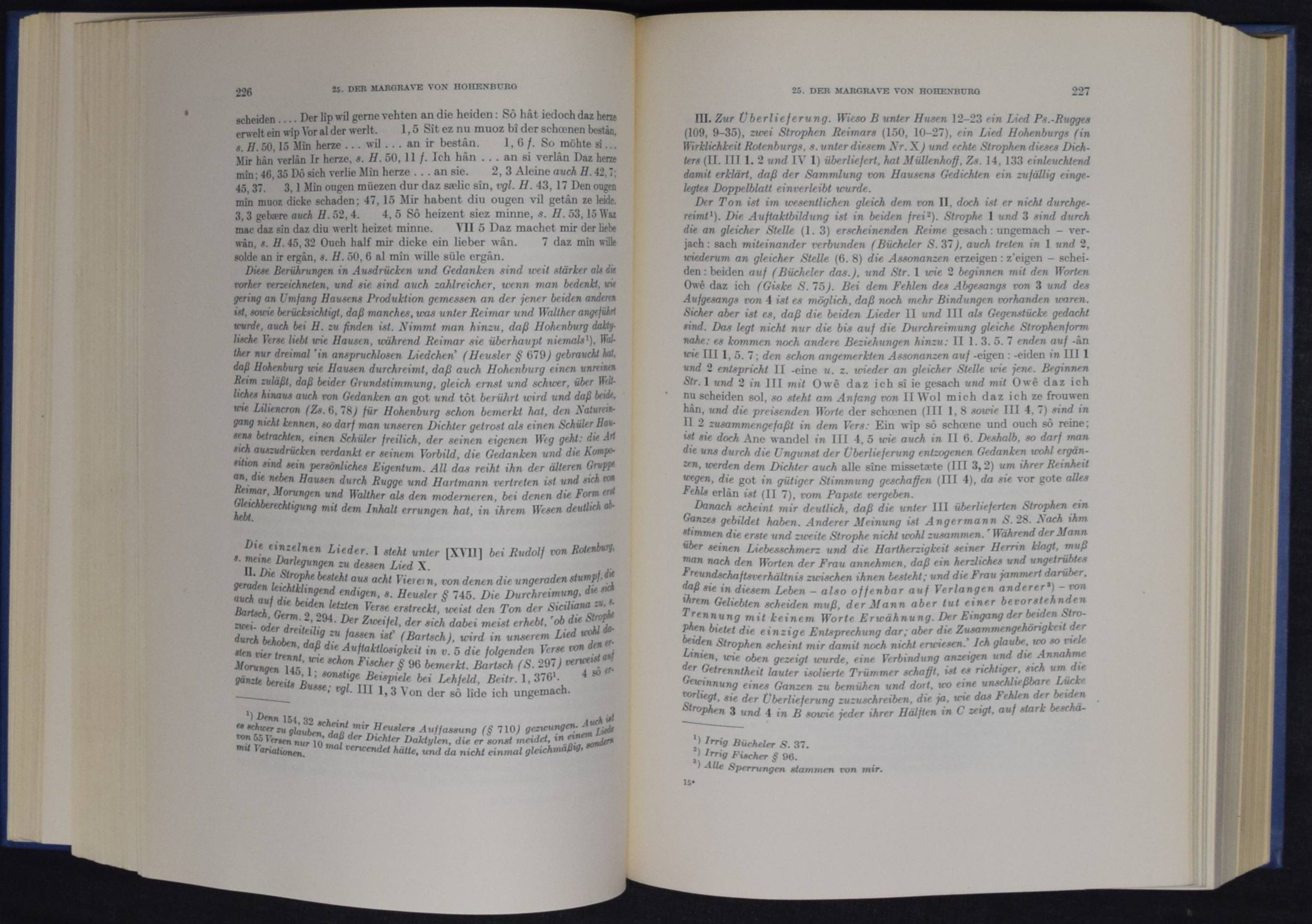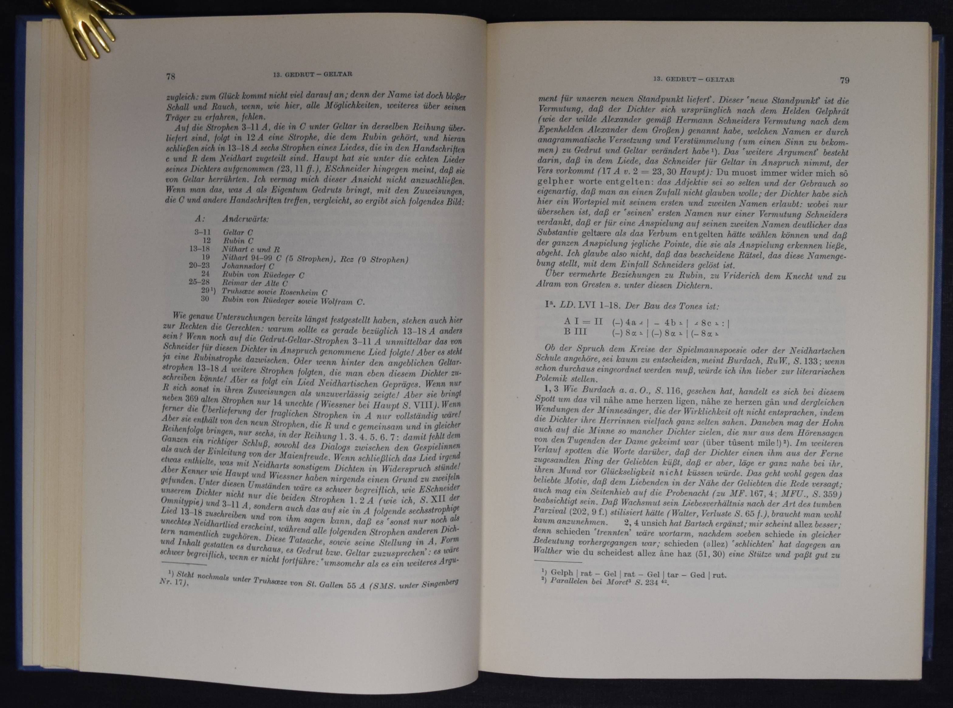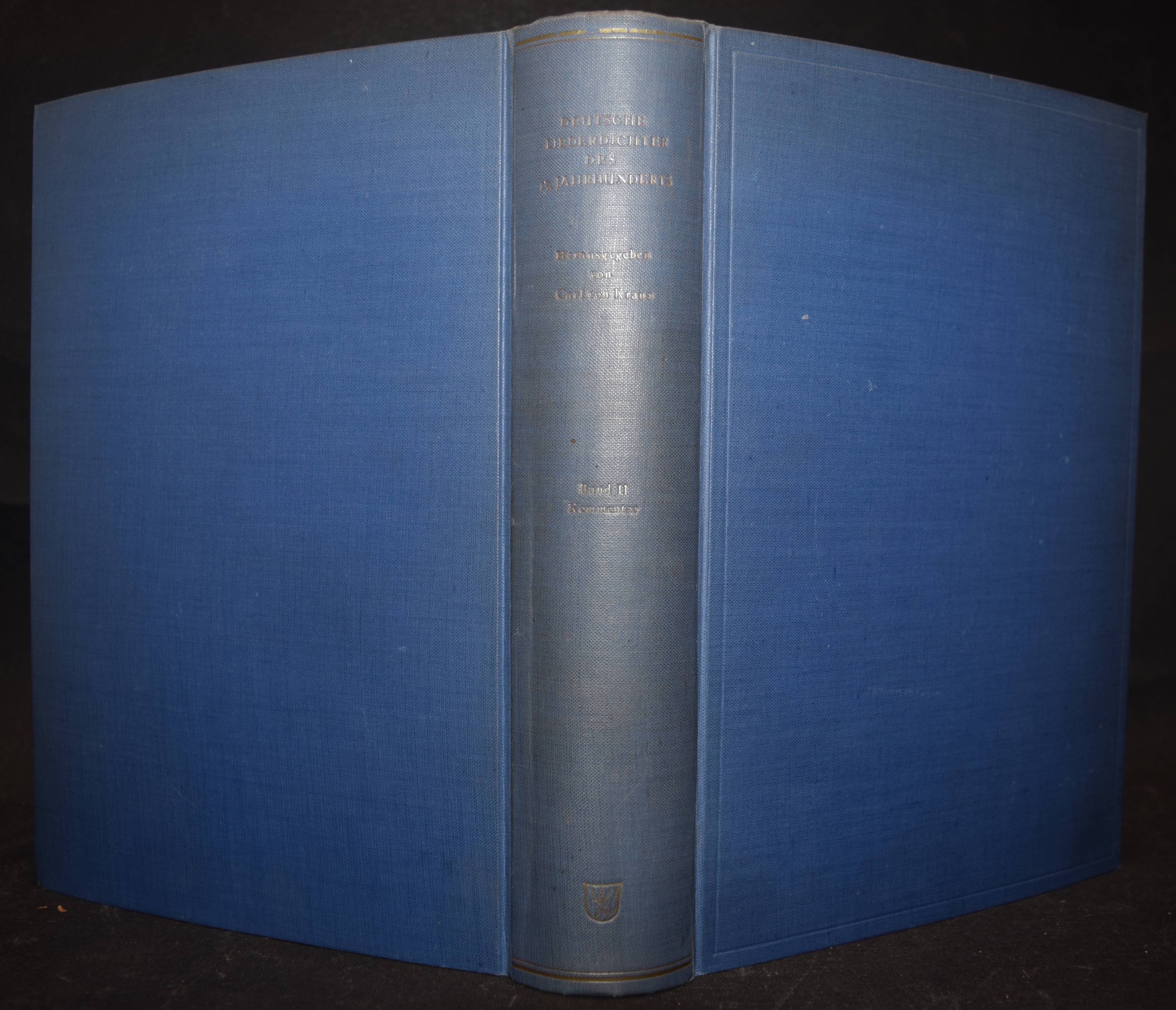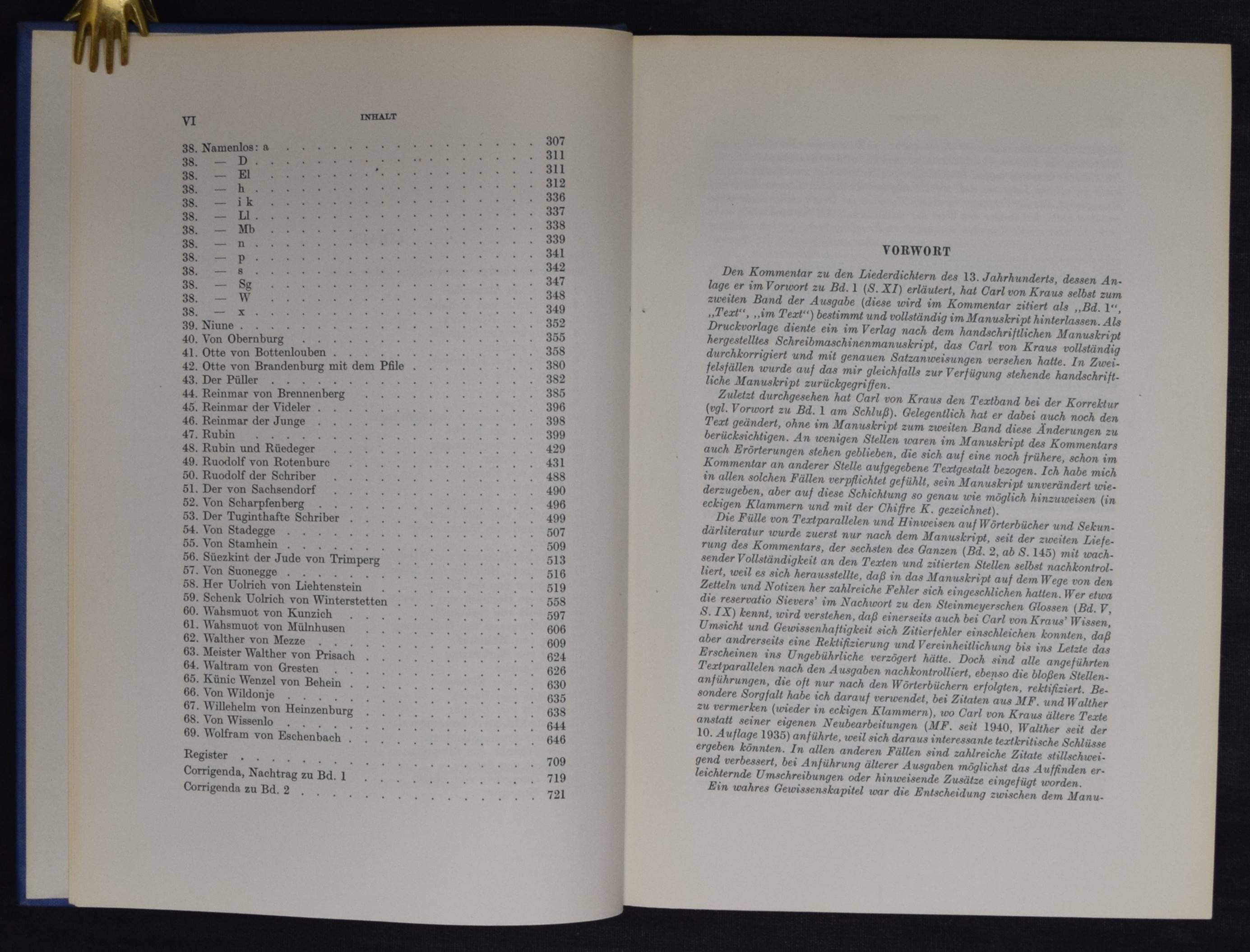 Kraus, Carl von. Deutsche Liederdichter des 13. Jahrhunderts. Band 2 Kommentar (von 2, mehr nicht erschienen). Tübingen, Niemeyer 1958. Gr.-8°. XVIII, 724 S. OLn. mit goldgepr. Rückentitel. Sehr gutes Exemplar.