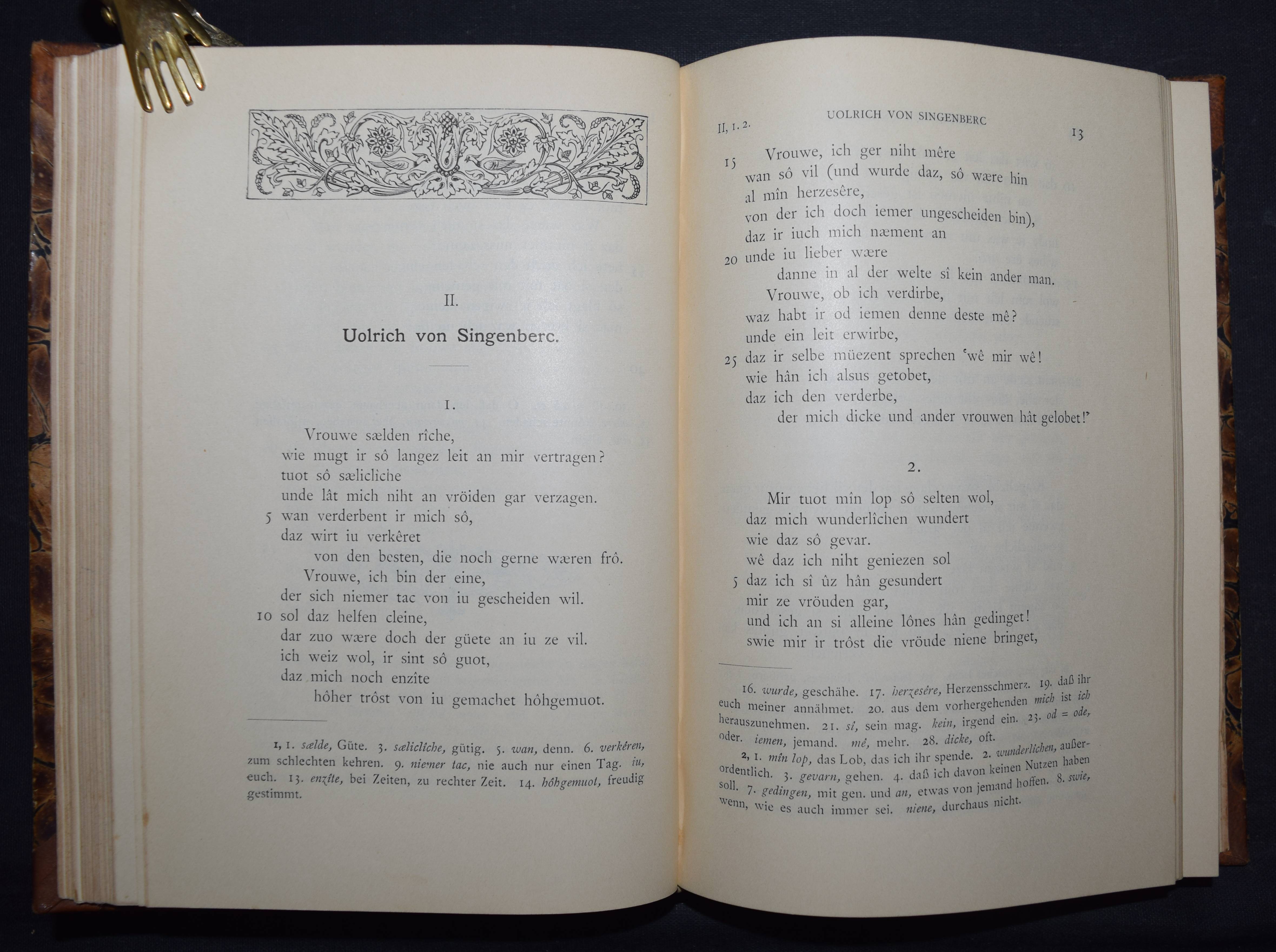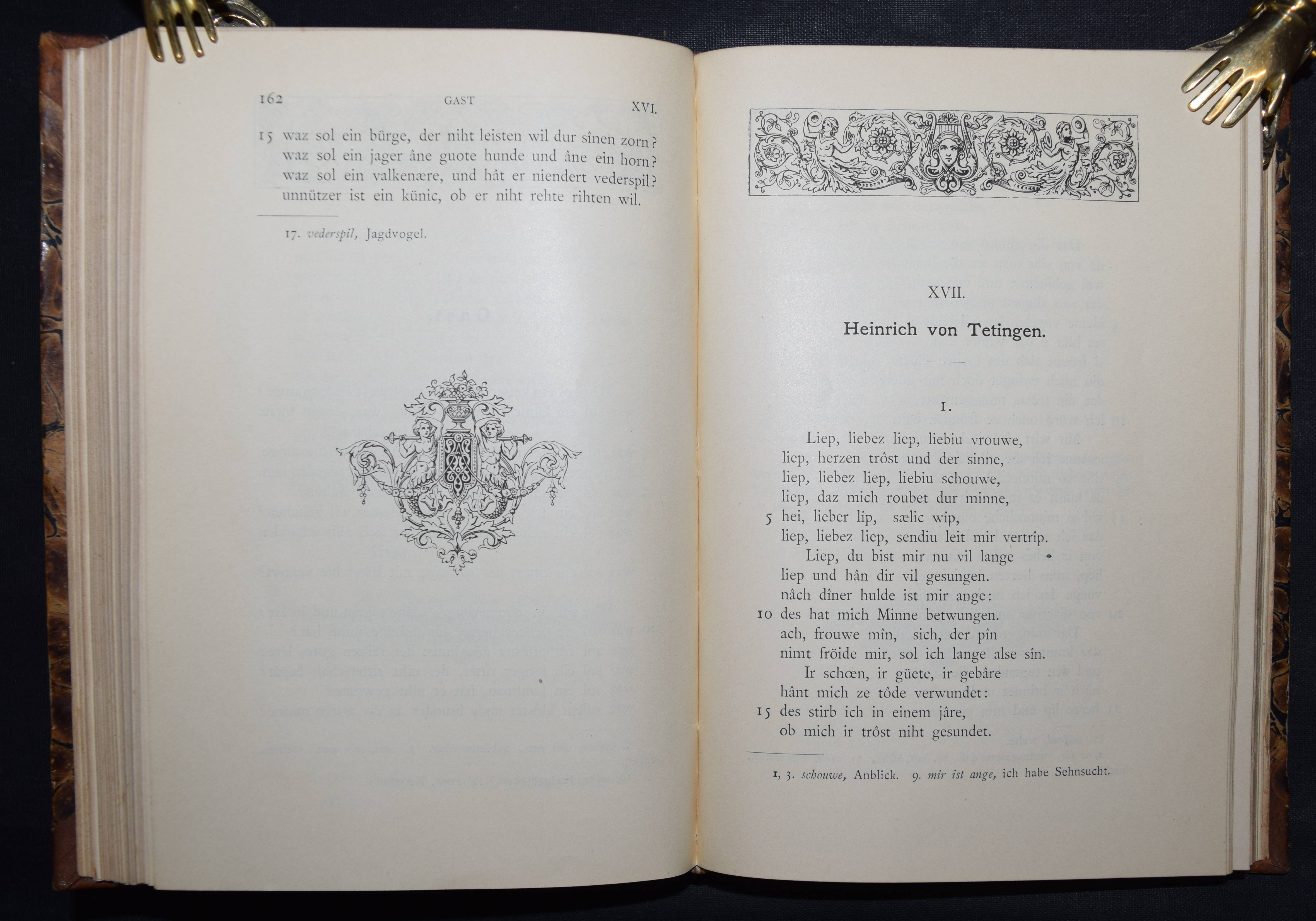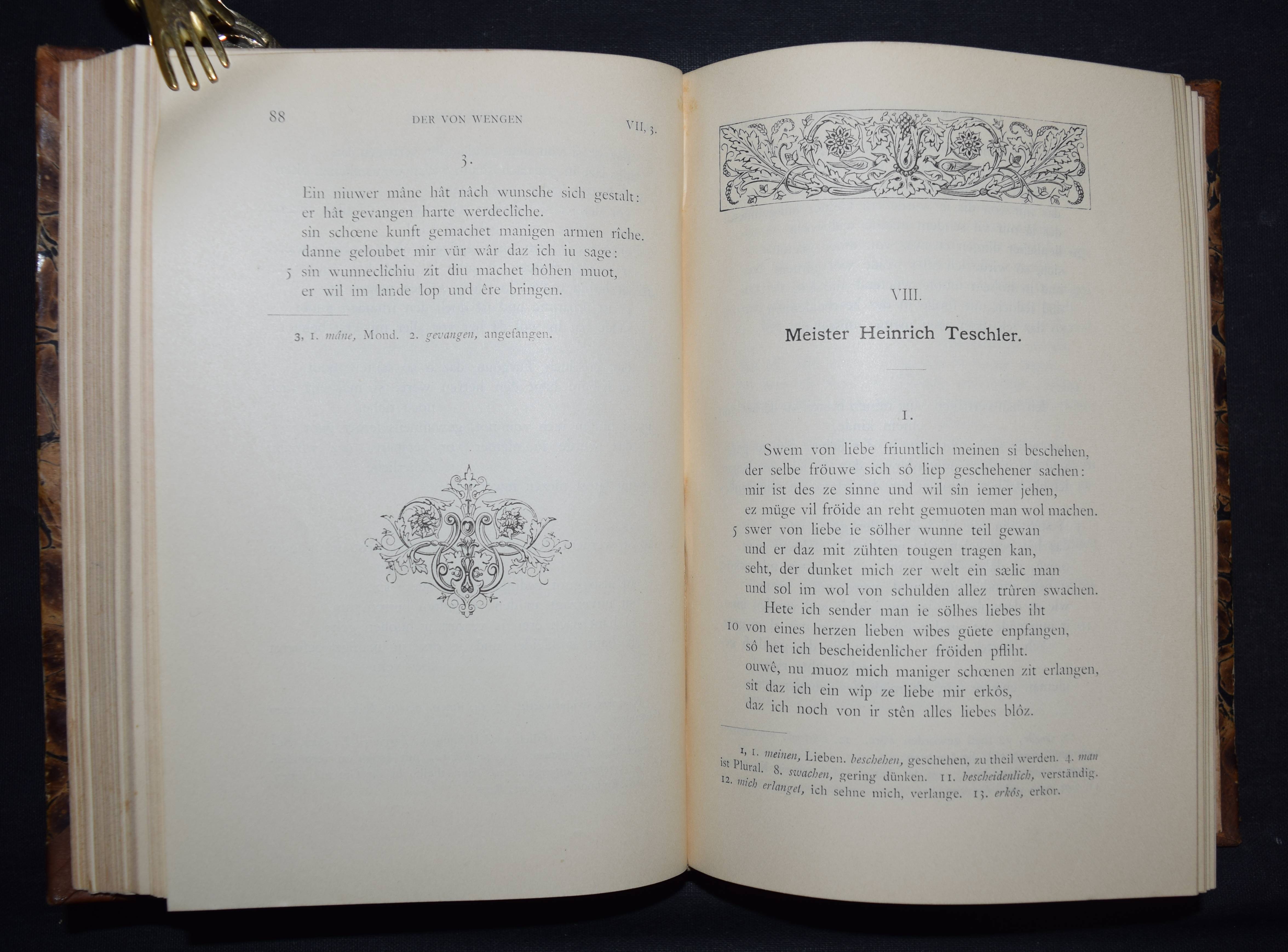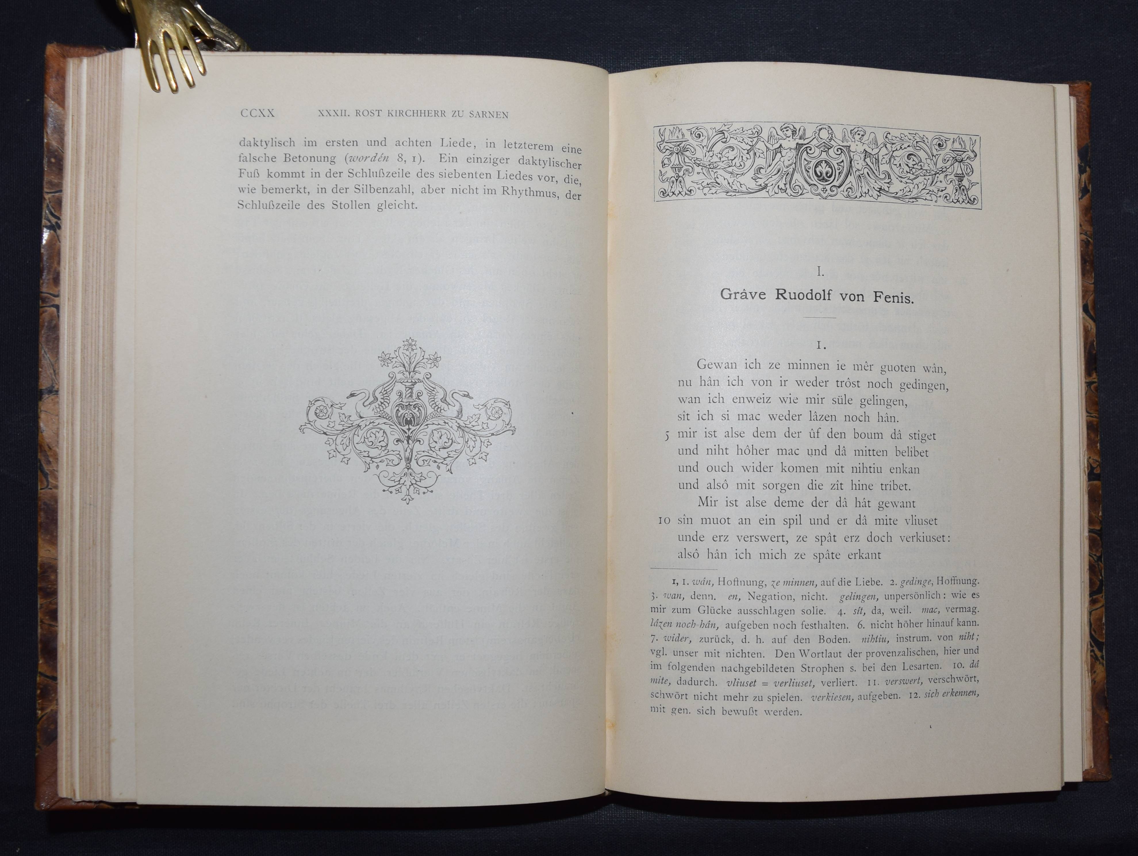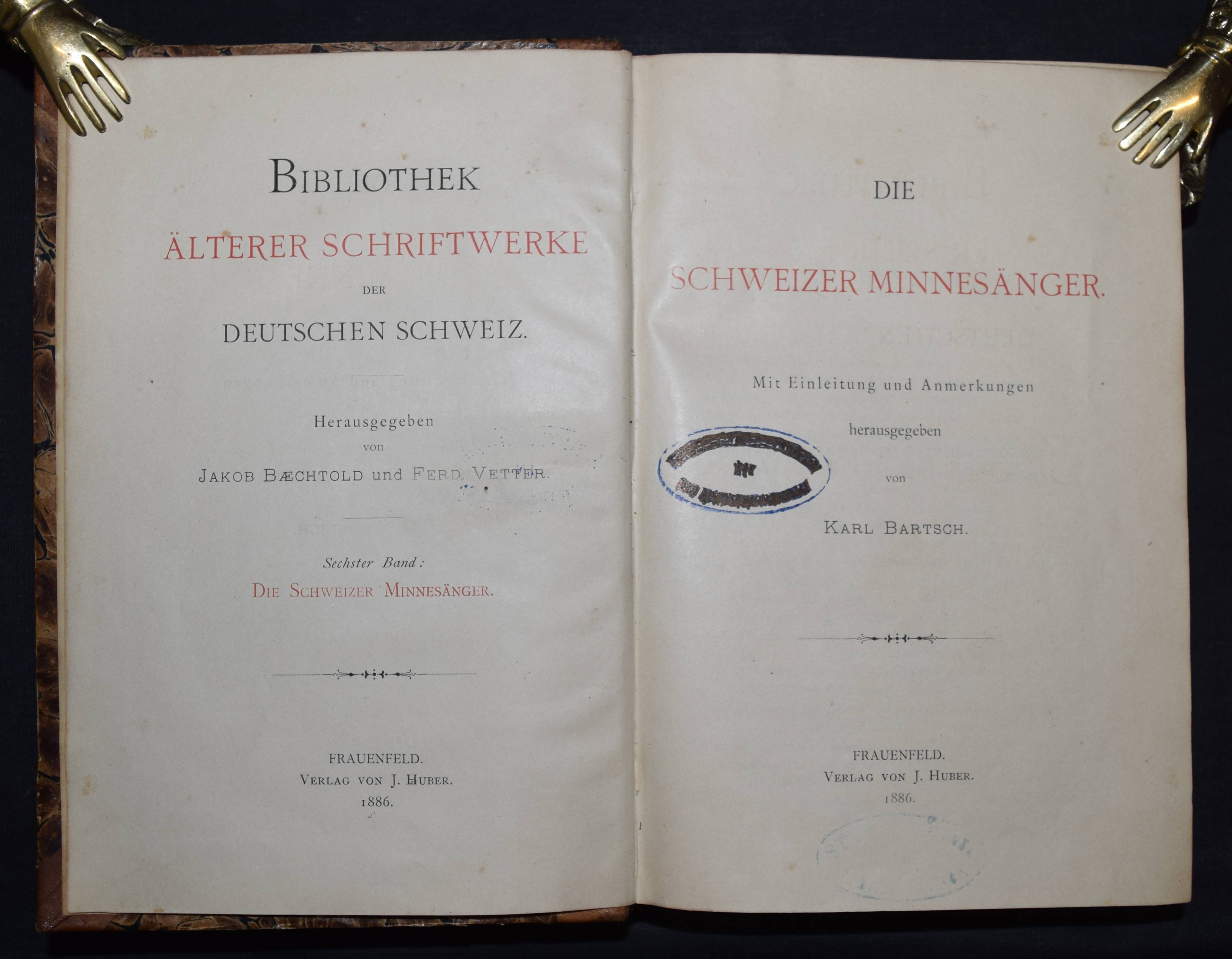 Bartsch, Karl. Die Schweizer Minnesänger. Mit Einleitung und Anmerkungen herausgegeben. Frauenfeld, Huber 1886. 8°. CCXX, 471 S. Hldr. d. Zt. mit goldgepr. Rückenschild. (Bibliothek älterer Schriftwerke der deutschen Schweiz, Band 6). Erste Ausgabe. – Einband etwas berieben, gelöschter Stempel auf dem Titel, gutes dekorativ gebundenes Exemplar.