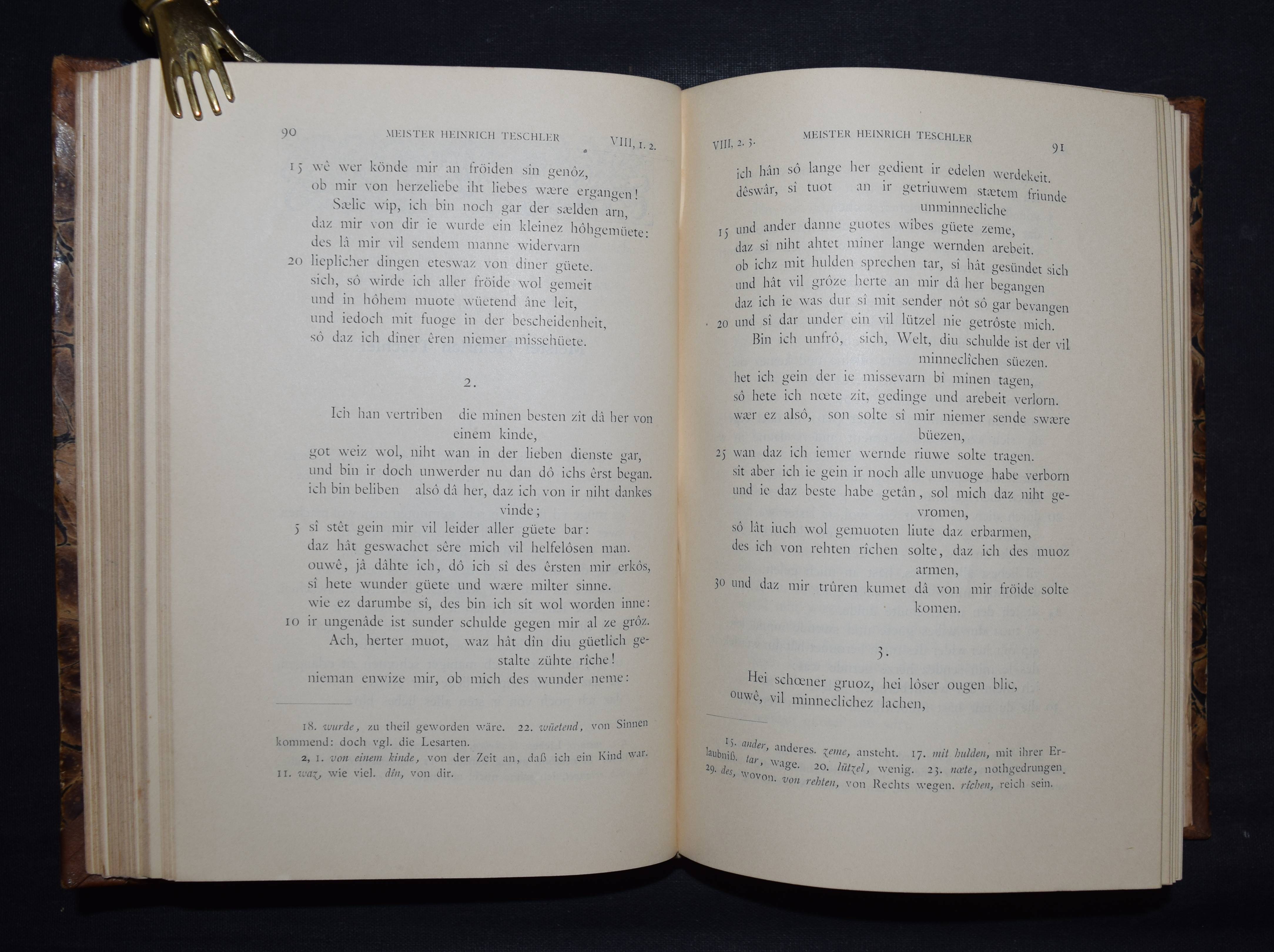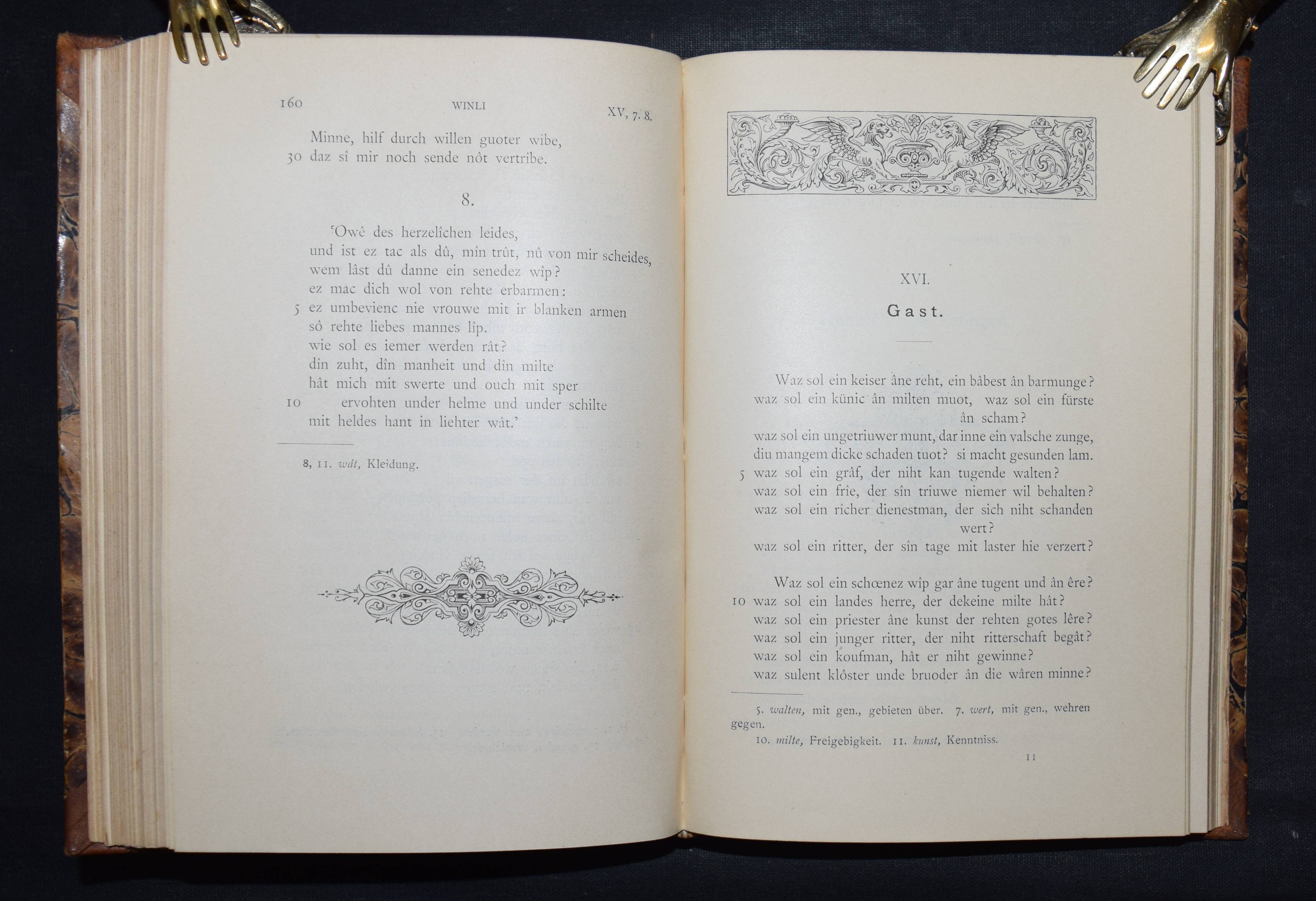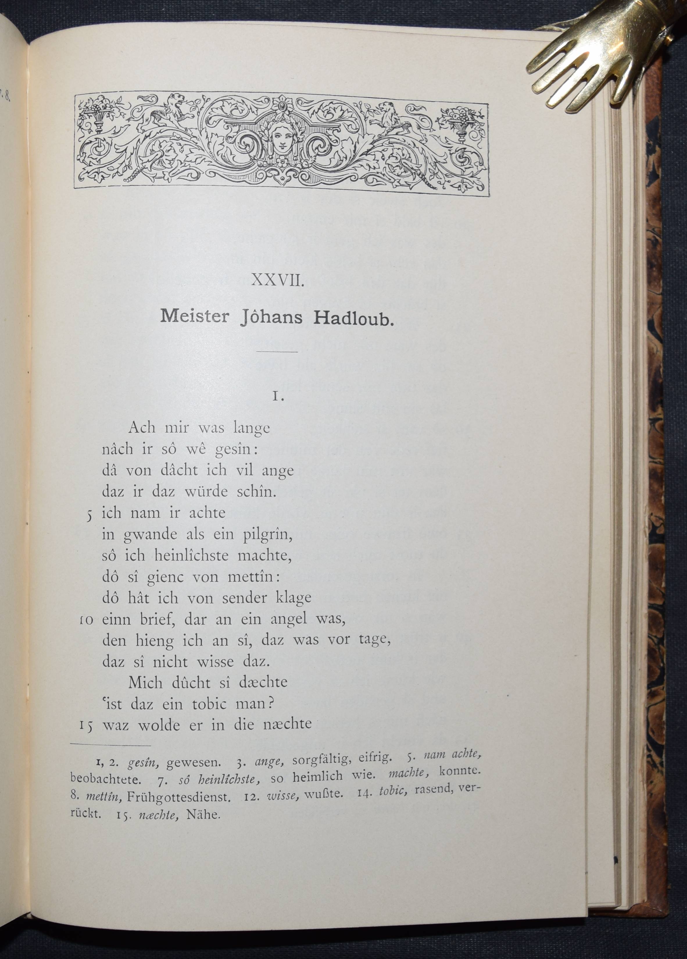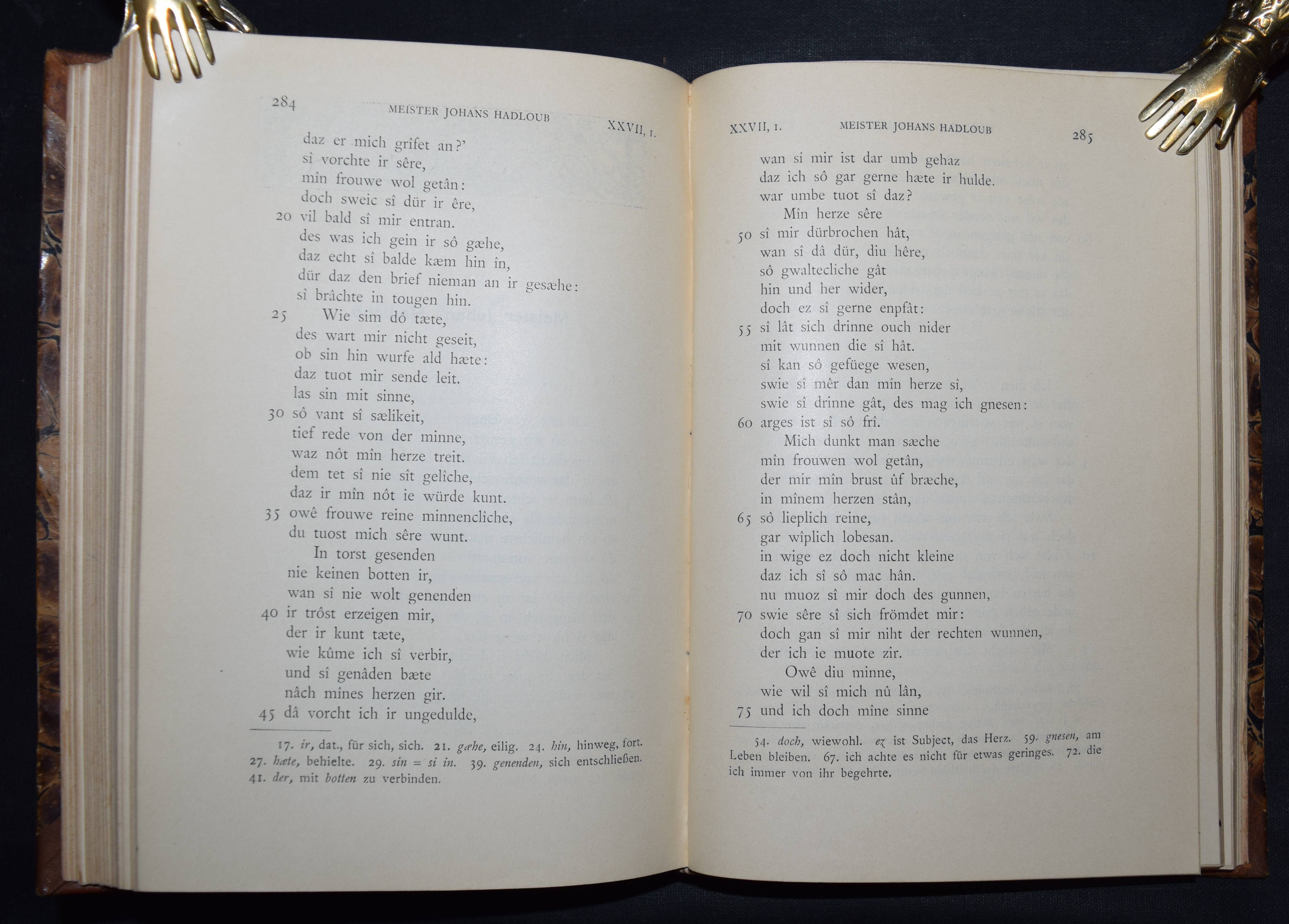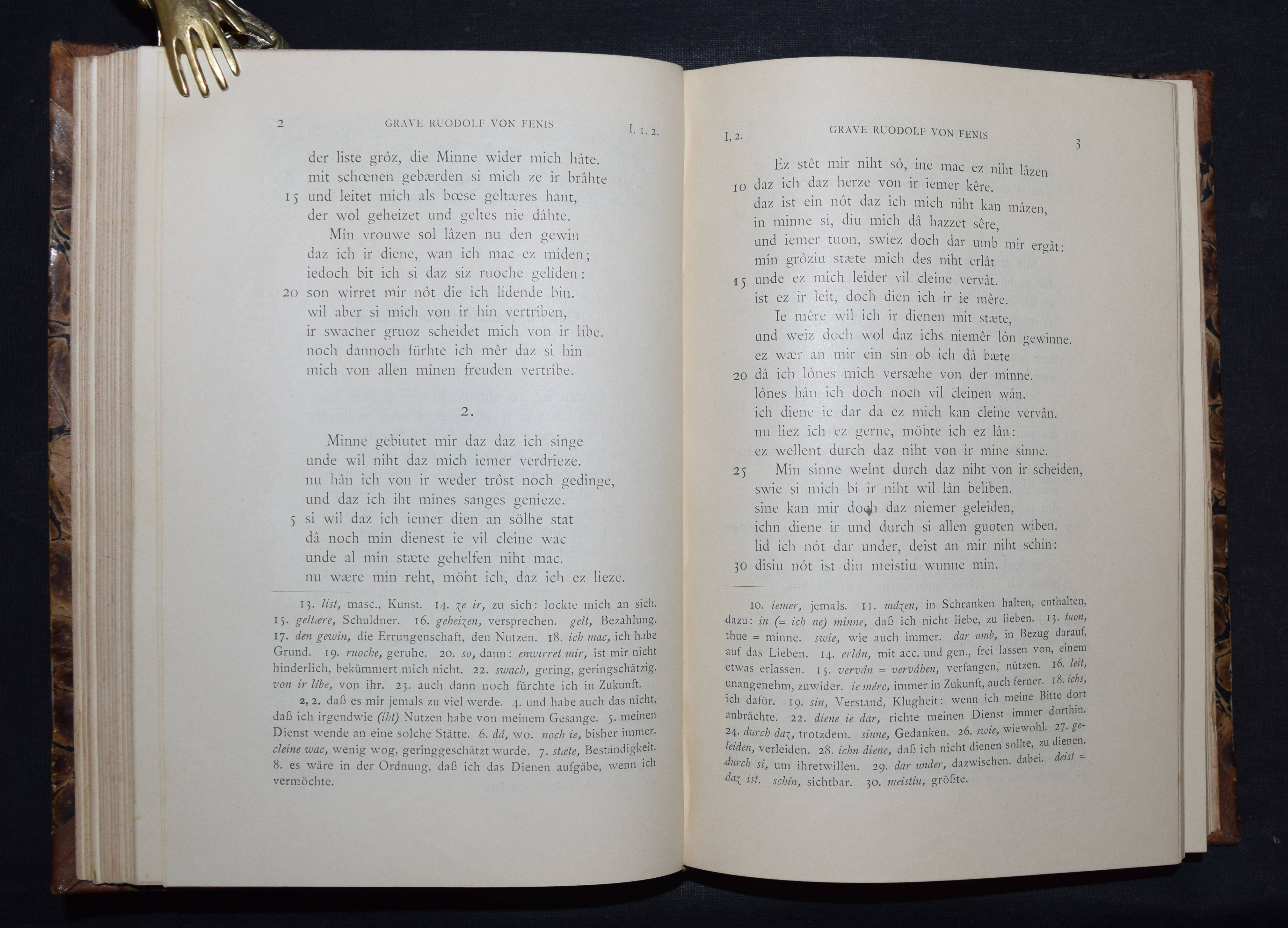 Bartsch, Karl. Die Schweizer Minnesänger. Mit Einleitung und Anmerkungen herausgegeben. Frauenfeld, Huber 1886. 8°. CCXX, 471 S. Hldr. d. Zt. mit goldgepr. Rückenschild. (Bibliothek älterer Schriftwerke der deutschen Schweiz, Band 6). Erste Ausgabe. – Einband etwas berieben, gelöschter Stempel auf dem Titel, gutes dekorativ gebundenes Exemplar.
