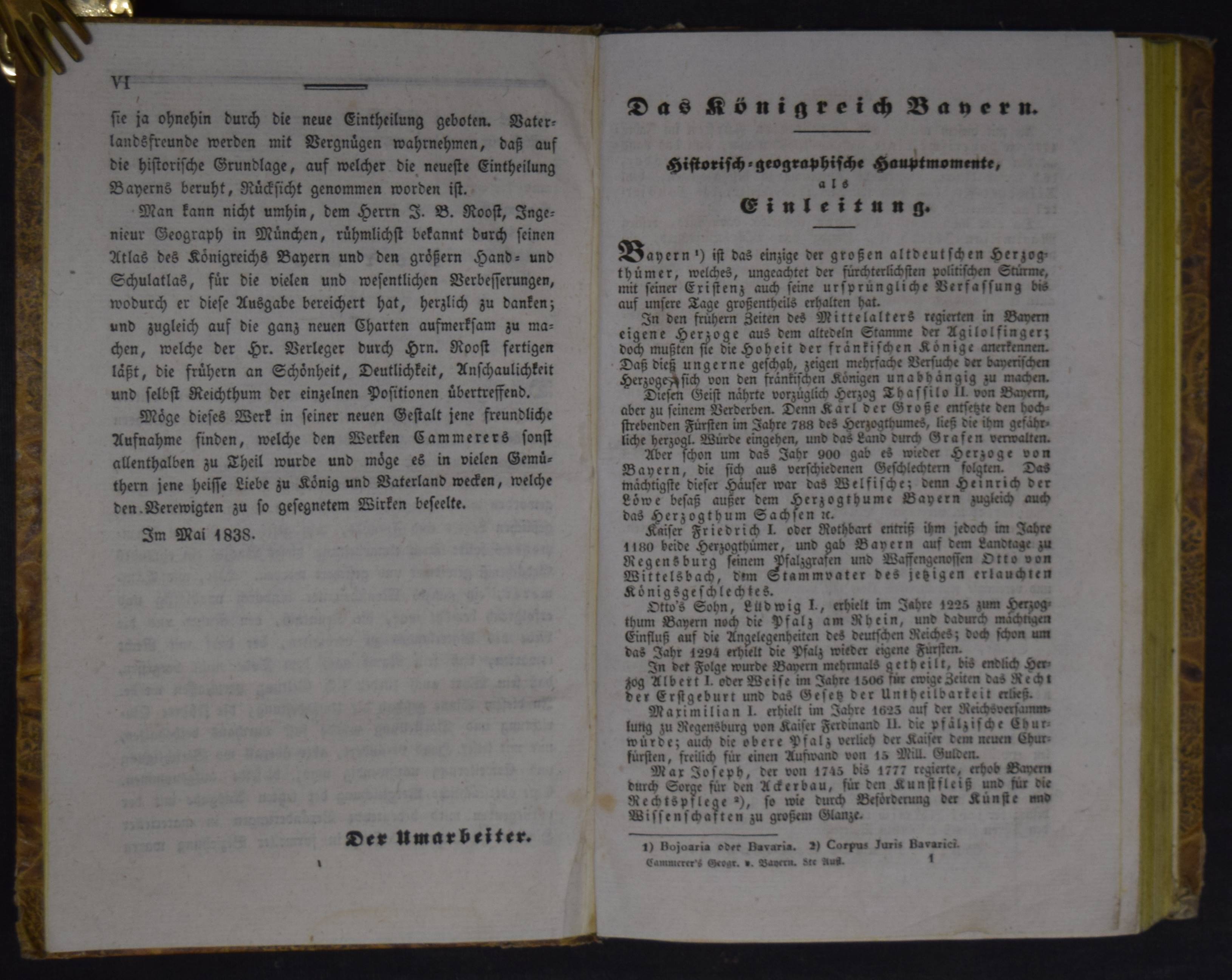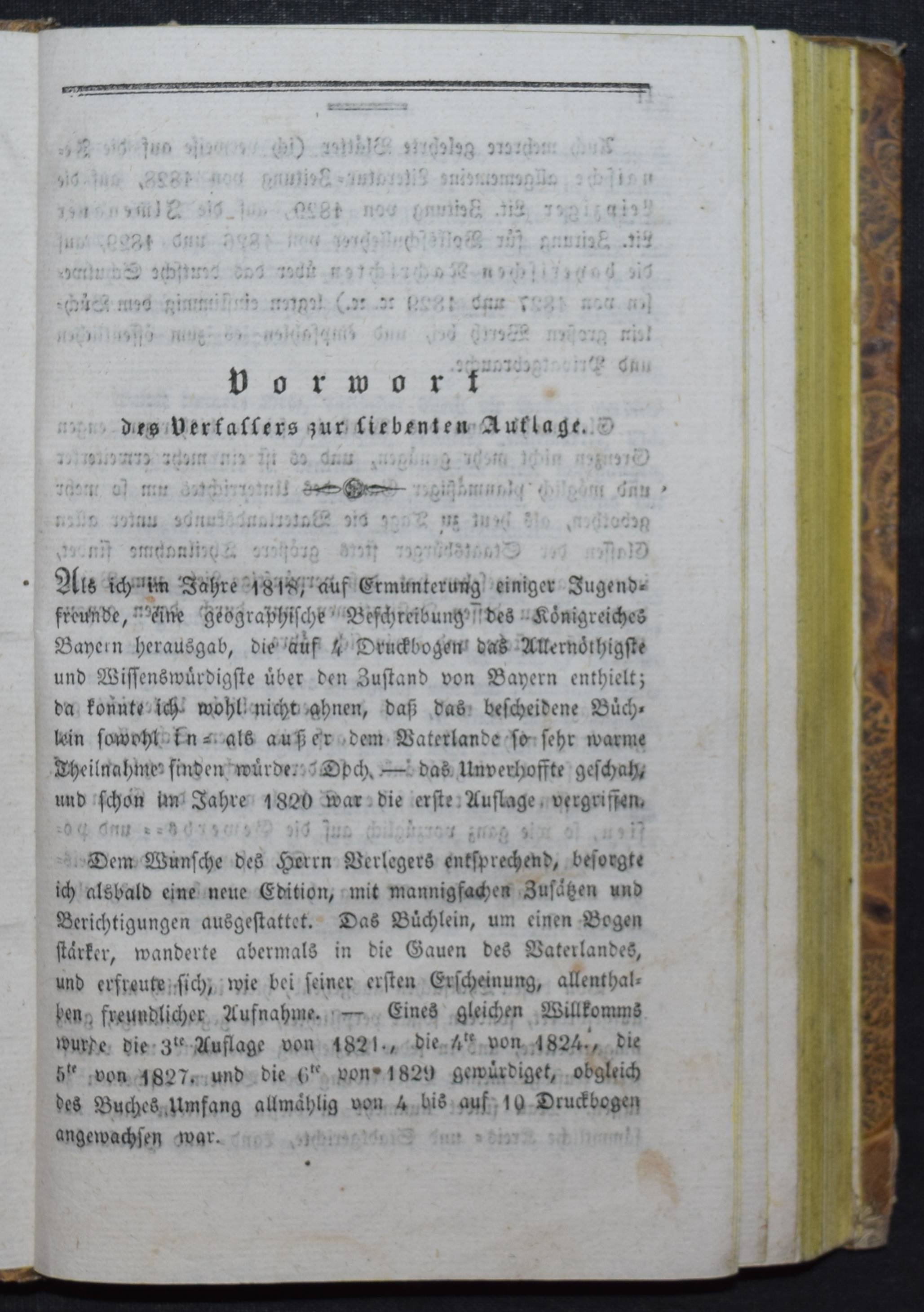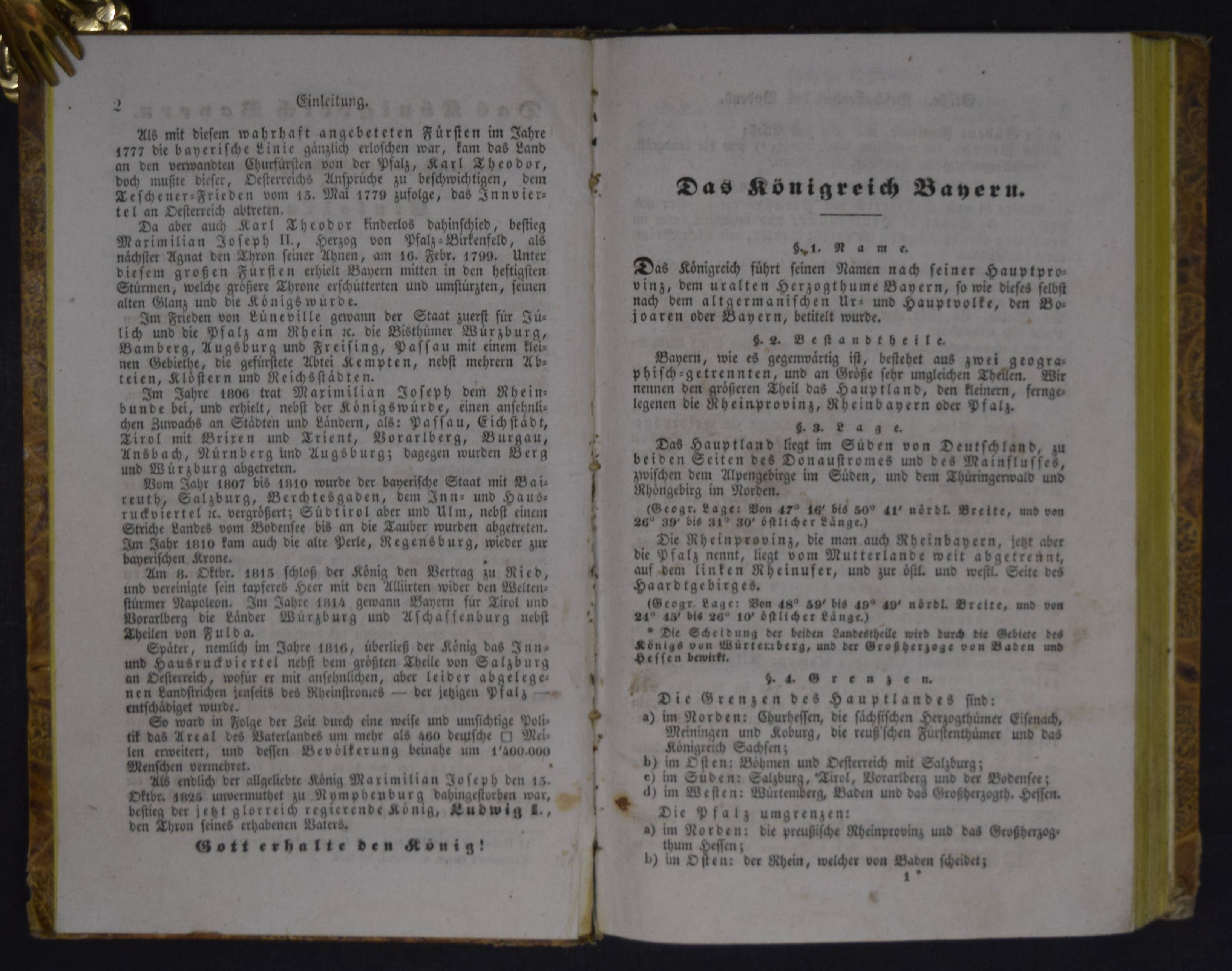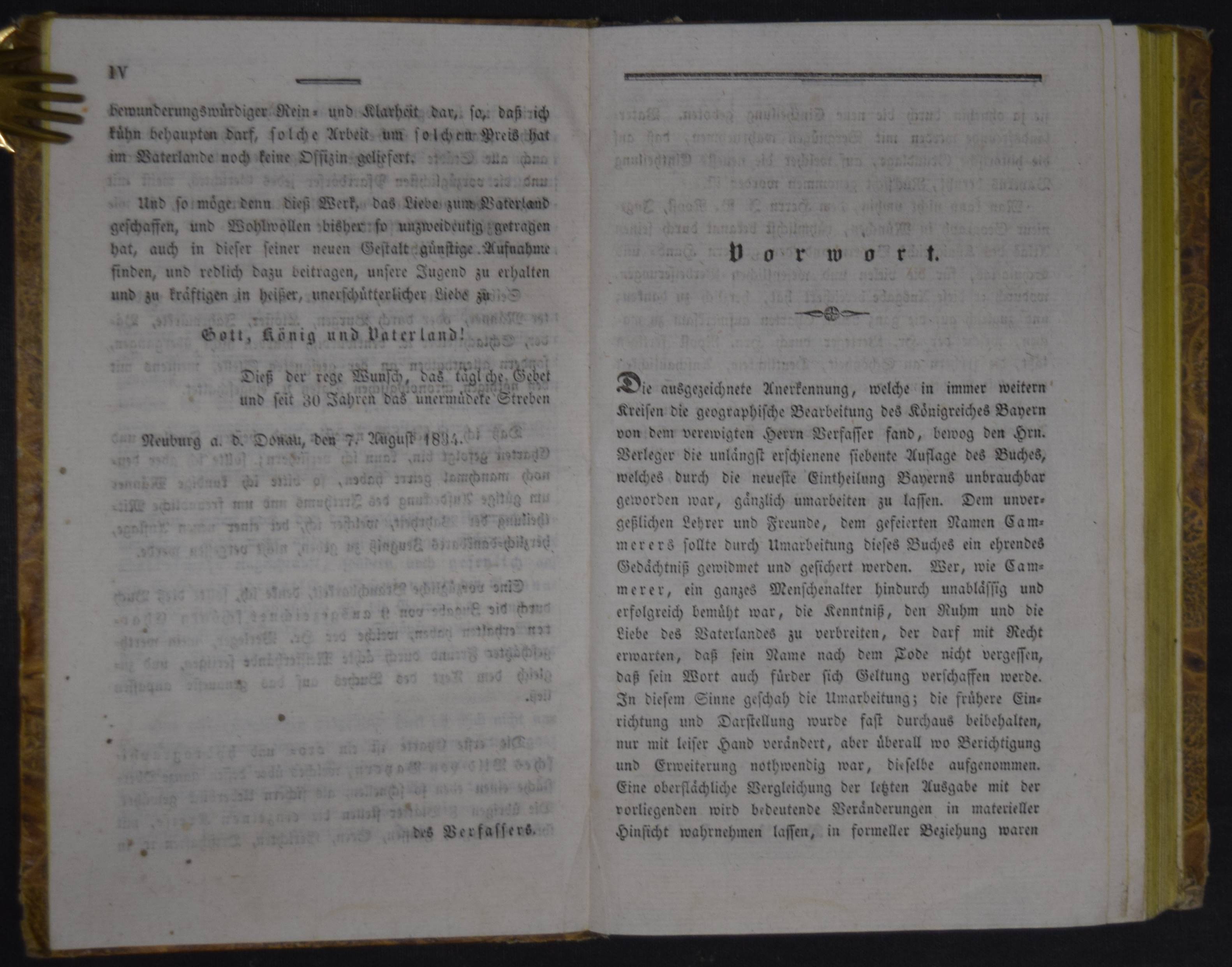 | Cammerer, Ans(elm) And(reas Kaspar). Das Königreich Bayern in seiner gegenwärtigen Gestalt. Für Schulen und Vaterlandsfreunde. 8., nach der neuesten Kreis-Eintheilung von einem Freunde des Verstorbenen umgearb., vielfach verm. u. verb. Aufl. Kempten, Dannheimer 1838. 8°. VI, 288 S. Pbd. d. Zt. mit handschr. Rückenschild. Umfassendste Ausgabe des zuerst 1818 erschienenen Lehrbuchs. – Einband berieben u. bestoßen, Vorsätze u. Titelbl. leicht fleckig, sonst gut erhalten.