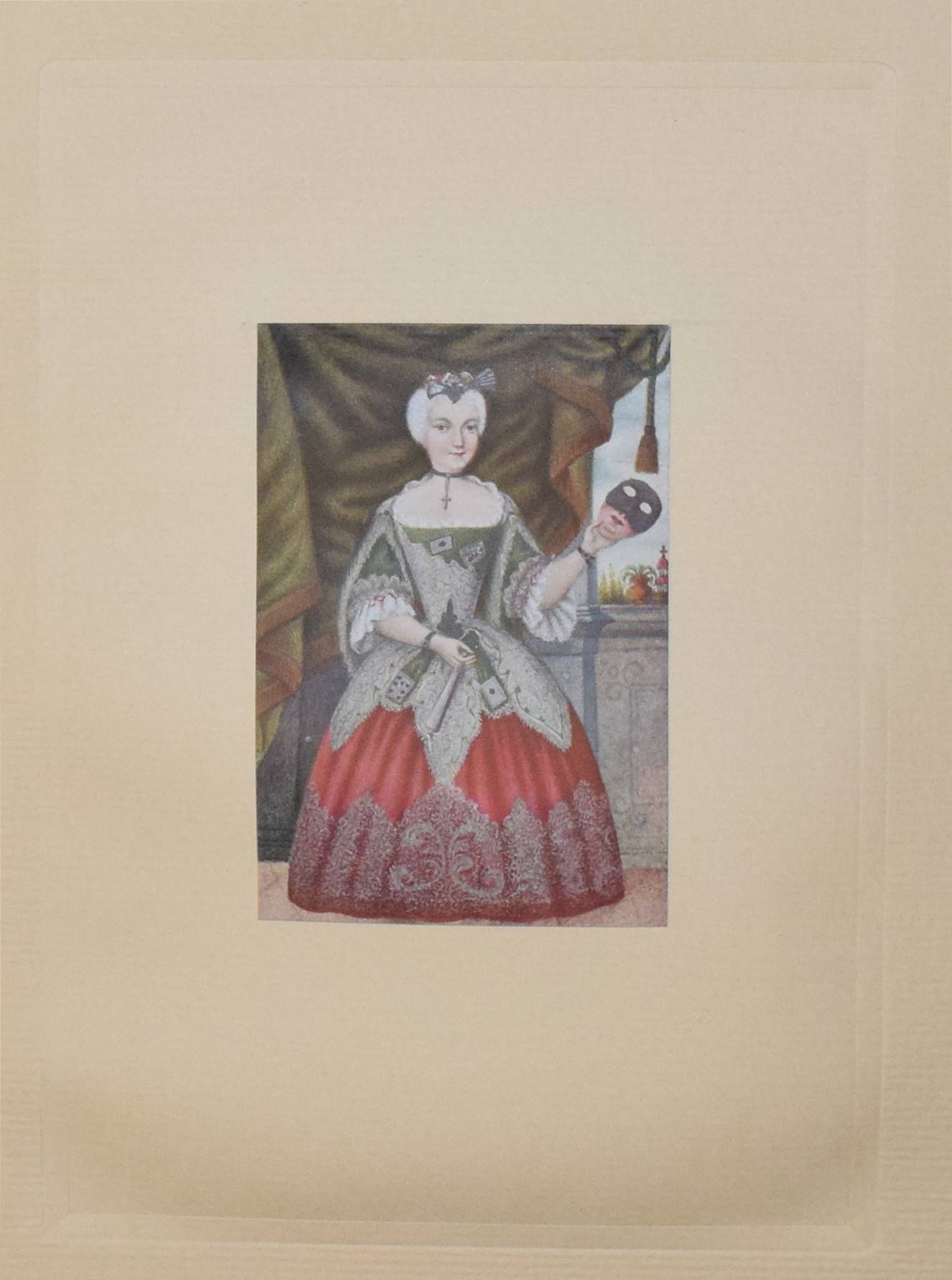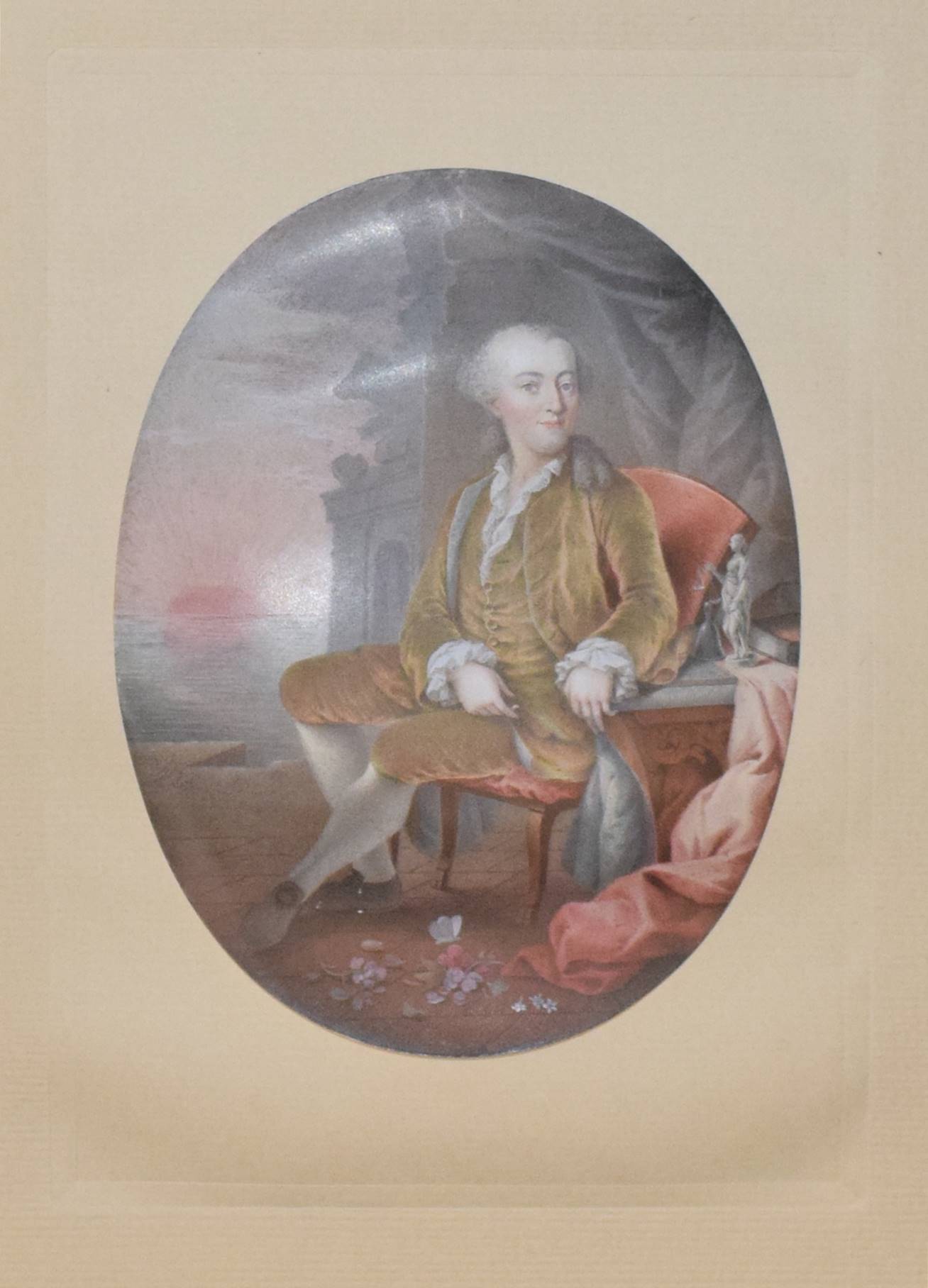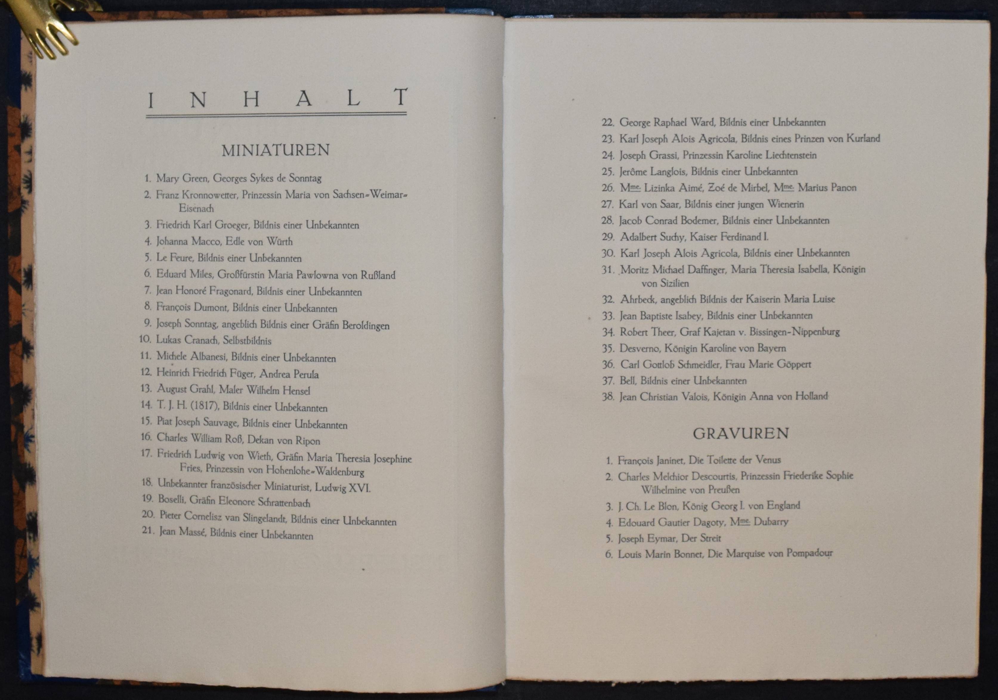 Miniaturen und Gravuren aus fümf Jahrhunderten. Berlin, Neufeld & Henius 1924. 4°. 1 Bl., Titelbl., 2 S. Inhaltsangabe, 1 Bl., 38 Tafeln m. montierten farb. Miniaturen, 6 Tafeln m. montierten farb. Gravuren in unterschiedl. Formaten. Fol., OHldr. mit goldgepr. Rückentitel u. Rückenverg. Kapital etwas gestaucht, gutes Exemplar.