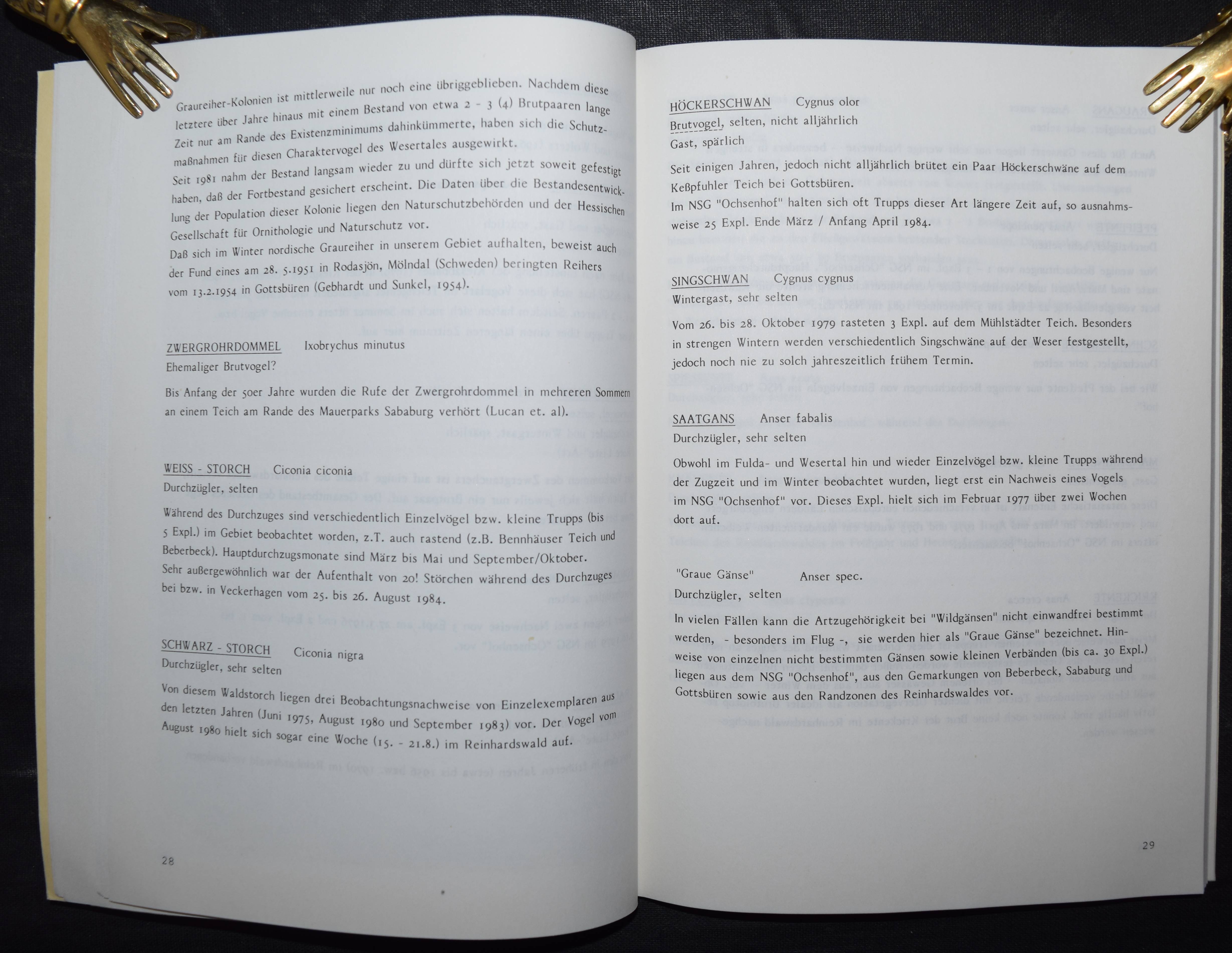 Schumann, Günther. Die Vogelwelt des Reinhardswaldes. Reinhardshagen, Eigenverlag: Waltraud Schumann 1984. 8°. 90 S. mit zahlr. Abb. u Tabellen. OKart. Mit eigenhändiger Widmung von G. Schumann. – Sehr gutes Exemplar.