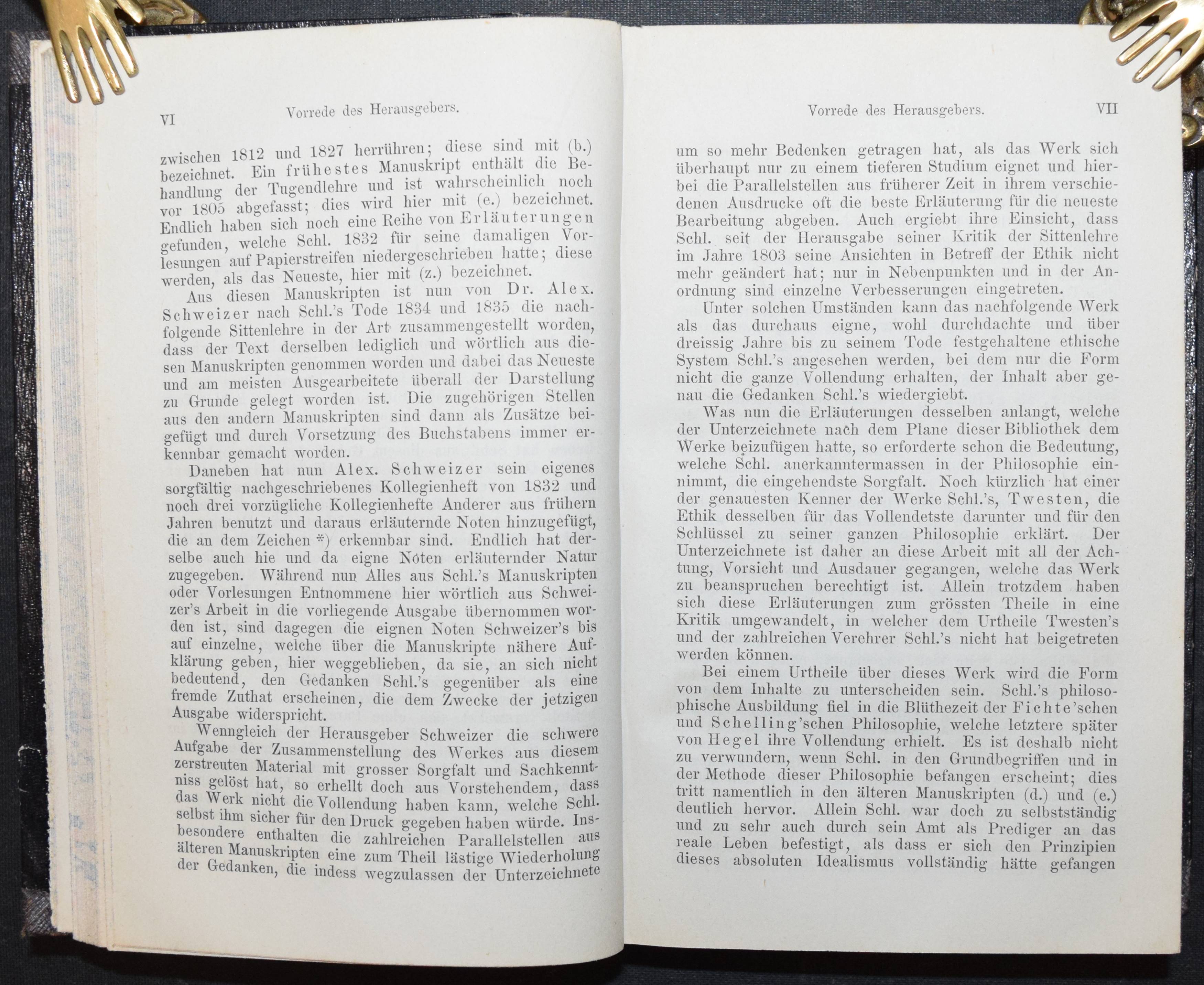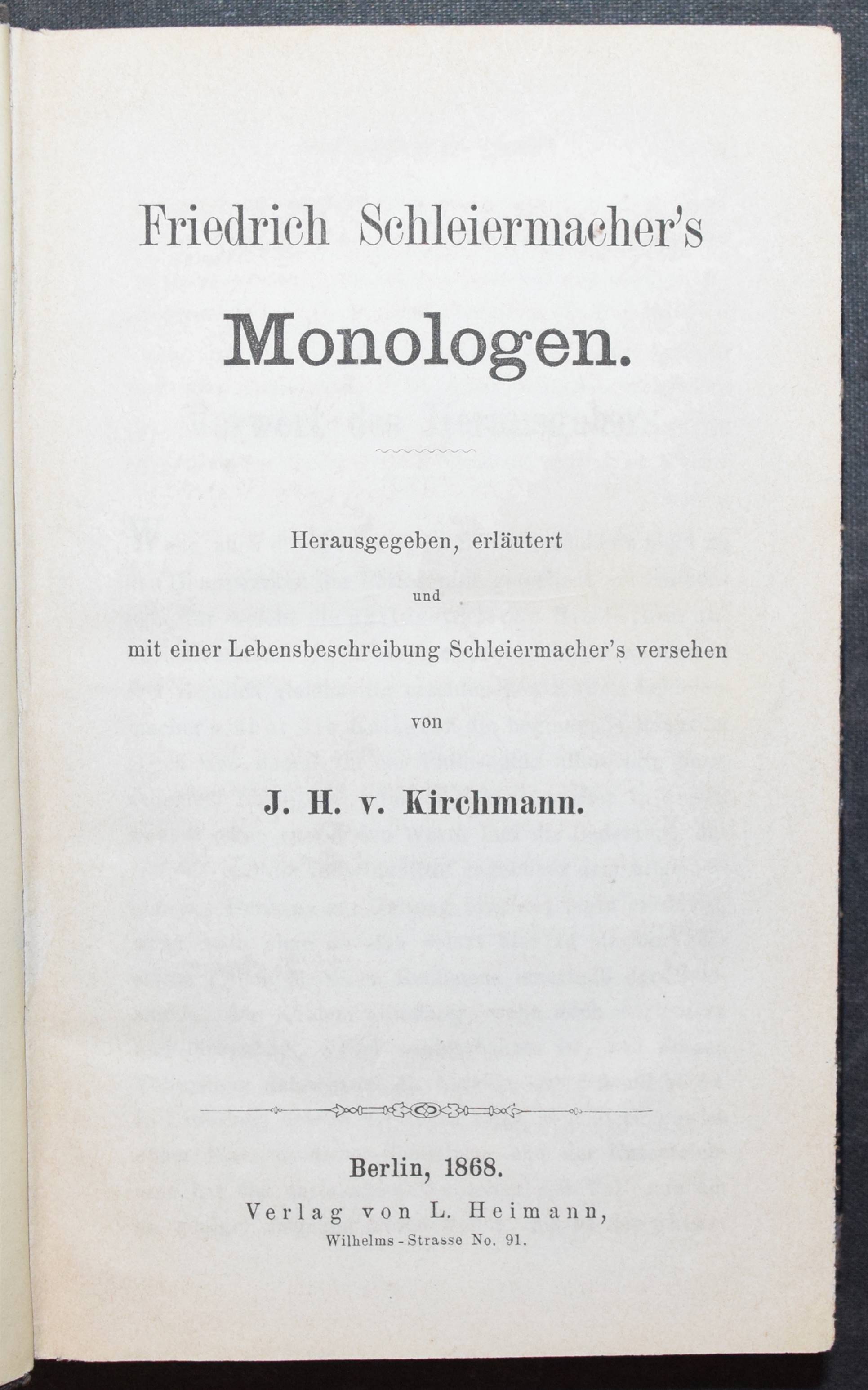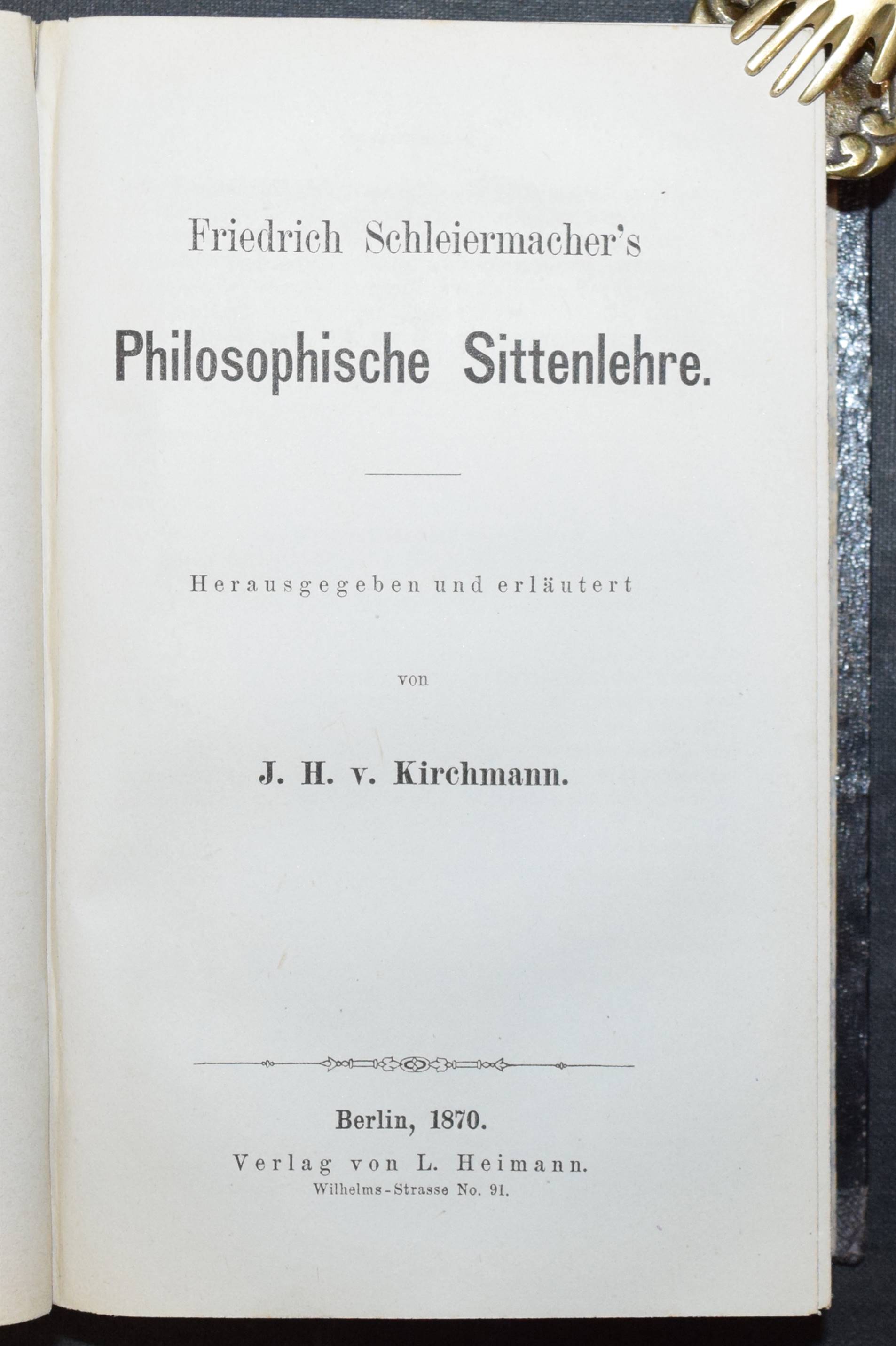Schleiermacher, Friedrich. Friedrich Schleiermacher’s Monologen. (UND): Schleiermacher, Friedrich Schleiermacher’s Philosophische Sittenlehre. Herausgegeben, erläutert und mit einer Lebensbeschreibung Schleiermacher’s versehen von J. H. v. Kirchmann. 2 Teile in 1 Band. Berlin, Heimann 1868-1970. 8°. VI, 100 S.; XX, 595 S. Hln. der Zeit mit goldgepr. Rückentitel u. Linienvergoldung. (Philosophische Bibliothek, 6). Rücken minimal fleckig und aufgehellt, gutes Exemplar.