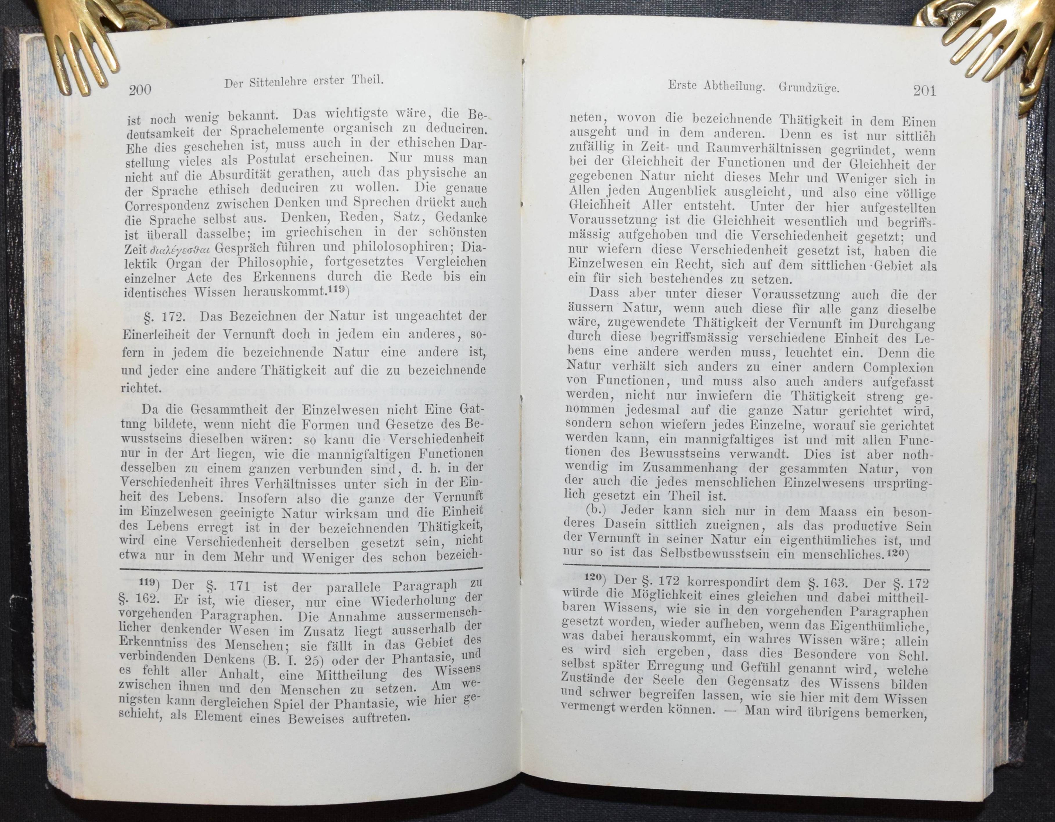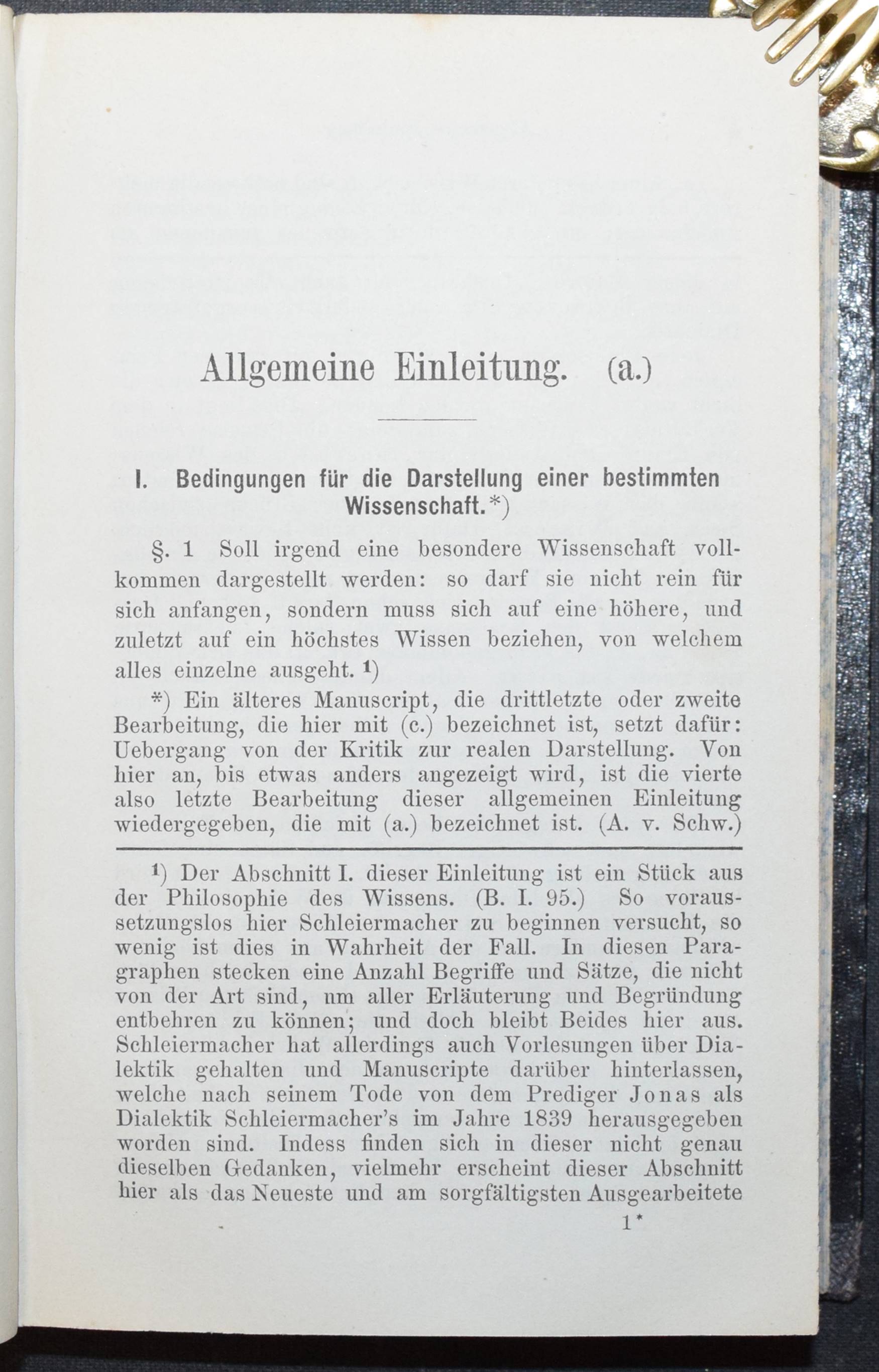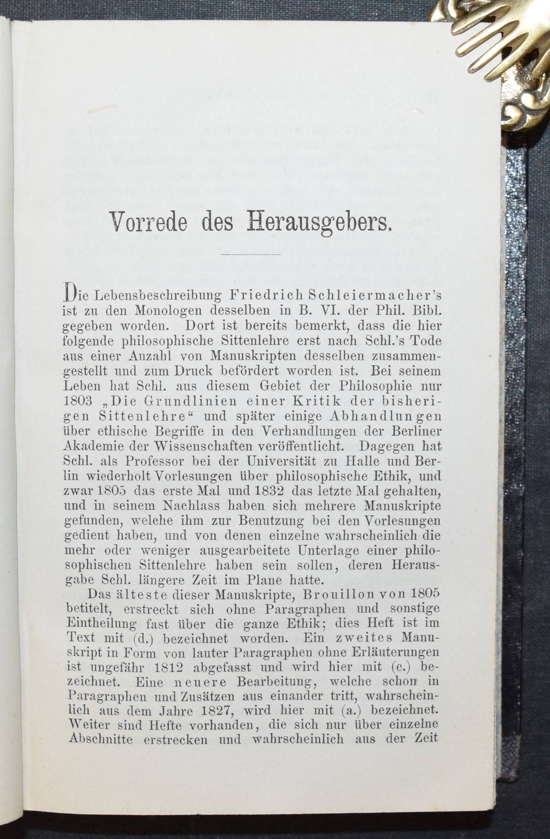 Schleiermacher, Friedrich. Friedrich Schleiermacher’s Monologen. (UND): Schleiermacher, Friedrich Schleiermacher’s Philosophische Sittenlehre. Herausgegeben, erläutert und mit einer Lebensbeschreibung Schleiermacher’s versehen von J. H. v. Kirchmann. 2 Teile in 1 Band. Berlin, Heimann 1868-1970. 8°. VI, 100 S.; XX, 595 S. Hln. der Zeit mit goldgepr. Rückentitel u. Linienvergoldung. (Philosophische Bibliothek, 6). Rücken minimal fleckig und aufgehellt, gutes Exemplar.