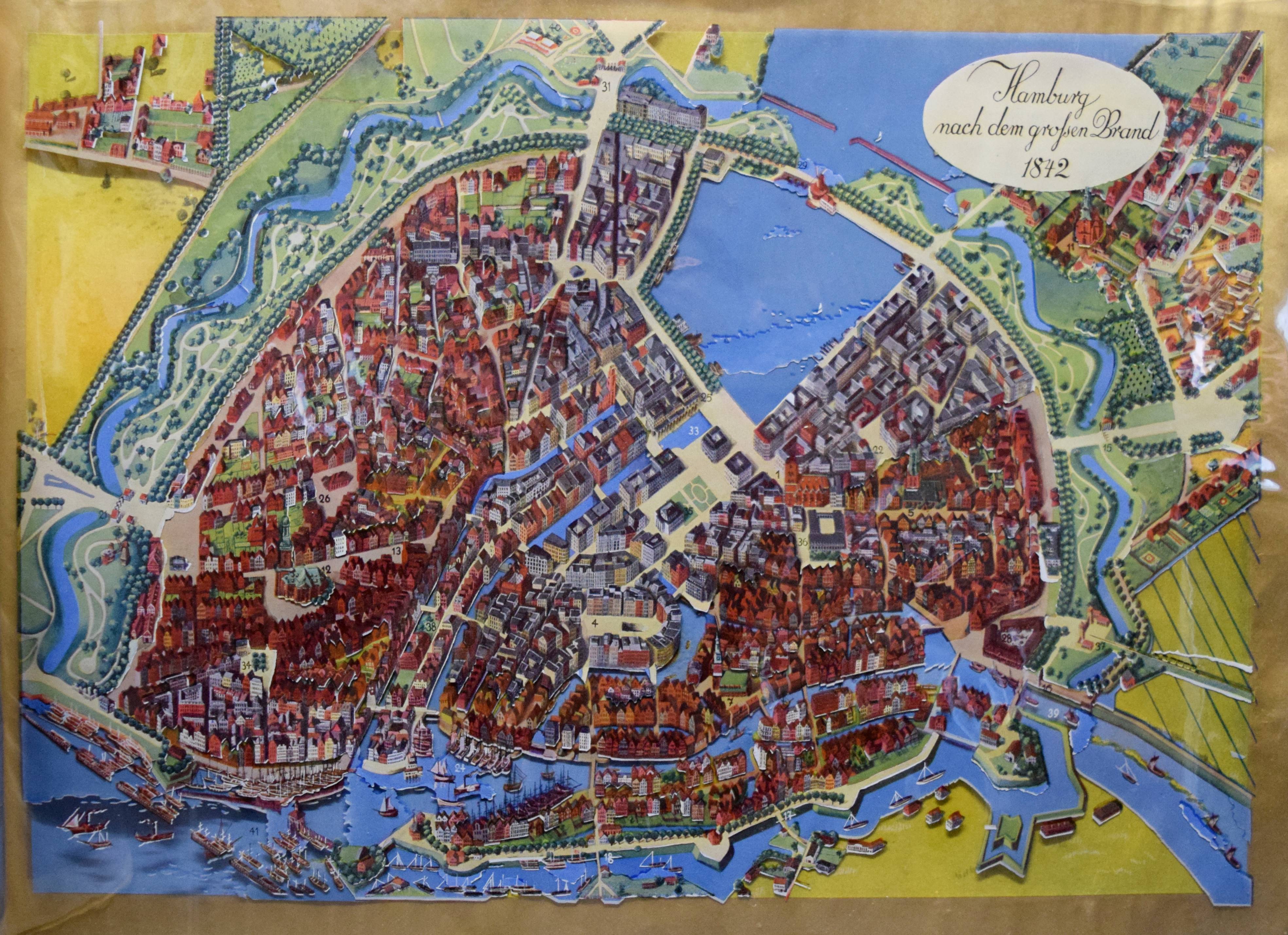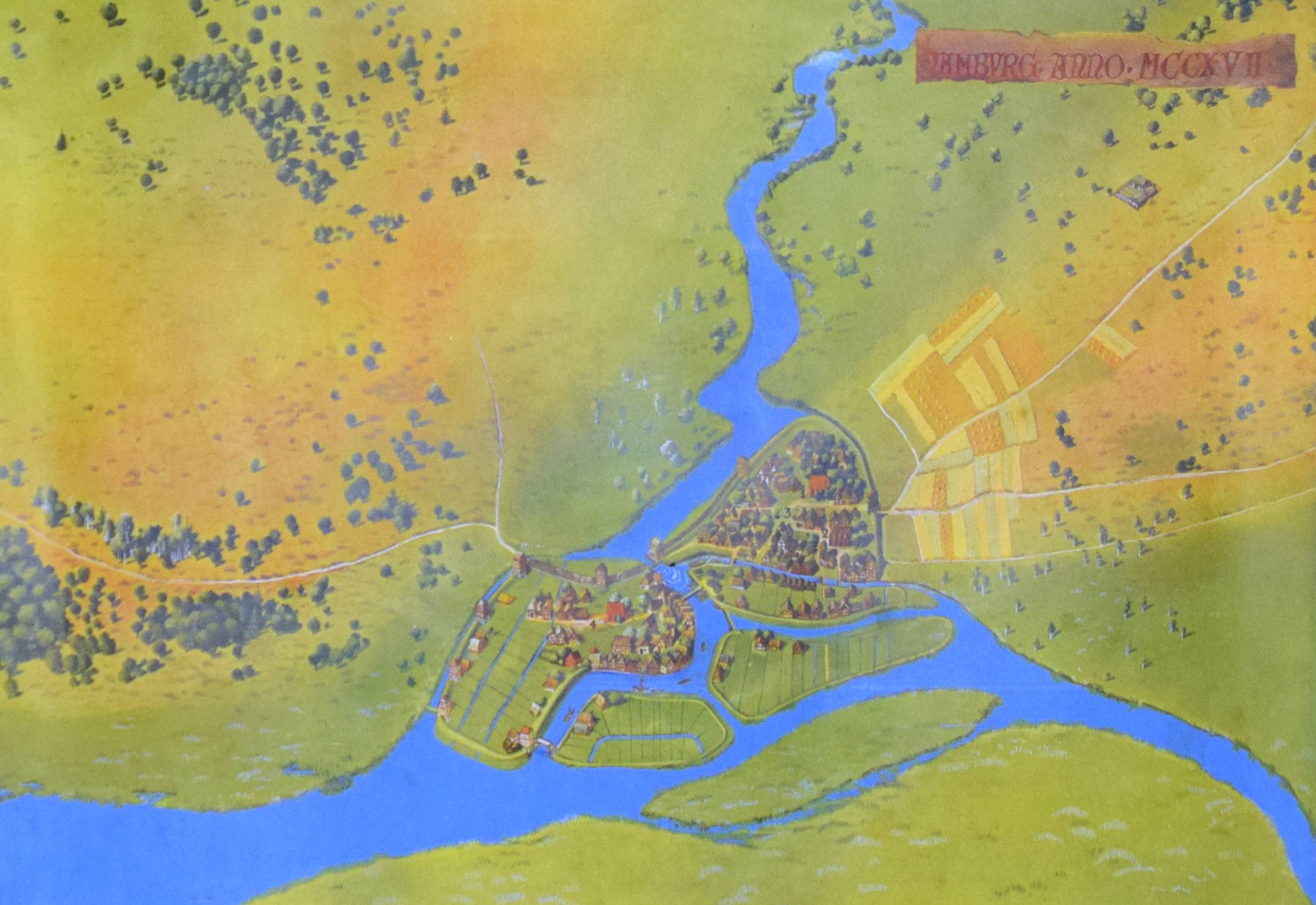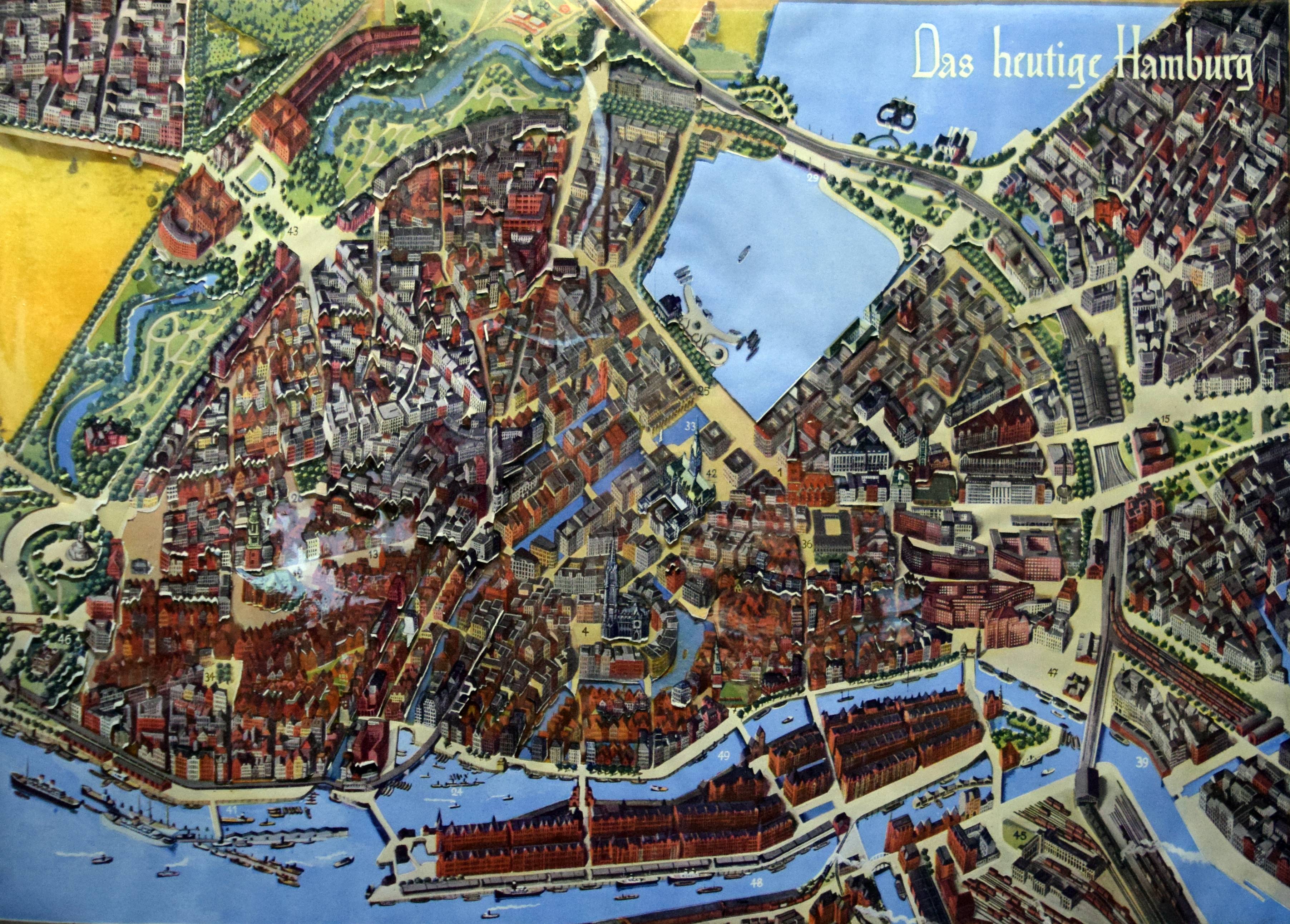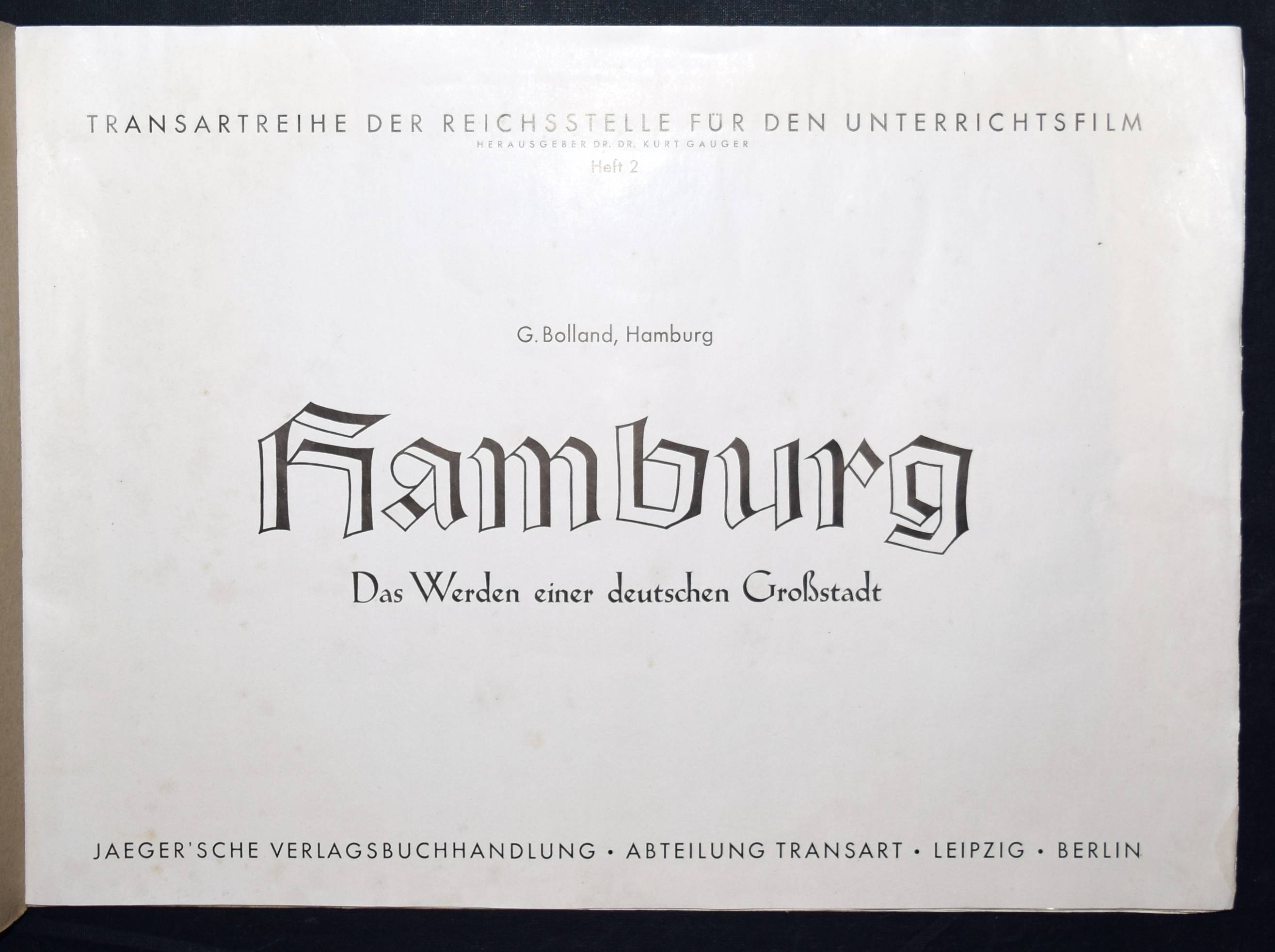 Bolland, Gustav. Hamburg. Das Werden einer deutschen Großstadt. Leipzig, Berlin, Jaeger O.J. (1938). Quer-4°. 10 Bl. teils farb.u. auf Klarsichtfolie gedruckte Abb; 1 Plan u. 15 S. (Begleitheft). (Transartreihe der Reichsstelle für den Unterrichtsfilm, Heft 2). Umschlag mit leichten Gebrauchs- u. Altersspuren, gutes erhaltenes Exemplar.